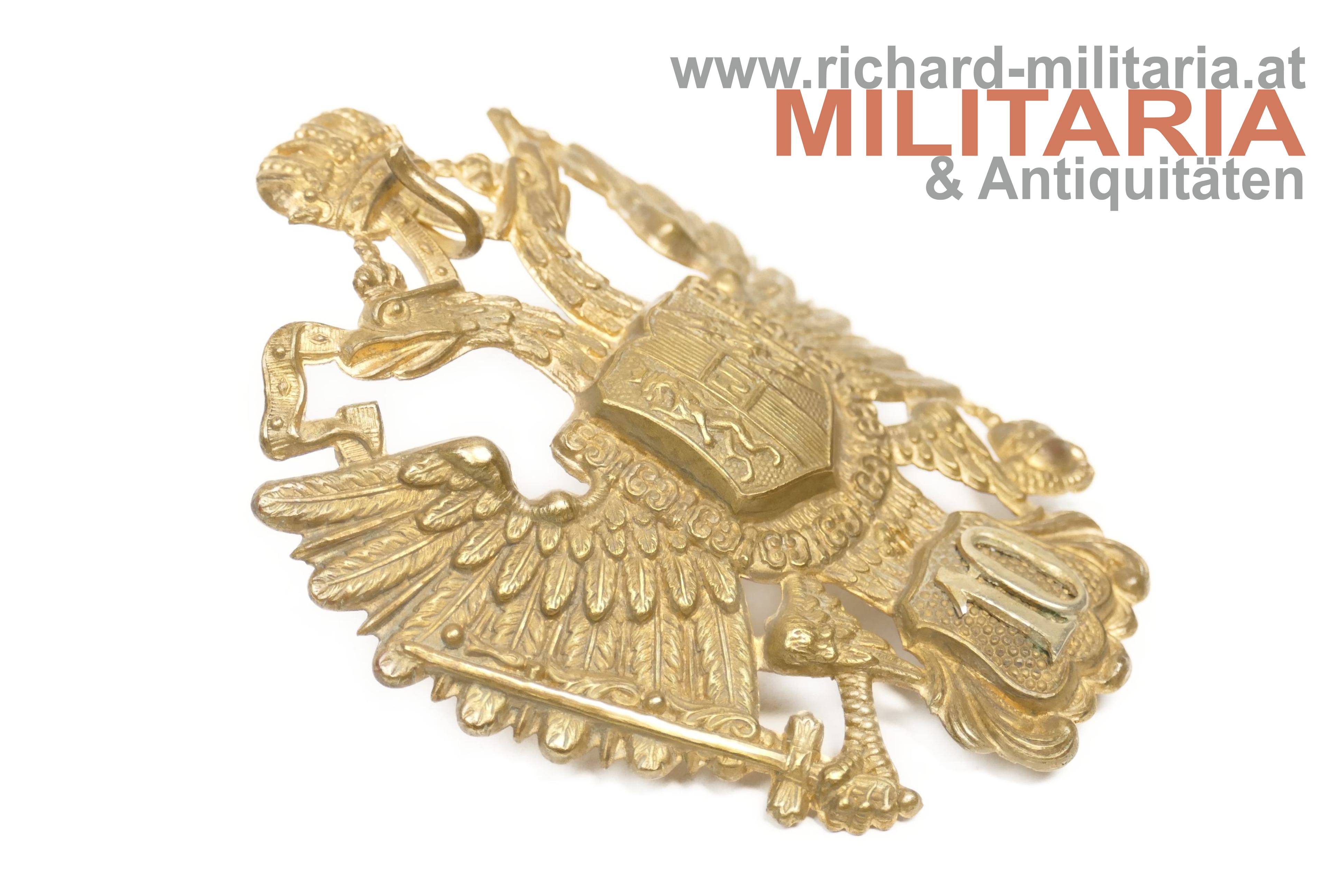 k.u.k. Artillerie-Tschako-Adler - vor 1908; Tombak vergoldet; mit aufgesplinteter Regiments/Truppen Nr. 10 so wie bis 1908 vorgeschrieben; zwischen den Adlerköpfen die Einhängevorrichtung für die Panzerkettchen; das Kreuz auf der Krone fehlt; revers mit zwei Splinten;