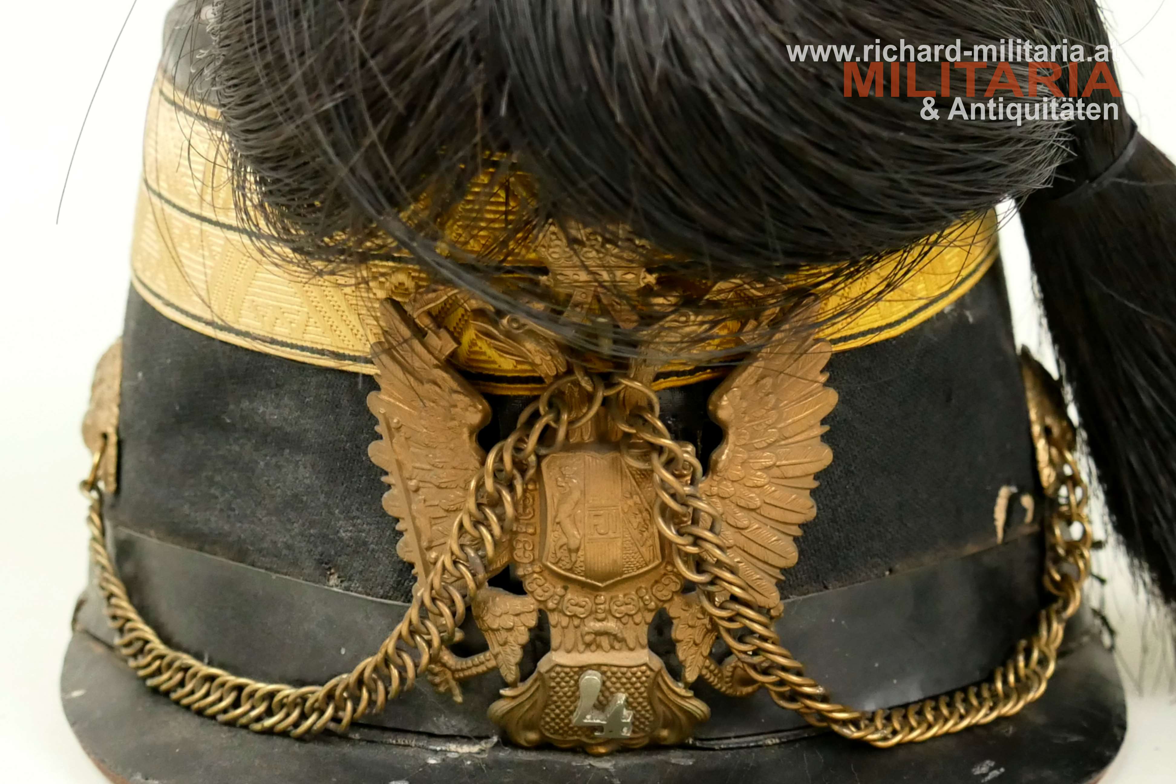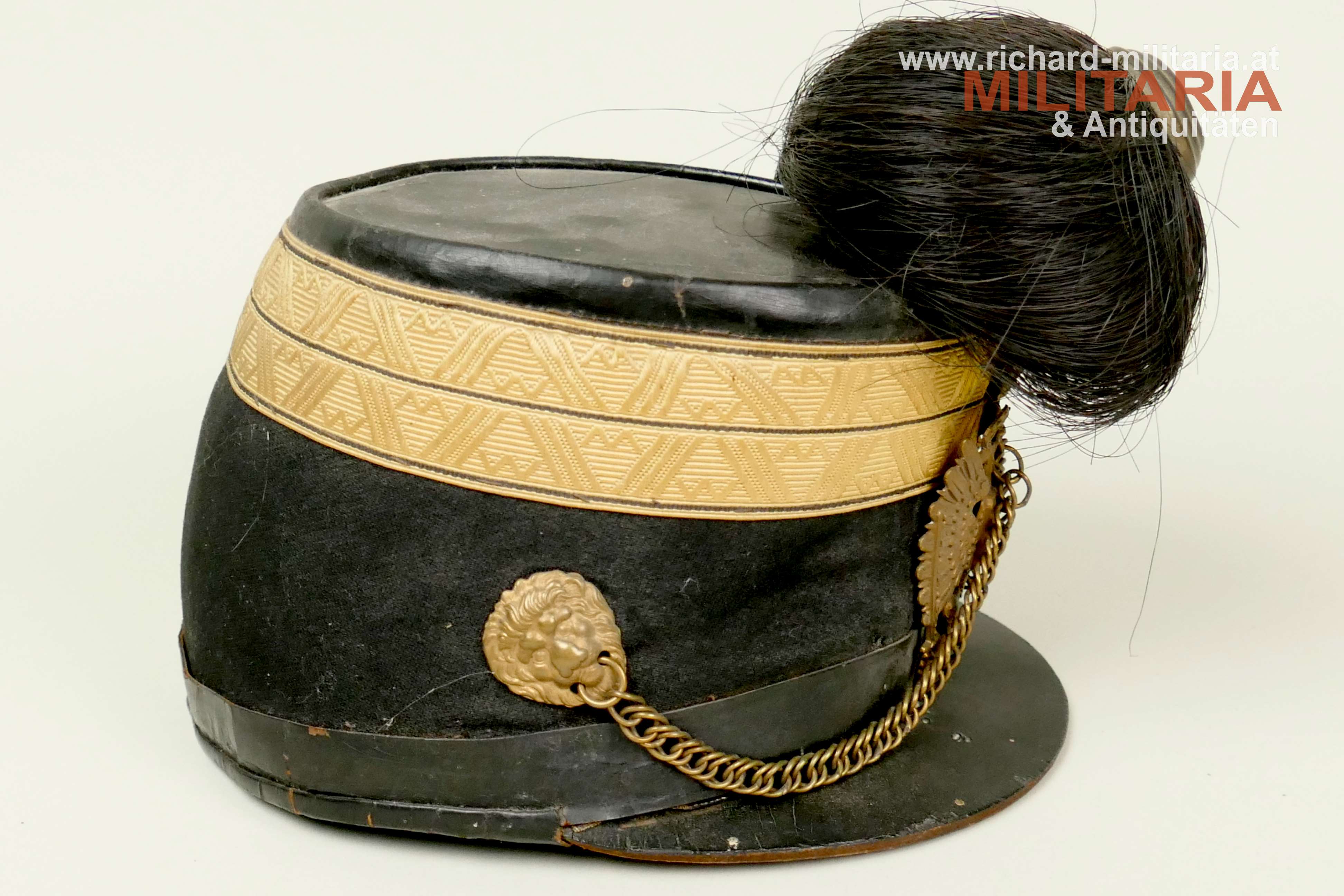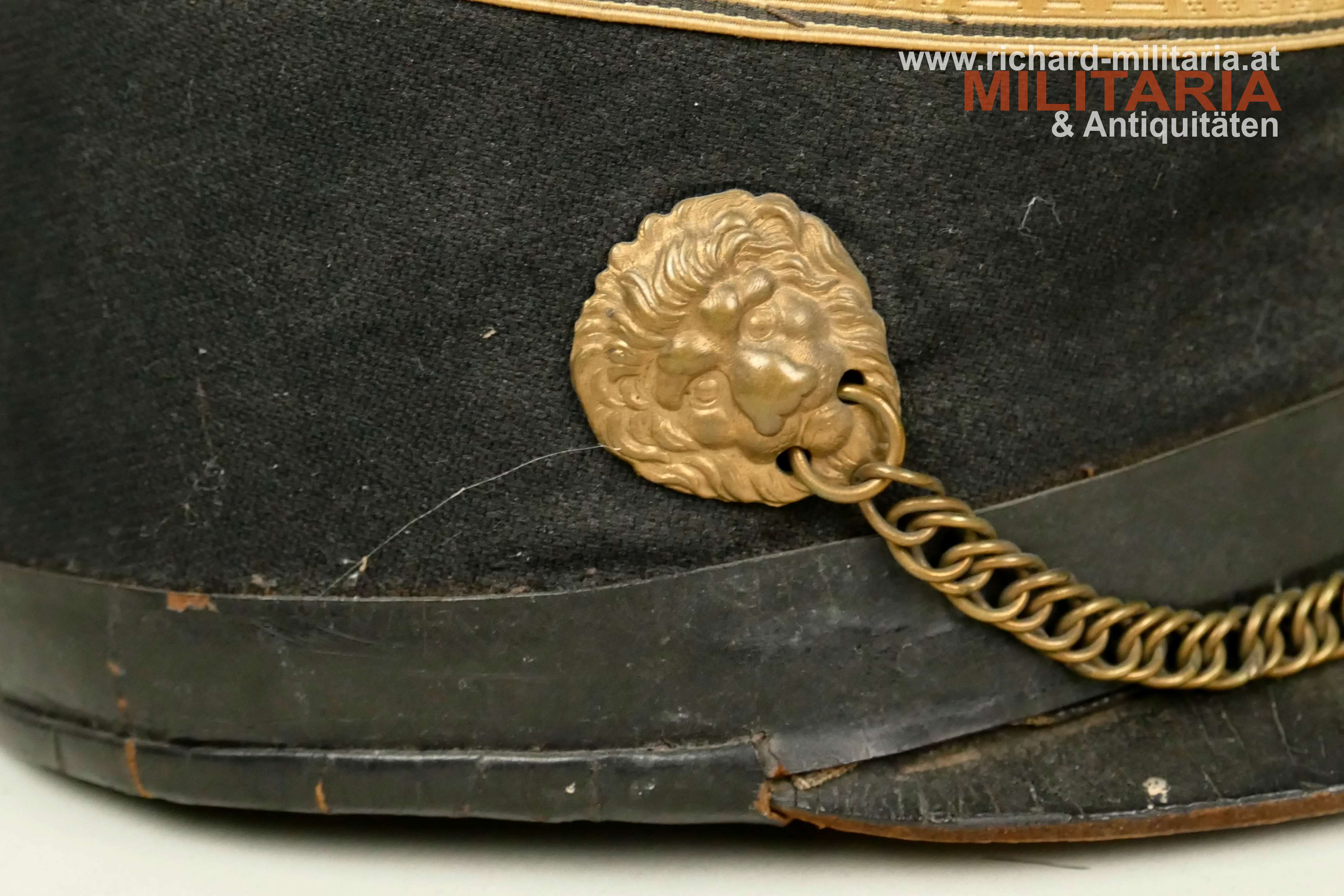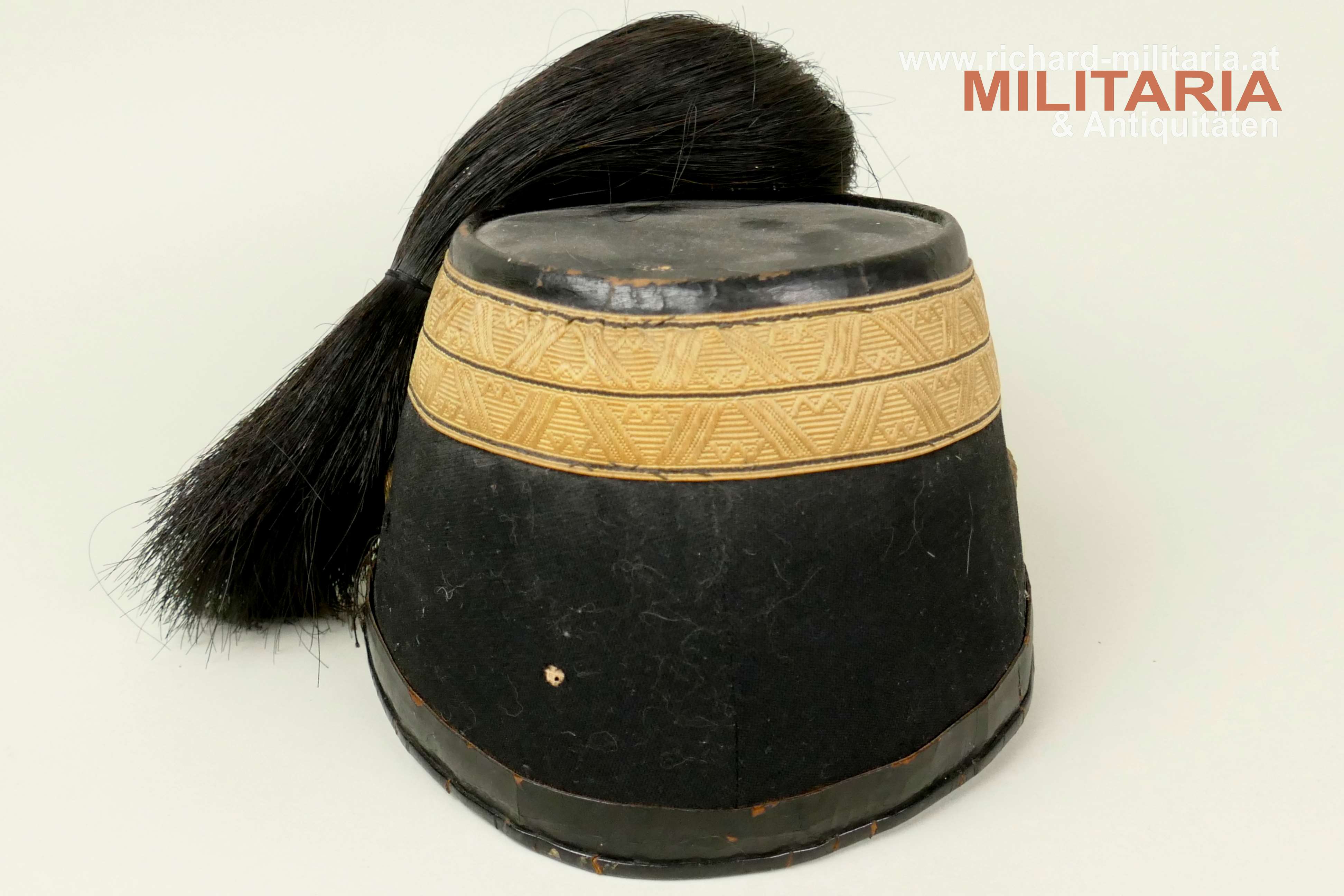 k.u.k. Artillerie-Tschako eines Fähnrichs des Artillerie Regiments Nr. 4; Korpus mit schwarzem Stoff überzogen; darauf eine zweiteilige umlaufende kaisergelbe Wollborte für einen Fähnrich; vorne aufgelegter Doppeladler mit dem Allerhöchsten Namenszug "FJ1"; darunter die Regimentsnummer "4" = Ausführung vor 1908; auf dem Rosshaarbusch aufgesetzte Mannschaftskokarde "FJ1"; goldene Panzerkettchen an dem Doppeladler sowie an den seitlichen Löwenköpfen fixiert; braunes Stirnleder; innen mit schwarzem Seidenstoff ausgelegt; Korpus etwas weich; mehrere kleinere Mottenlöcher im schwarzen Stoff; Deckel mit oberflächlichen Sprüngen; Seidenstoff innen etwas zerschlissen; verstaubt.