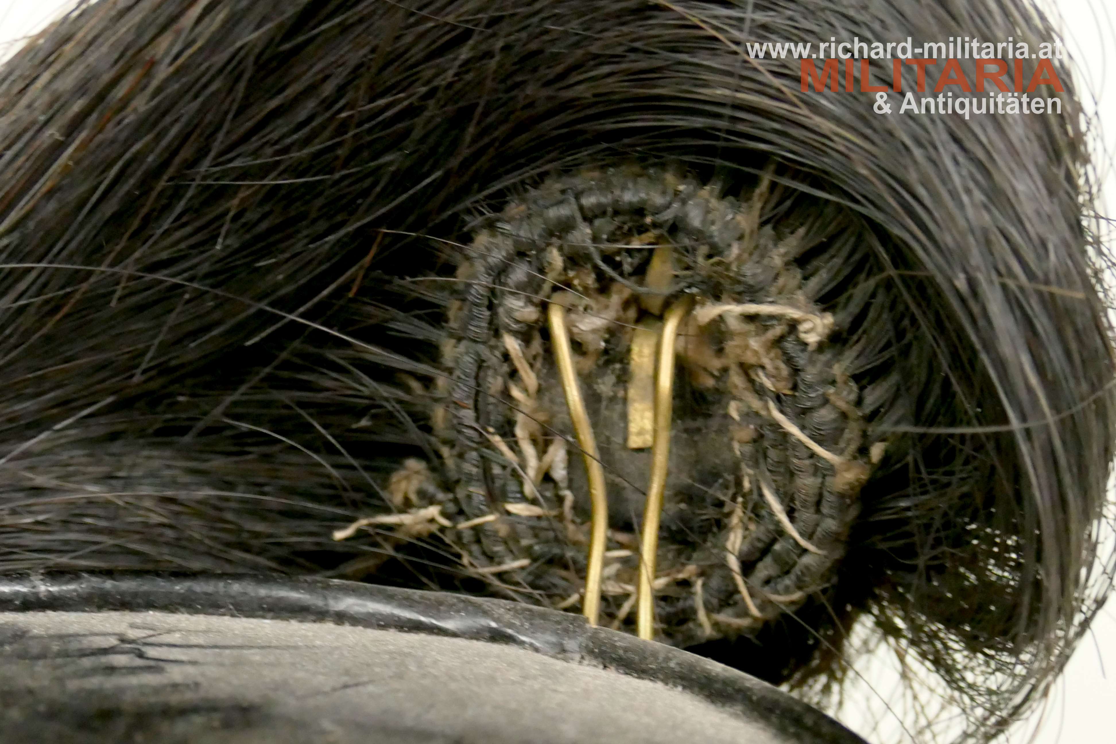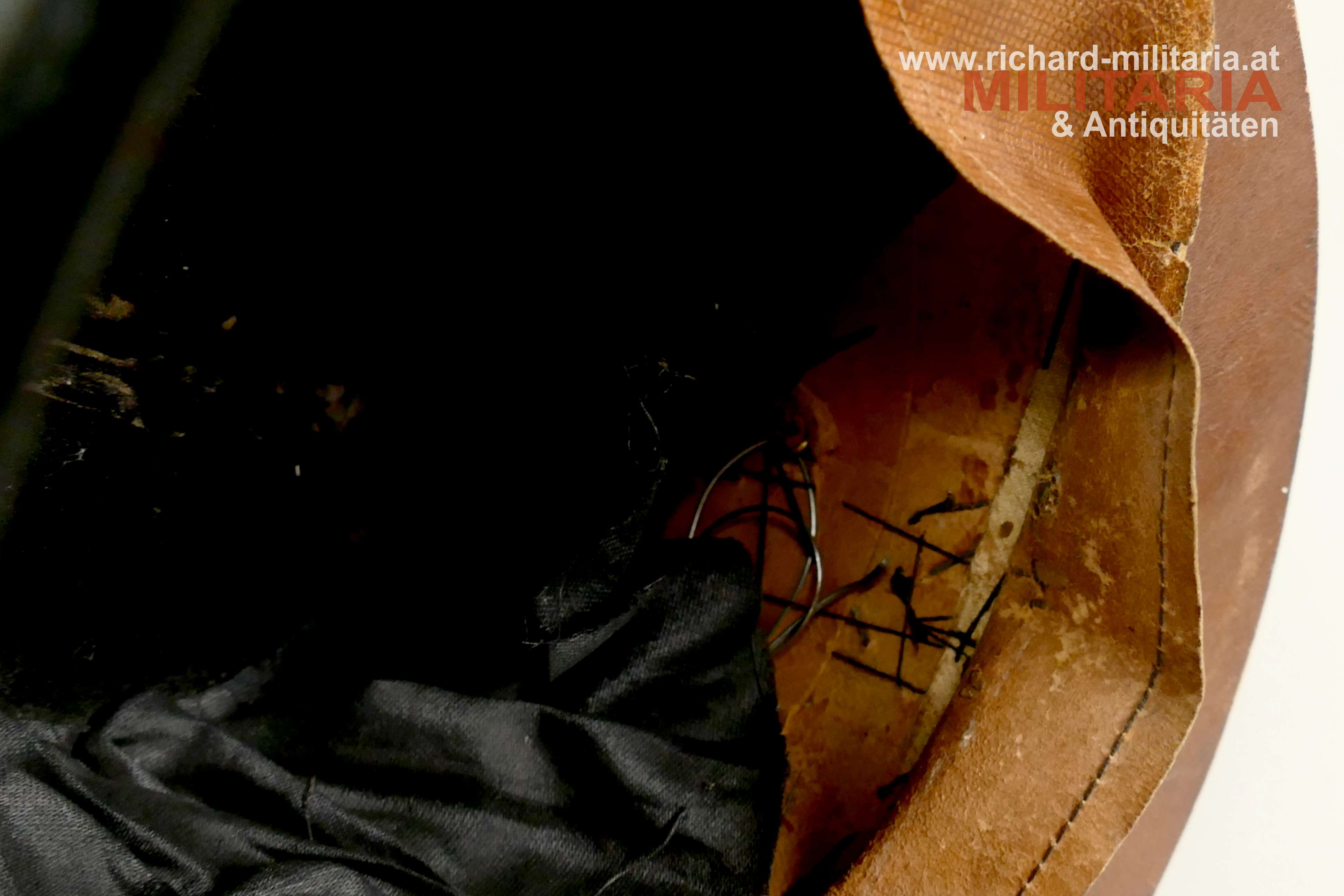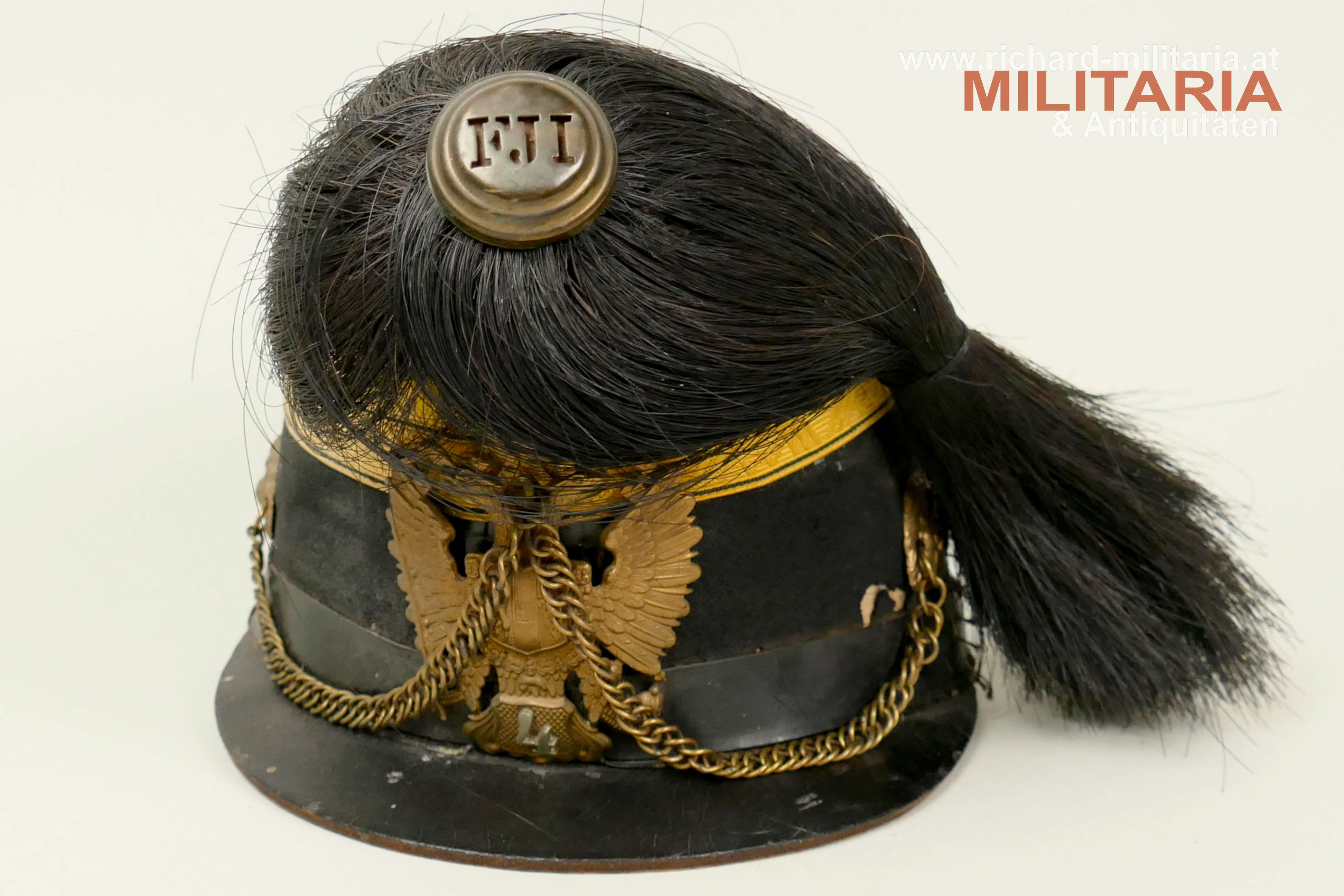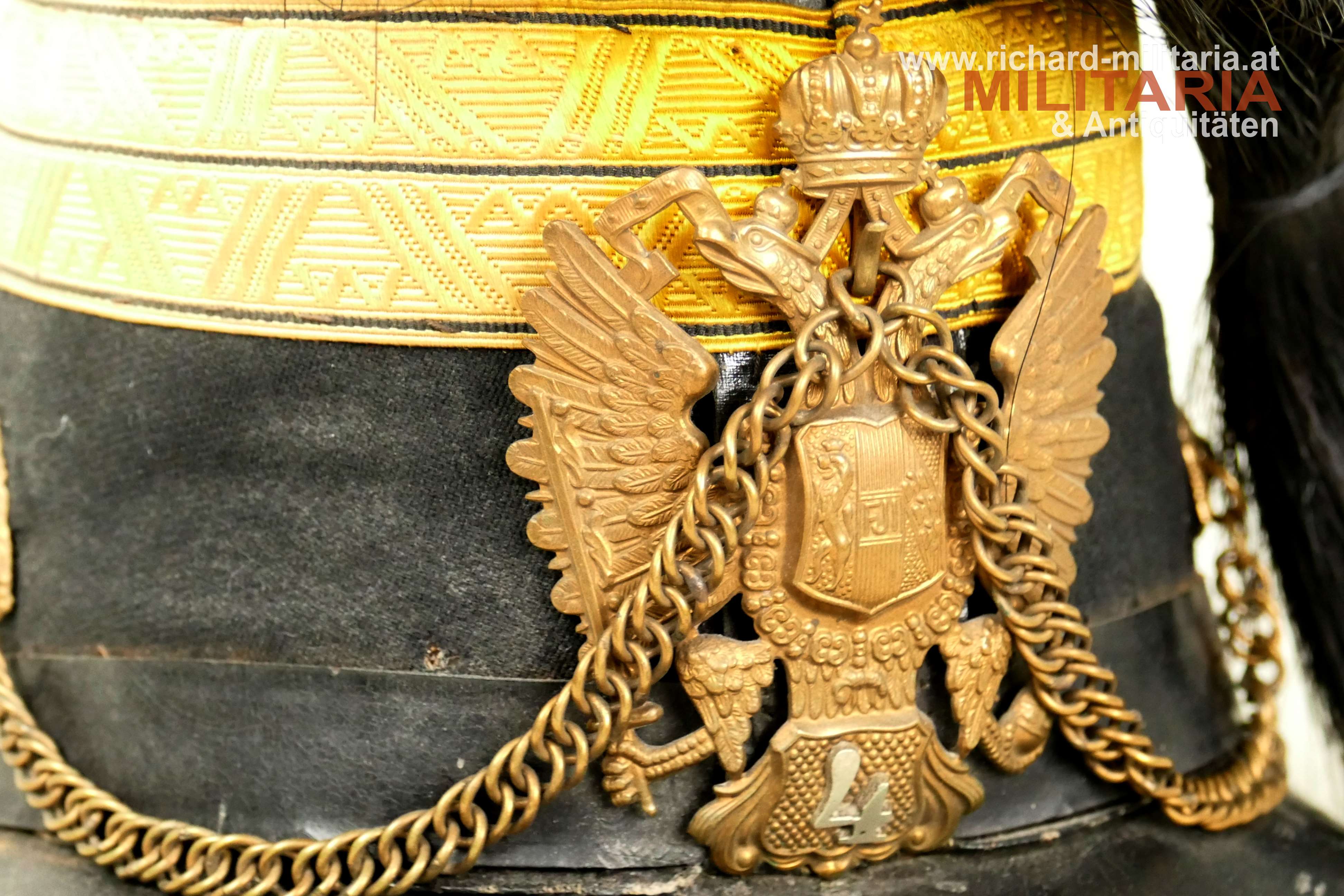 k.u.k. Artillerie-Tschako eines Fähnrichs des Artillerie Regiments Nr. 4; Korpus mit schwarzem Stoff überzogen; darauf eine zweiteilige umlaufende kaisergelbe Wollborte für einen Fähnrich; vorne aufgelegter Doppeladler mit dem Allerhöchsten Namenszug "FJ1"; darunter die Regimentsnummer "4" = Ausführung vor 1908; auf dem Rosshaarbusch aufgesetzte Mannschaftskokarde "FJ1"; goldene Panzerkettchen an dem Doppeladler sowie an den seitlichen Löwenköpfen fixiert; braunes Stirnleder; innen mit schwarzem Seidenstoff ausgelegt; Korpus etwas weich; mehrere kleinere Mottenlöcher im schwarzen Stoff; Deckel mit oberflächlichen Sprüngen; Seidenstoff innen etwas zerschlissen; verstaubt.