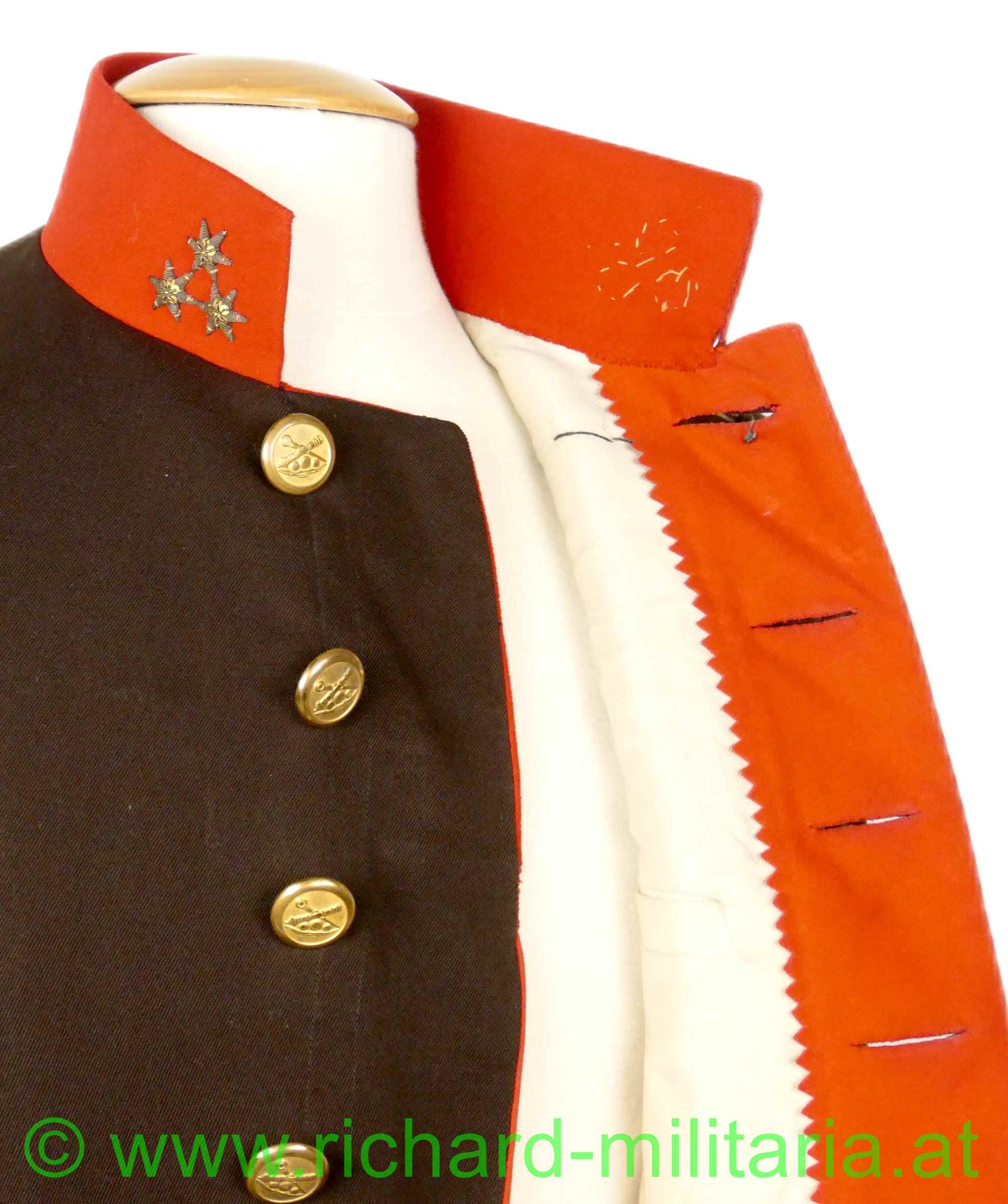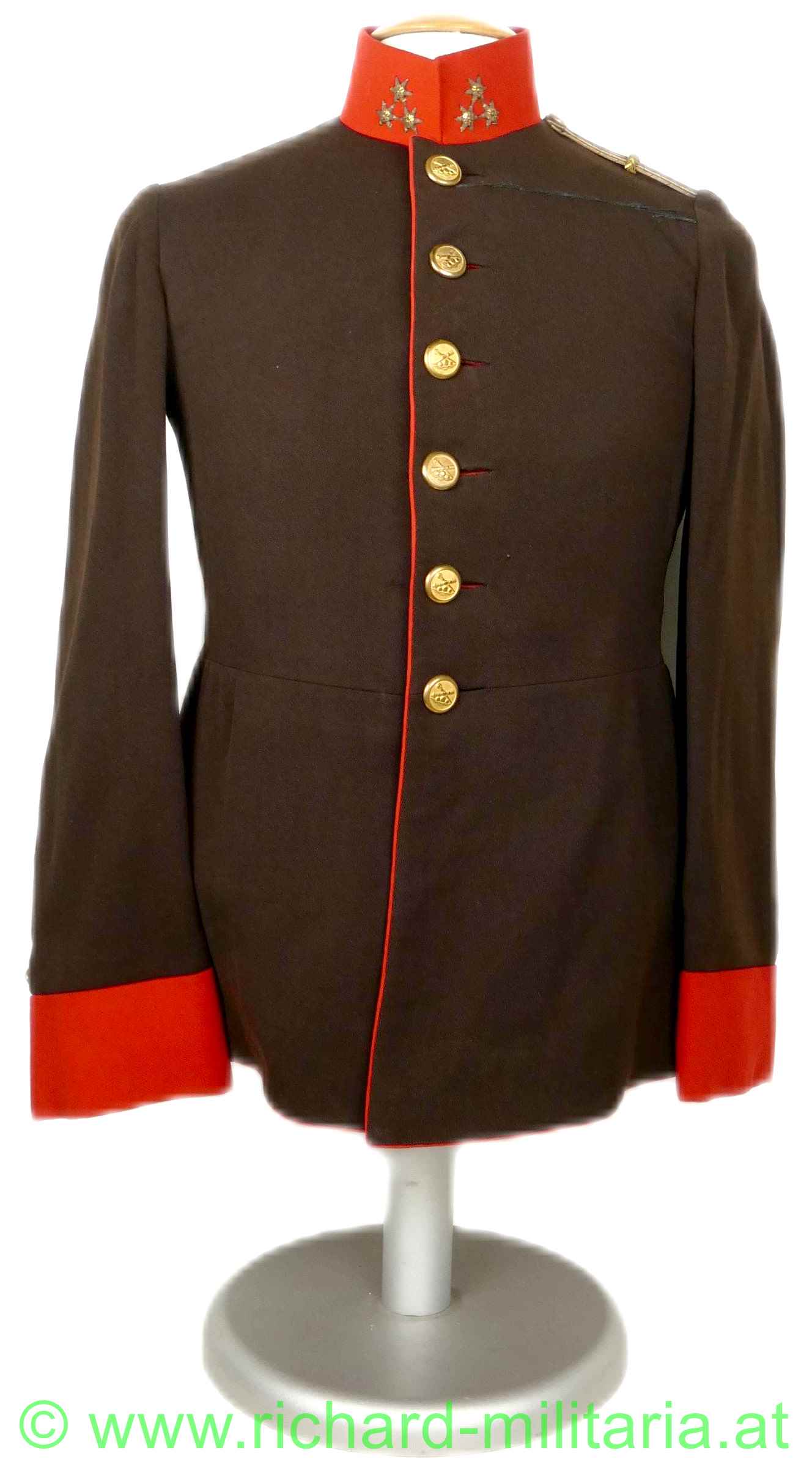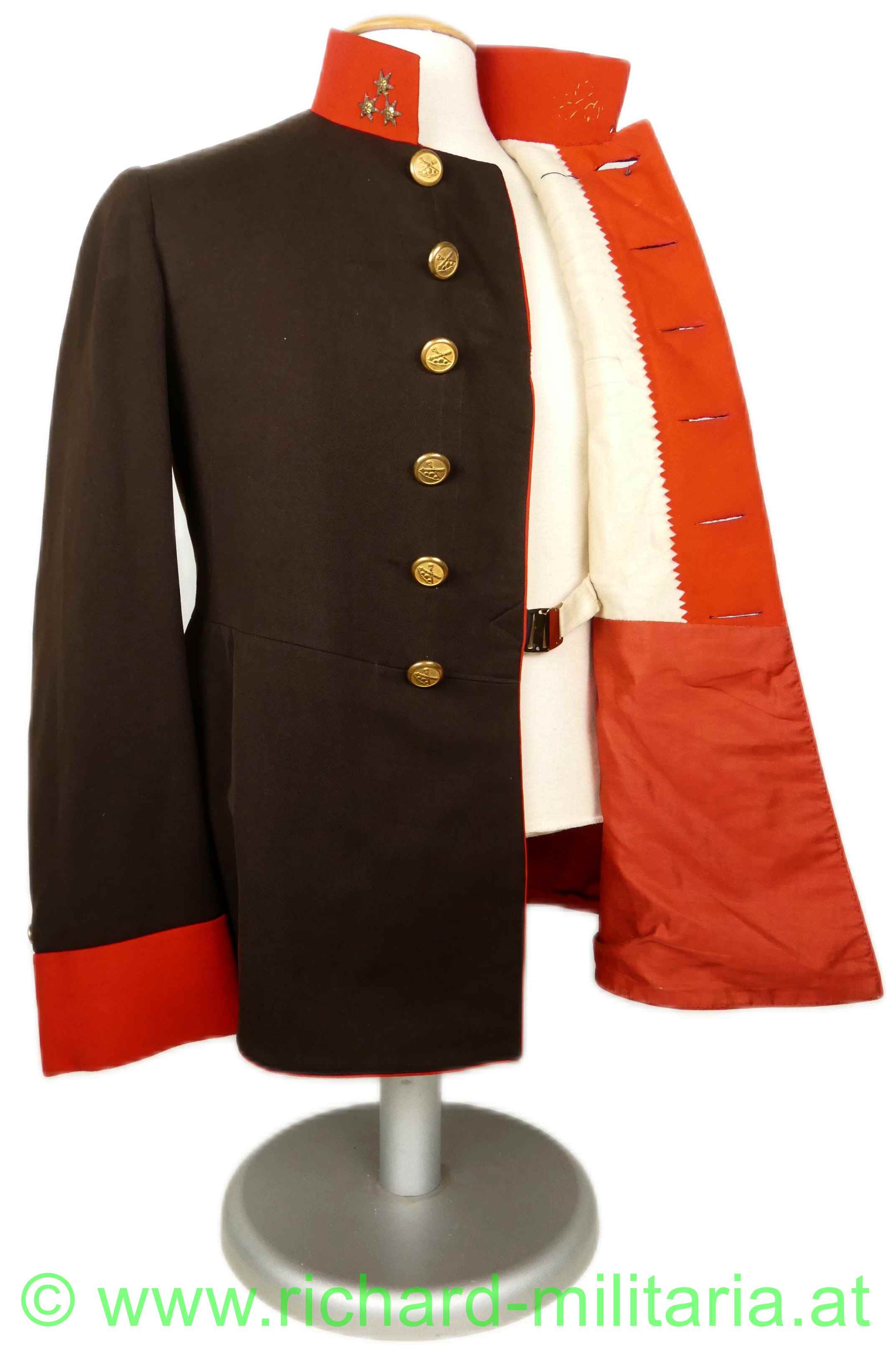 Uniformrock für einen k.u.k. Hauptmann bei der Artillerie; braunes Tuch mit roten Vorstößen an den Ärmeln und am Kragen; auf beiden Seiten am Kragen 3 gestickte, goldene Distinktionssterne für einen Hauptmann; auf der linken Schulter die Achselspange mit einem kleinen vergoldeten Artillerieknopf vernäht; einreihig 6 vergoldete Knöpfe mit Artilleriedesign, sowie jeweils ein kleiner, vergoldeter Artillerieknopf am Ärmel direkt über den roten Vorstößen; vernähte schwarze Schnüre auf der linken Brusthöhe zum Einhängen von Auszeichnungen; innen ist der obere Teil mit beiger Seide gefüttert, beim Schoßteil mit rotem Futter; kleinere Mottenaufrauungen; kleinere nachträglich vernähte Stellen innen beim Übergang der Jacke zu den Ärmeln;