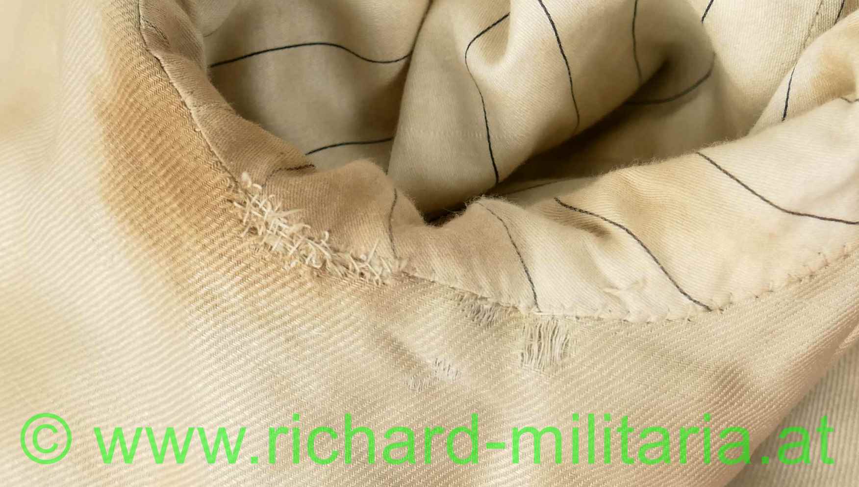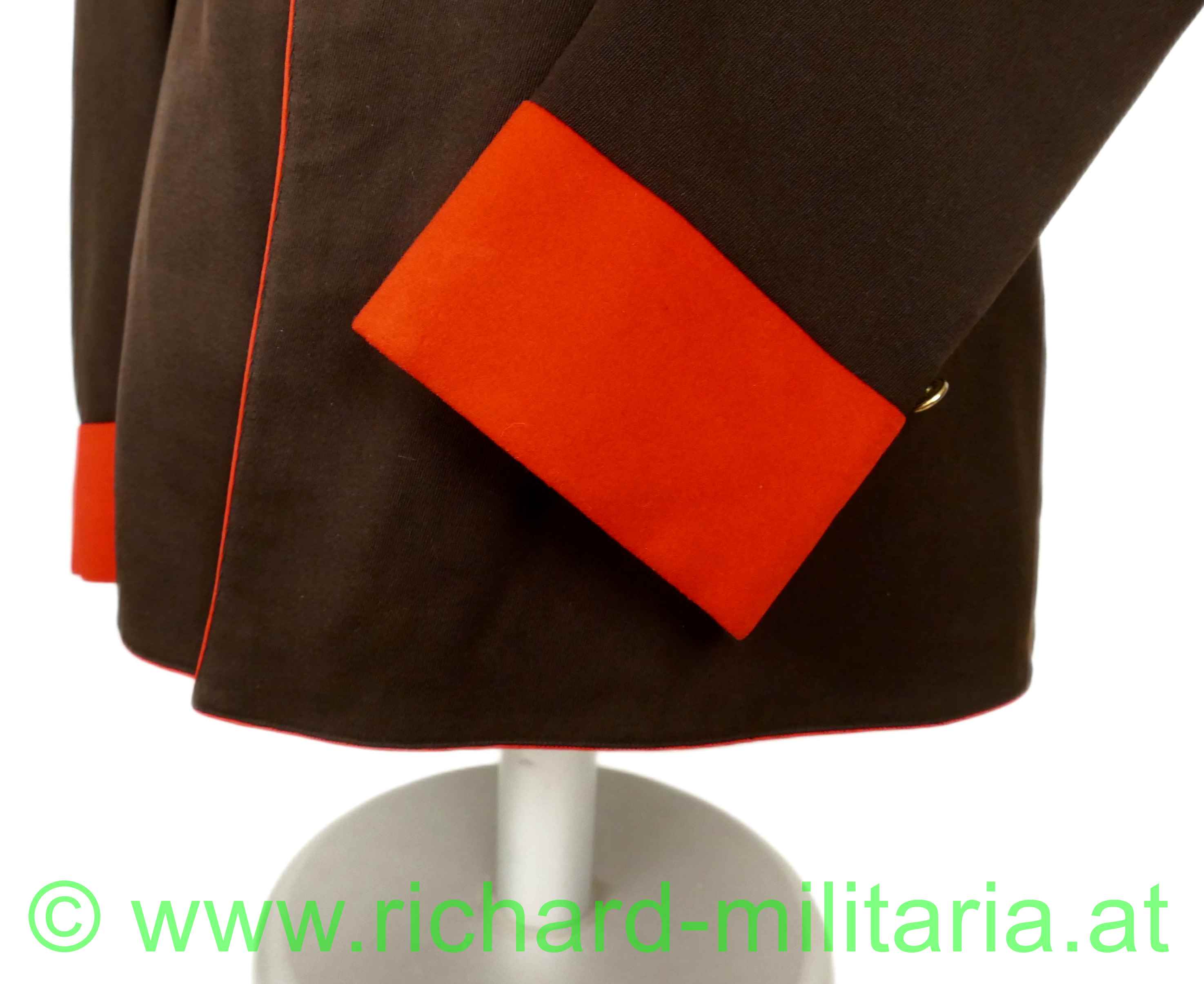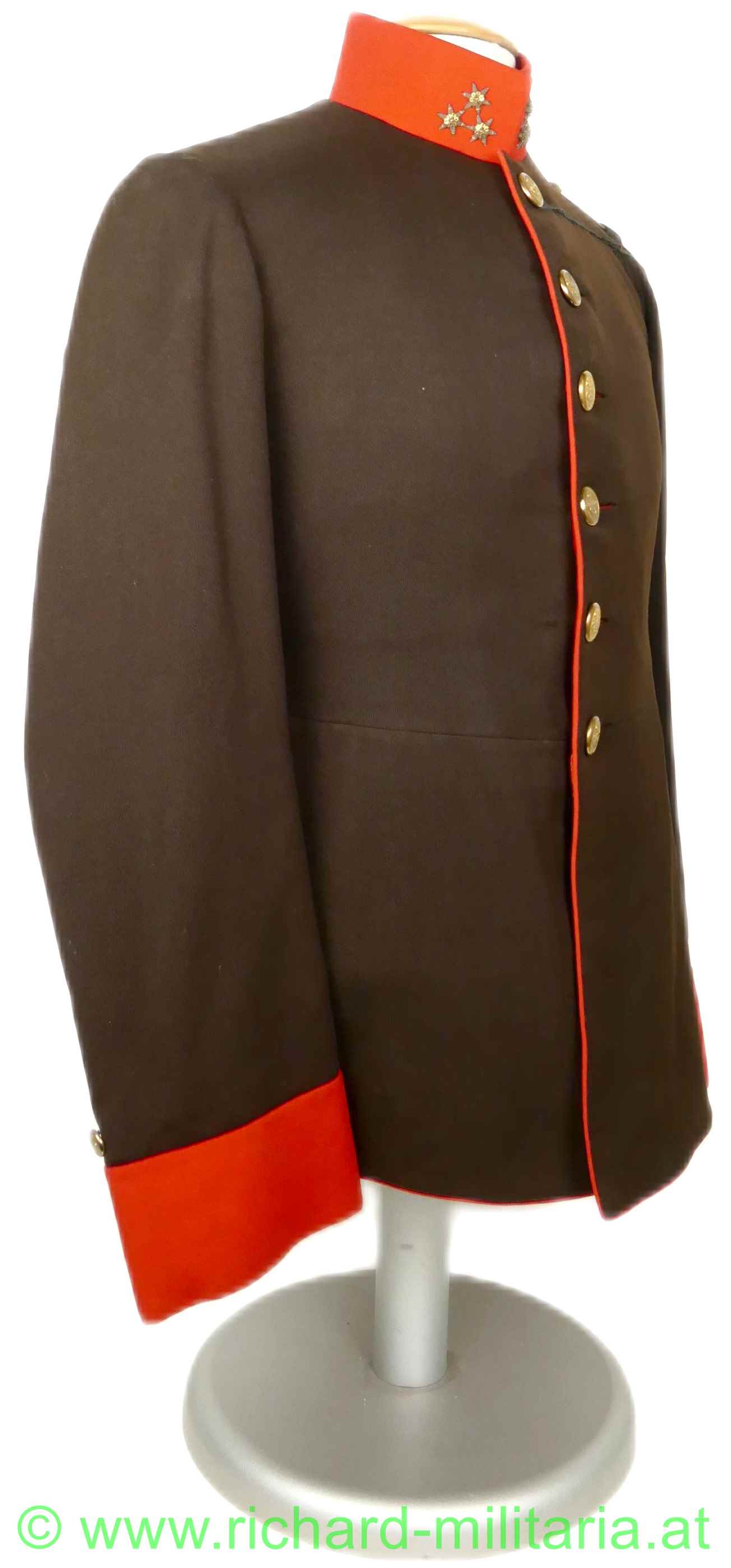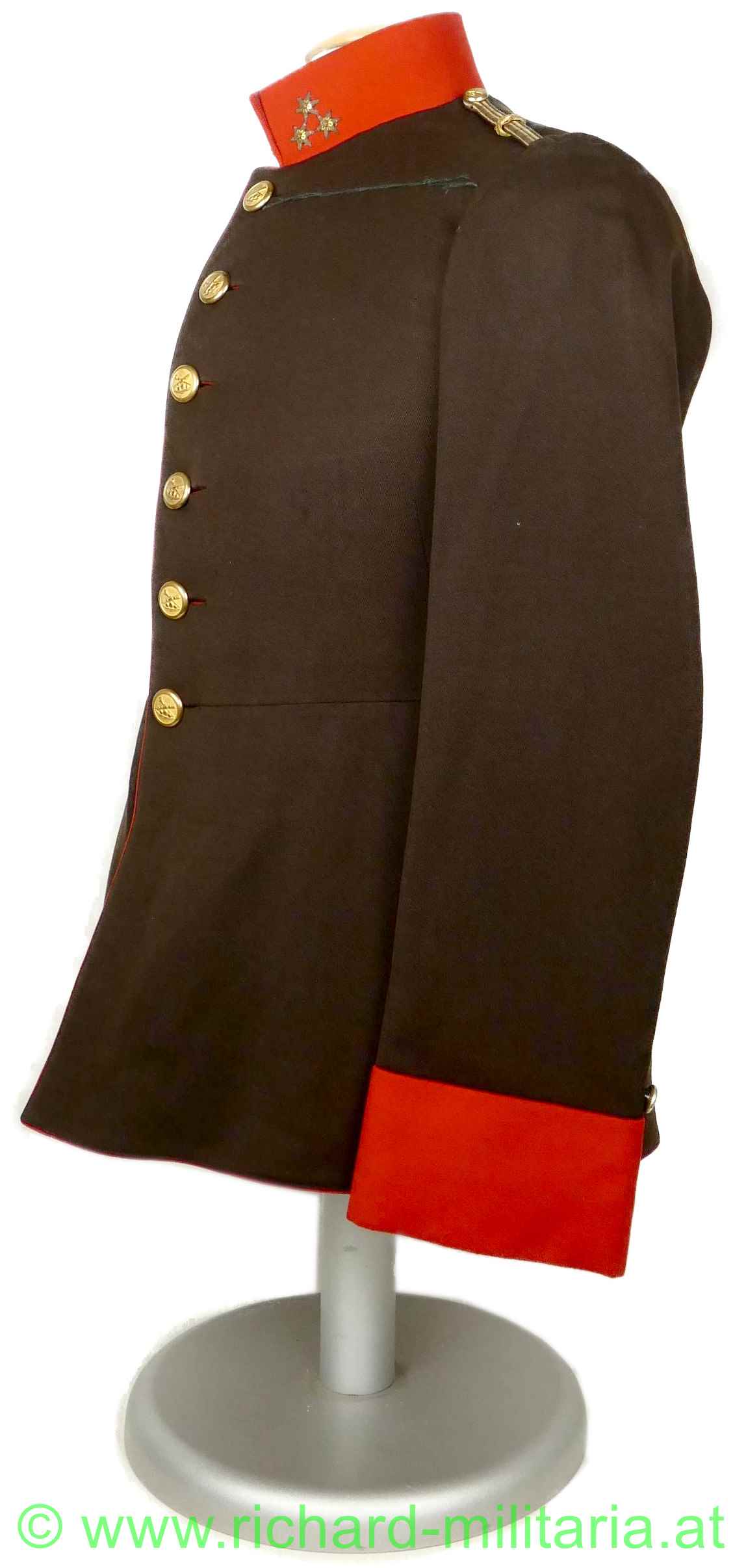 Uniformrock für einen k.u.k. Hauptmann bei der Artillerie; braunes Tuch mit roten Vorstößen an den Ärmeln und am Kragen; auf beiden Seiten am Kragen 3 gestickte, goldene Distinktionssterne für einen Hauptmann; auf der linken Schulter die Achselspange mit einem kleinen vergoldeten Artillerieknopf vernäht; einreihig 6 vergoldete Knöpfe mit Artilleriedesign, sowie jeweils ein kleiner, vergoldeter Artillerieknopf am Ärmel direkt über den roten Vorstößen; vernähte schwarze Schnüre auf der linken Brusthöhe zum Einhängen von Auszeichnungen; innen ist der obere Teil mit beiger Seide gefüttert, beim Schoßteil mit rotem Futter; kleinere Mottenaufrauungen; kleinere nachträglich vernähte Stellen innen beim Übergang der Jacke zu den Ärmeln;