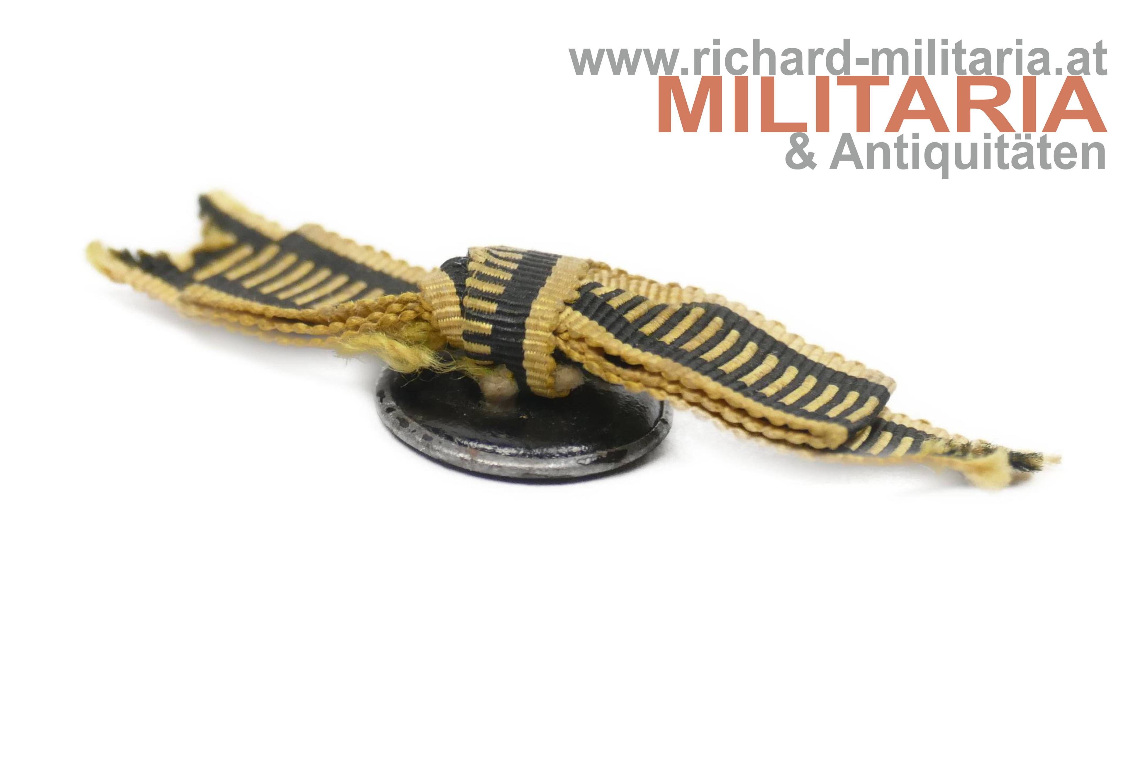 k.u.k. Bandschleife-Miniatur im Stile des Bandes der Kriegsmedaille 1873; revers zeitgenössisch vernähter schwarz lackierter Eisenknopf;