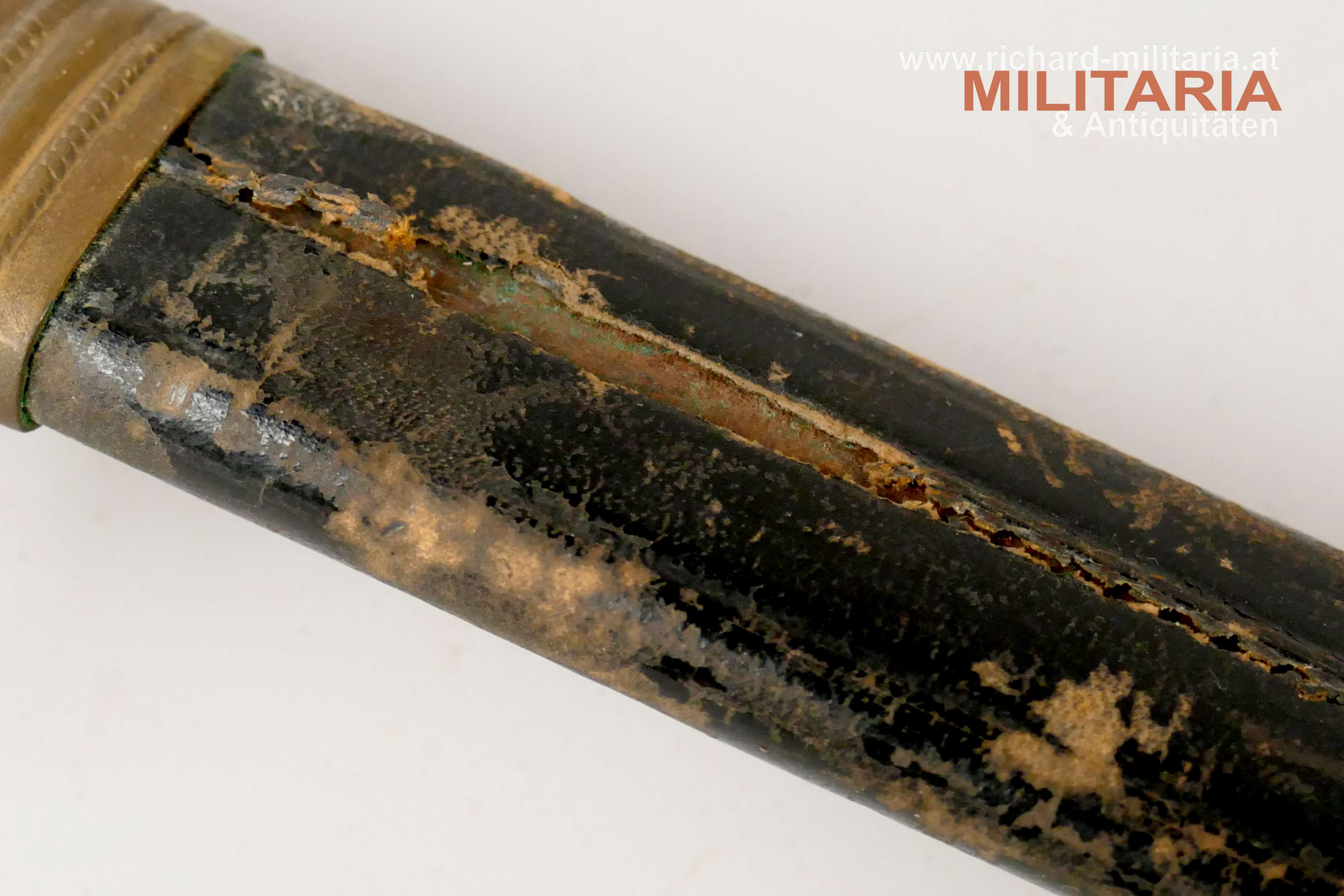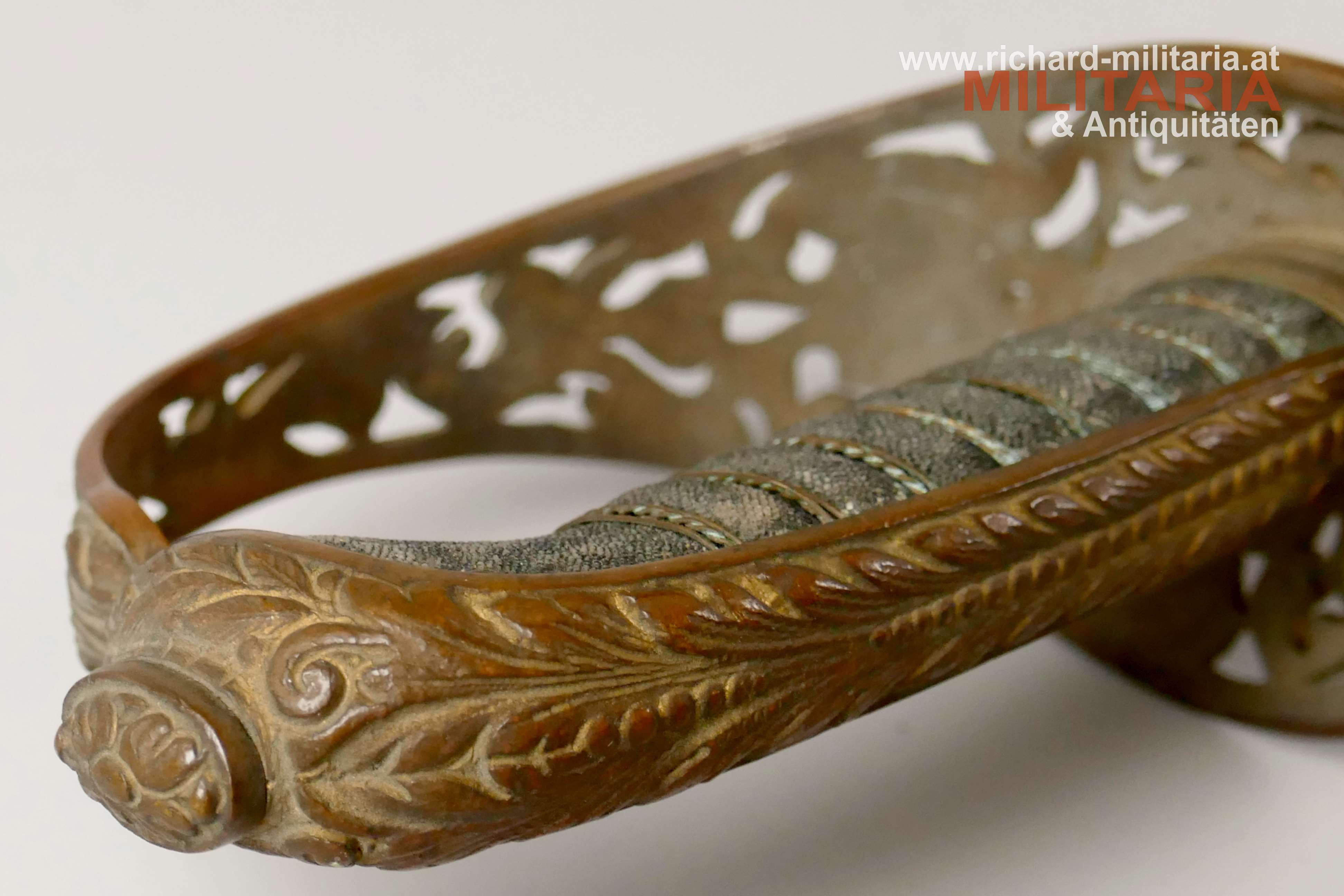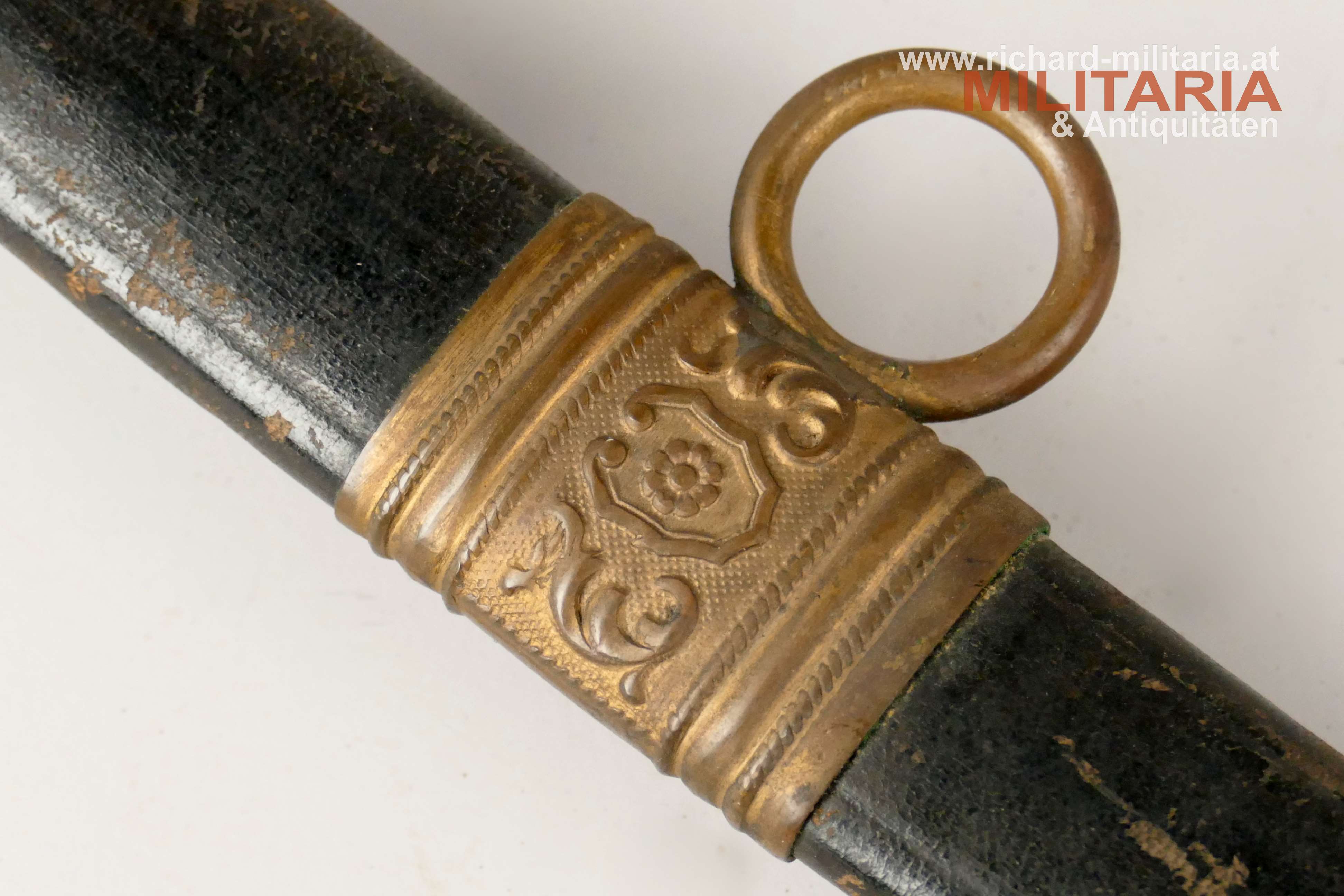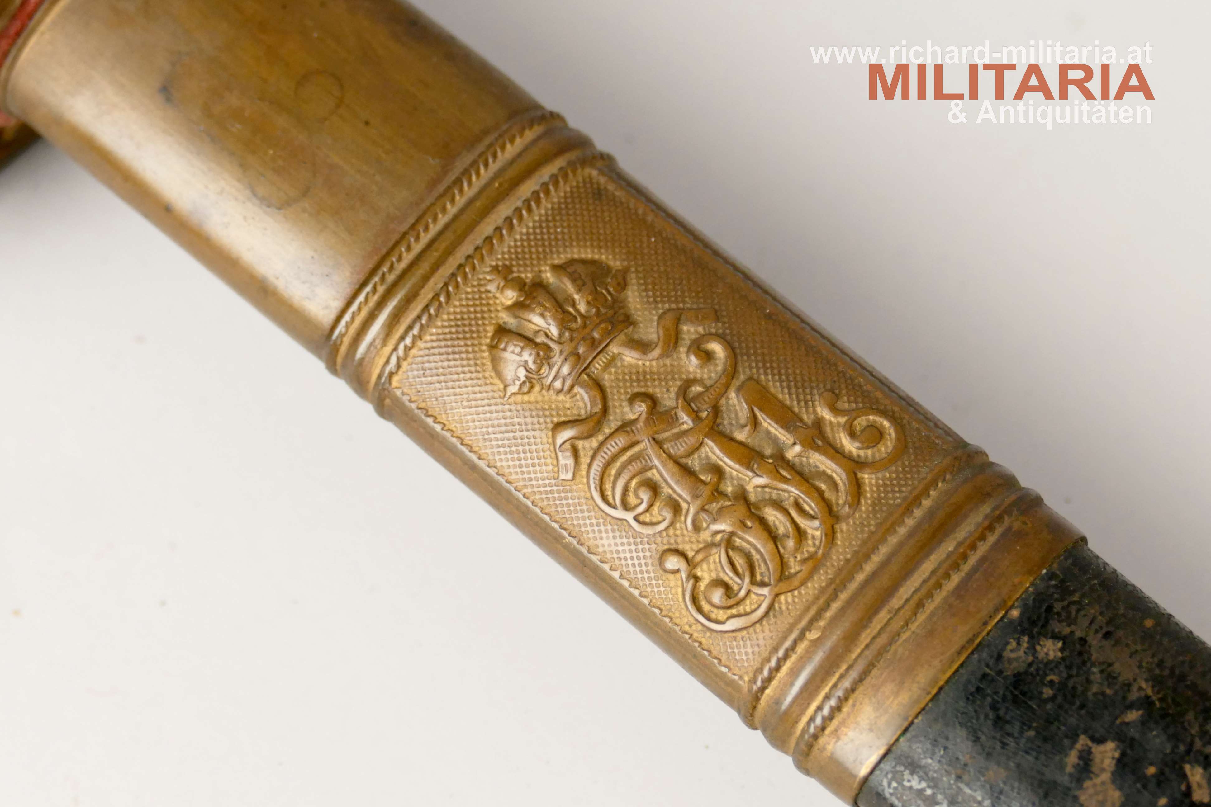 k.u.k. Beamtendegen M1889; beidseitig gekehlte vernickelte Klinge in sehr guter Erhaltung; am Klingenansatz "Weyersberg Kirschbaum & Co Solingen"; durchbrochener floral verzierter und vergoldeter Messingkorb; Griff aus Fischhaut mit vergoldeter Drahtwicklung (obere Wicklung leicht geöffnet); belederte Eisenscheide mit vergoldeten Messingbeschlägen; darauf der Allerhöchste Namenszug "FJ1"; Belederung mit stärkeren Abnutzungsspuren und auf der Rückseite an der Naht mit kleiner Fehlstelle; Vergoldung weitgehend vergangen;