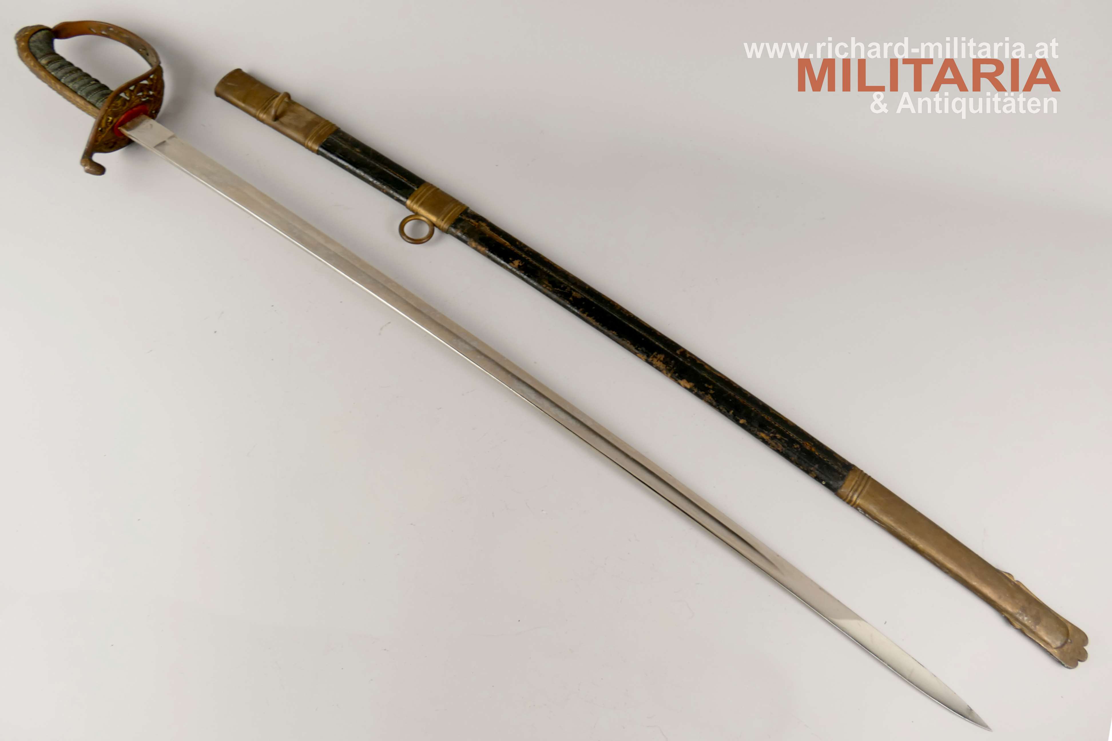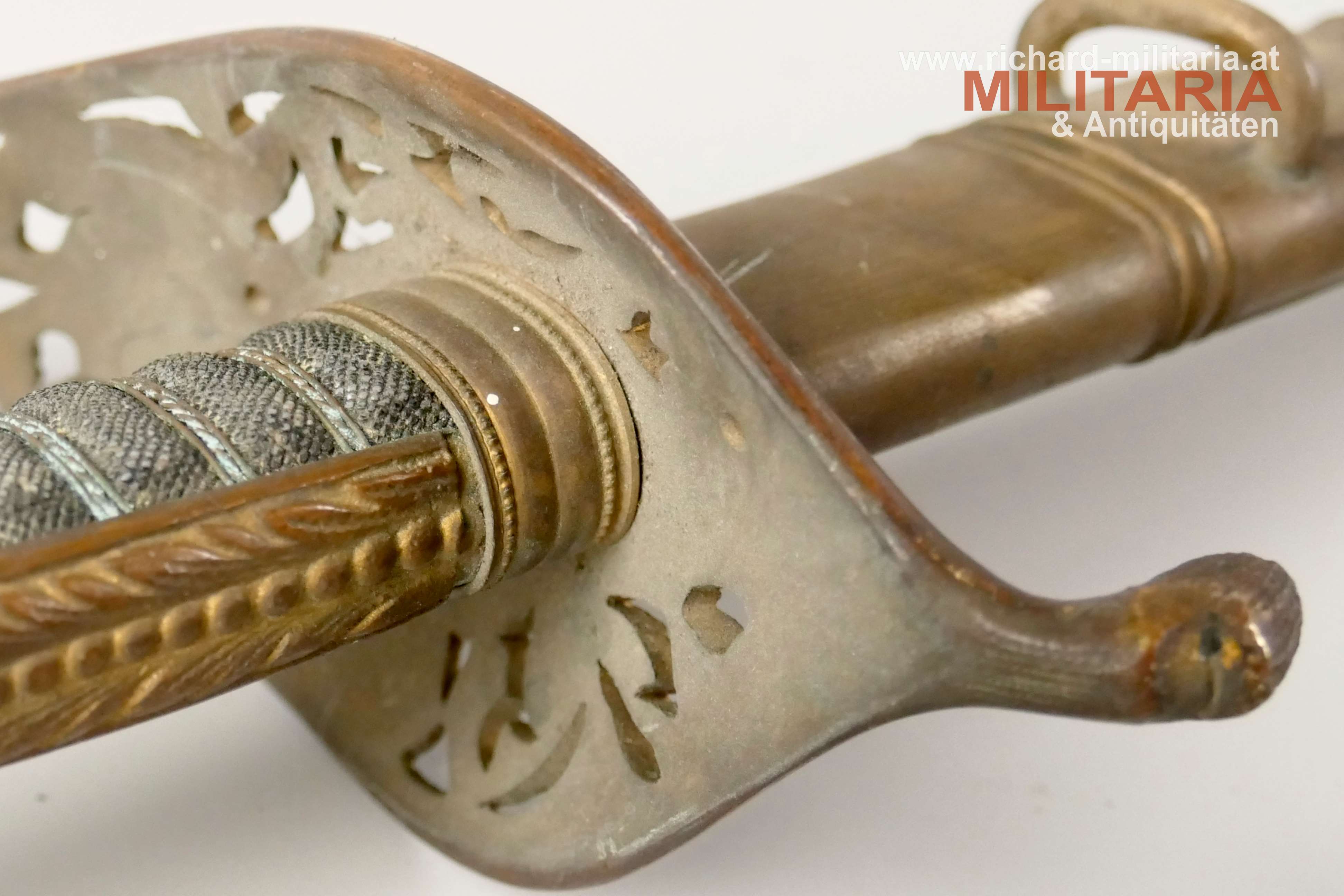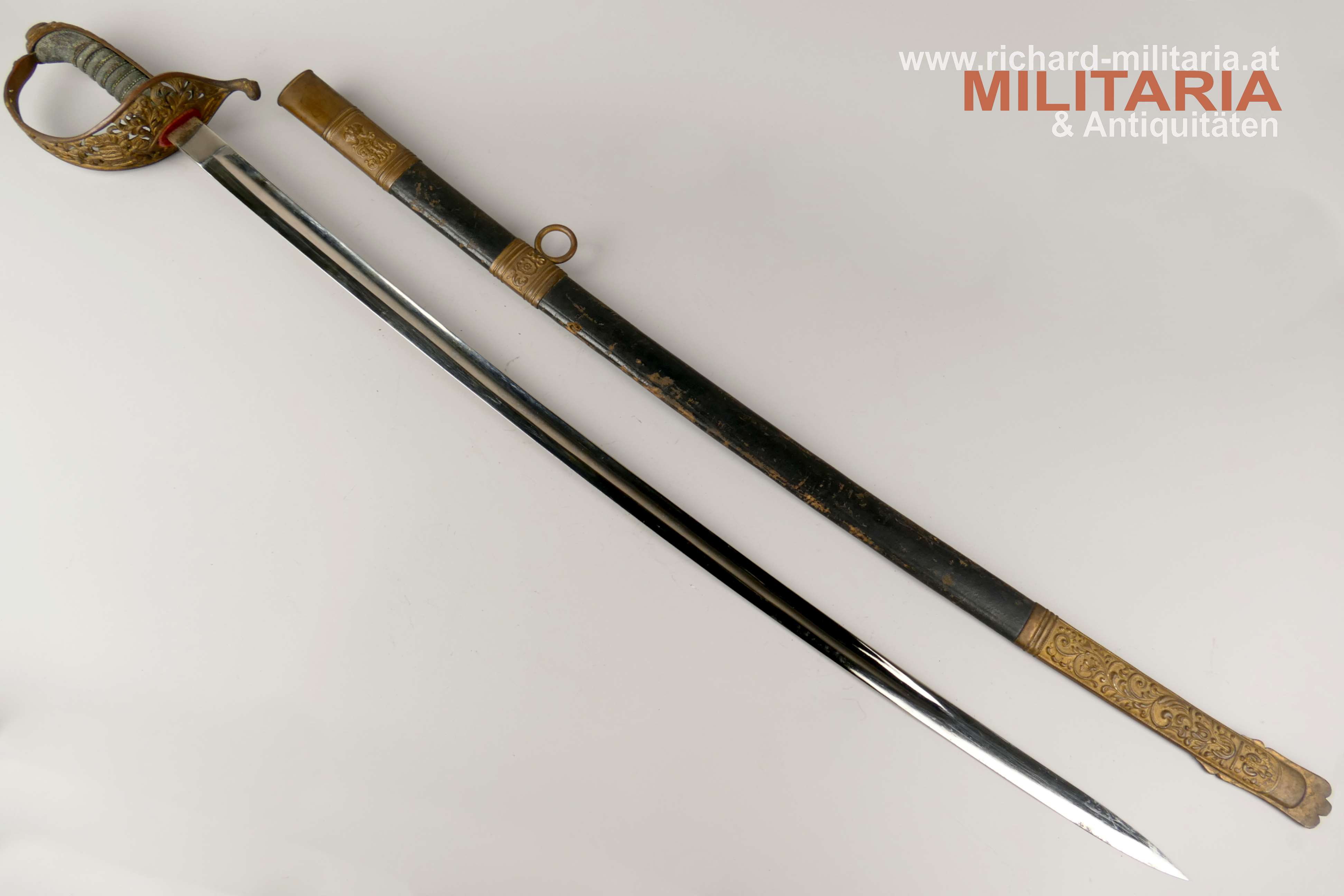 k.u.k. Beamtendegen M1889; beidseitig gekehlte vernickelte Klinge in sehr guter Erhaltung; am Klingenansatz "Weyersberg Kirschbaum & Co Solingen"; durchbrochener floral verzierter und vergoldeter Messingkorb; Griff aus Fischhaut mit vergoldeter Drahtwicklung (obere Wicklung leicht geöffnet); belederte Eisenscheide mit vergoldeten Messingbeschlägen; darauf der Allerhöchste Namenszug "FJ1"; Belederung mit stärkeren Abnutzungsspuren und auf der Rückseite an der Naht mit kleiner Fehlstelle; Vergoldung weitgehend vergangen;