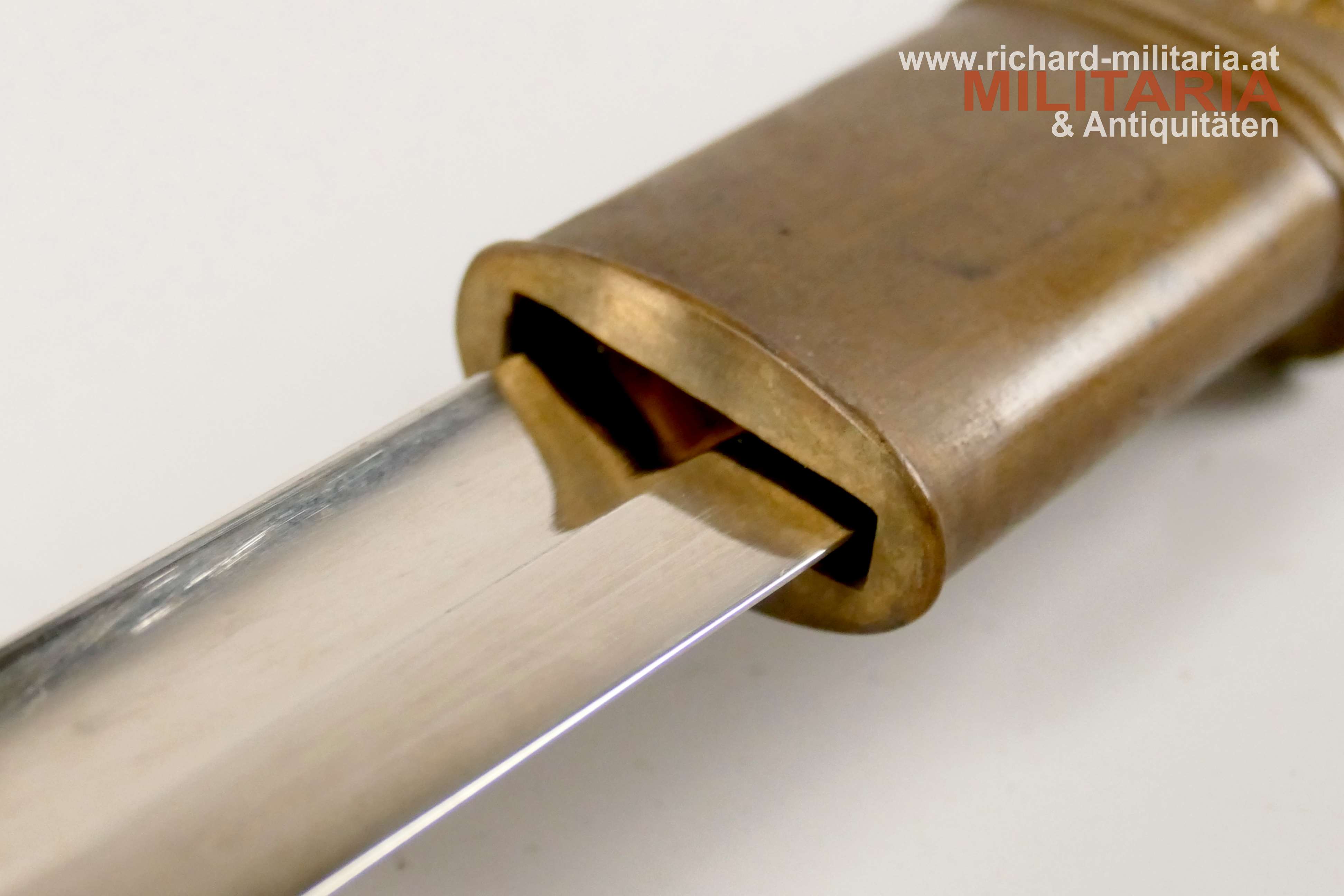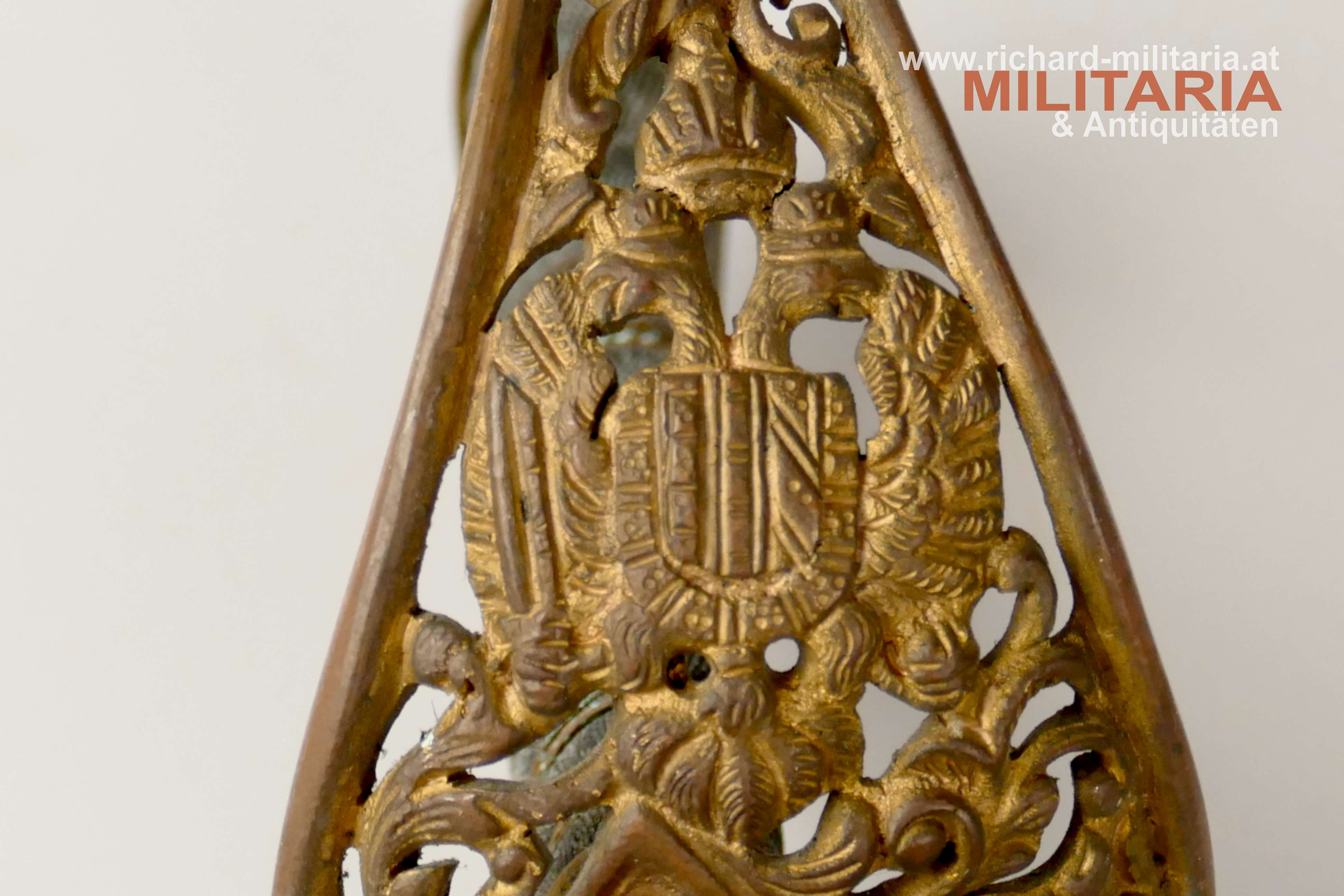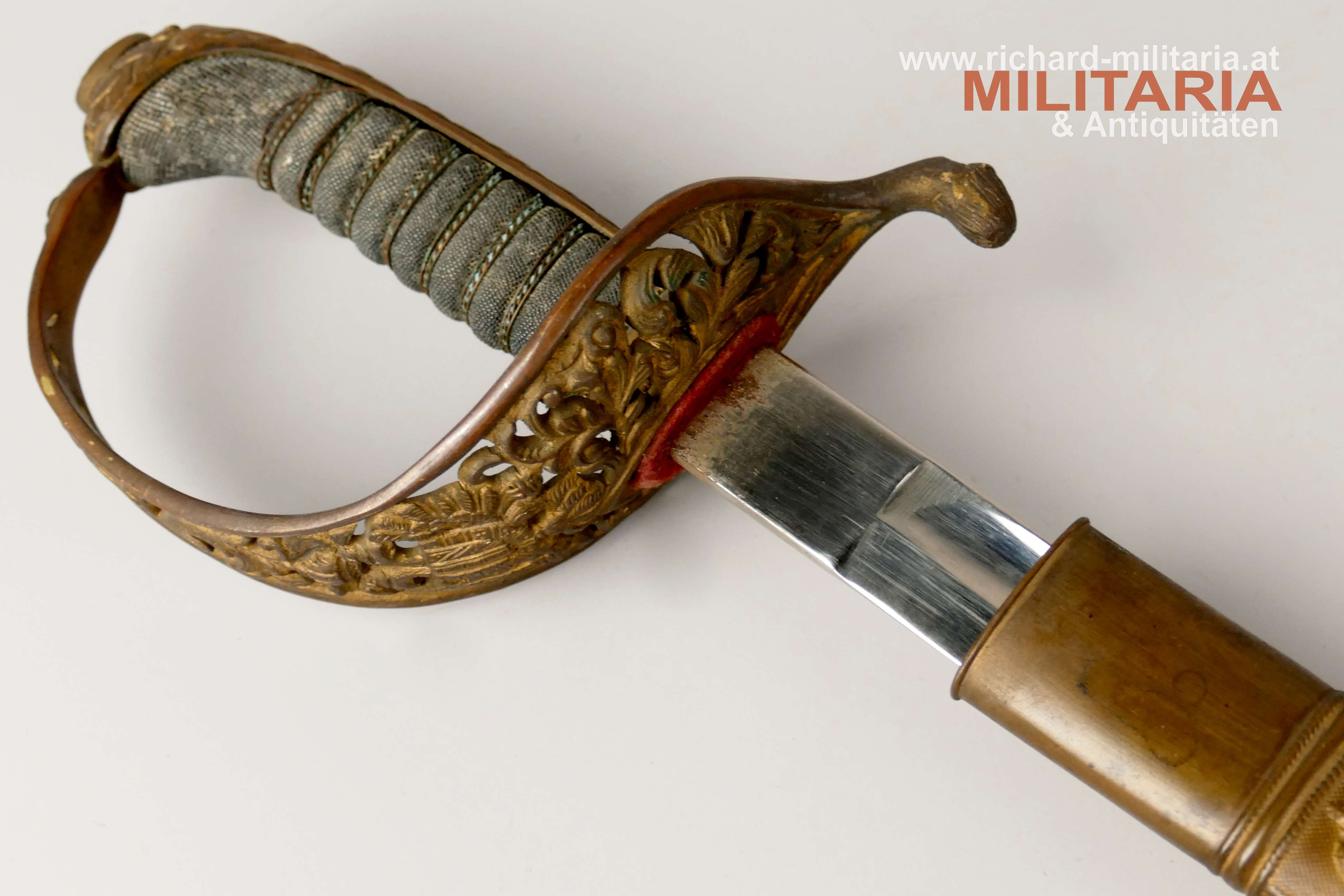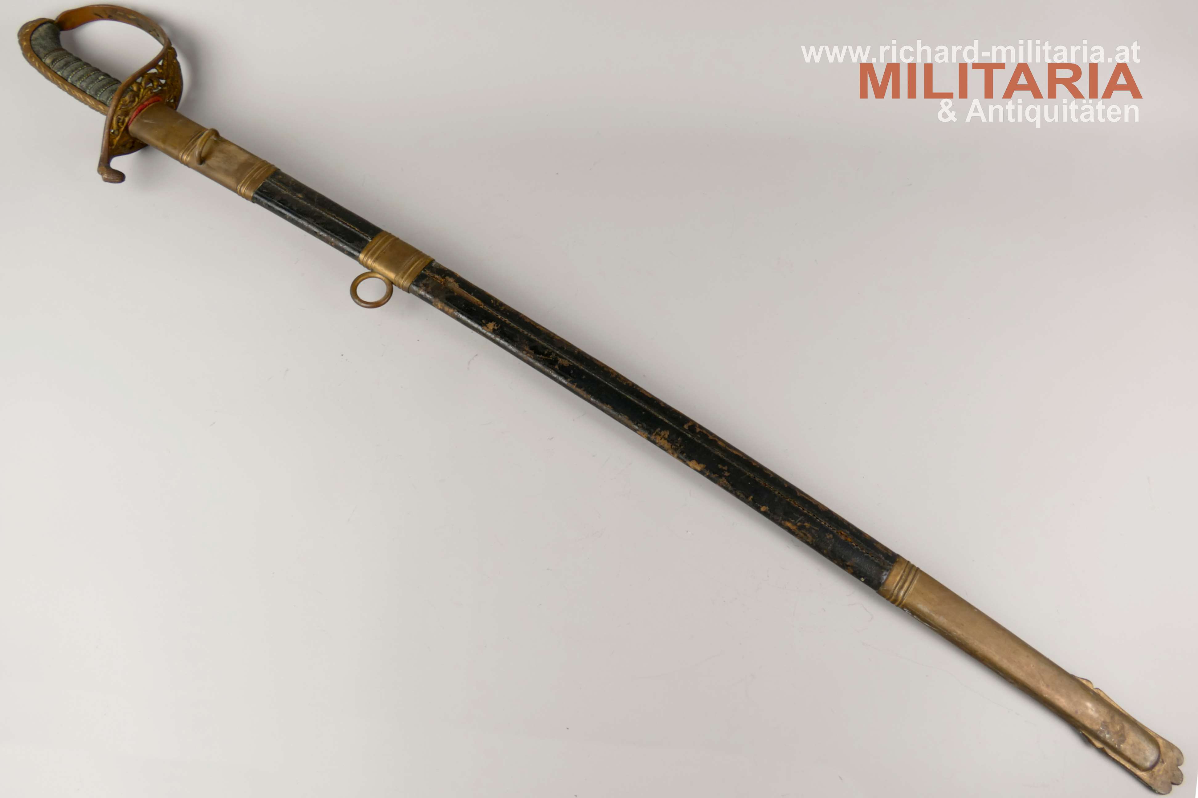 k.u.k. Beamtendegen M1889; beidseitig gekehlte vernickelte Klinge in sehr guter Erhaltung; am Klingenansatz "Weyersberg Kirschbaum & Co Solingen"; durchbrochener floral verzierter und vergoldeter Messingkorb; Griff aus Fischhaut mit vergoldeter Drahtwicklung (obere Wicklung leicht geöffnet); belederte Eisenscheide mit vergoldeten Messingbeschlägen; darauf der Allerhöchste Namenszug "FJ1"; Belederung mit stärkeren Abnutzungsspuren und auf der Rückseite an der Naht mit kleiner Fehlstelle; Vergoldung weitgehend vergangen;