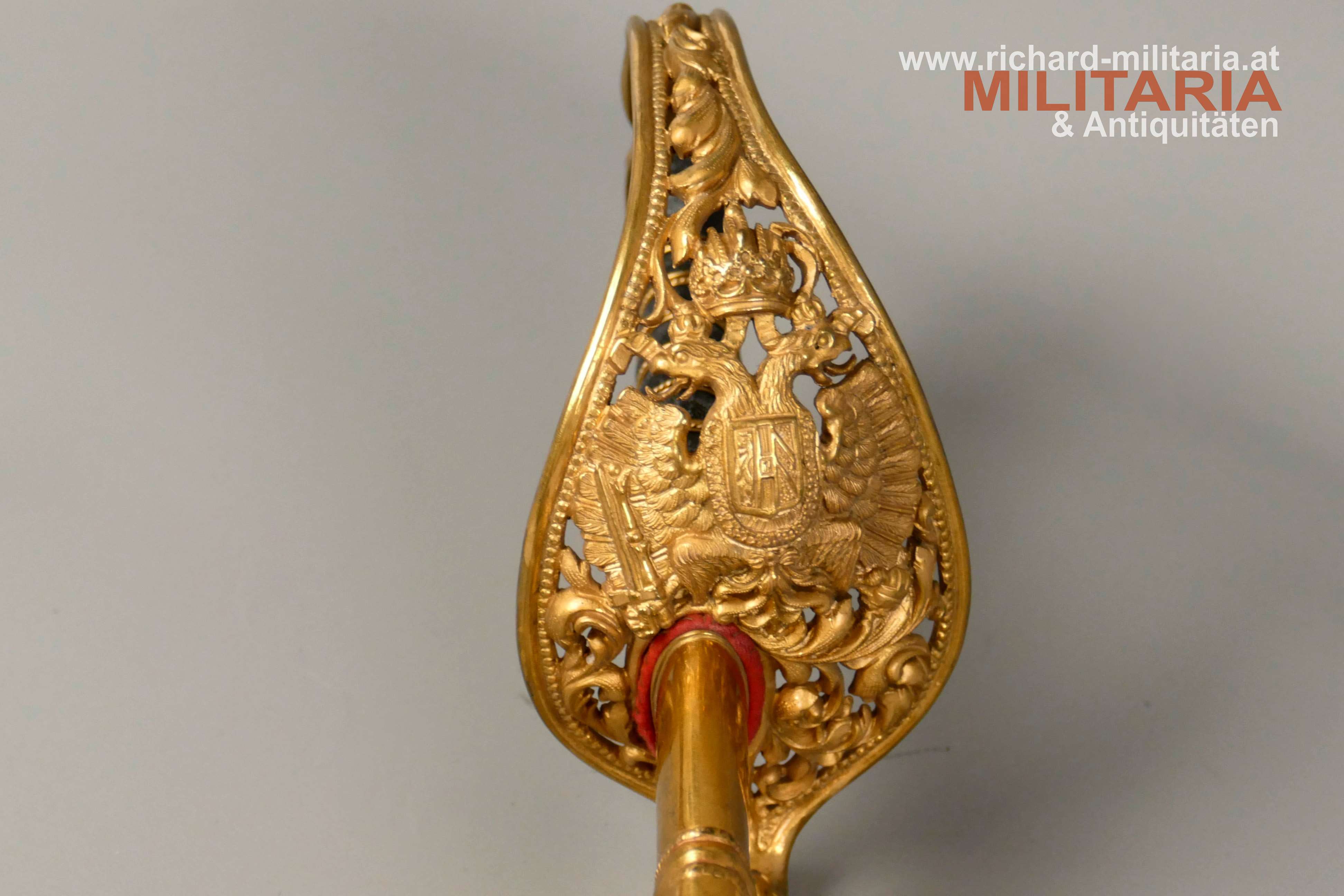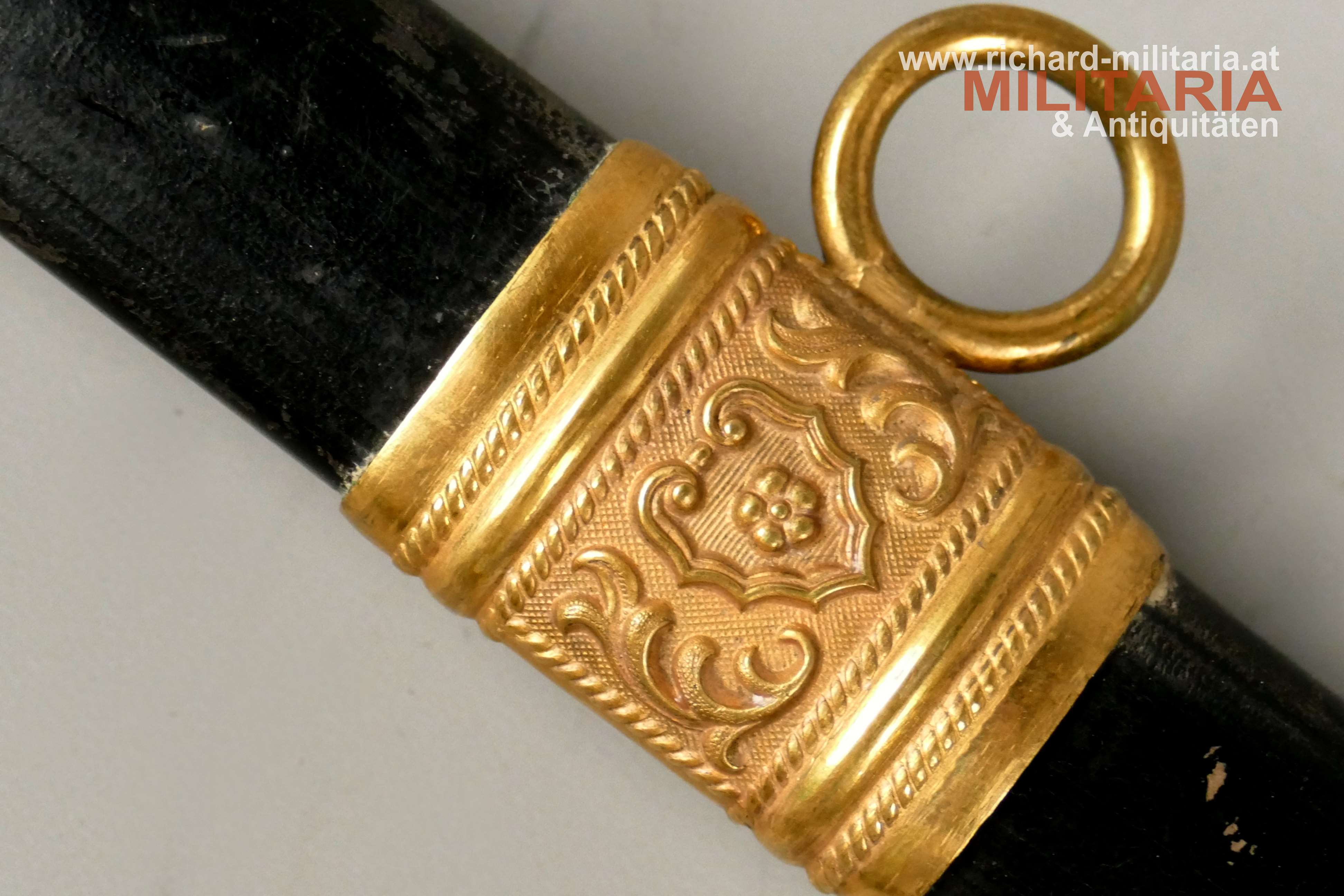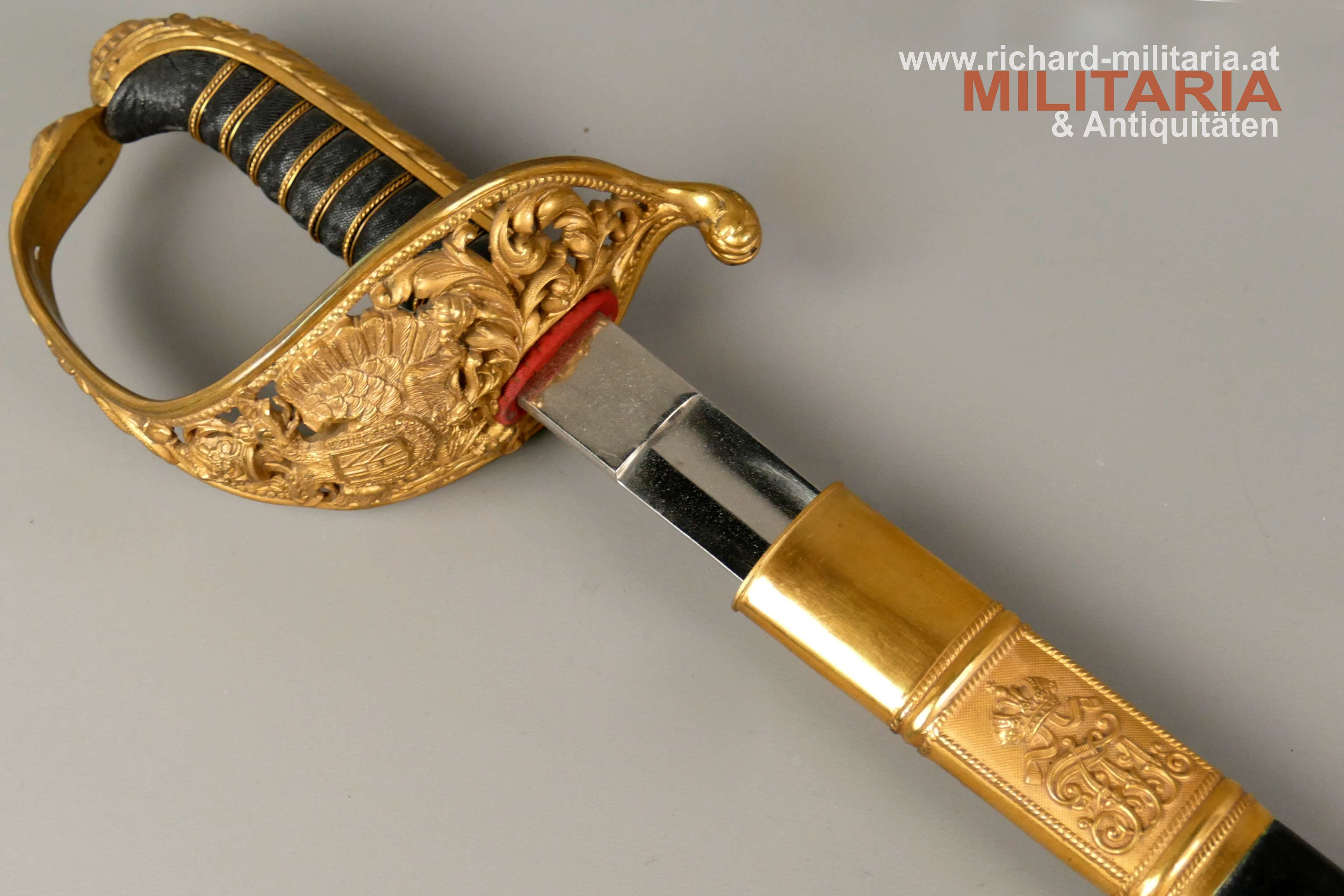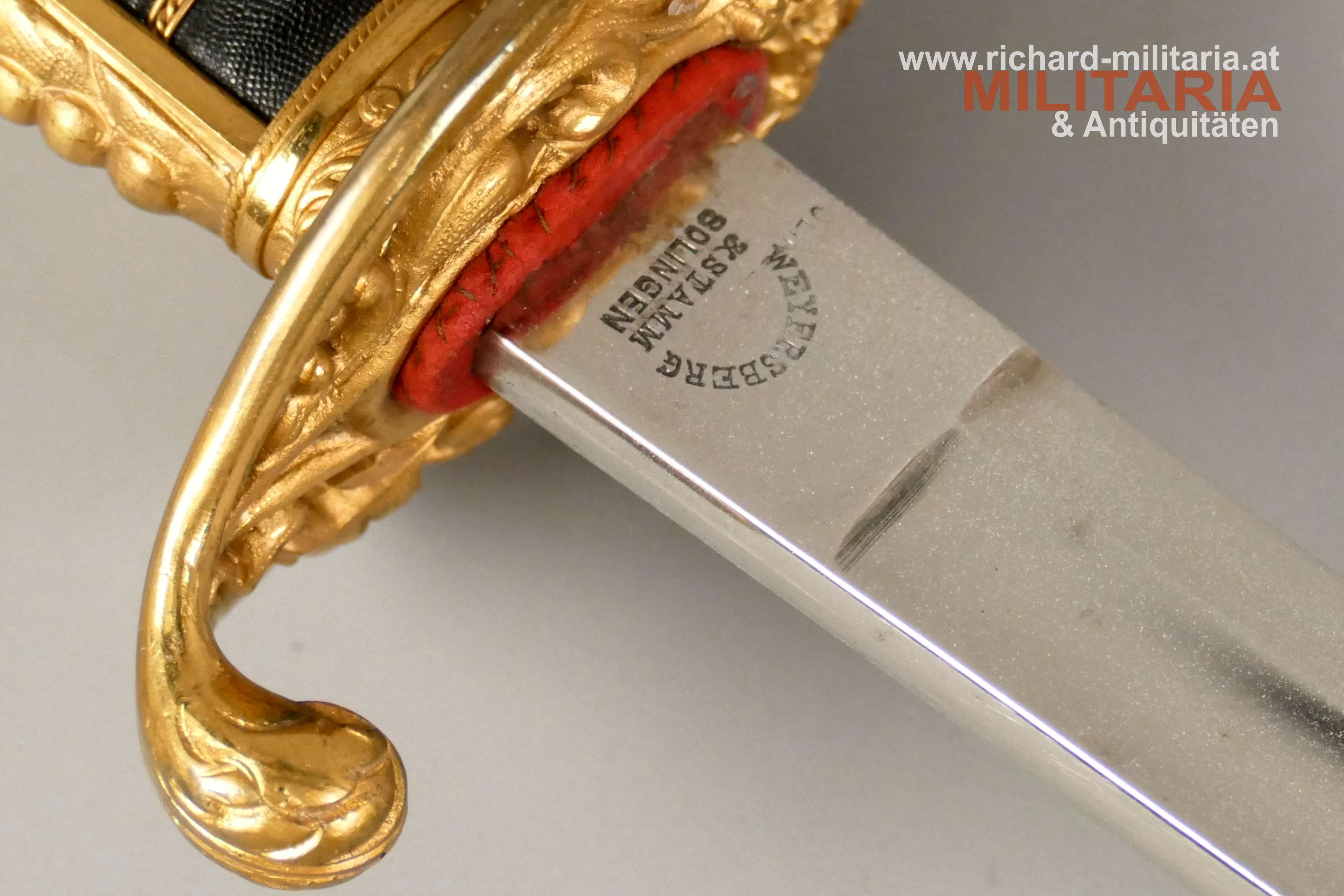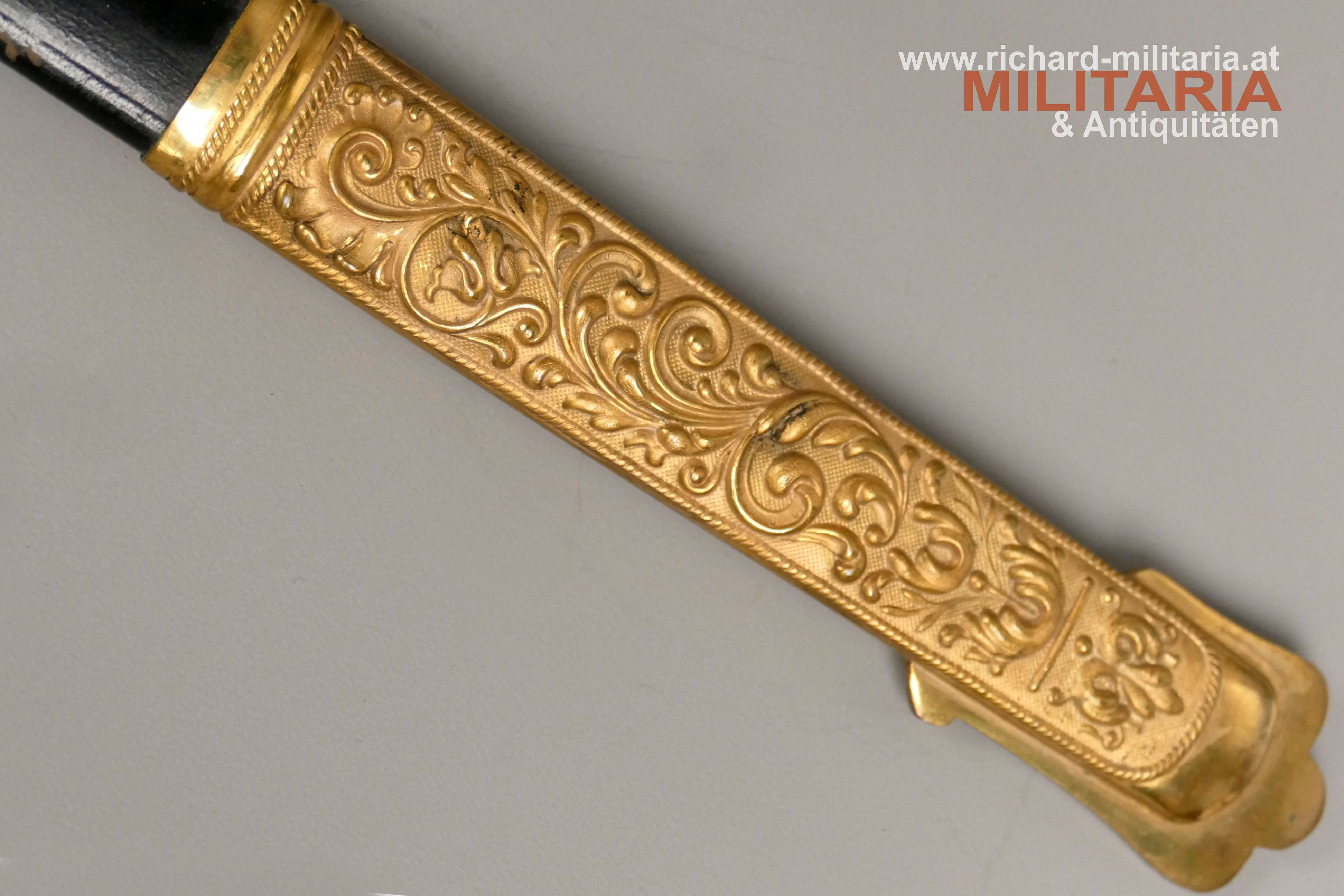 k.u.k. Beamtensäbel Muster 1889 - VARIANTE; beidseitig gekehlte vernickelte Klinge in sehr guter Erhaltung; am Klingenansatz der Hersteller "Weyersberg"; durchbrochener floral verzierter und vergoldeter Messingkorb mit kaiserlichem Doppeladler - seltene Variante mit gepunktetem Rand und seitlich versetzt; Griff aus Fischhaut mit verdrillter vergoldeter Drahtwicklung; roter Stoßfilz vorhanden; belederte Stahlscheide mit vergoldeten Messingbeschlägen; am Mundstück der Allerhöchste Namenszug "FJ1"; minimale Abnutzungsspuren auf der Belederung; Feuervergoldungen sehr gut erhalten;