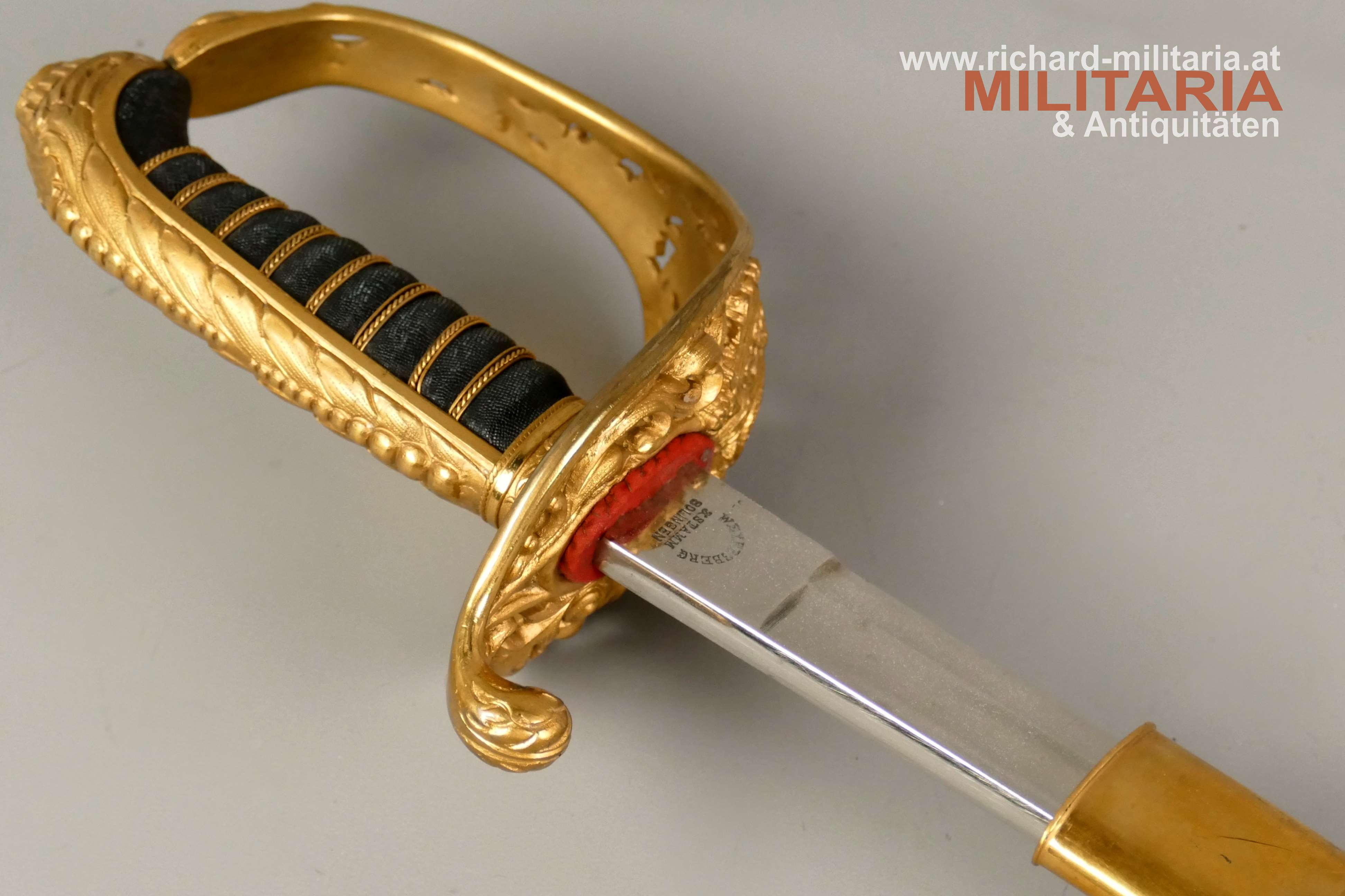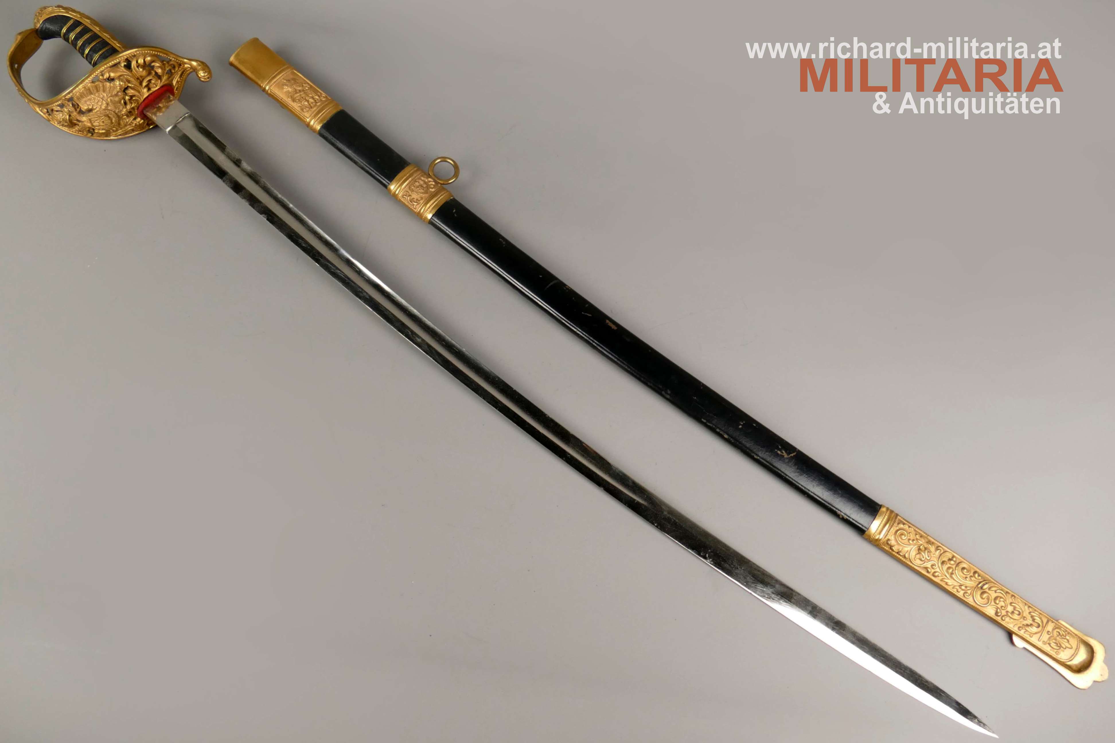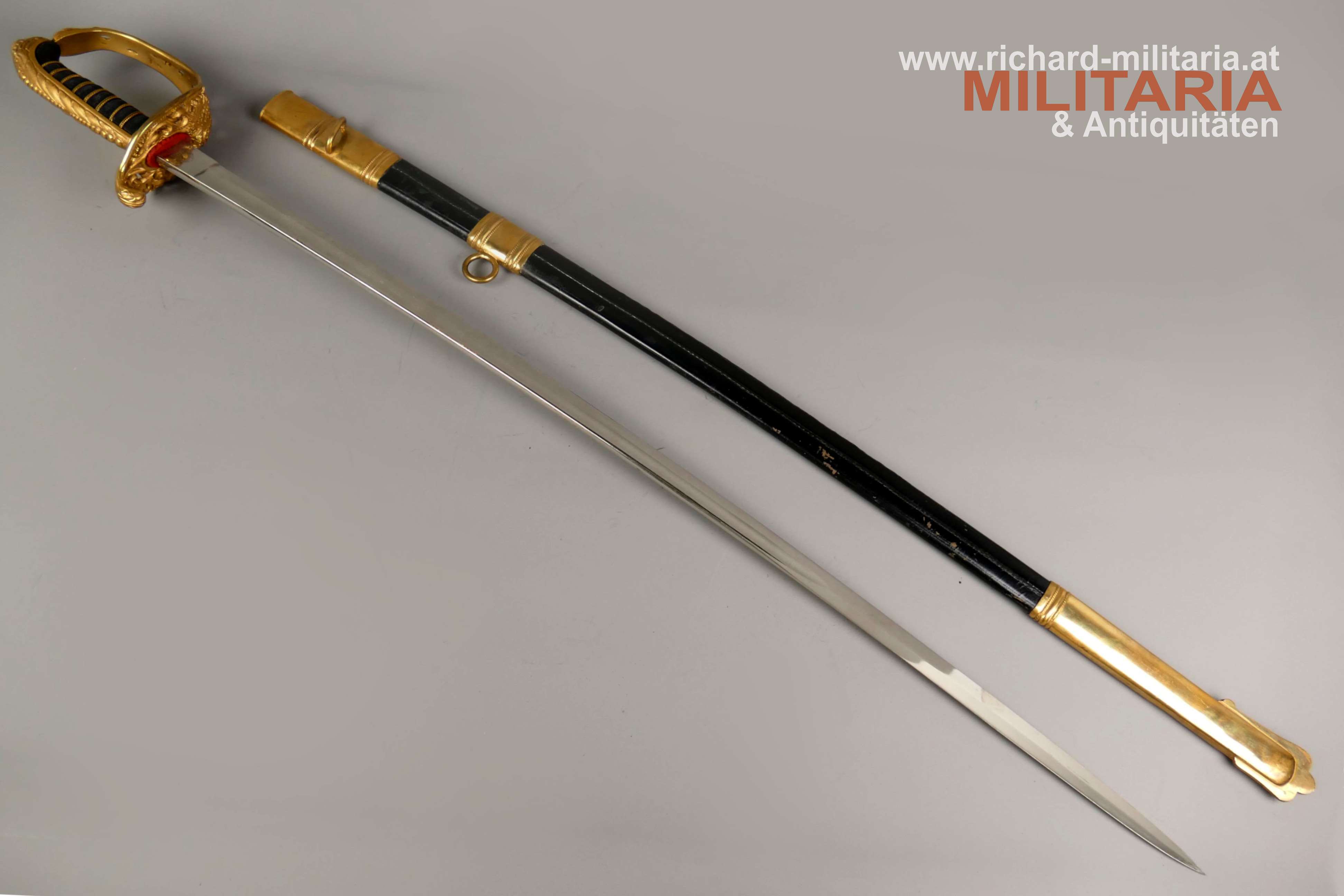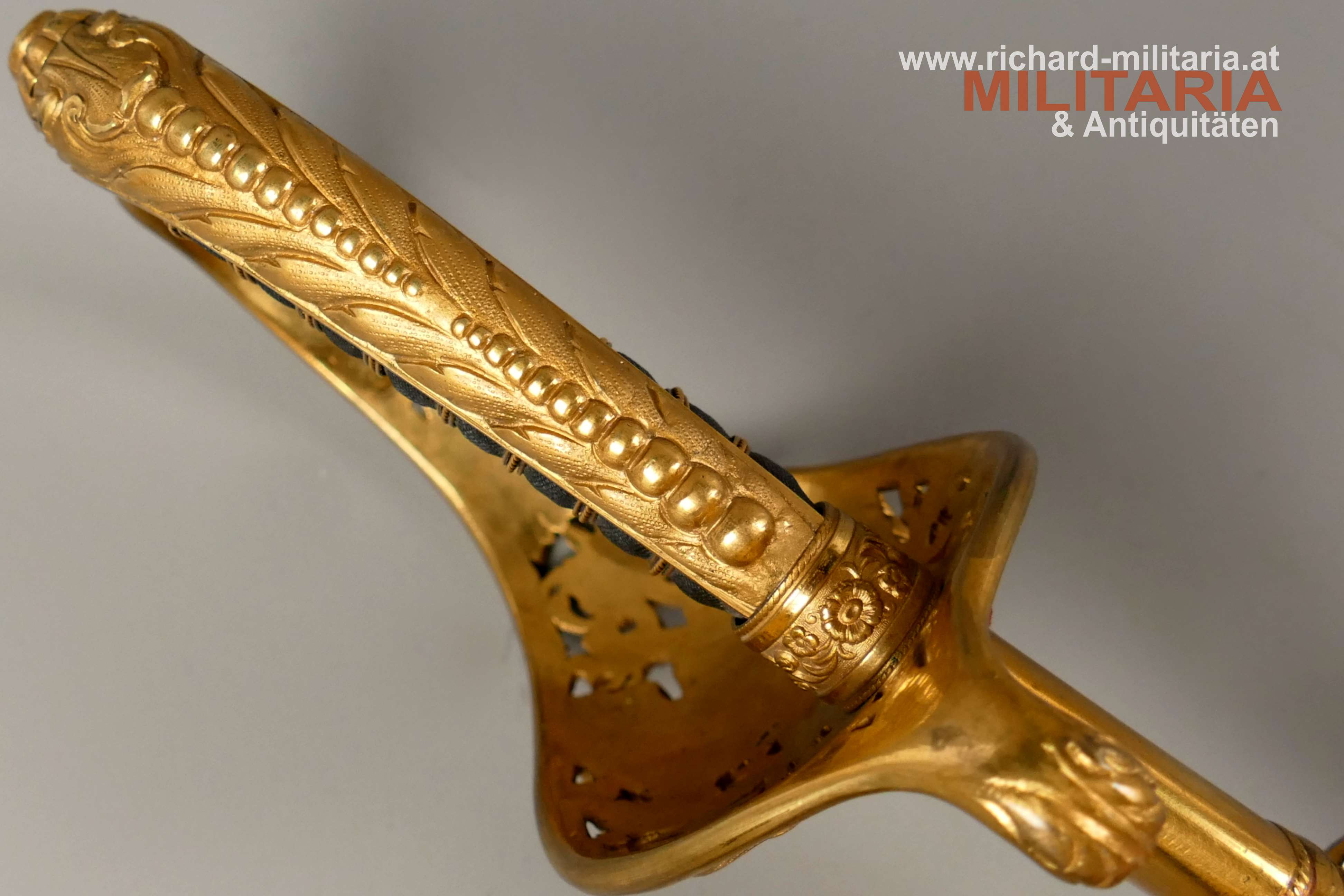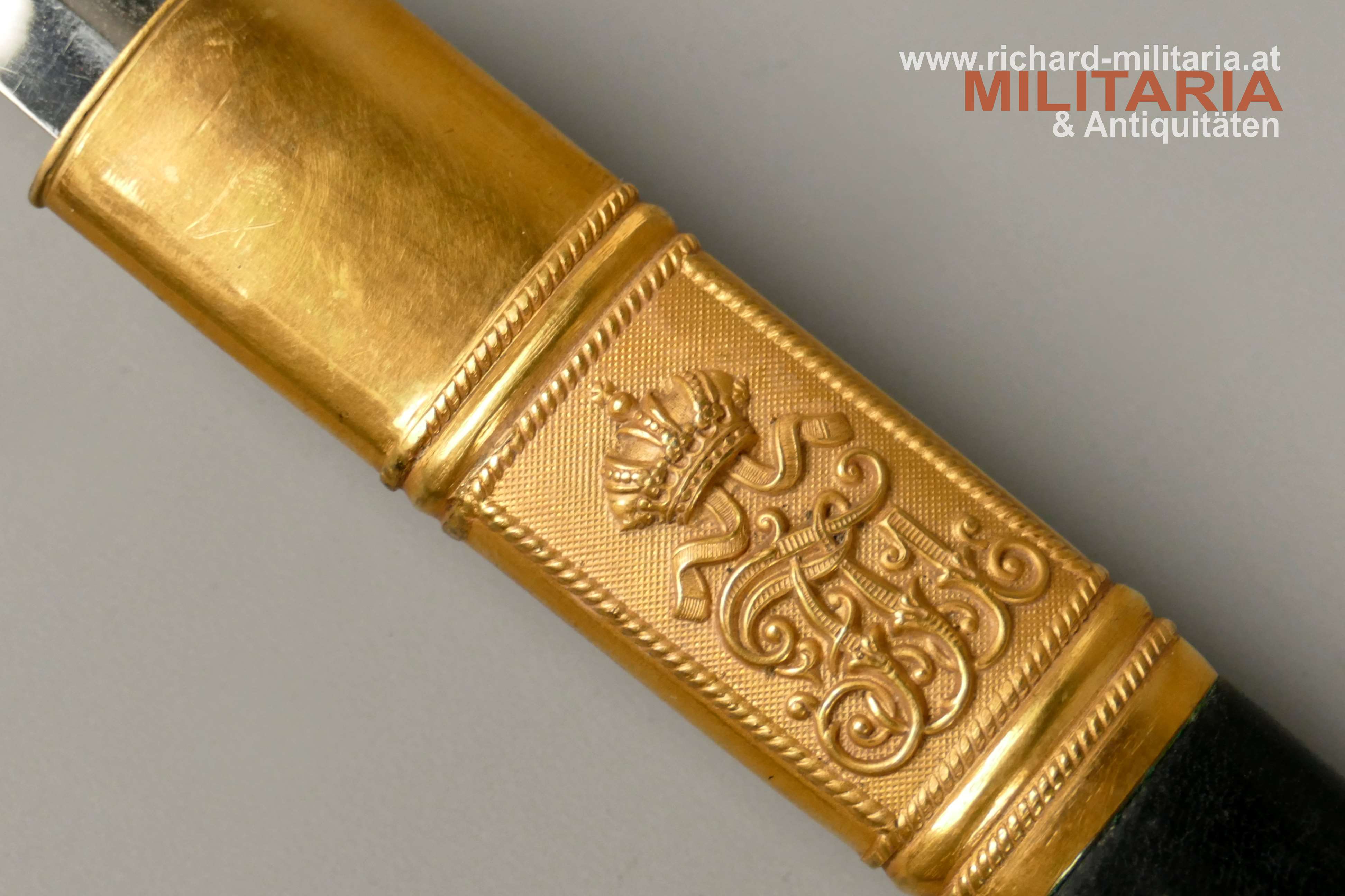 k.u.k. Beamtensäbel Muster 1889 - VARIANTE; beidseitig gekehlte vernickelte Klinge in sehr guter Erhaltung; am Klingenansatz der Hersteller "Weyersberg"; durchbrochener floral verzierter und vergoldeter Messingkorb mit kaiserlichem Doppeladler - seltene Variante mit gepunktetem Rand und seitlich versetzt; Griff aus Fischhaut mit verdrillter vergoldeter Drahtwicklung; roter Stoßfilz vorhanden; belederte Stahlscheide mit vergoldeten Messingbeschlägen; am Mundstück der Allerhöchste Namenszug "FJ1"; minimale Abnutzungsspuren auf der Belederung; Feuervergoldungen sehr gut erhalten;
