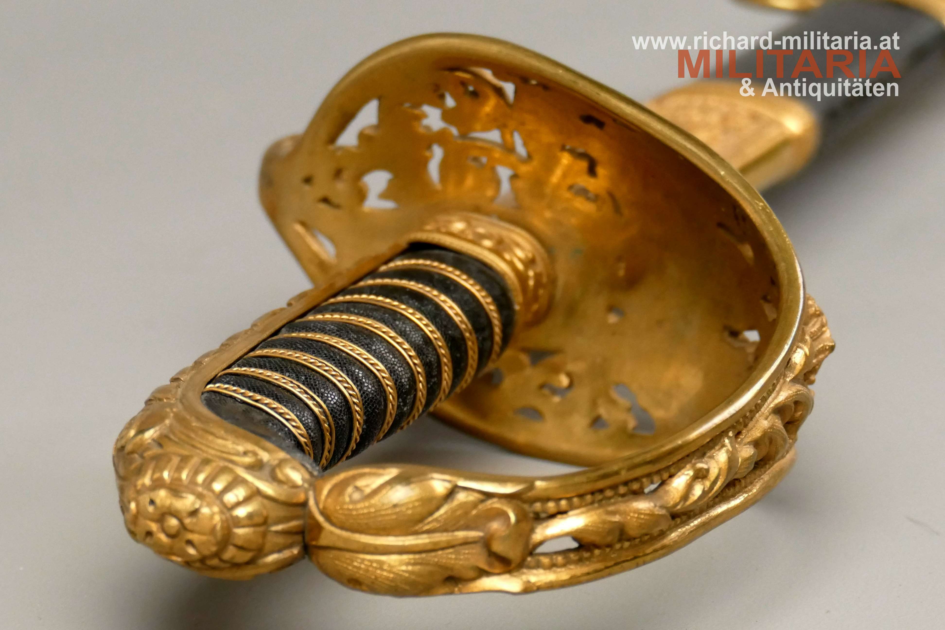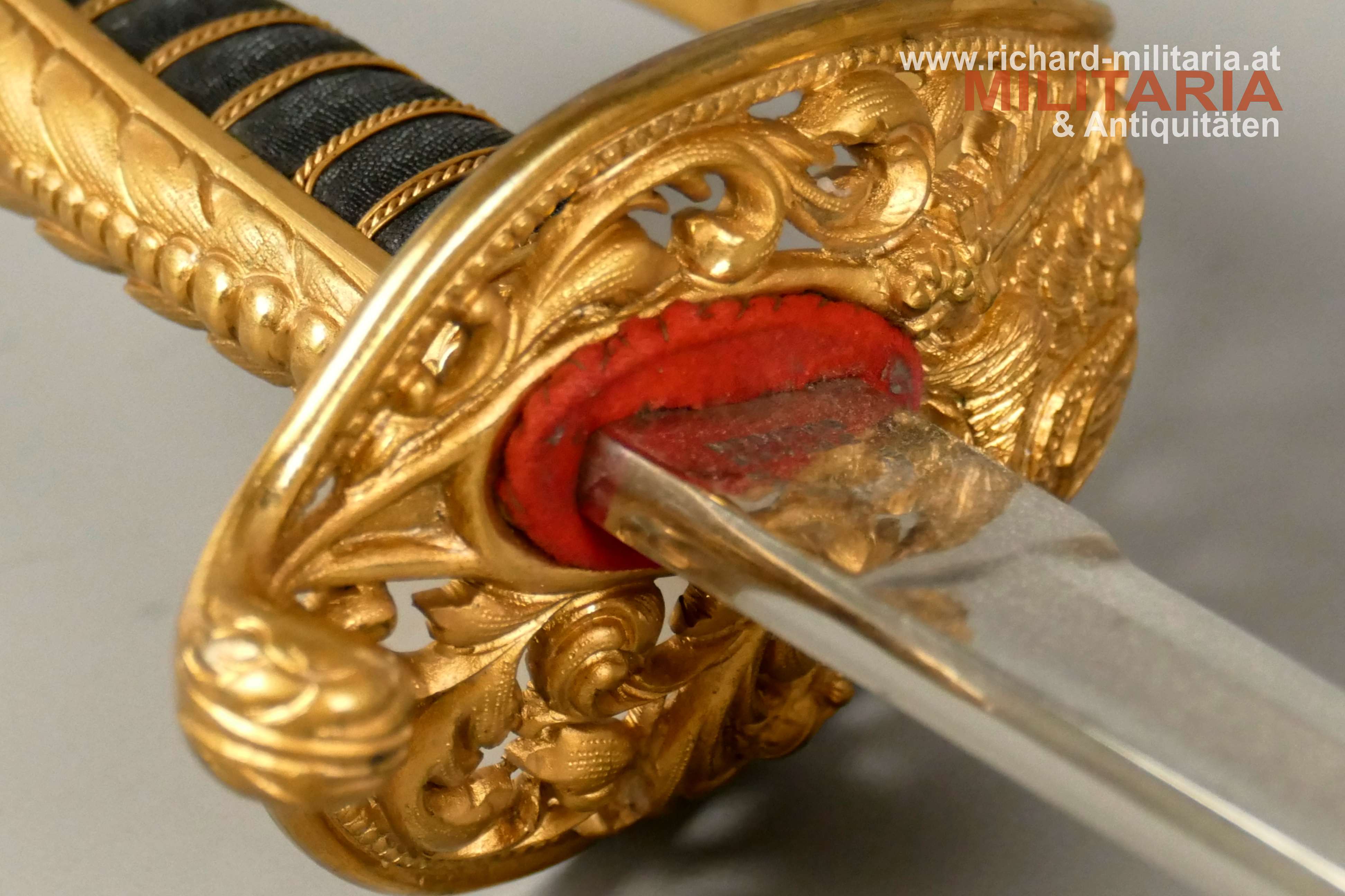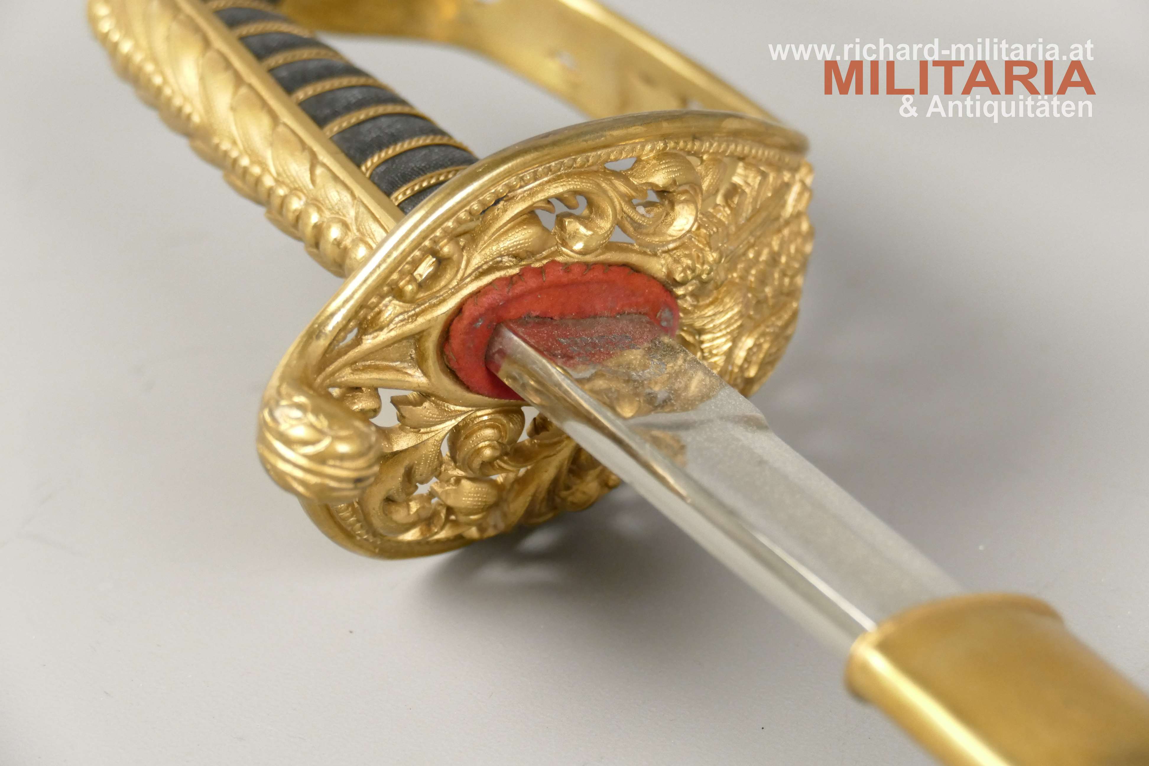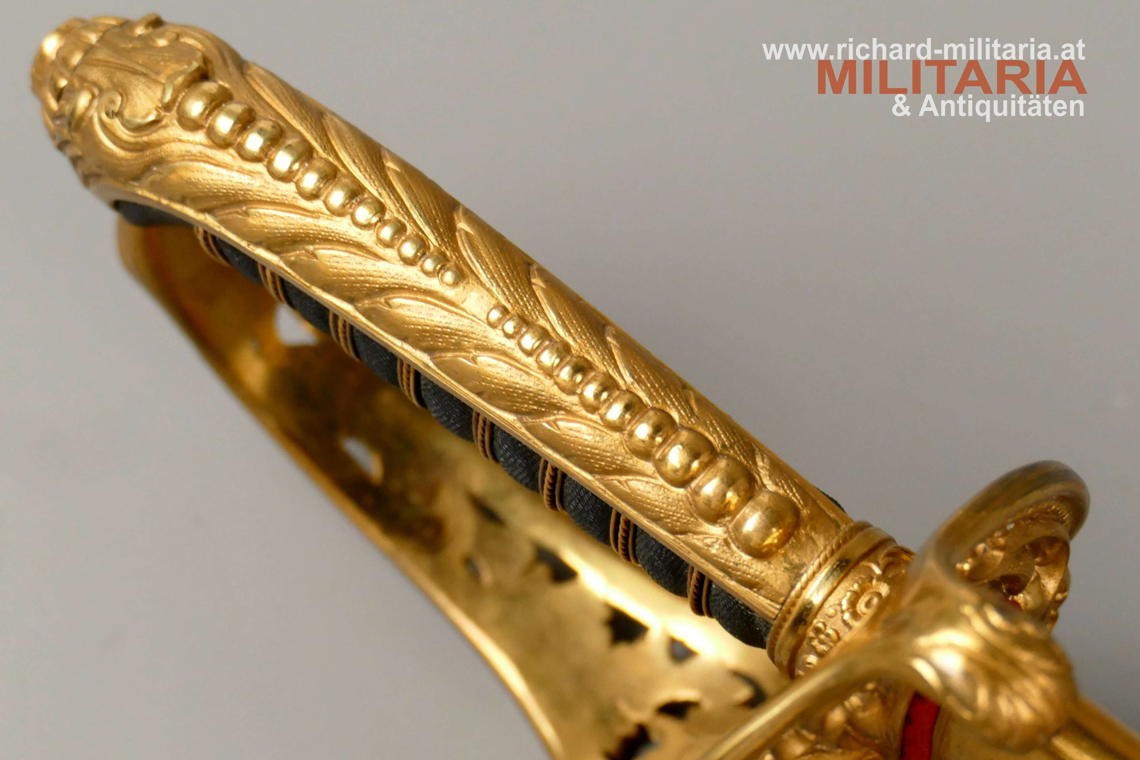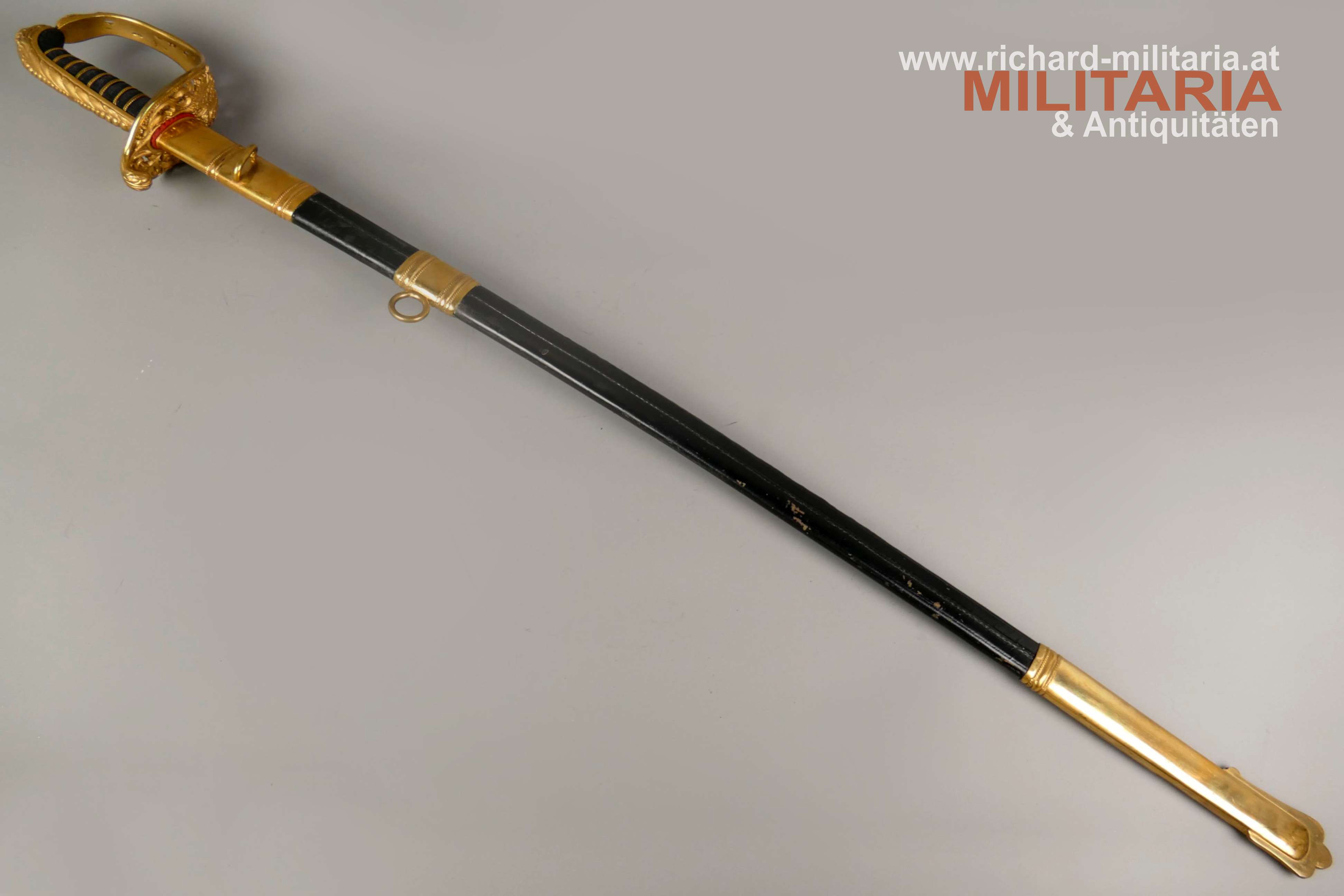 k.u.k. Beamtensäbel Muster 1889 - VARIANTE; beidseitig gekehlte vernickelte Klinge in sehr guter Erhaltung; am Klingenansatz der Hersteller "Weyersberg"; durchbrochener floral verzierter und vergoldeter Messingkorb mit kaiserlichem Doppeladler - seltene Variante mit gepunktetem Rand und seitlich versetzt; Griff aus Fischhaut mit verdrillter vergoldeter Drahtwicklung; roter Stoßfilz vorhanden; belederte Stahlscheide mit vergoldeten Messingbeschlägen; am Mundstück der Allerhöchste Namenszug "FJ1"; minimale Abnutzungsspuren auf der Belederung; Feuervergoldungen sehr gut erhalten;