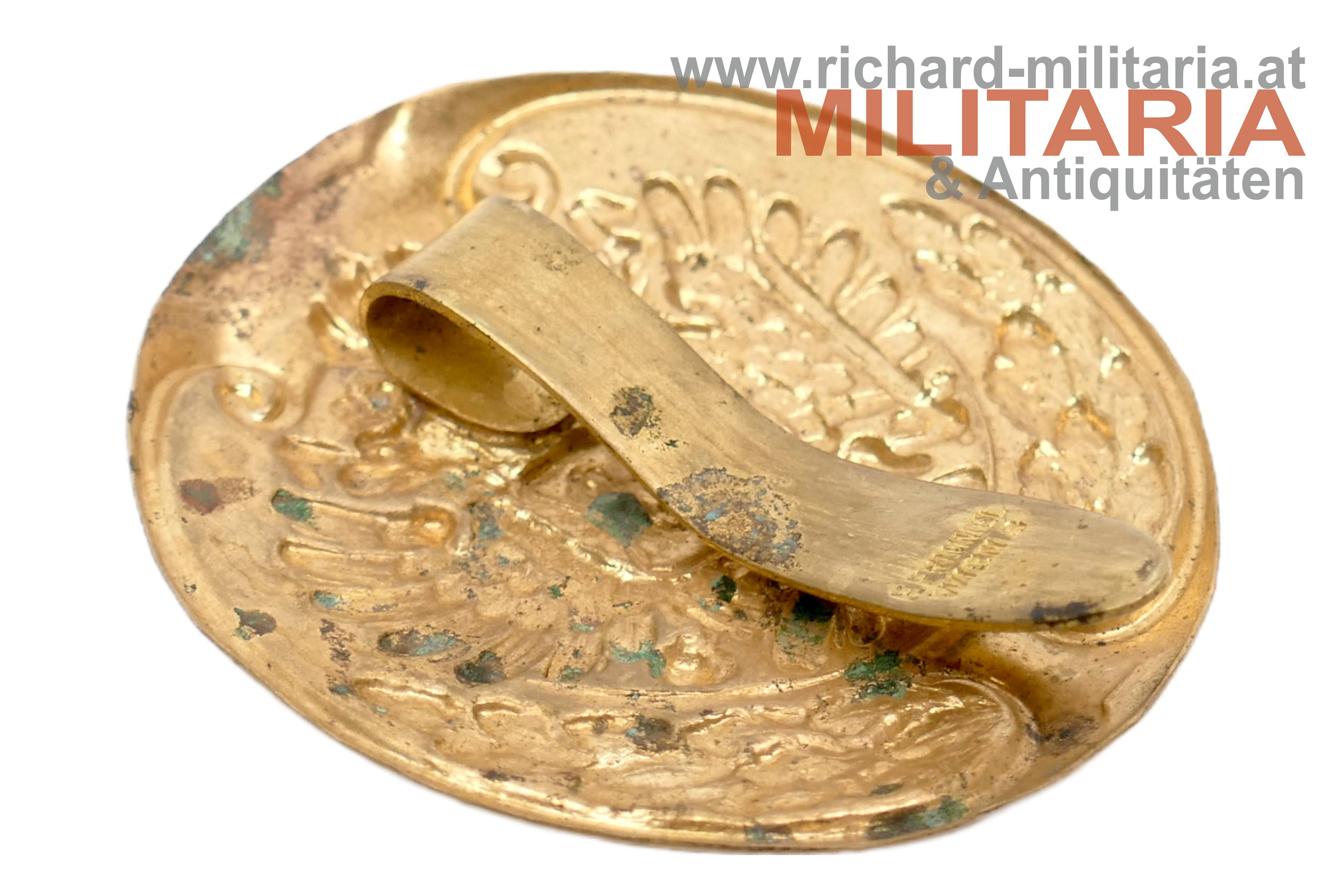 Brustabzeichen der k.u.k. beeideten Wache Niederösterreich; Messing geprägt und vergoldet; mit originaler Tragelasche; diese gestempelt "F. Frimmel Wien 3";