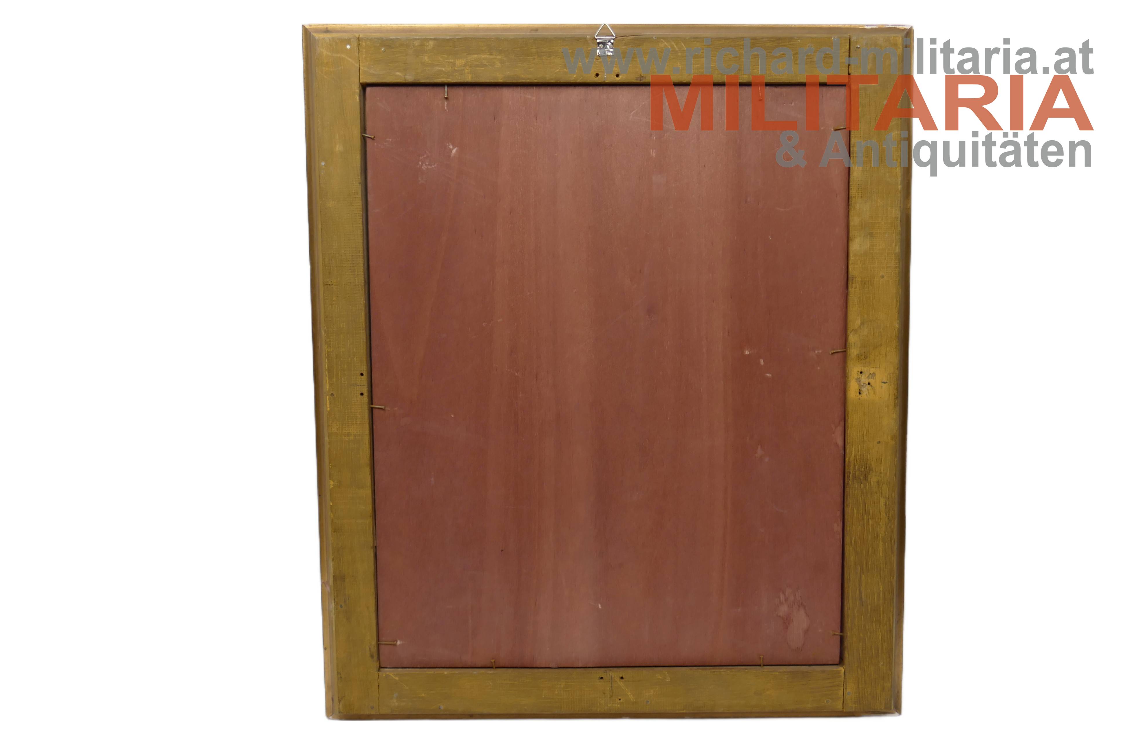 k.u.k. Druck auf Pressspannplatte - gerahmt; Kavallerie-Oberleutnant in Feldadjustierung im Gebirge um 1916; Feldspange mit Eiserner Krone 3. Klasse auf Feldbluse und Pelzrock; mit Bergstock in der rechten Hand; vergoldeter Holzrahmen mit dezenten Verzierungen; Aufhängevorrichtung revers.