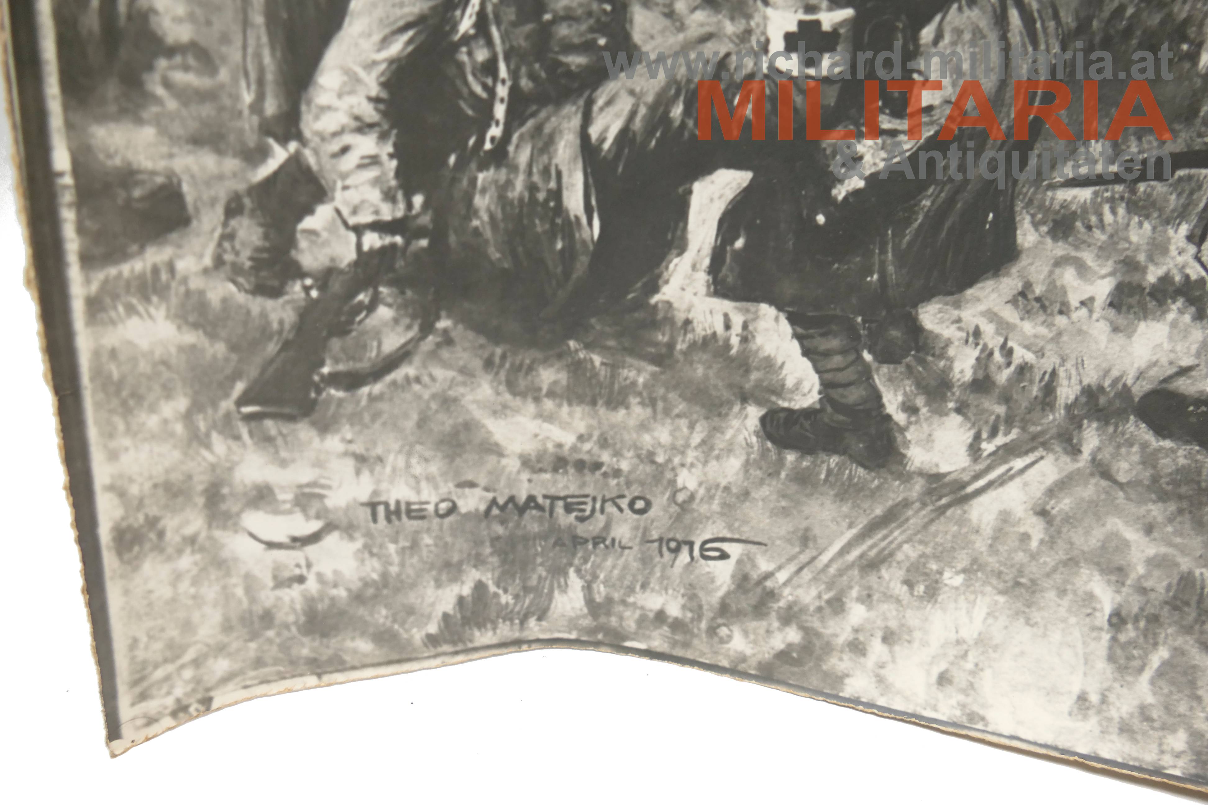 k.u.k. Bilddruck von stürmenden österreichische Soldaten vom späteren k.u.k. Pressezeichner Theo Matejko vom April 1916; großformatig;