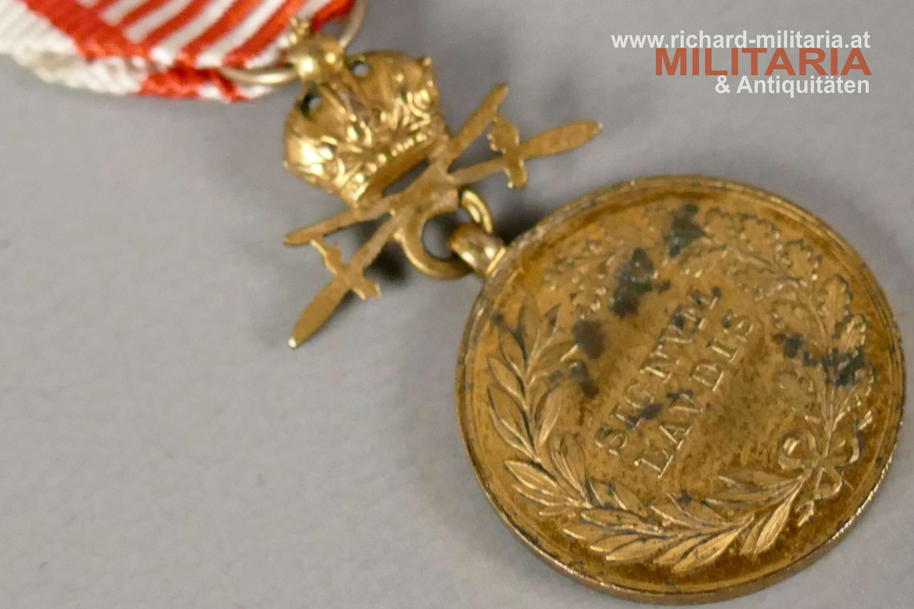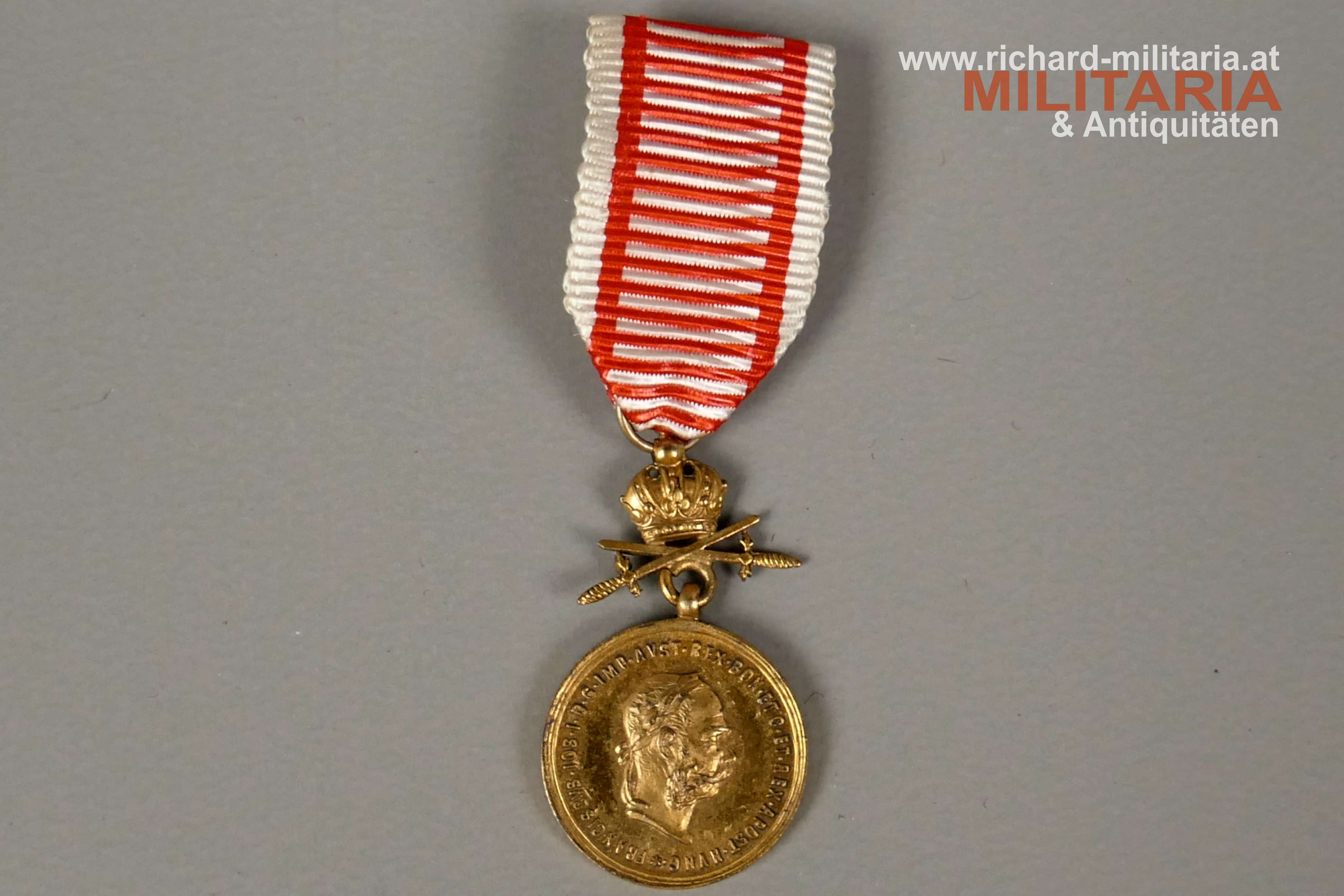 k.u.k. Bronzenes Signum Laudis Kaiser Franz Josef mit Schwerter - MINIATUR; Tombak vergoldet; Schwerter zwischen Medaille und Krone angebracht; mit originalem passenden Bandabschnitt;