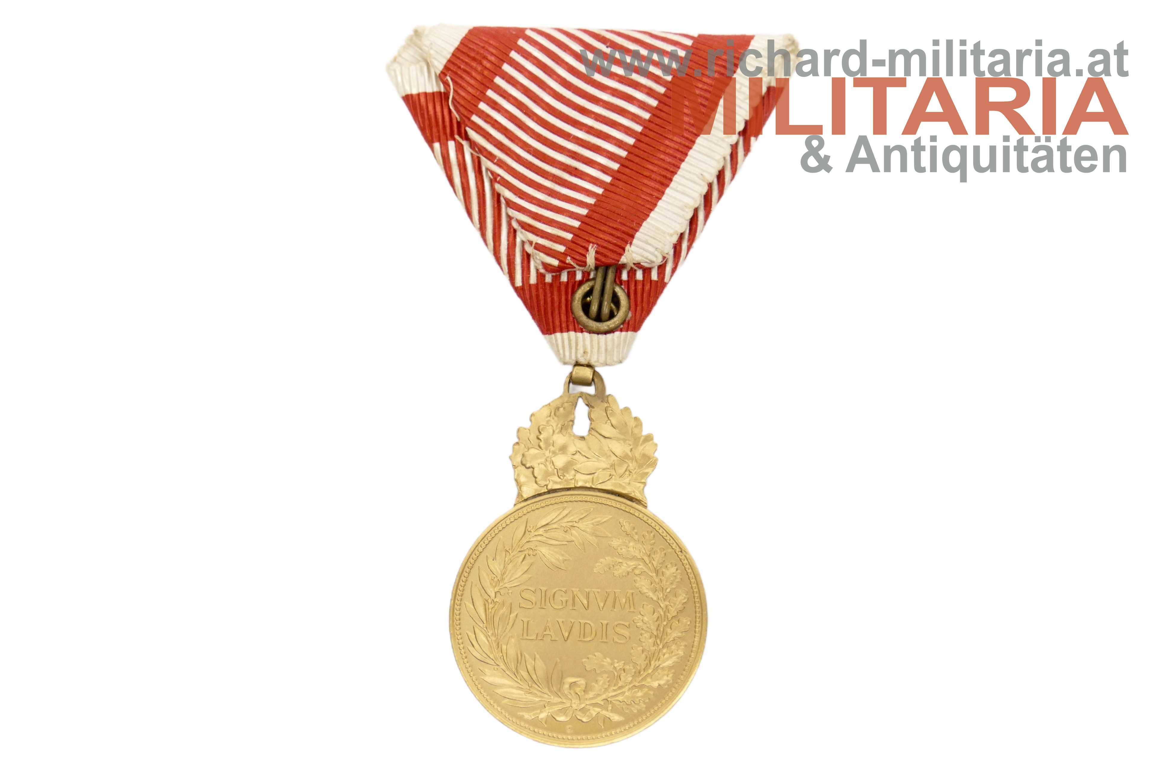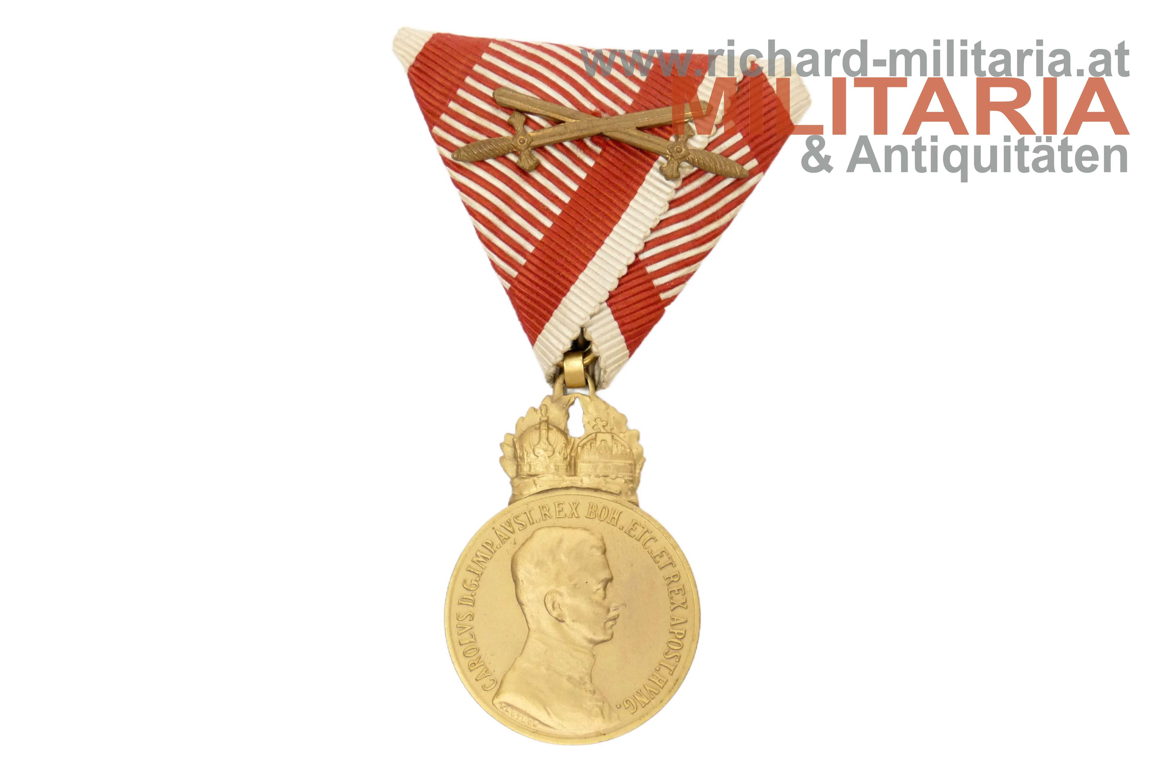 k.u.k. Bronzenes Signum Laudis Kaiser Karl mit Schwerter; Bronze matt vergoldet; Randpunzierung "BRONZE"; am originalen, ausgezeichnet erhaltenen Band mit aufgesplinteten Schwertern;