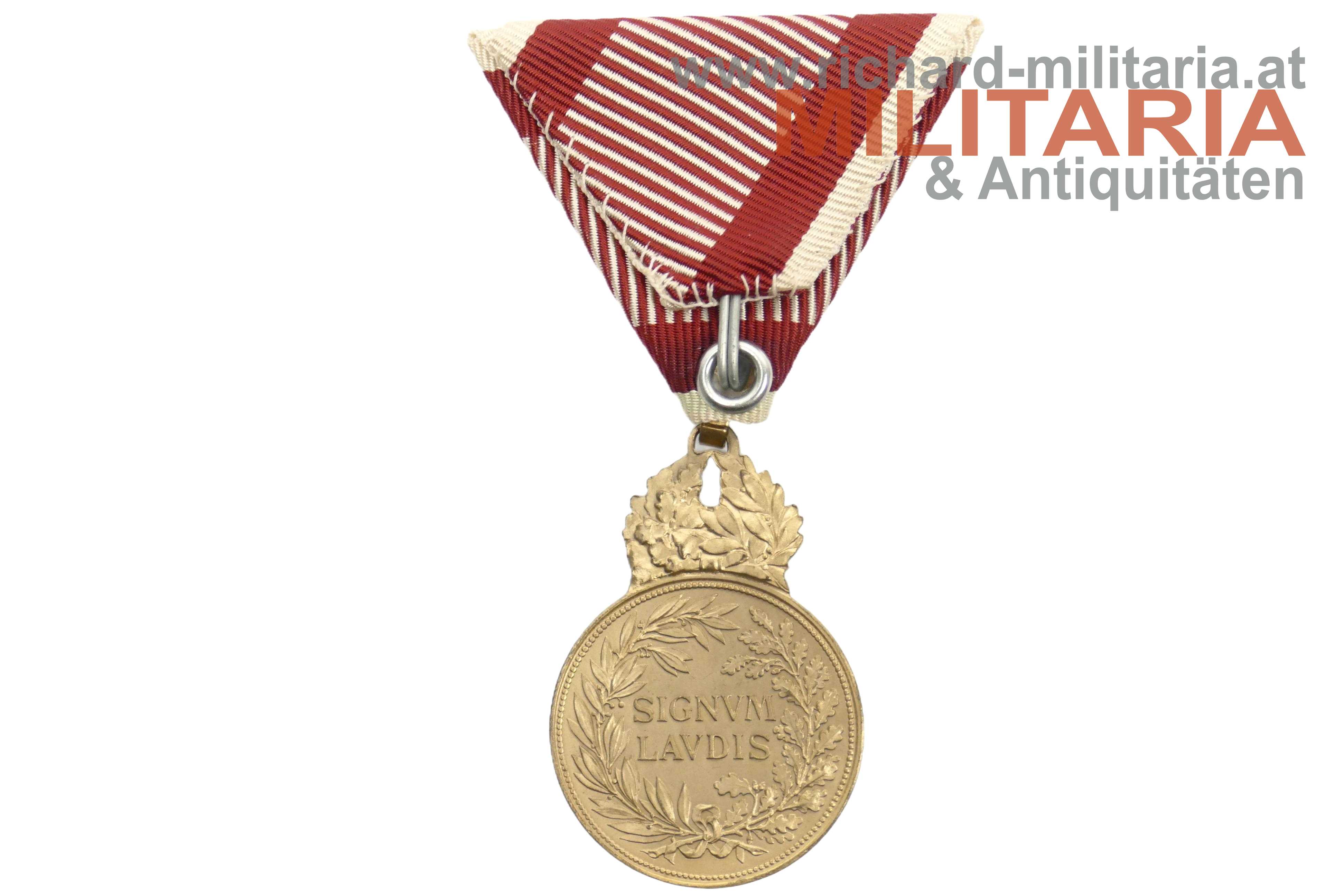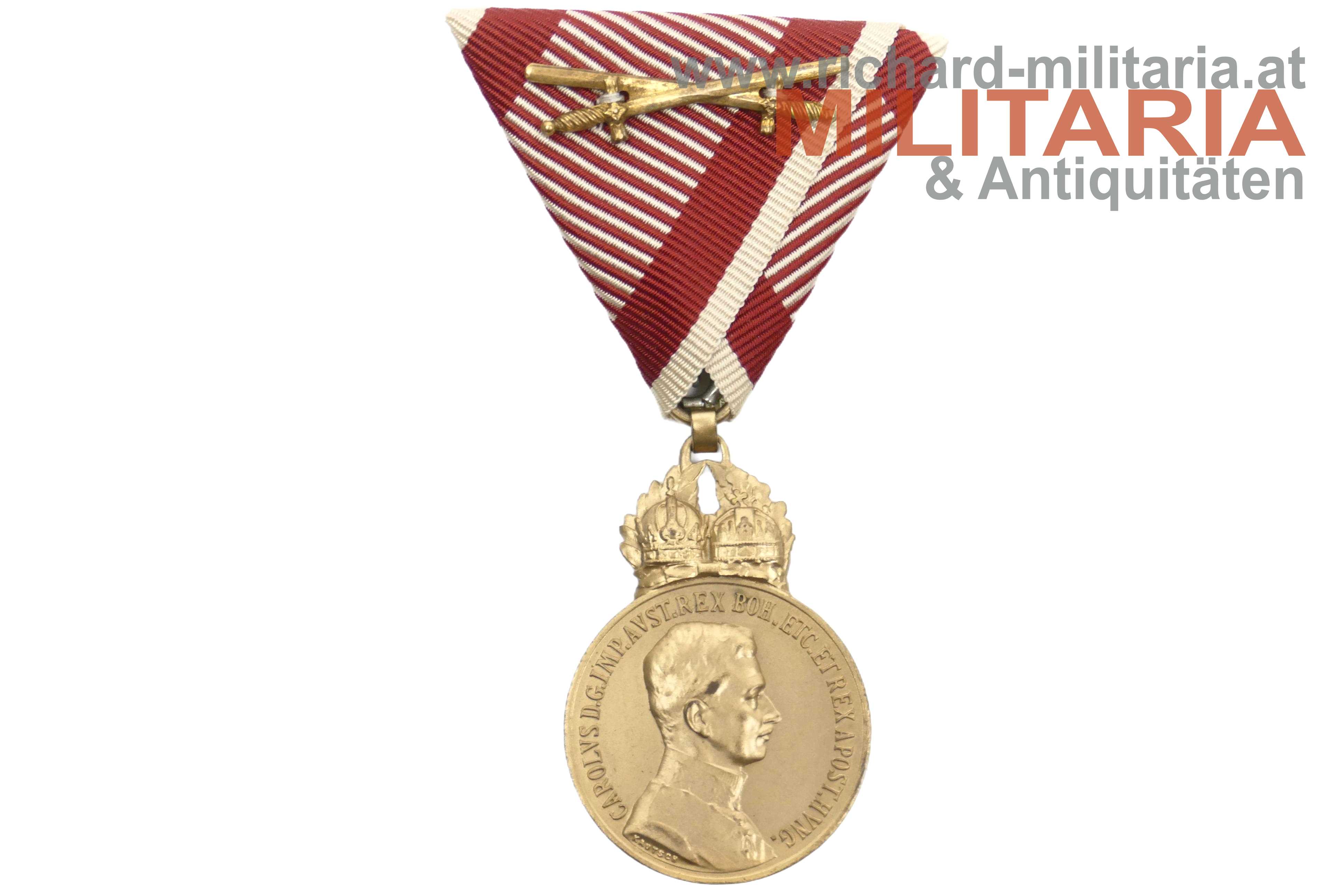 k.u.k. Bronzenes Signum Laudis Kaiser Karl mit Schwertern; Bronze feuervergoldet; Randpunzierung "BRONZE"; Band mit aufgenähten Schwertern (Blaulicht negativ);