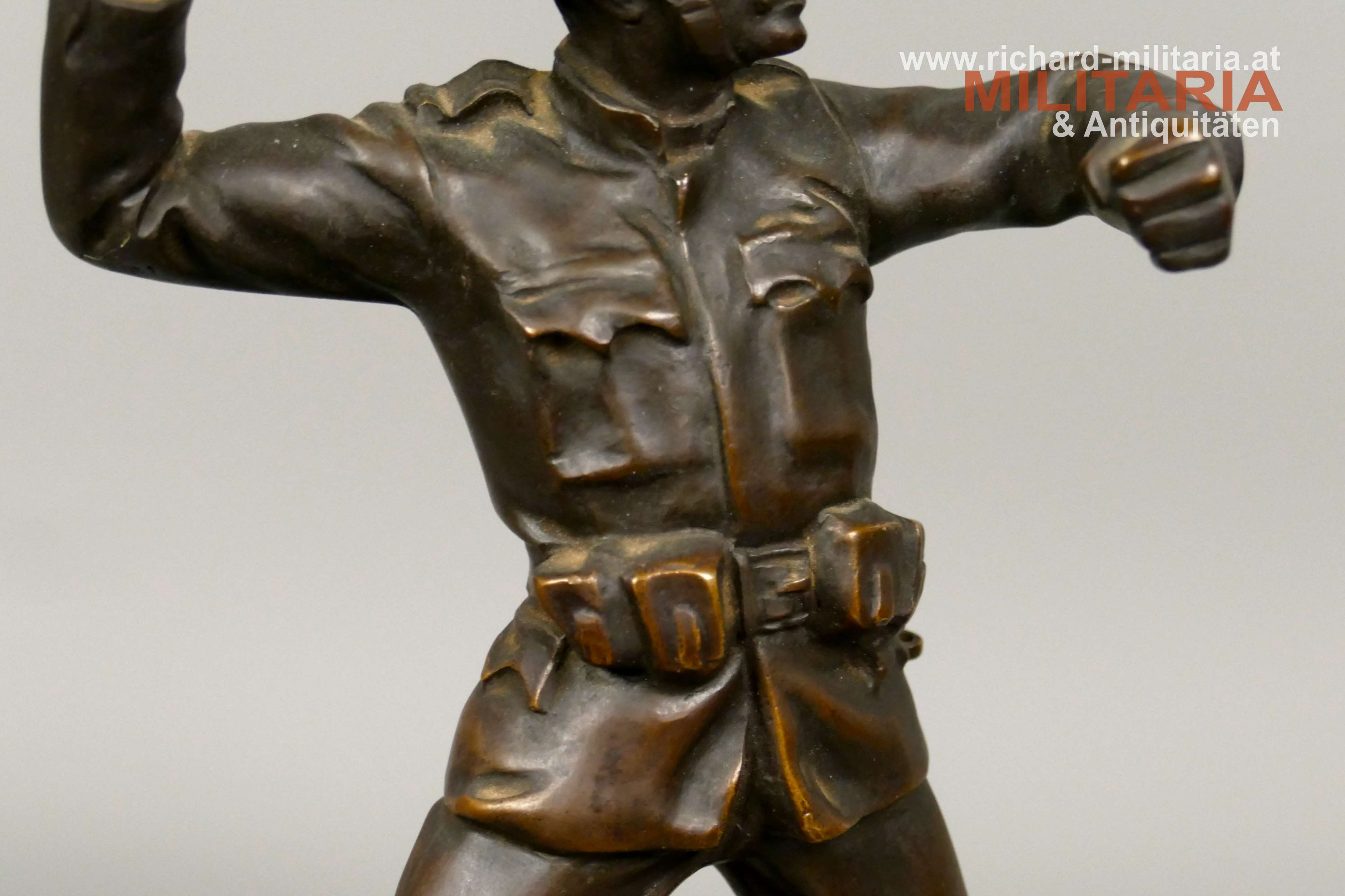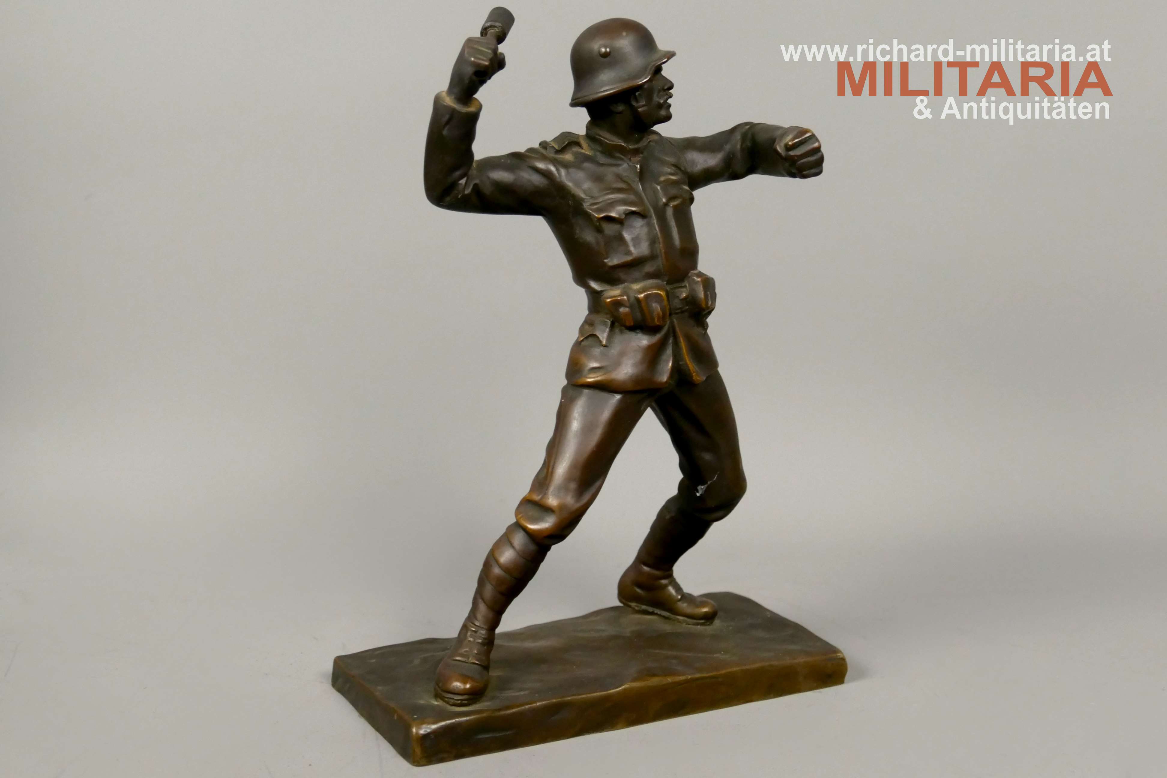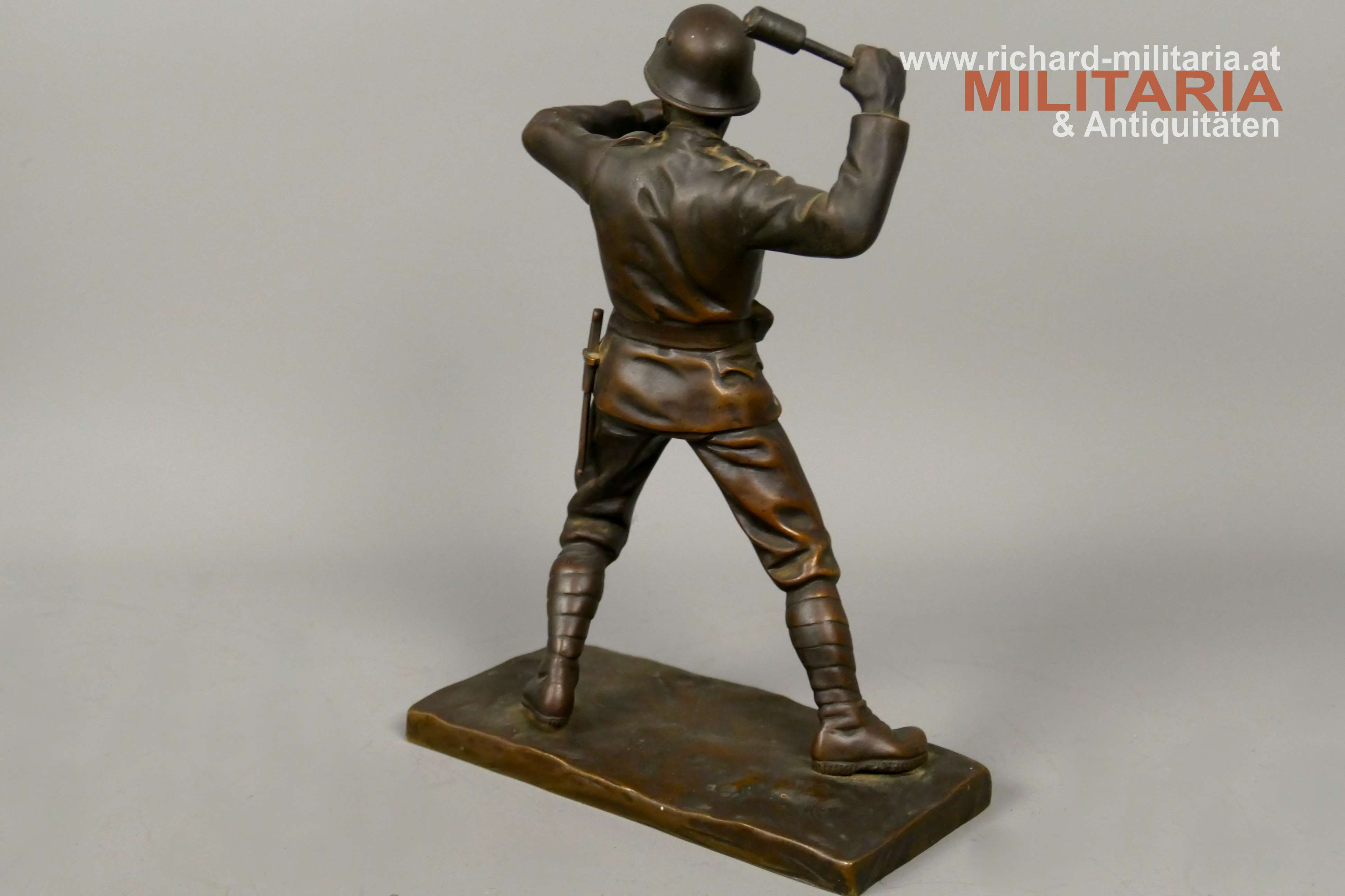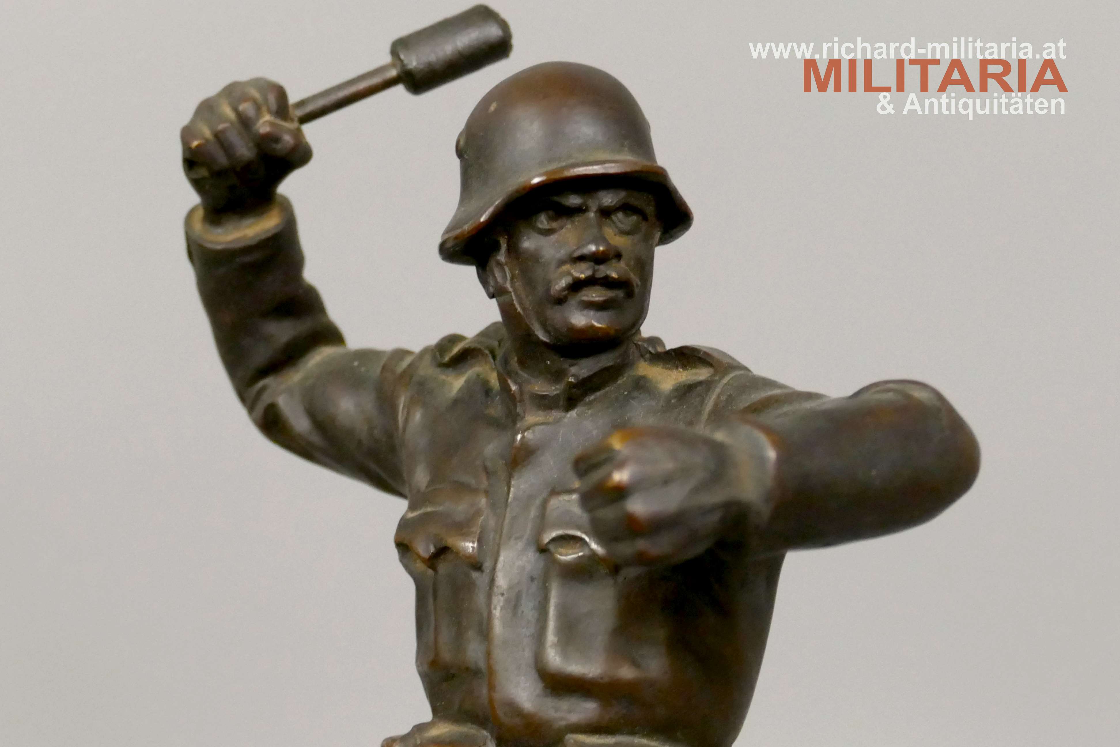 k.u.k. Bronzestatue - Sturmtrupp-Handgranatenwerfer; Darstellung eines österreichischen Sturmtrupplers beim Werfen einer Stielhandgranate; Statue mit der Bodenplatte verschraubt; ohne Marmor- oder Steinsockel; schöne dunkle Patina