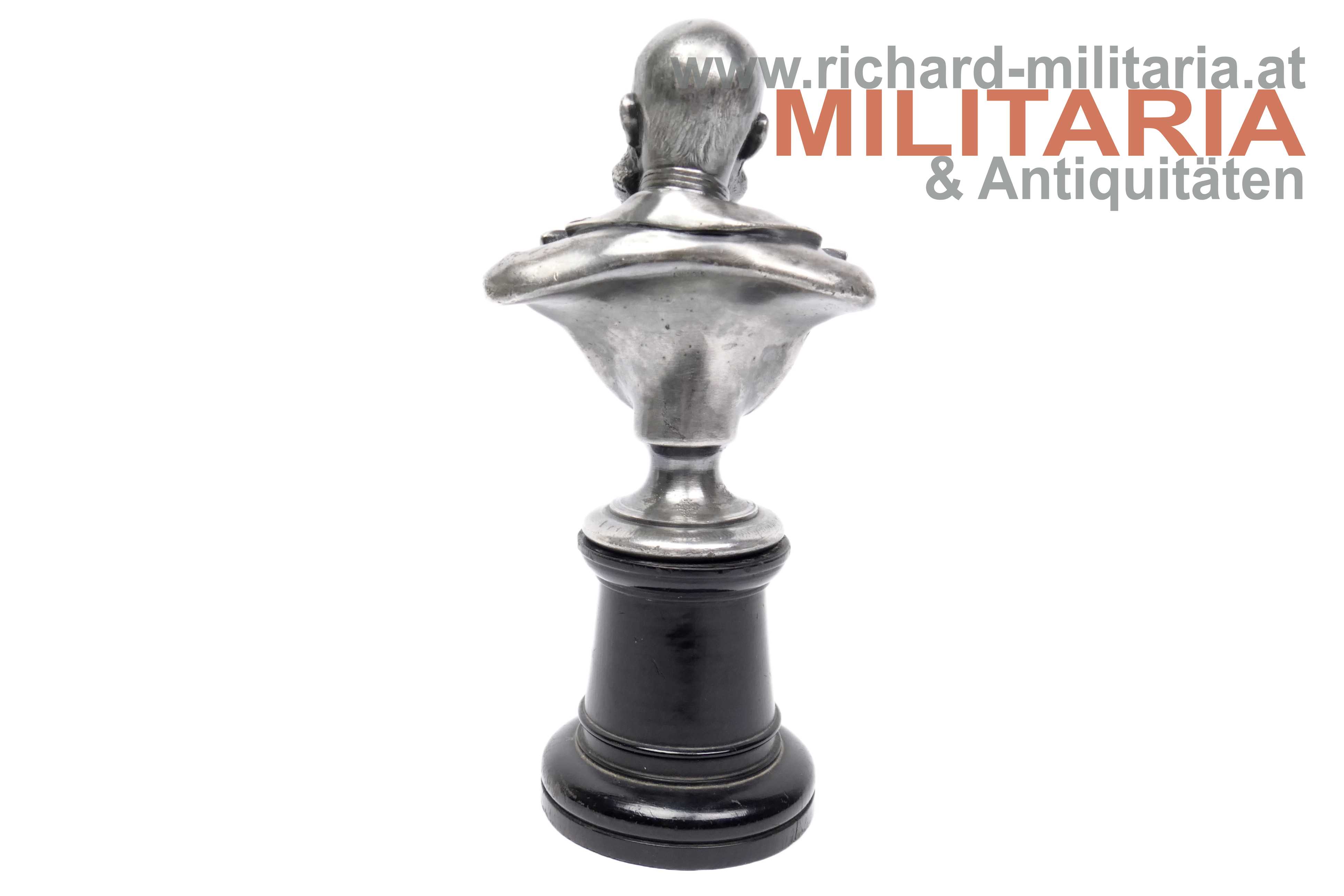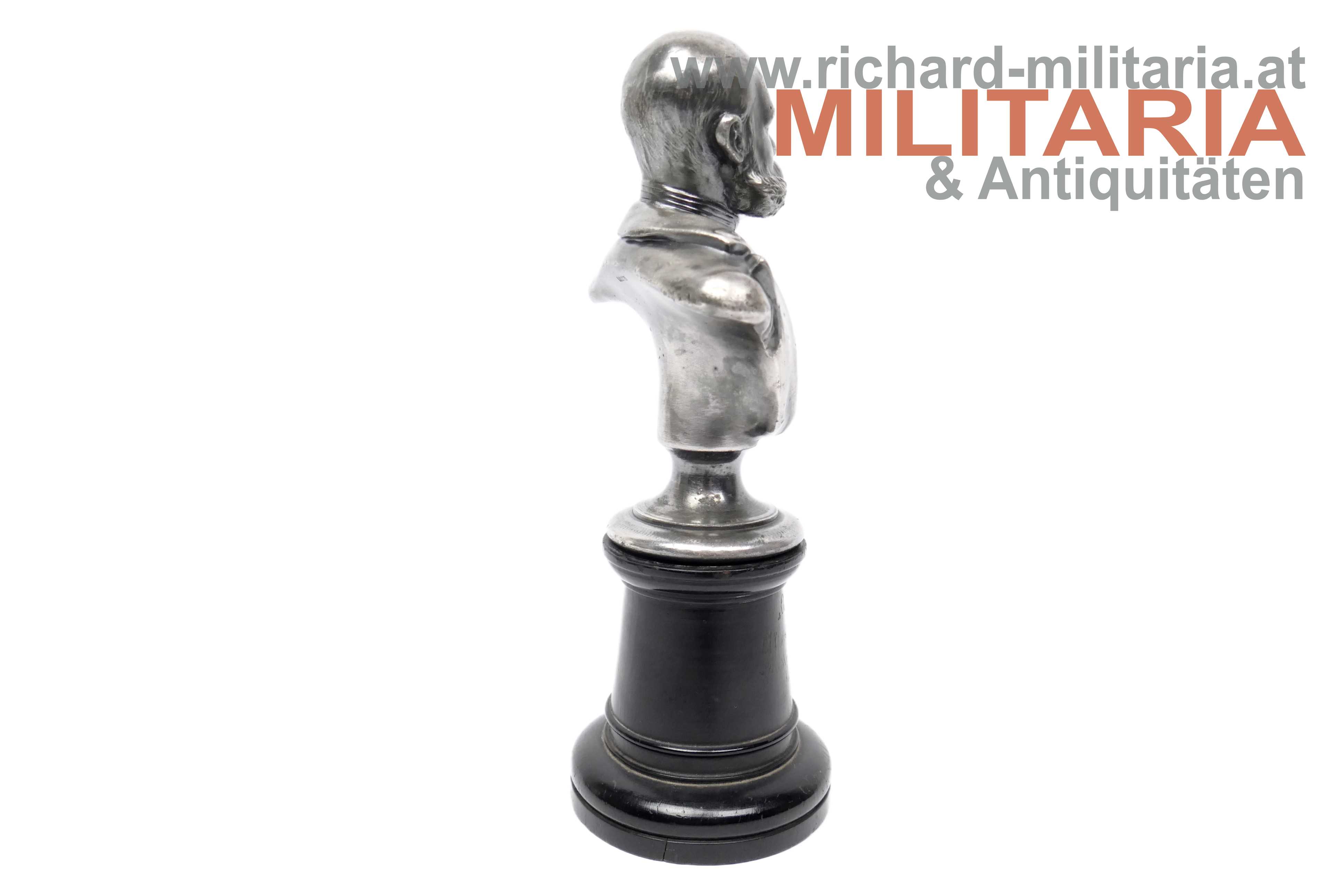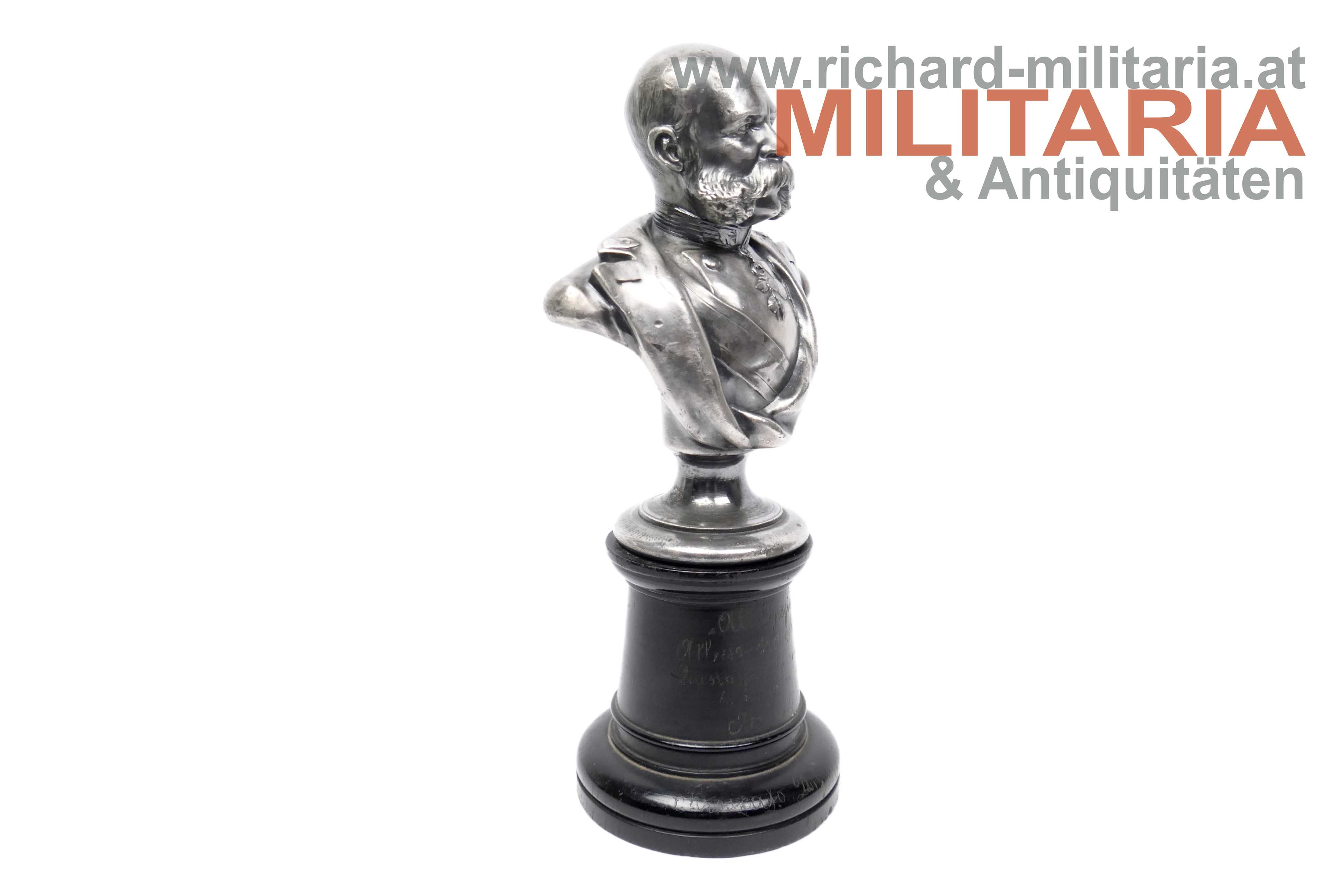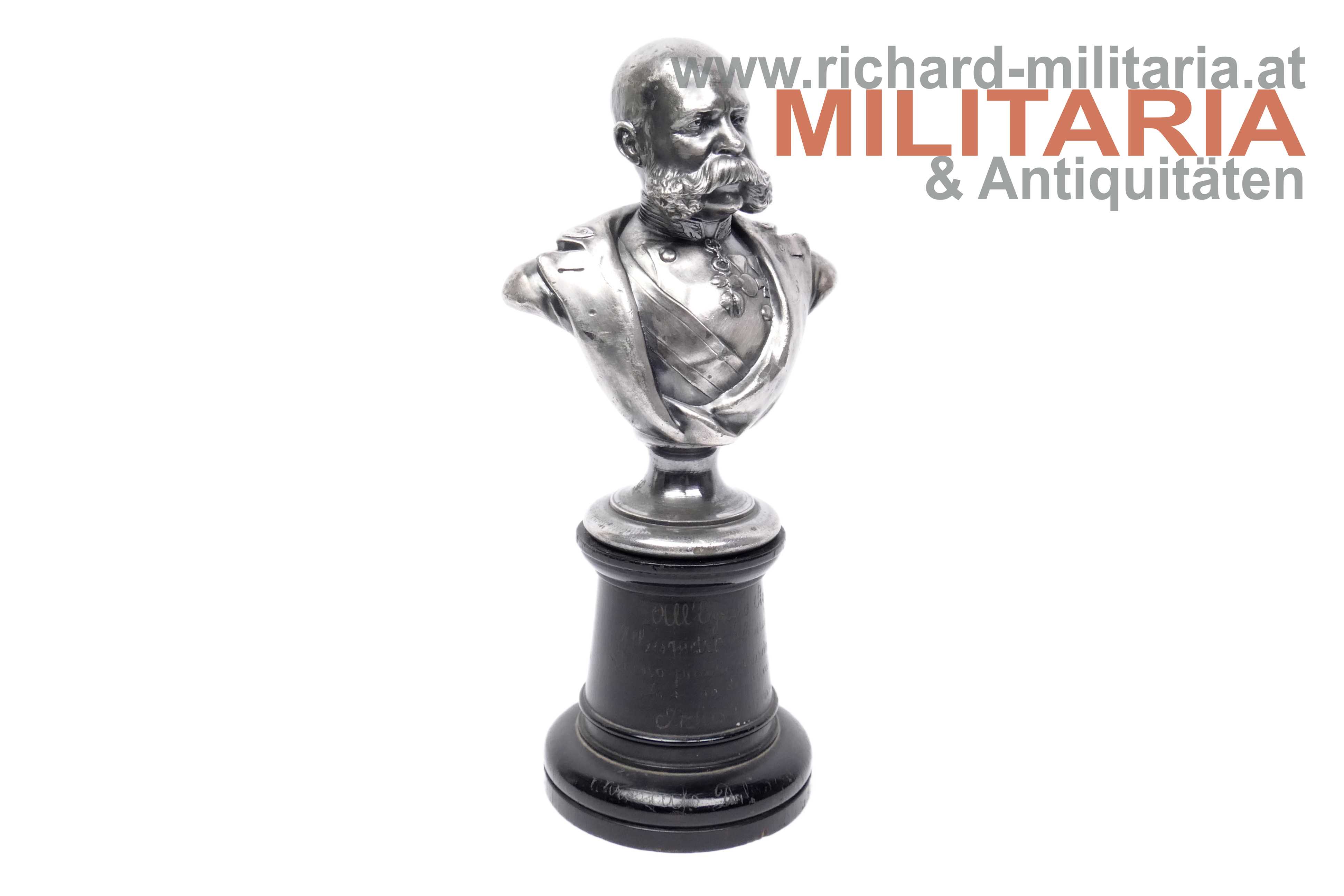 k.u.k. Büste von Kaiser Franz Josef I.; Metall versilbert auf schwarz lackiertem Holzsockel; Büste markiert mit "A.K. & Cie"; am Sockel eine Widmung an Hrn. Alessandro Moratti in italienischer Sprache eingraviert; die Übersetzung lautet in etwa: "Dem hochverehrten Herrn Alessandro Moratti überreiche ich dieses kleine Andenken als Zeichen meiner Wertschätzung! Petris & Franko"; am Sockel weitere schwer lesbare Gravur!