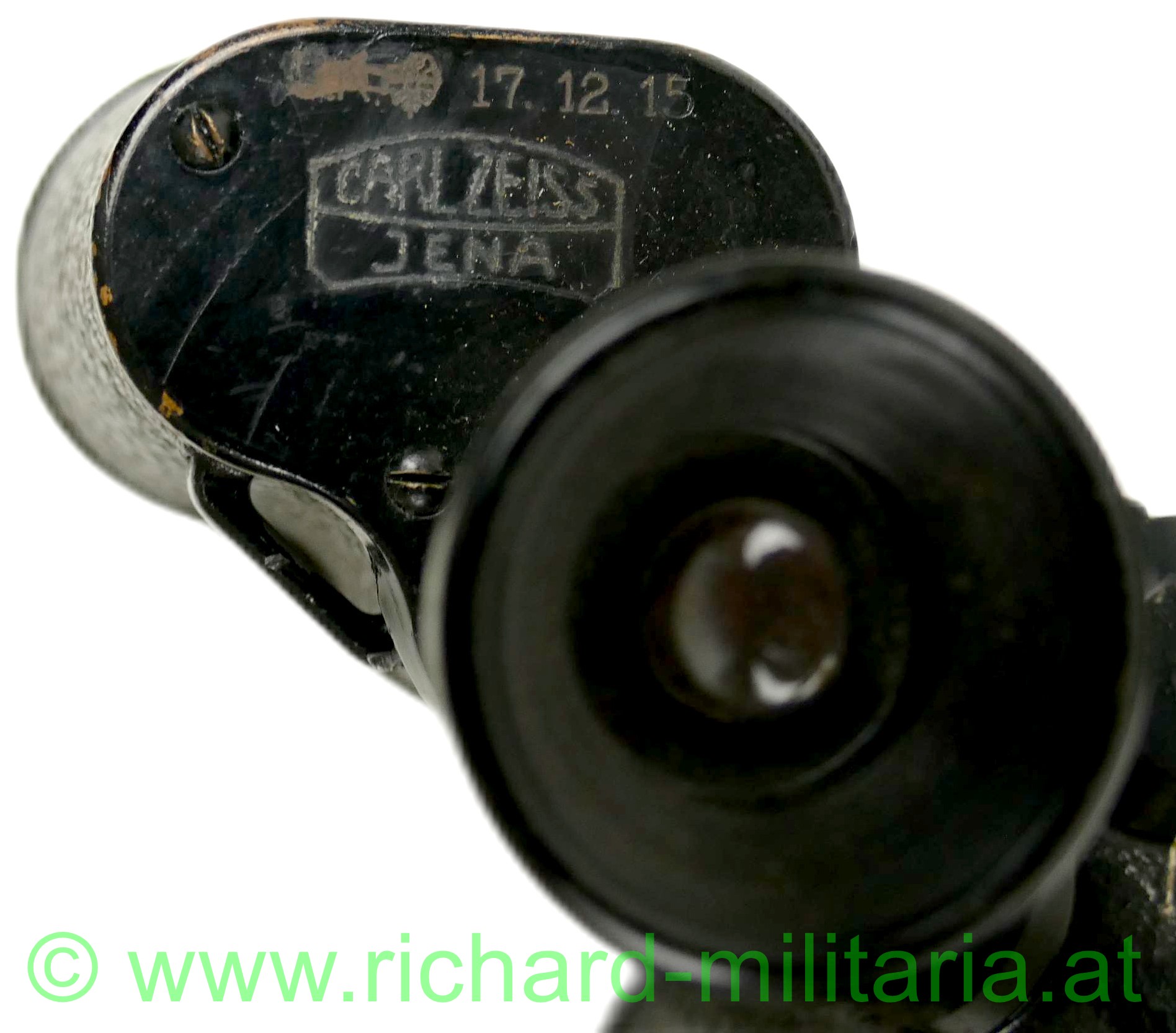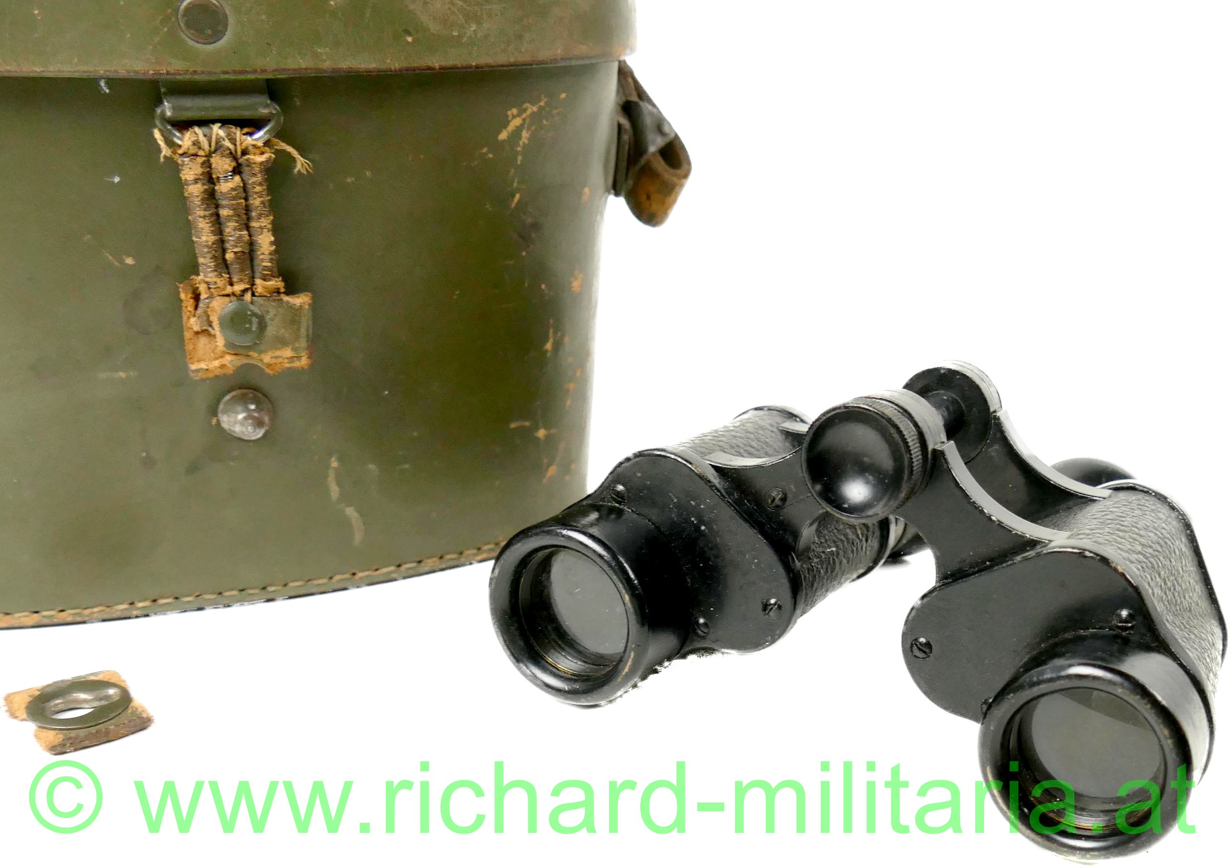 k.u.k. Dienstglas mit Armeeabnahme und Lederköcher, "Carl Zeiss, Jena - k.u.k. Armeeabnahme 17.12.15" - "D.F.6x 576455" klare Optik ohne Strichabkommen, funktionierende Schärfeneinstellung, geschwärzte Metallteile teilweise mit Leder überzogen - nur minimalste Abnutzungen, Augenmuscheln aus schwarzem Bakelit; ohne Trageriemen; armeegrüner Lederköcher, Verschlusslasche abgebrochen - liegt lose bei, neu vernähter langer grüner Trageriemen,