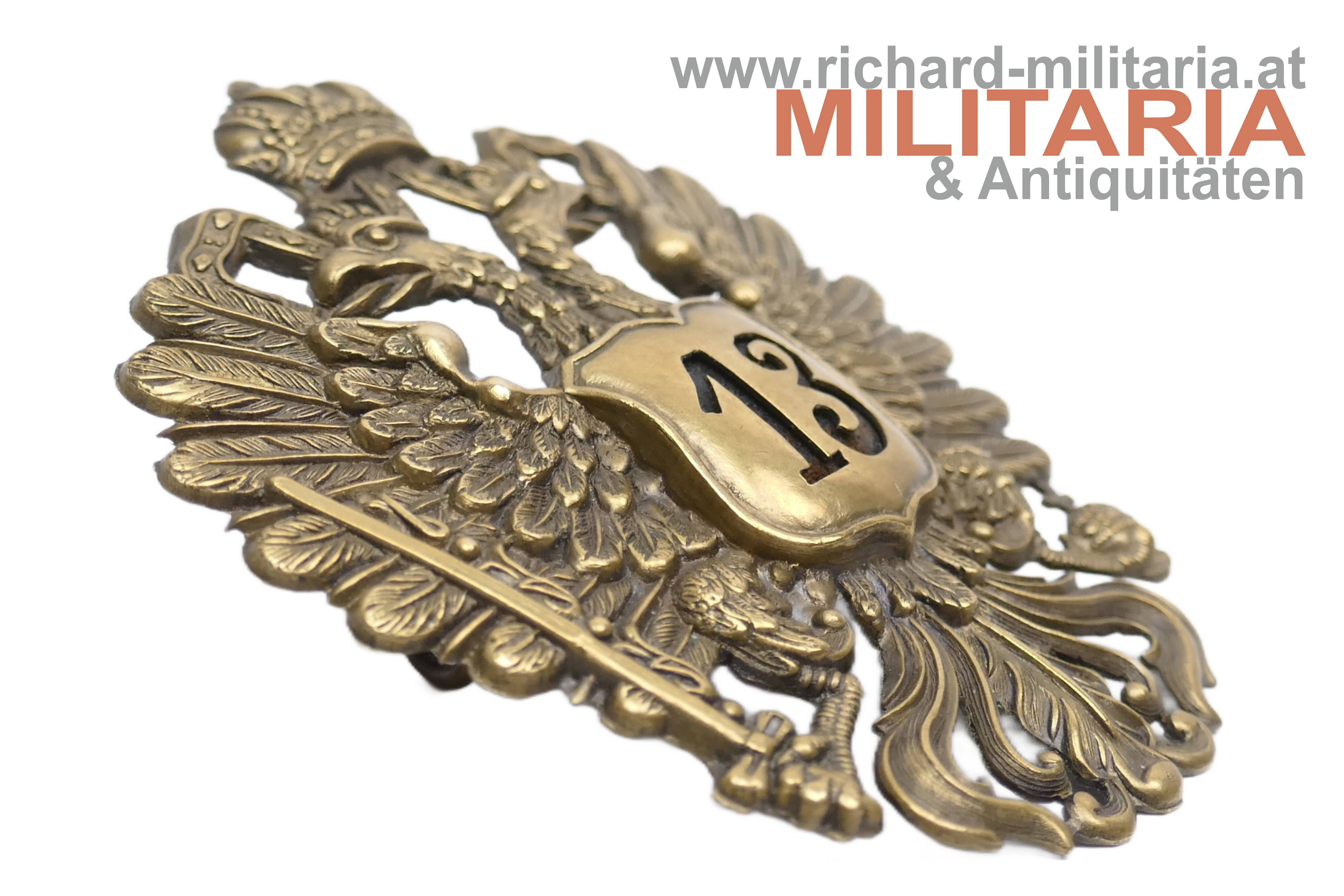 k.u.k. Doppeladler für den Husaren-Tschako des Husaren Regiments Nr. 13; Tombak - Mannschaftsausführung ; revers 2 Splinte zum Befestigen; Regimentsnummer mit einem Lederstück unterfüttert;