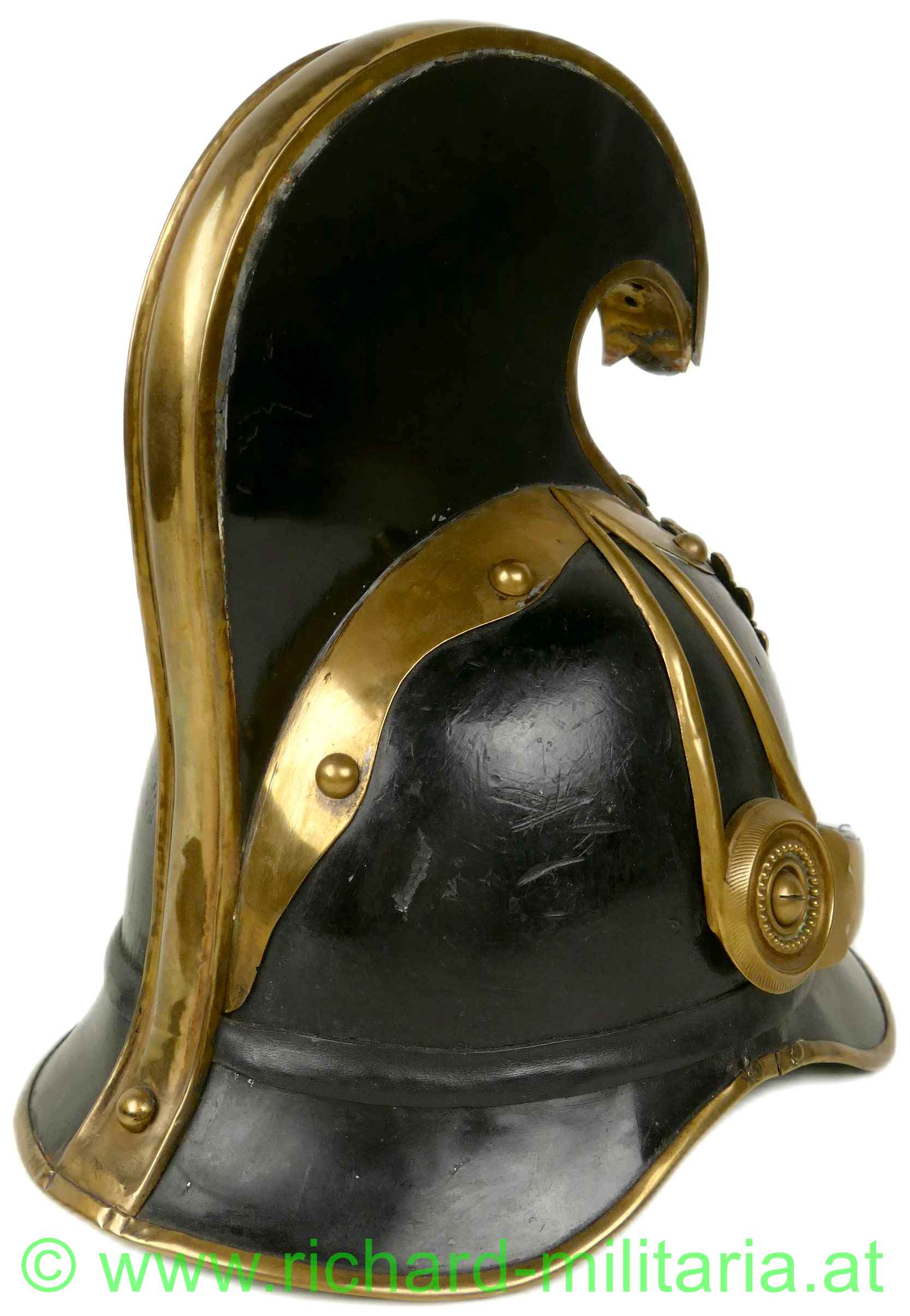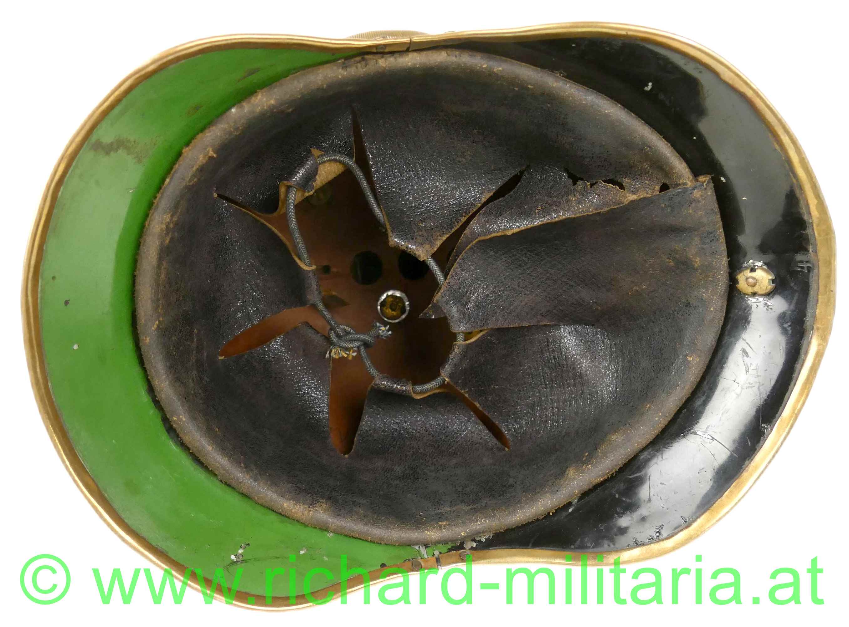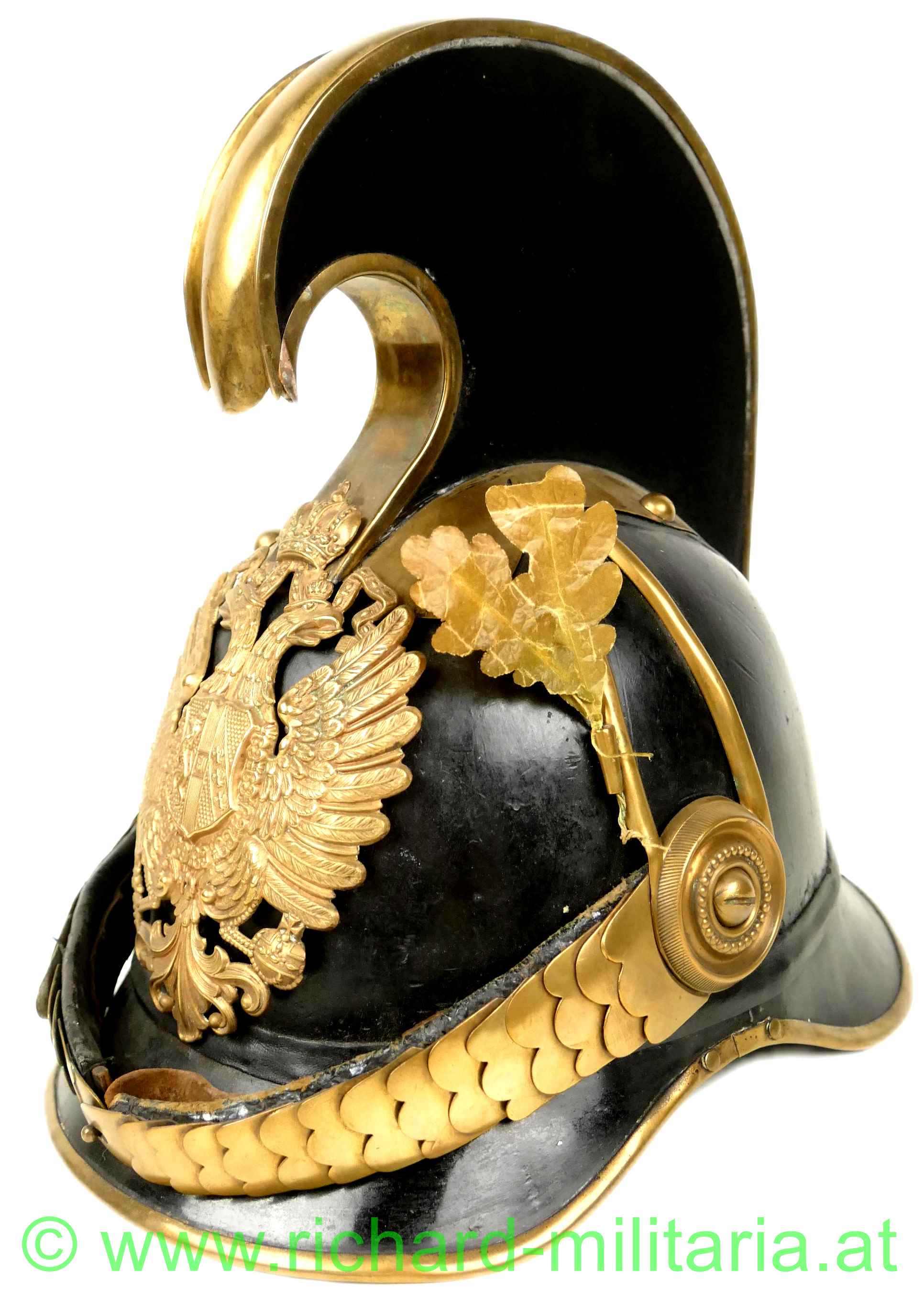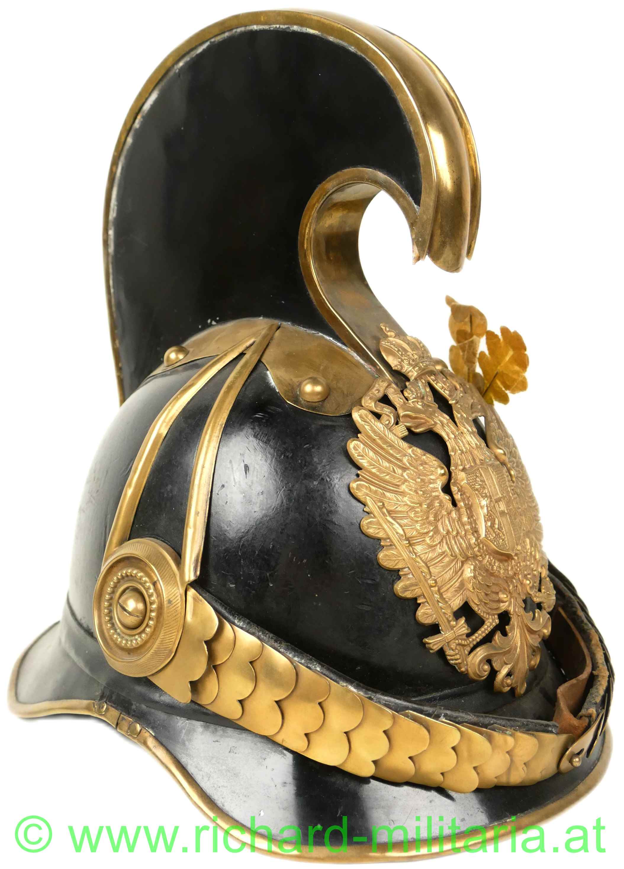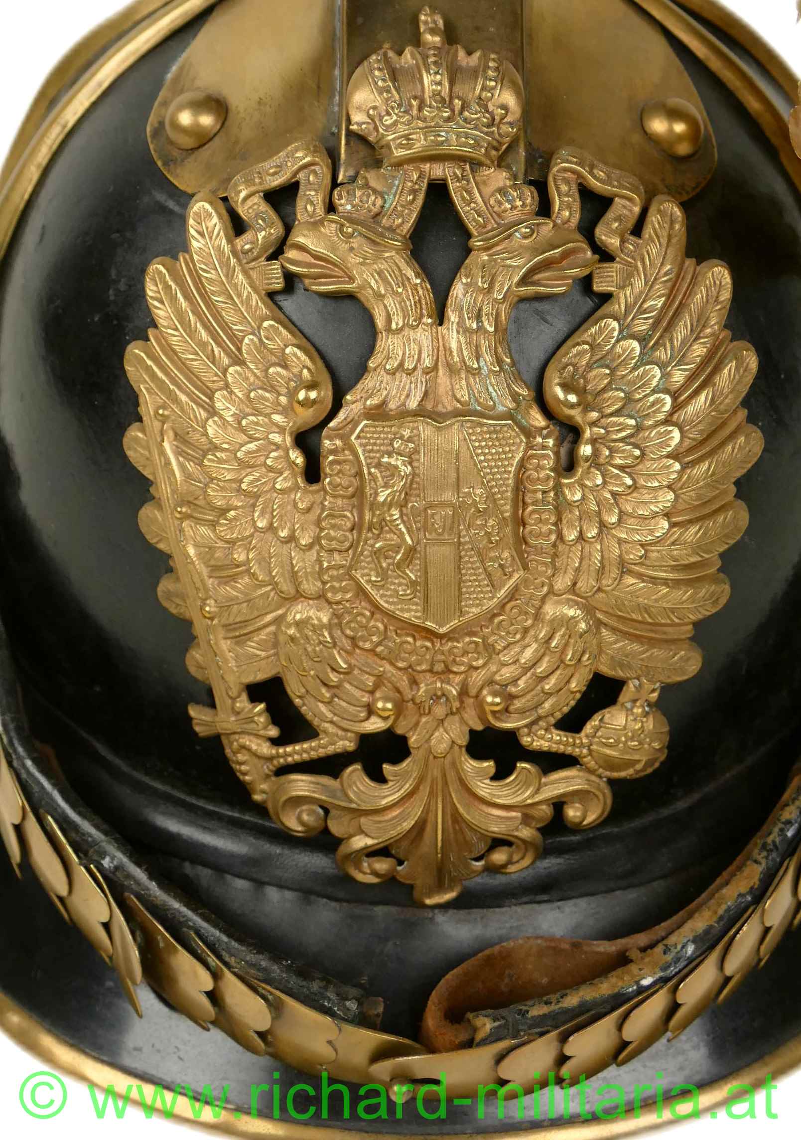 Helm für Mannschaften der k.u.k. Dragoner mit Monturdepotstempel; Glocke, Sonnen- und Nackenschirm aus schwarzem Eisenblech; originale schwarze Lackierung (!); Variante mit stärker ausgeprägtem Sonnenschirm (Muster 1905); Doppeladler, Schuppenband und der obere Verlauf des Kammes aus vergoldetem Metall; Doppeladler mit dem Allerhöchsten Namenszug "FJ1"; Lederhinterfütterung beim Schuppenband mit Gebrauchsspuren; linksseitige Gabel mit einer Tülle in die ein Feldzeichen gesteckt ist; Unterseite des Sonnenschirms grün lackiert; 8-lappiges Lederfutter - auf der Unterseite mit MONTURDEPOTSTEMPEL (!); alle Verschraubungen für den Kamm innen vorhanden;