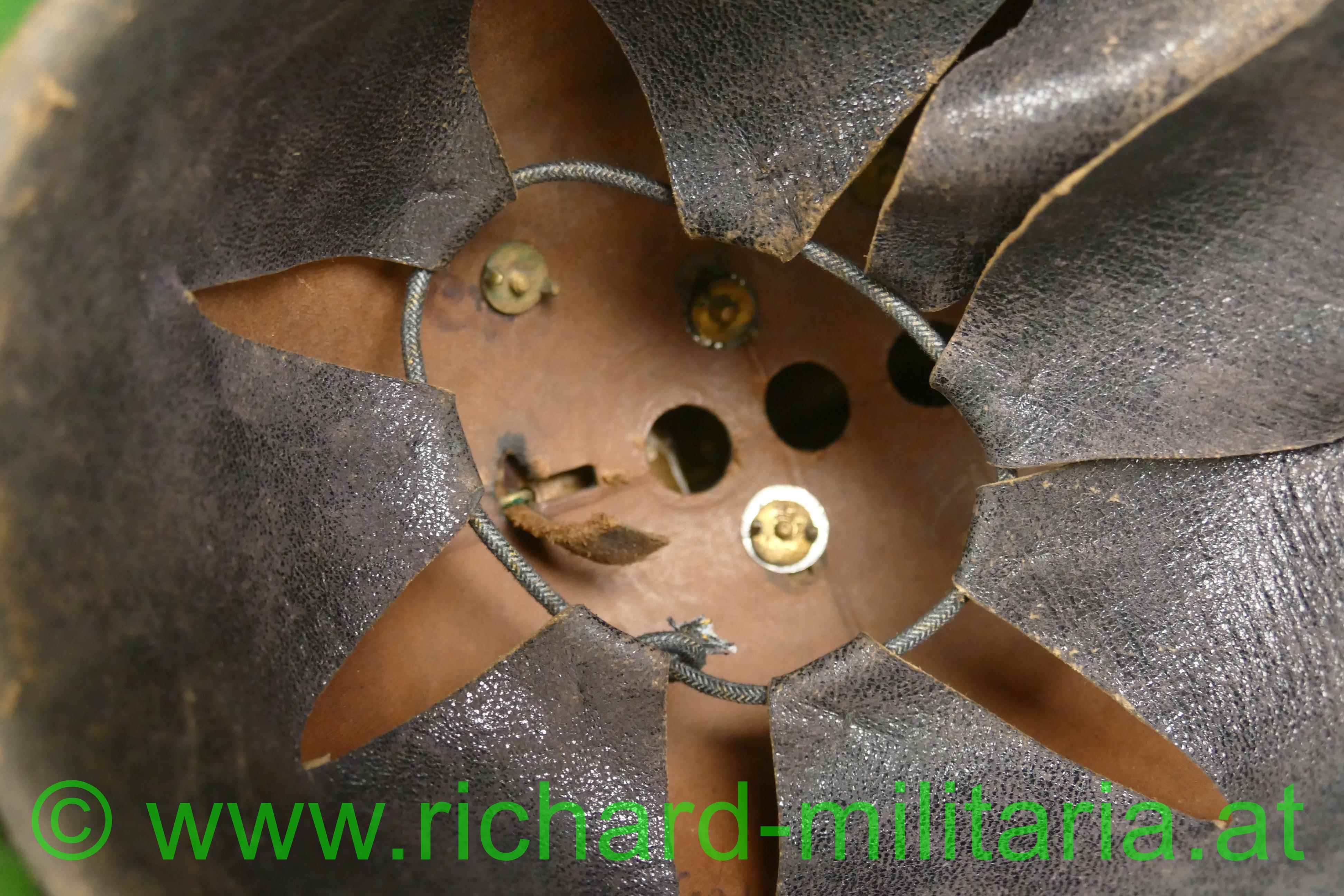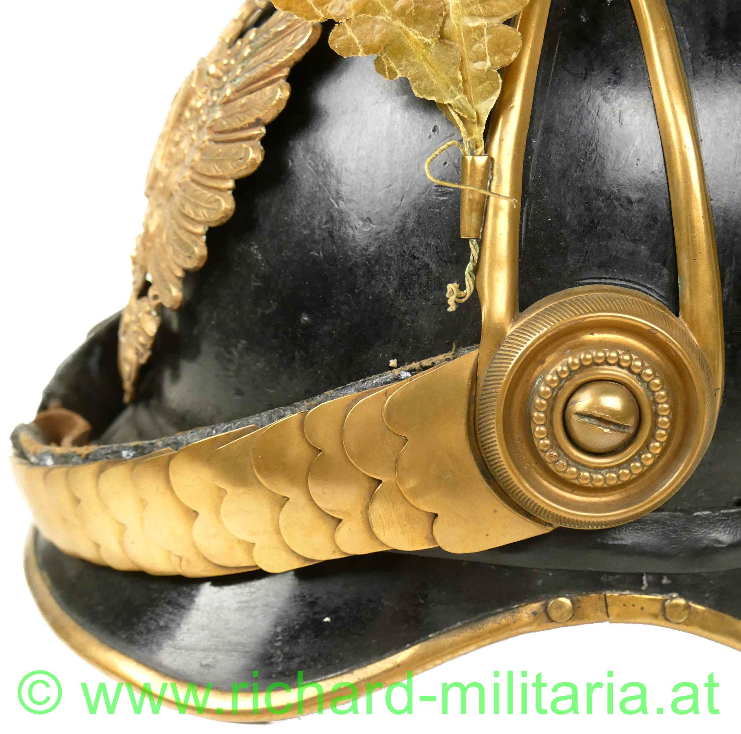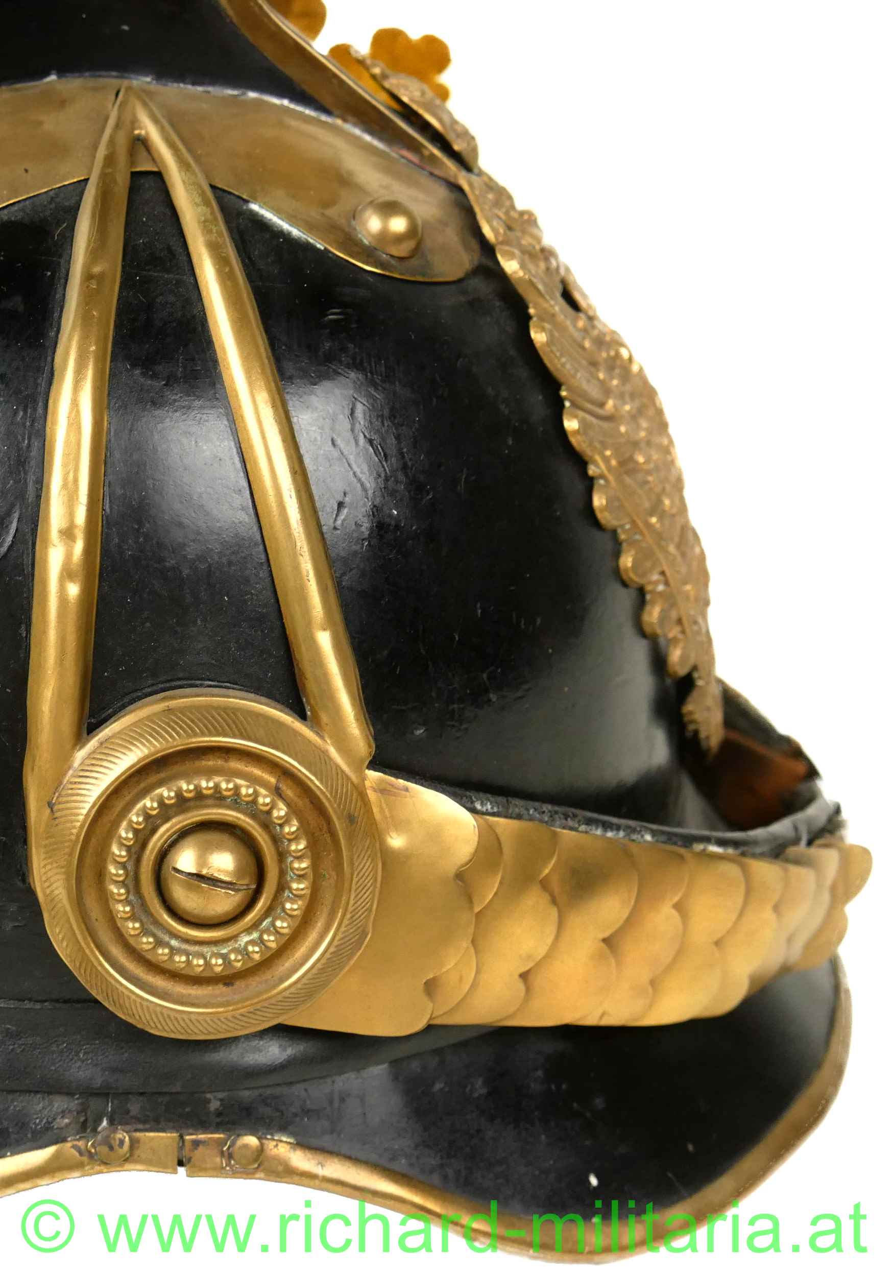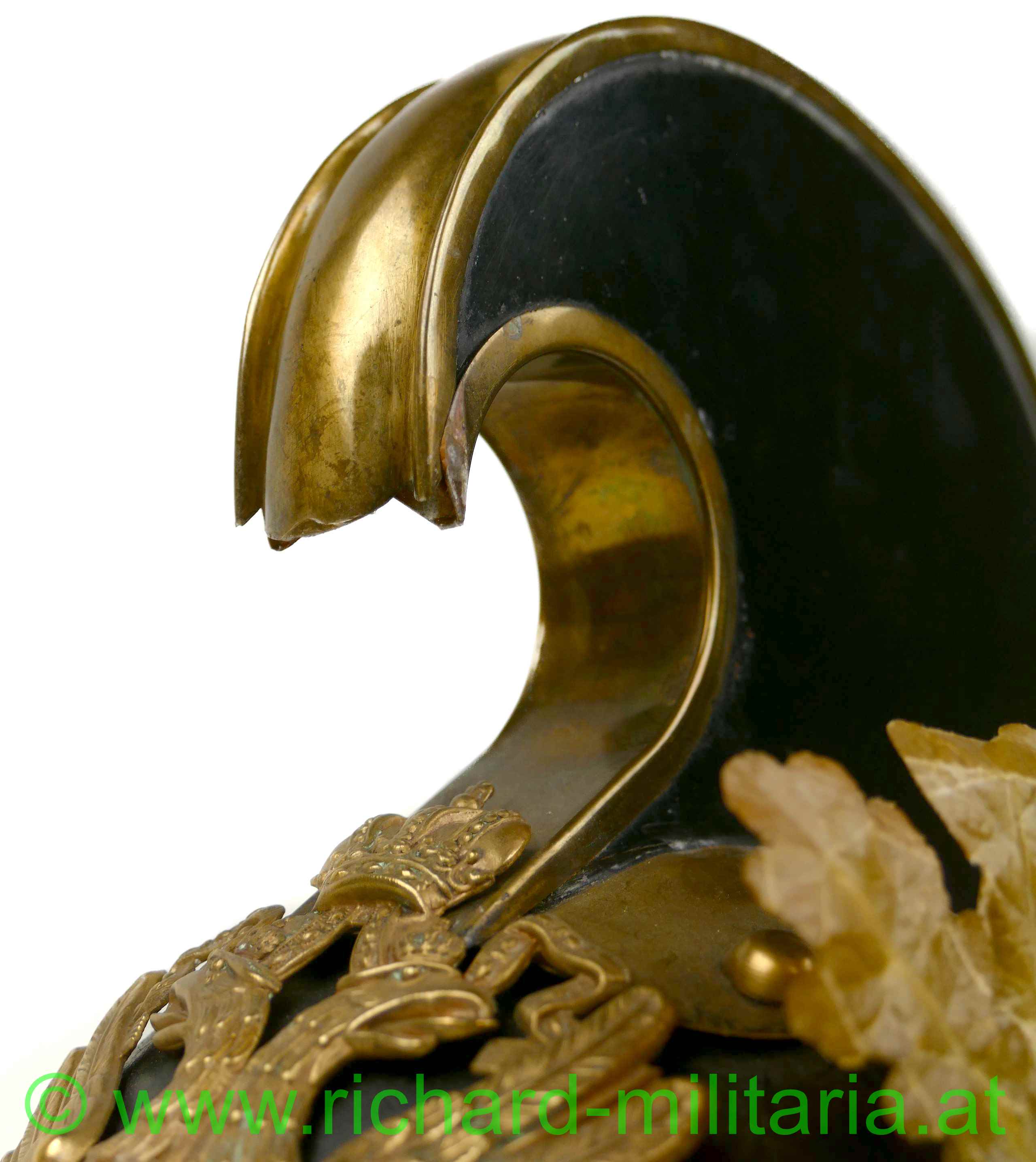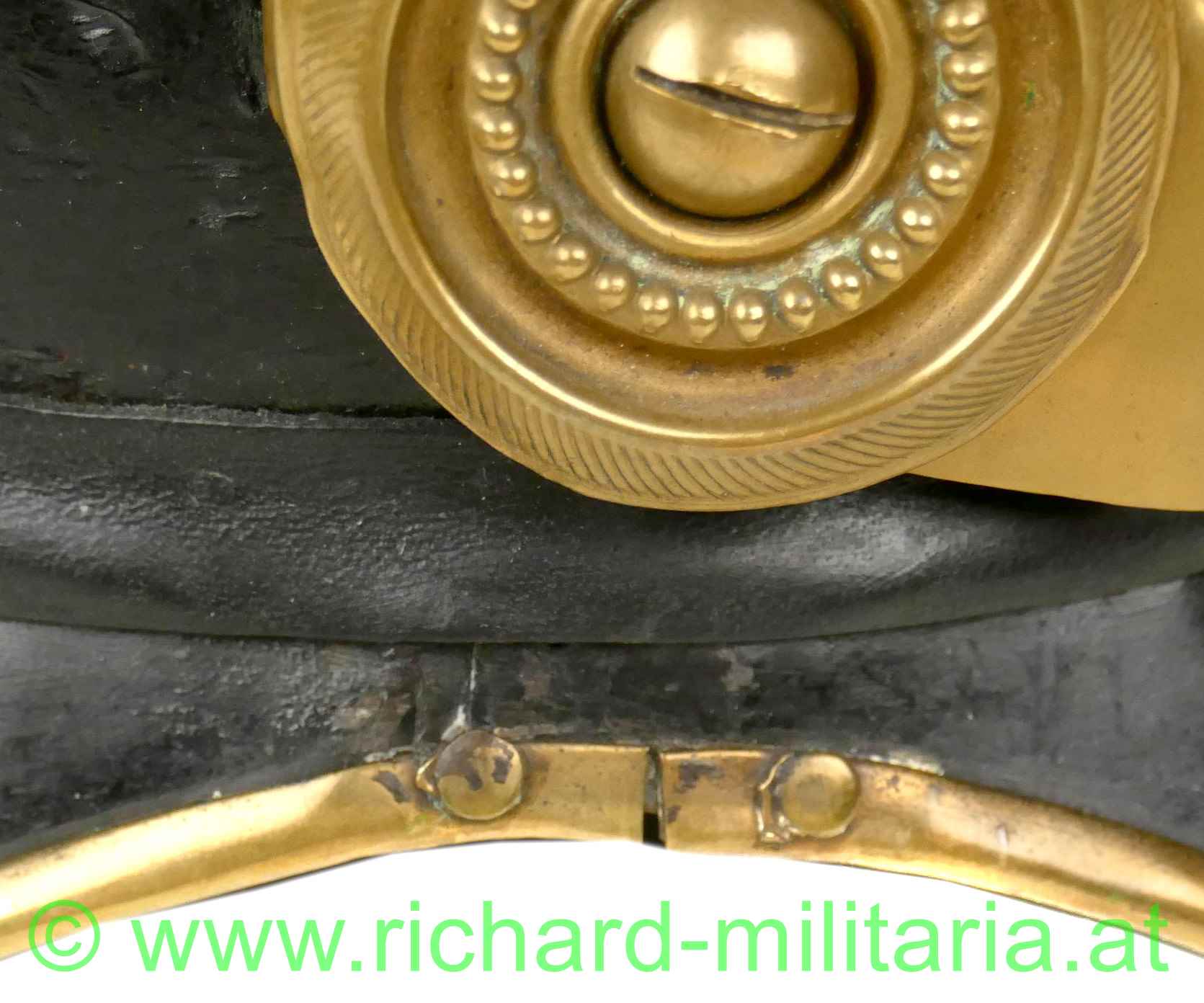 Helm für Mannschaften der k.u.k. Dragoner mit Monturdepotstempel; Glocke, Sonnen- und Nackenschirm aus schwarzem Eisenblech; originale schwarze Lackierung (!); Variante mit stärker ausgeprägtem Sonnenschirm (Muster 1905); Doppeladler, Schuppenband und der obere Verlauf des Kammes aus vergoldetem Metall; Doppeladler mit dem Allerhöchsten Namenszug "FJ1"; Lederhinterfütterung beim Schuppenband mit Gebrauchsspuren; linksseitige Gabel mit einer Tülle in die ein Feldzeichen gesteckt ist; Unterseite des Sonnenschirms grün lackiert; 8-lappiges Lederfutter - auf der Unterseite mit MONTURDEPOTSTEMPEL (!); alle Verschraubungen für den Kamm innen vorhanden;