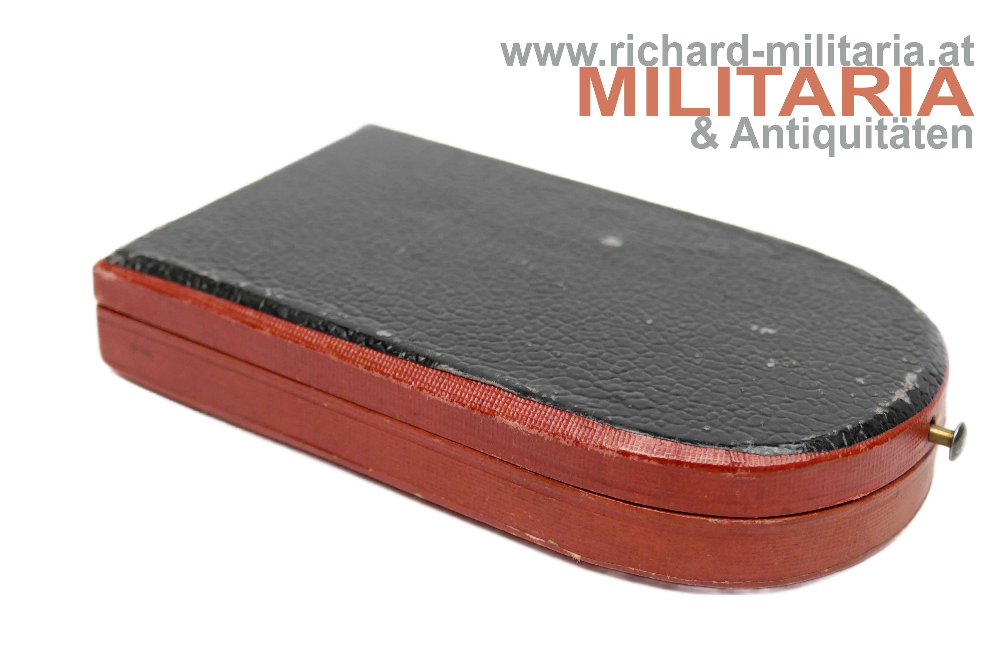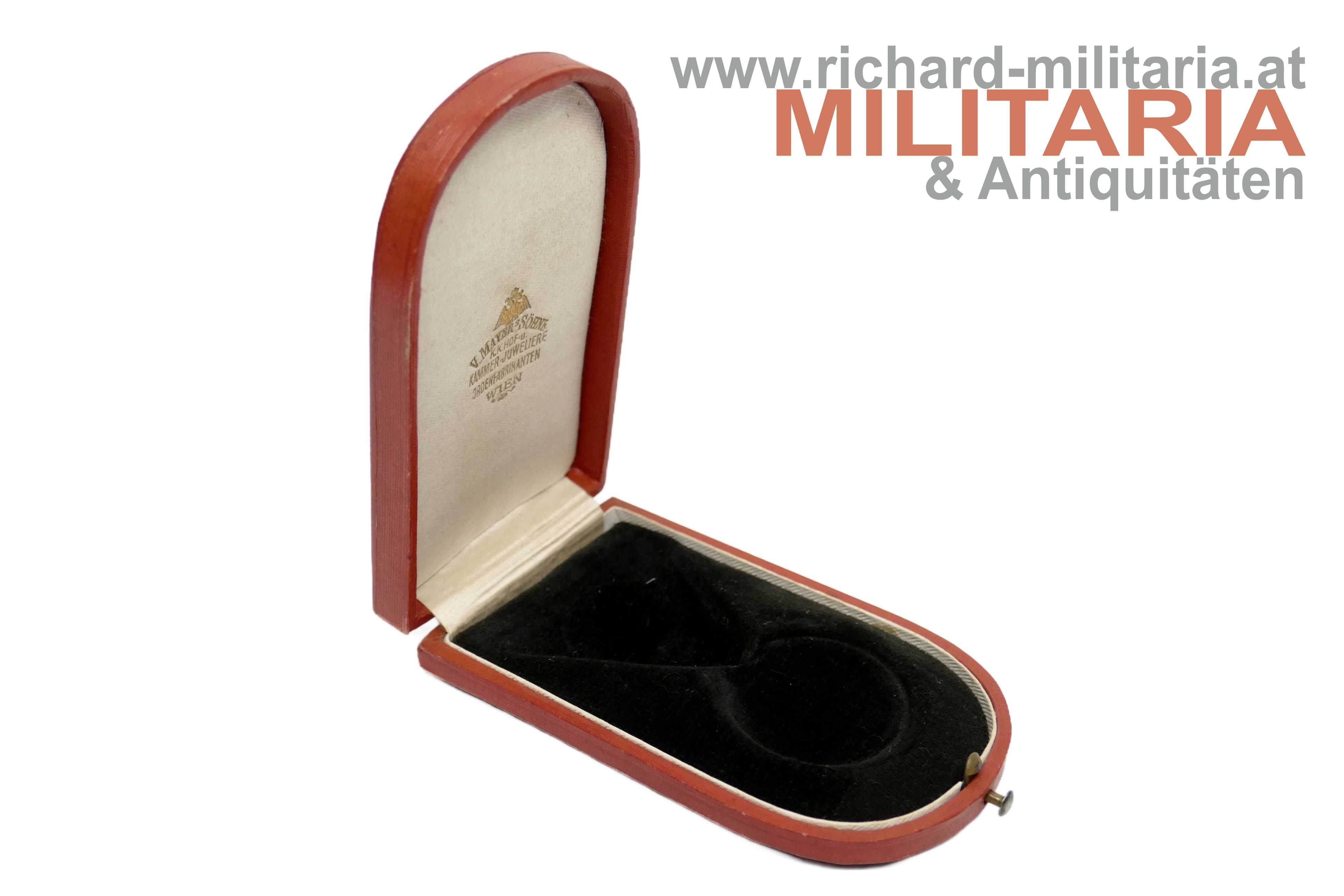k.u.k. Ehrenmedaille für vierzigjährige treue Dienste mit Etui; Bronze; am originalen roten Band für Beamte und Zivilpersonen; neutral gehaltenes rotes Etui vom Hersteller "V. Mayers Söhne"; Medaille und Band passen perfekt in die Einlage; Etui in guter Erhaltung;