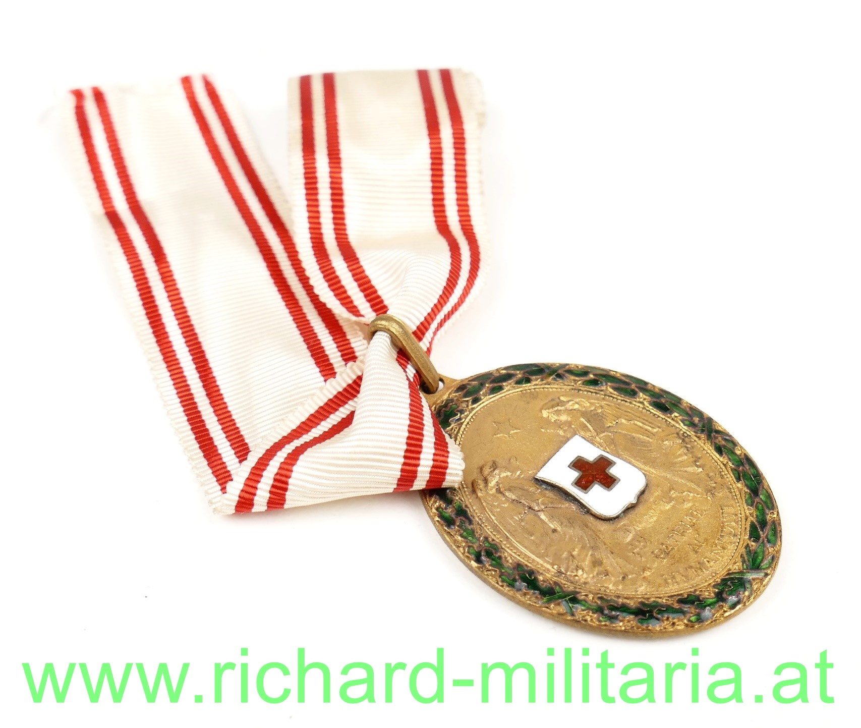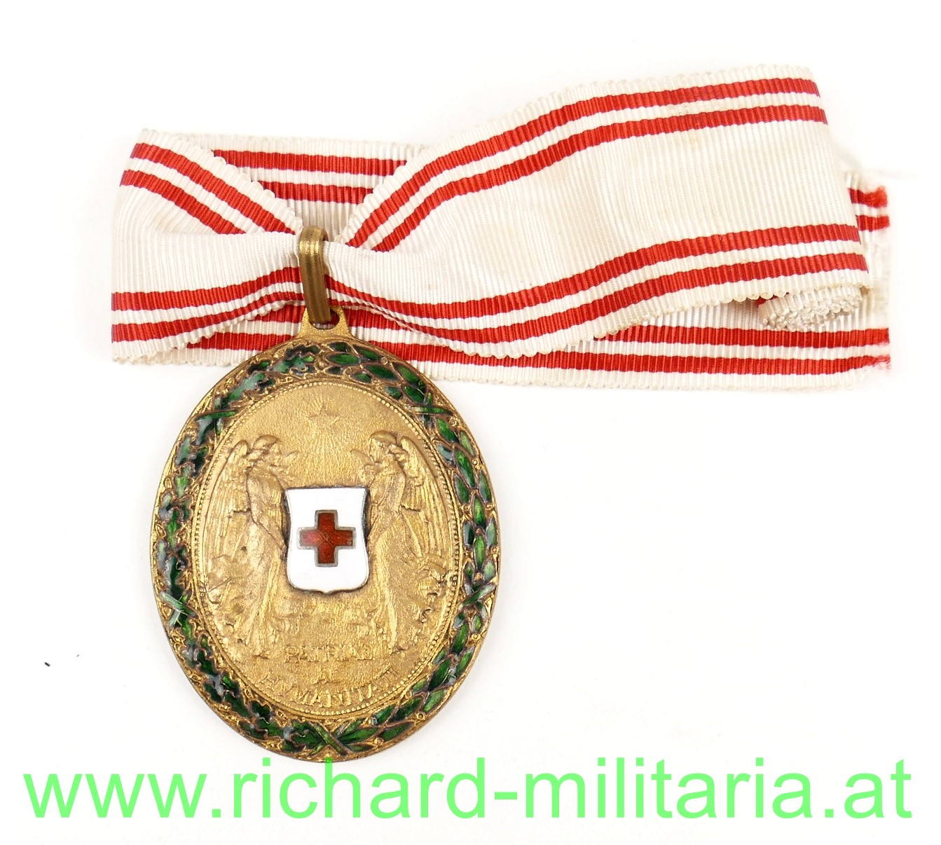 k.u.k. Ehrenzeichen vom Roten Kreuz, Patriae ac Humanitati, 1864-1914, Bronze vergoldet mit emaillierten aufgelegten Wappen - das Rot Kreuz Wappen, emaillierter Eichenlaubkranz, an unvernähtem Bandabschnitt