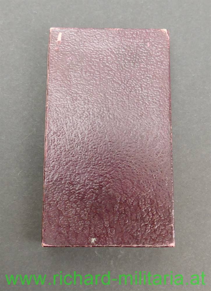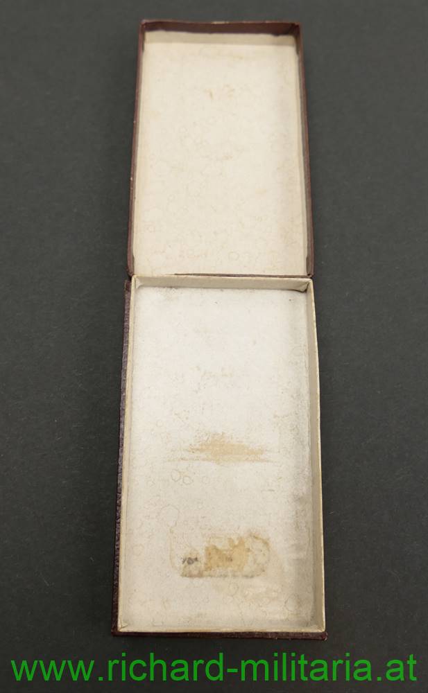 k.u.k. Eisernes Verdienstkreuz mit der Krone und mit Schwertern im originalen Etui; Eisen; originales Band mit aufgenähten Schwertern aus Metall; dunkelbraunes Kartonetui mit goldenem Deckelaufdruck "E. V. K. m. Kr.";