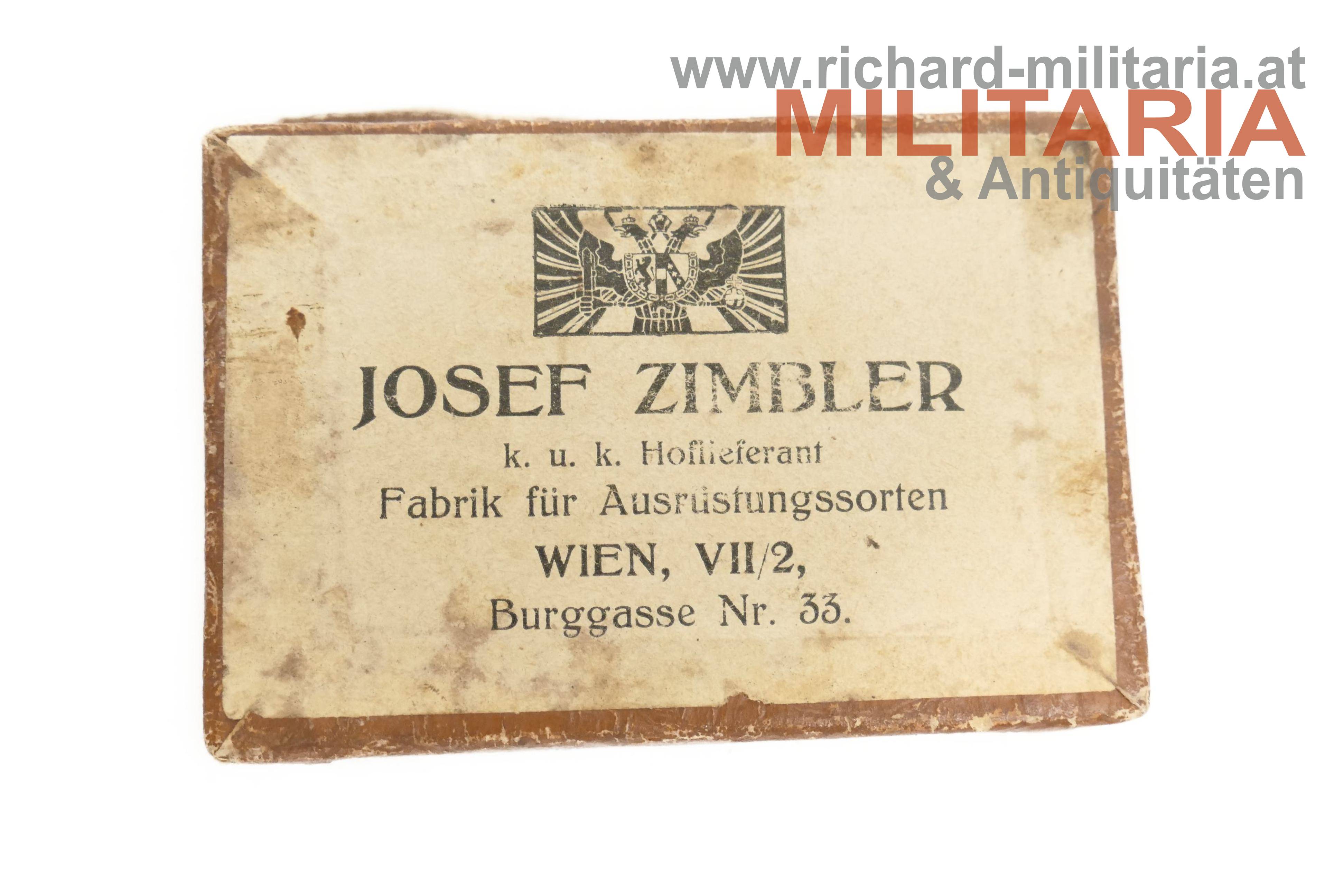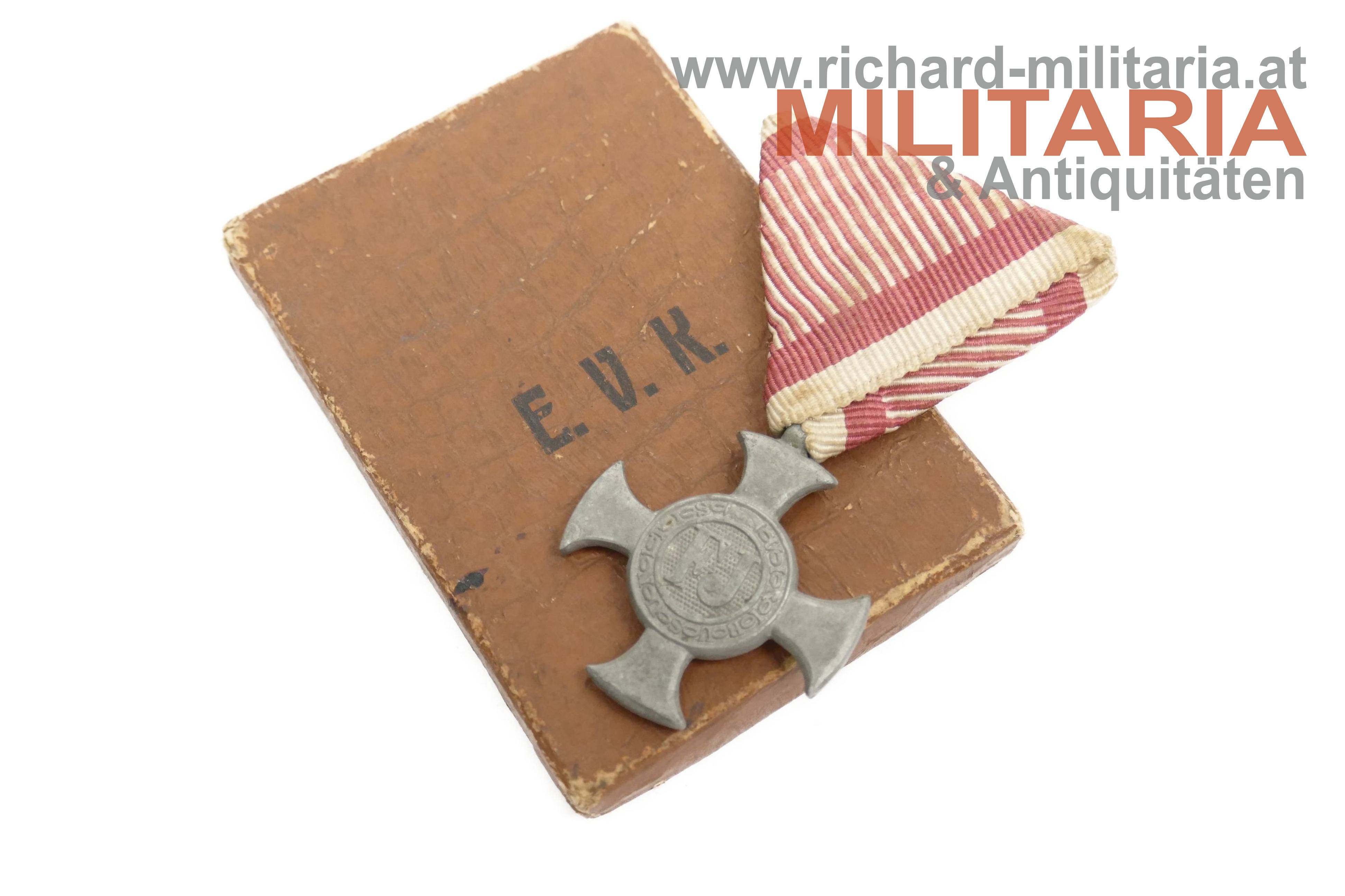 k.u.k. Eisernes Verdienstkreuz mit Etui; Zink am originalen Band; seltenes Kartonetui mit braunem, reliefiertem Überzug in Lederoptik; am Deckel aufgedruckt in schwarzer Schrift "E.V.K."; innen im Deckel händisch ein Namen ergänzt; Etui mit Watte ausgepolstert und darüber eine braune Samtstoffeinlage gelegt; am Etuiboden der Hersteller "Josef Zimbler";