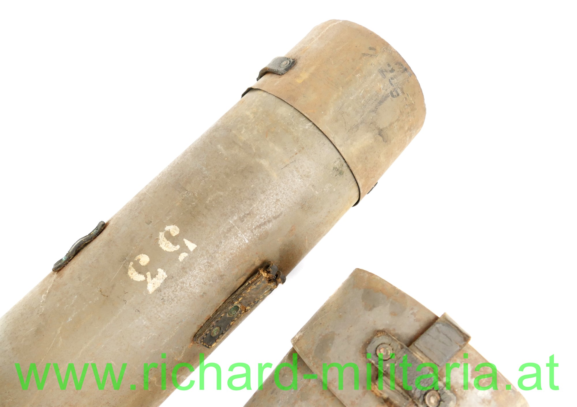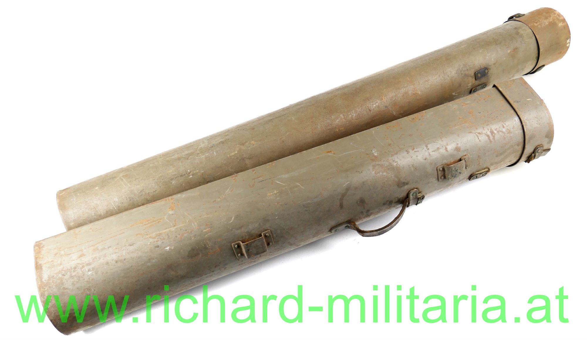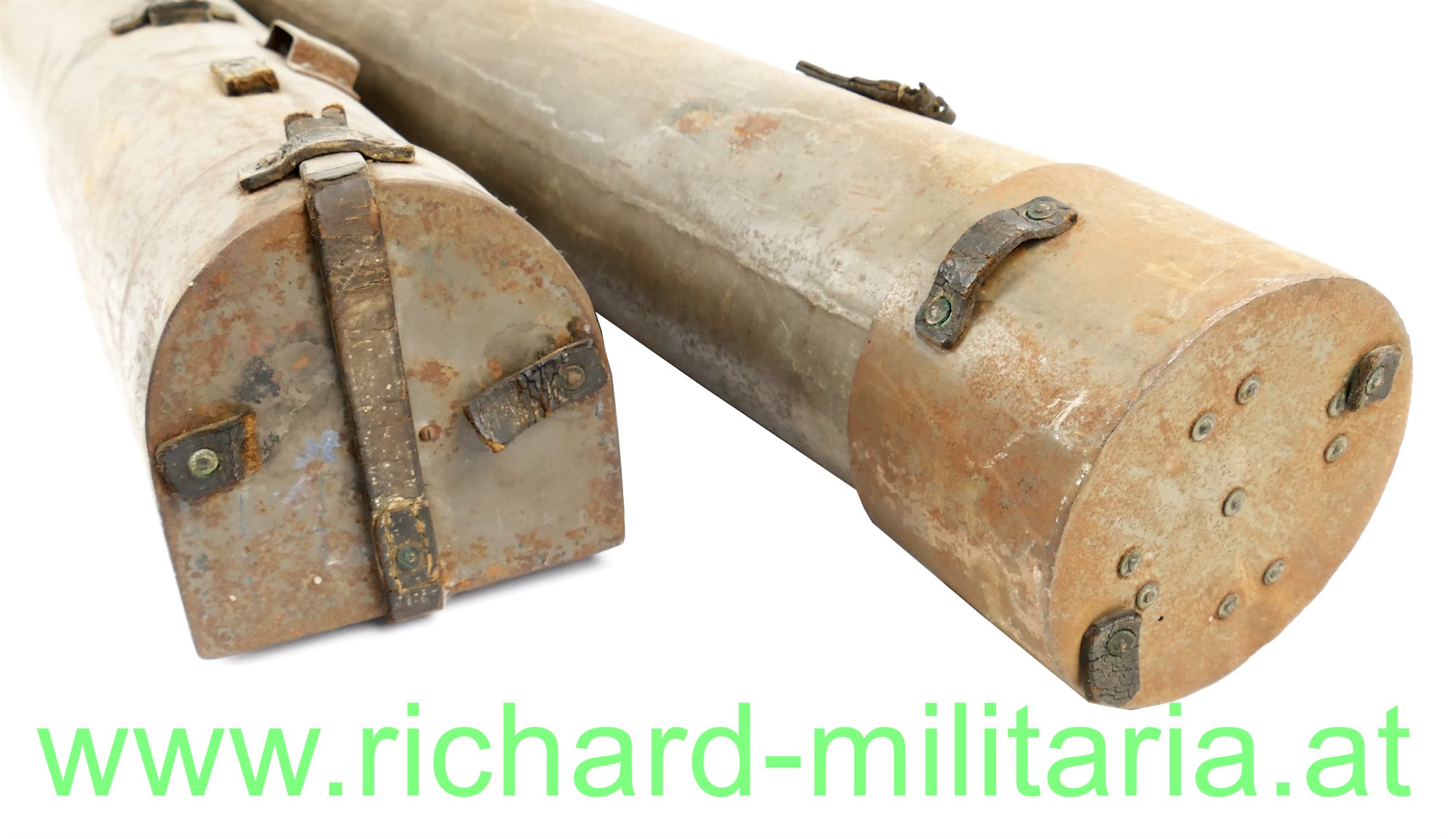 k.u.k. Blechbehältersatz für den Entfernungsmesser u. Stativ, 2 original lackierte Blechbehälter - beide mit fast 100 % originaler Farbe (leicht flugrostig), Lederberiemung trocken großteils gerissen/abgebrochen; auf beiden Behältern 2 fix vernietete Aufstecklaschen;