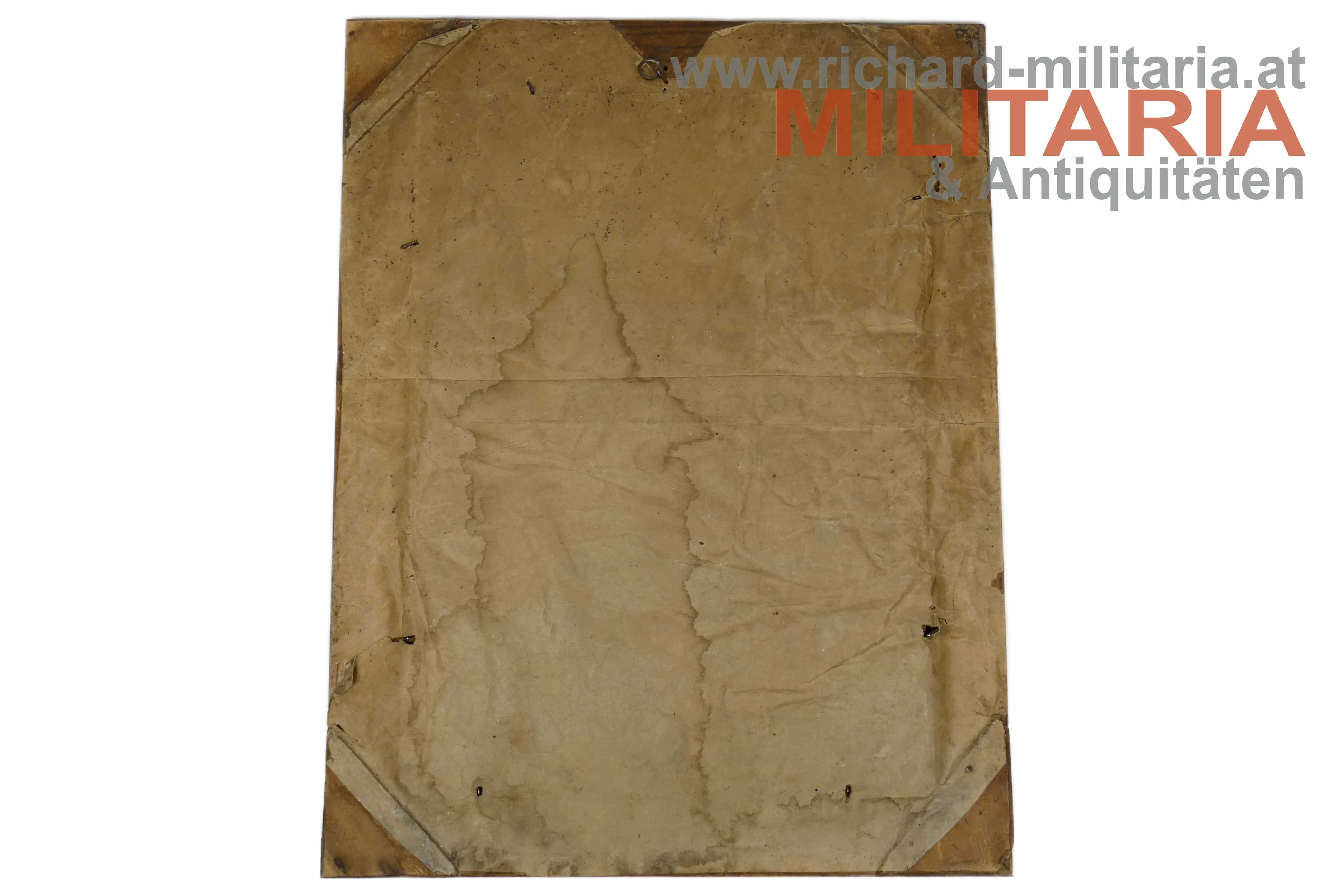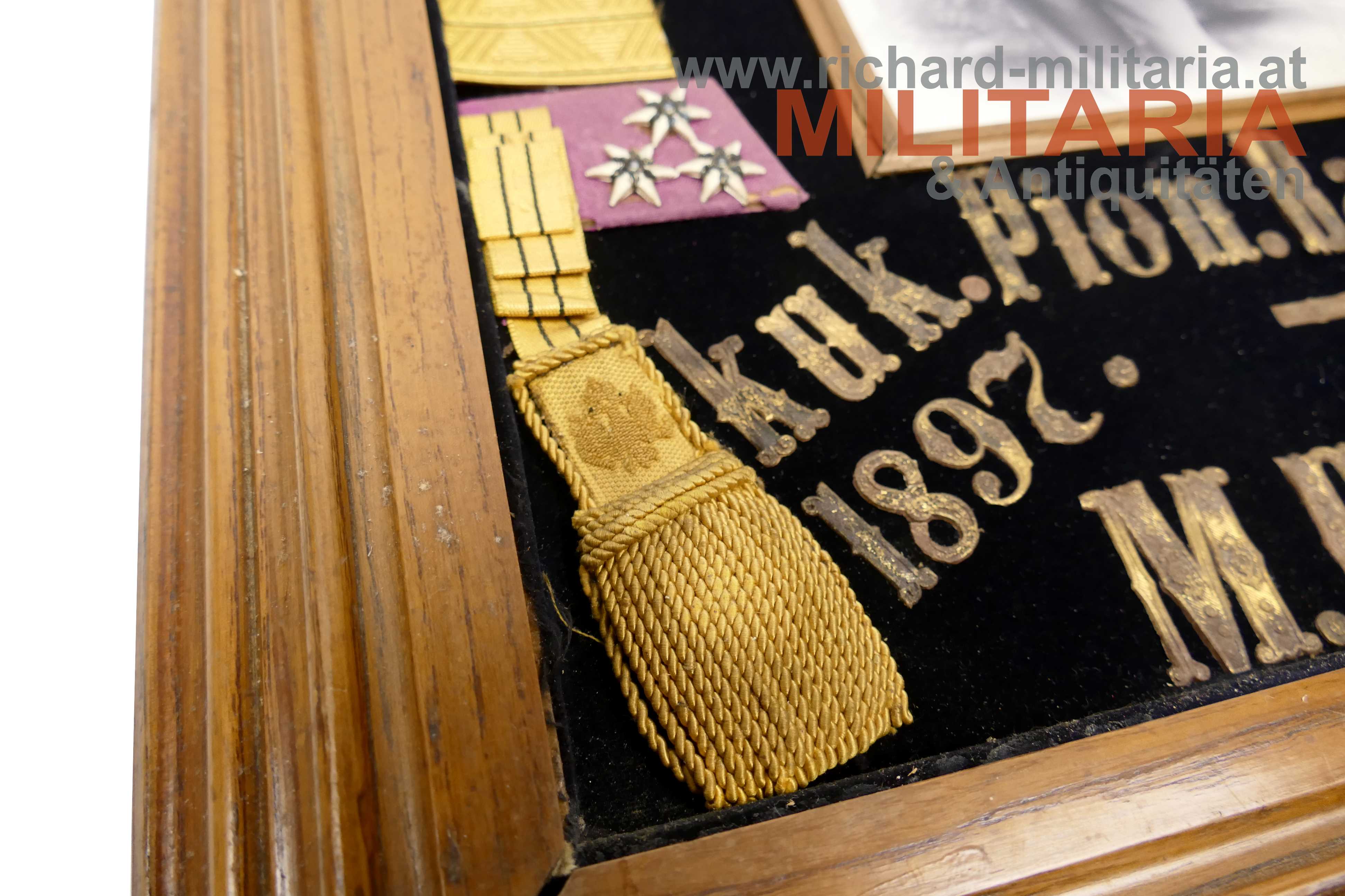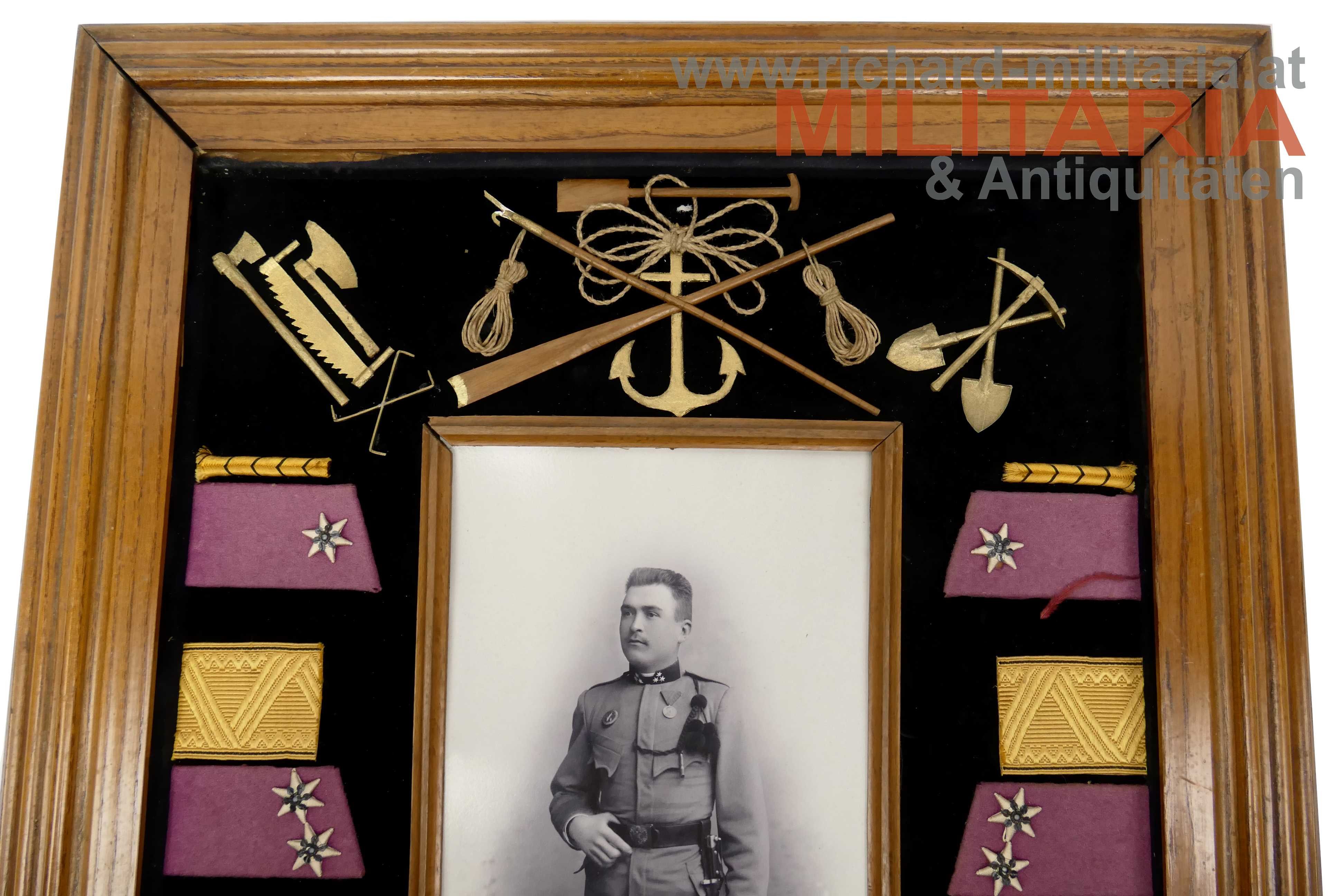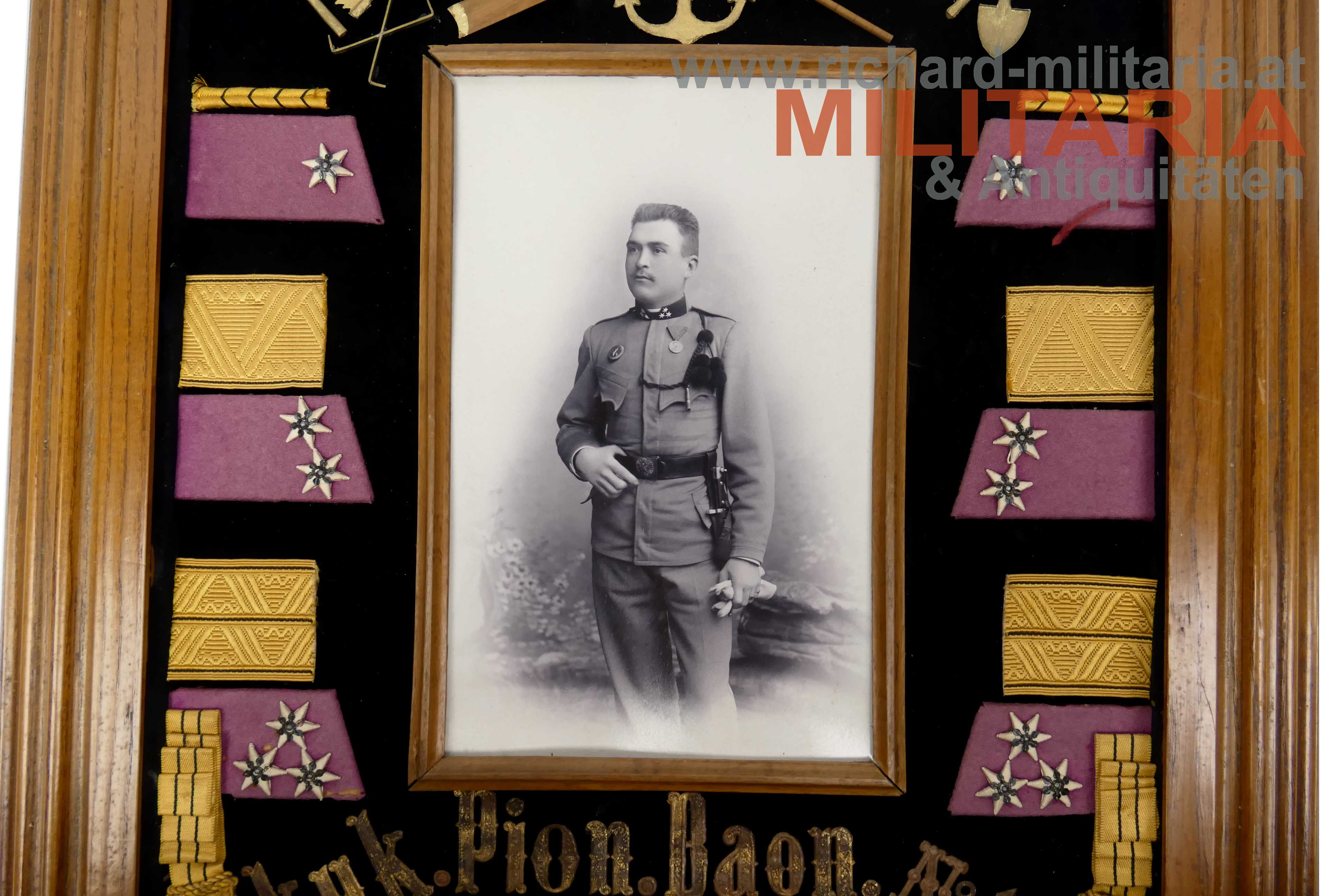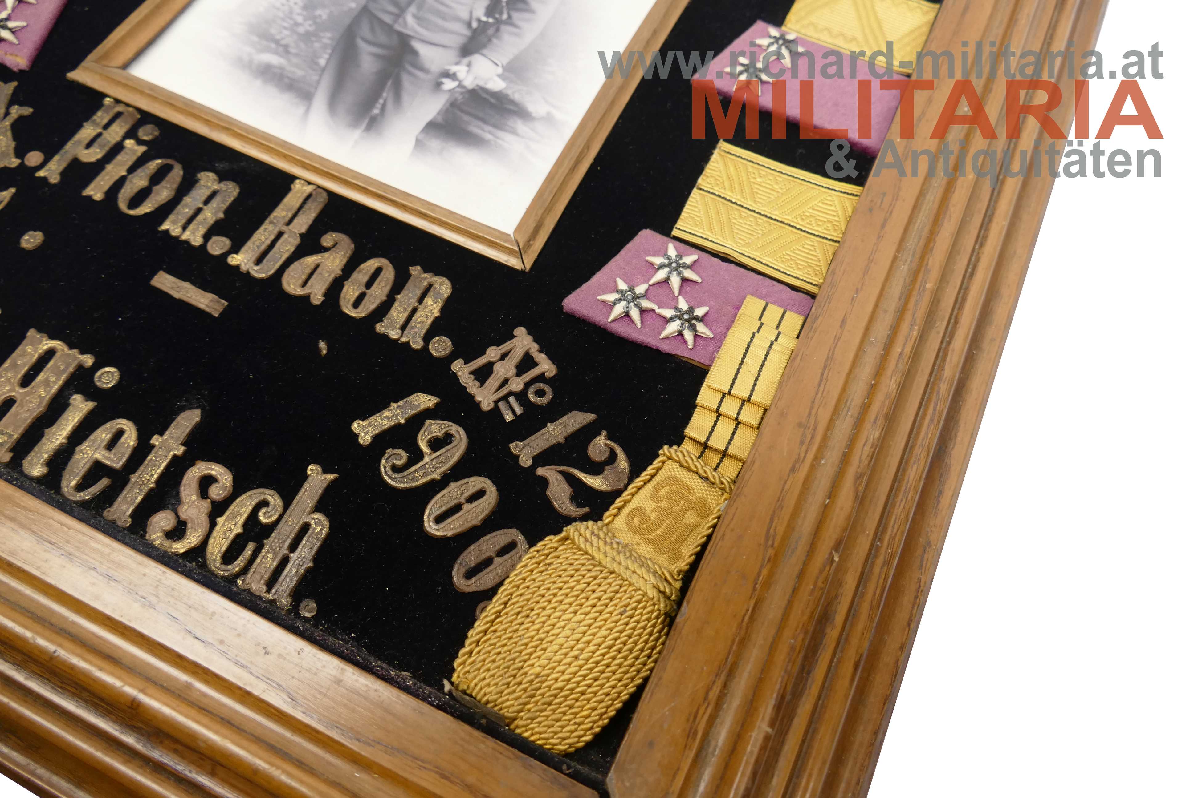 k.u.k. Erinnerungsbild des Zugführers M. Hietsch beim Pionier-Bataillon Nr. 12 von 1897-1900; mittig eine Abbildung des Zugführers mit dem Sappeurabzeichen auf der rechten Brust; oberhalb des Fotos Pionierdekorationen aus Holz teilweise mit goldener Farbe bemalt; Bild flankiert von kaisergelben Wollborten eines Unteroffiziers und Kragenspiegeln für die Ränge Gefreiter bis Zugsführer; unter dem Bild in vergoldeten Tombakbuchstaben "k.u.k. Pion. Baon. No 12 - 1897-1900 - M. Hietsch"; Text flankiert von einem halbiertem Unteroffiziersportepee in geschlossener Form; Bild und Dekoration auf schwarzem Samtstoffuntergrund; Glas des Rahmens fehlt; die 4 Rahmenteile selbst sitzen etwas locker; Rahmen restaurierungsbedürftig;