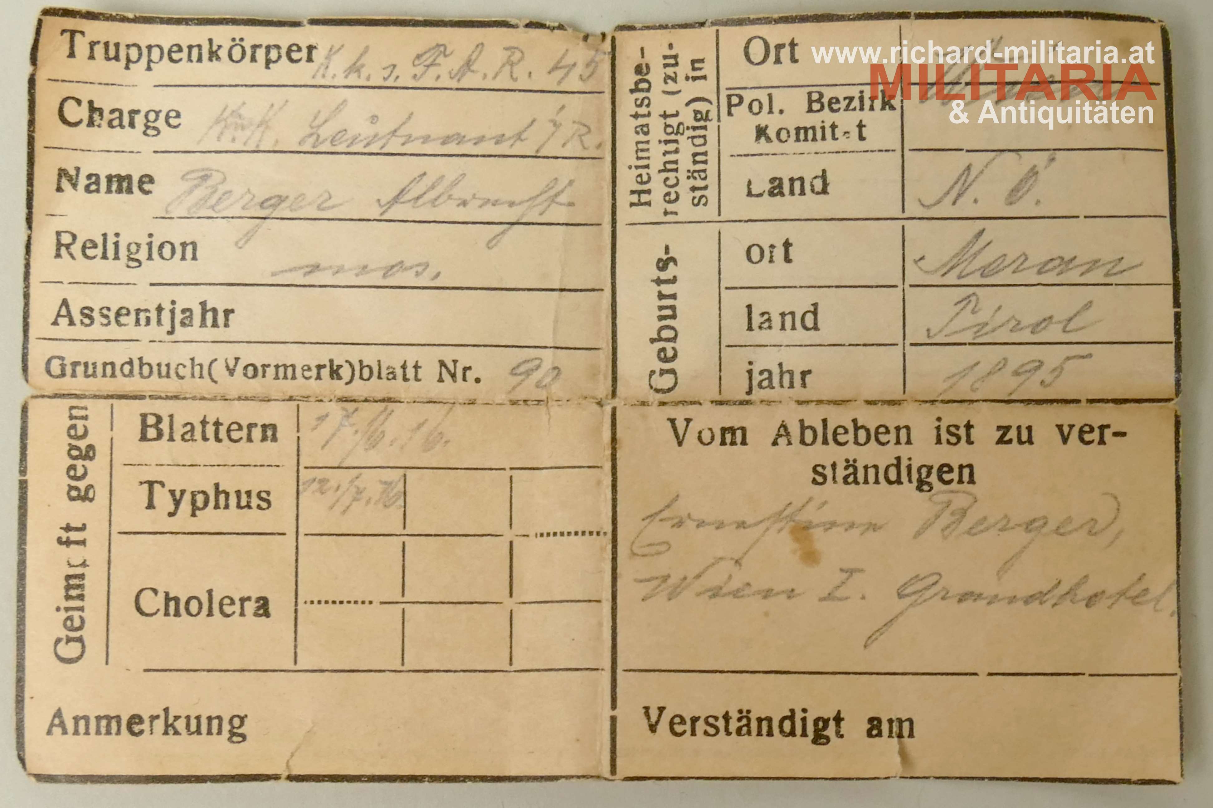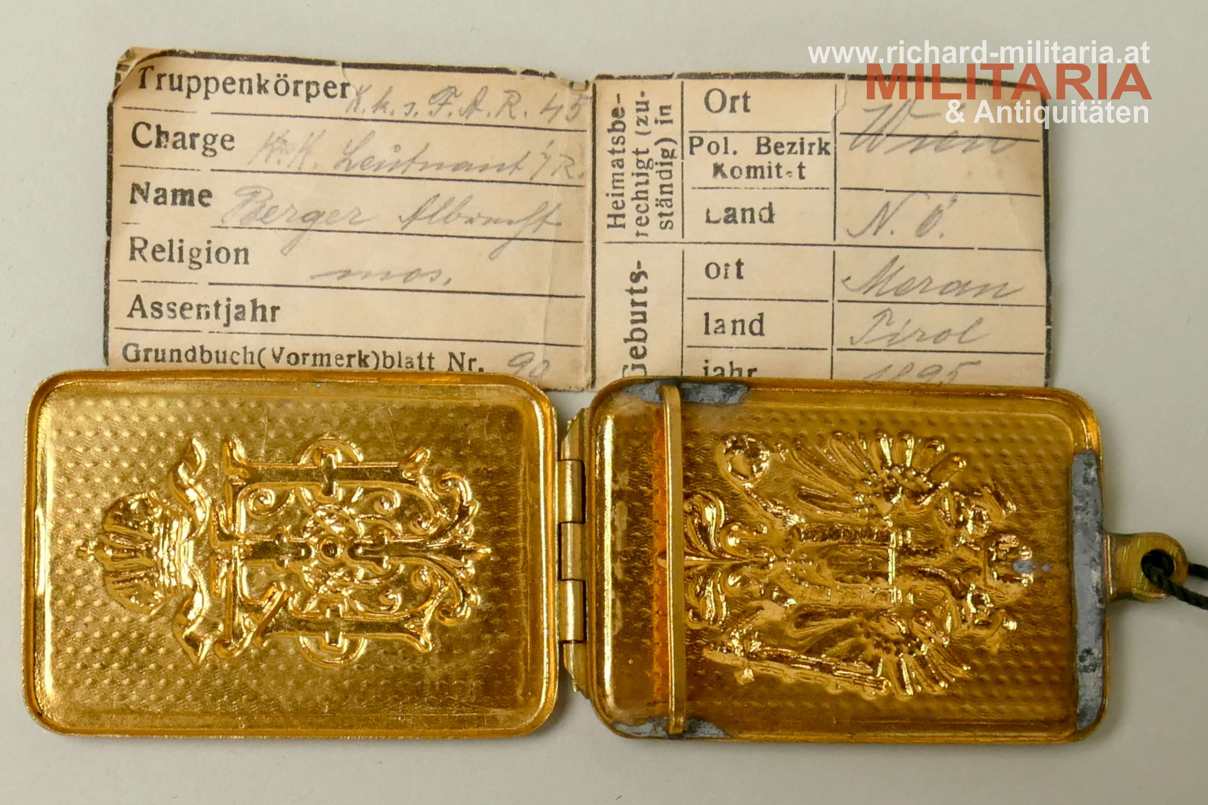 k.u.k. Erkennungsmarke für Offiziere Kaiser Franz Josef für den k.k. Leutnant d. R. BERGER ... - MOSAISCHER (JÜDISCHER) GLAUBE - im k.k. FAR 45; Kapsel aus Tombak mit viel Restvergoldung, eine Innenseite mit Halteklammer, schwarze Trageschnur; EXTREM SELTENES EINLAGEBLATT!!!