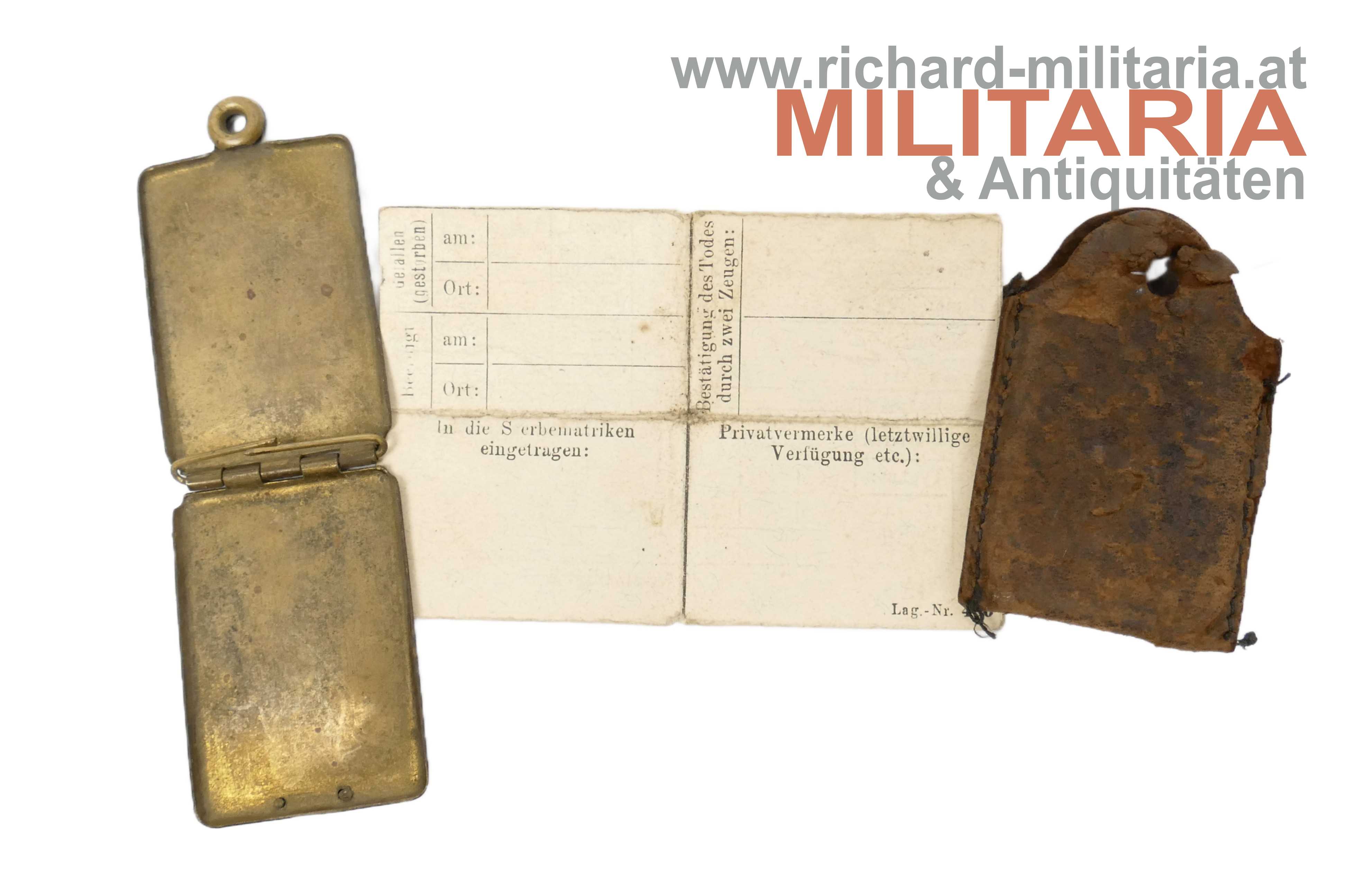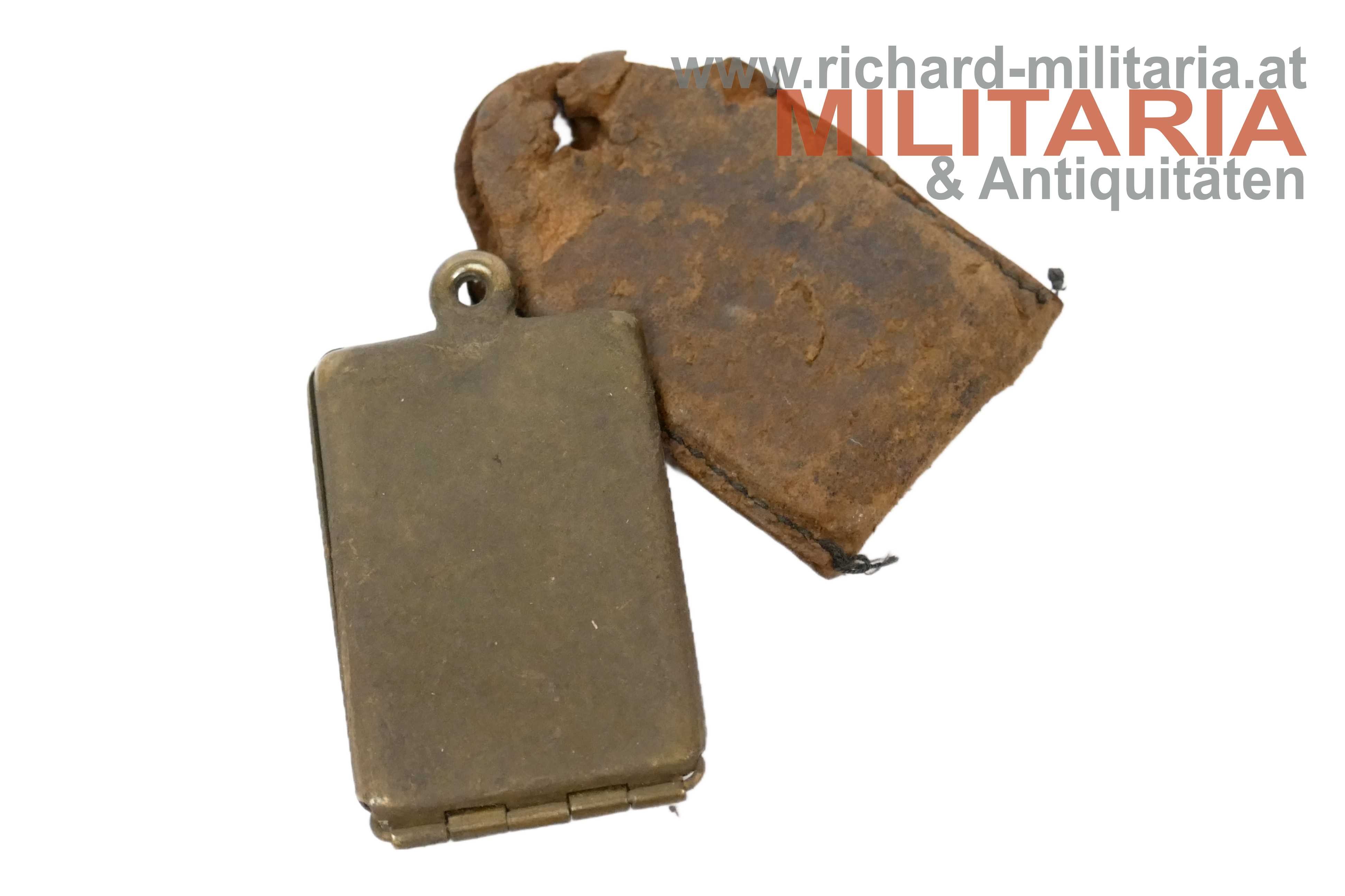k.u.k. Erkennungsmarke des Wilhelm Zojer aus Hermagor (Kärnten); vormals Infanterist bzw. Gefreiter im Infanterie Regiment Nr. 7; dieser Eintrag durchgestrichen und ersetzt durch Korporal und "Art. Kanxxxschule in Wien"; leider nicht eindeutig lesbar; Geburtsjahr 1883; Assentjahr 1904; Messingkapsel angeschmutzt; mit stärker gebrauchter Lederhülle;