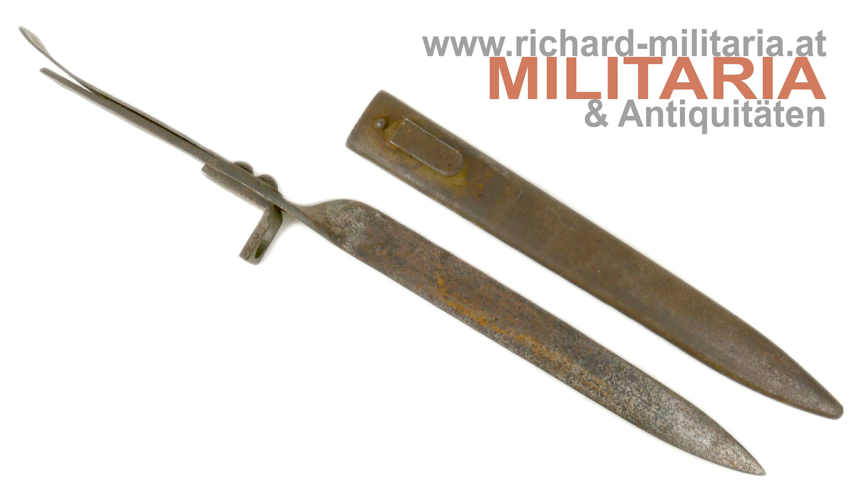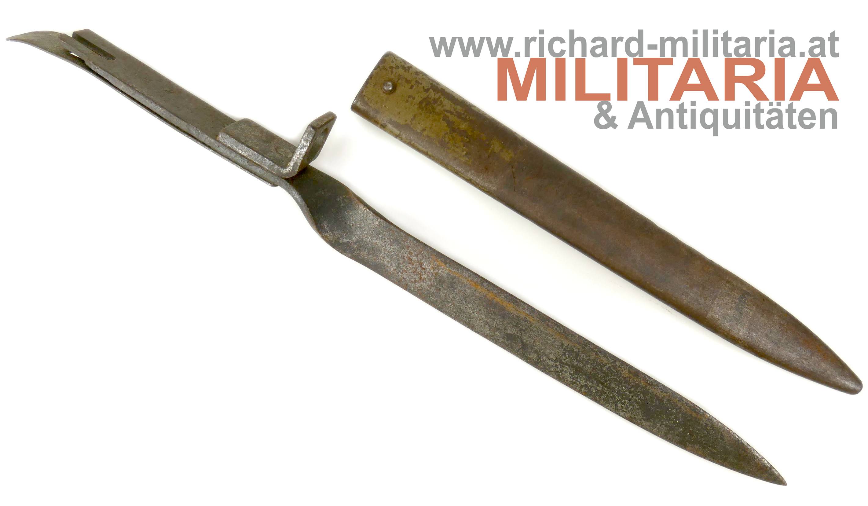 k.u.k. Ersatzbajonett - Notbajonett; gedrehter Flachstahl mit einschneidiger Klinge; Nietung des Griffes erfolgte mit 2 Kugel-Stahlnieten; massives Federblatt; Stempelung "SZ" verlängerten Teil der Klinge (Griffteil); leicht narbig und flugrostig; Laufdurchführung ca. 17mm; originale Scheide ohne Hersteller mit k.u.k. Armeeabnahme - minimale erhaltene originale Farbe im Tragebereich - flugrostig;
