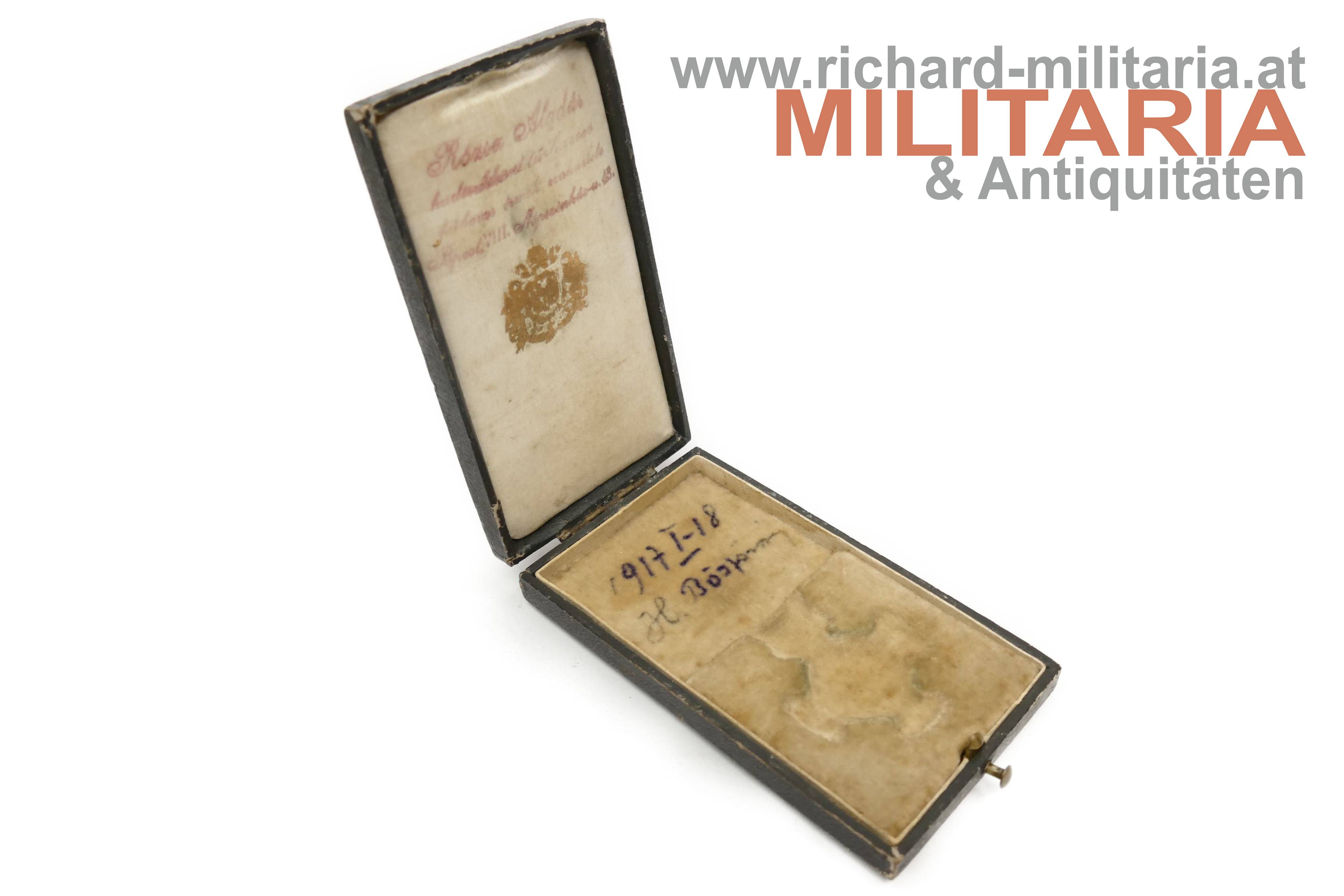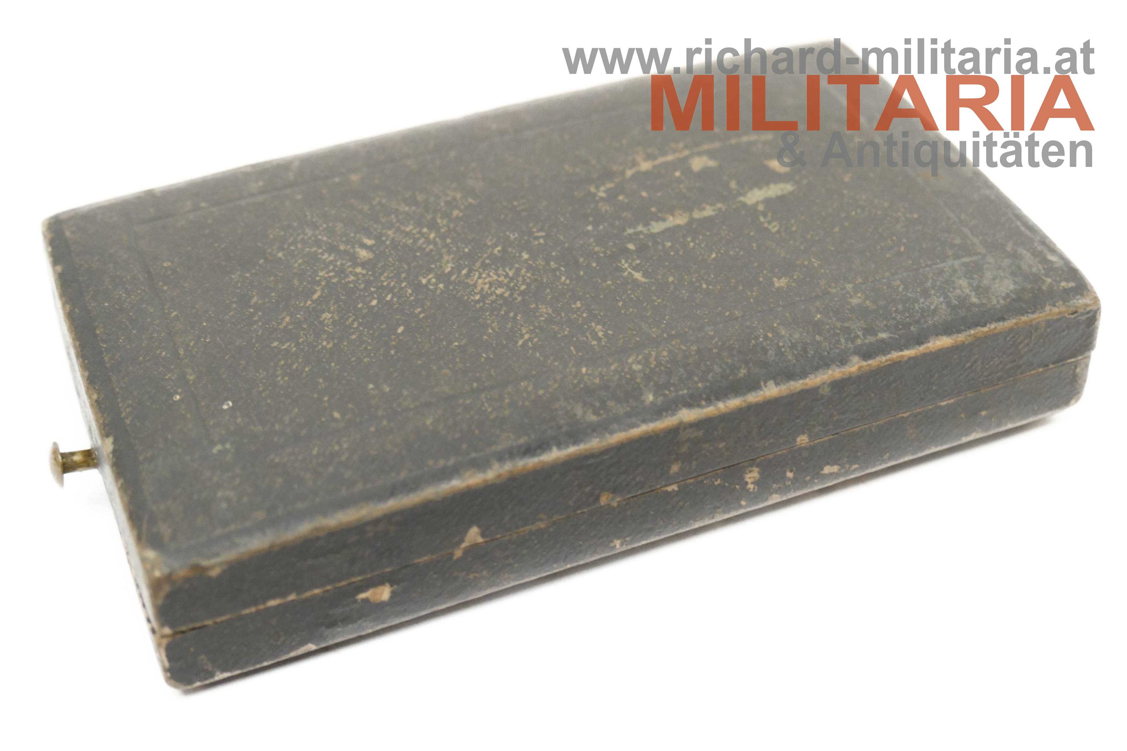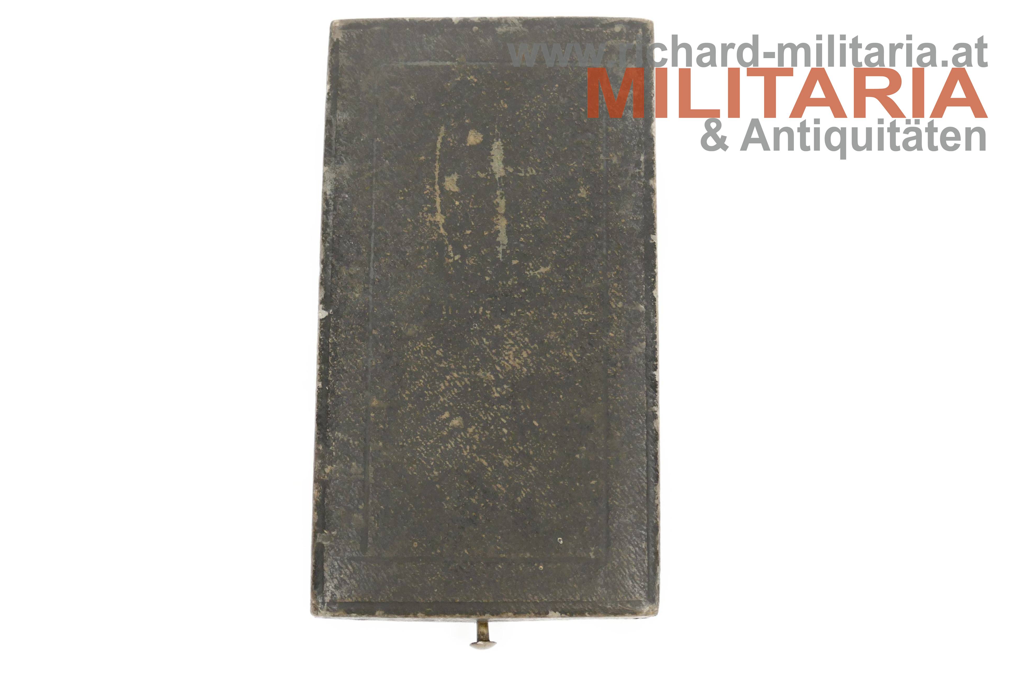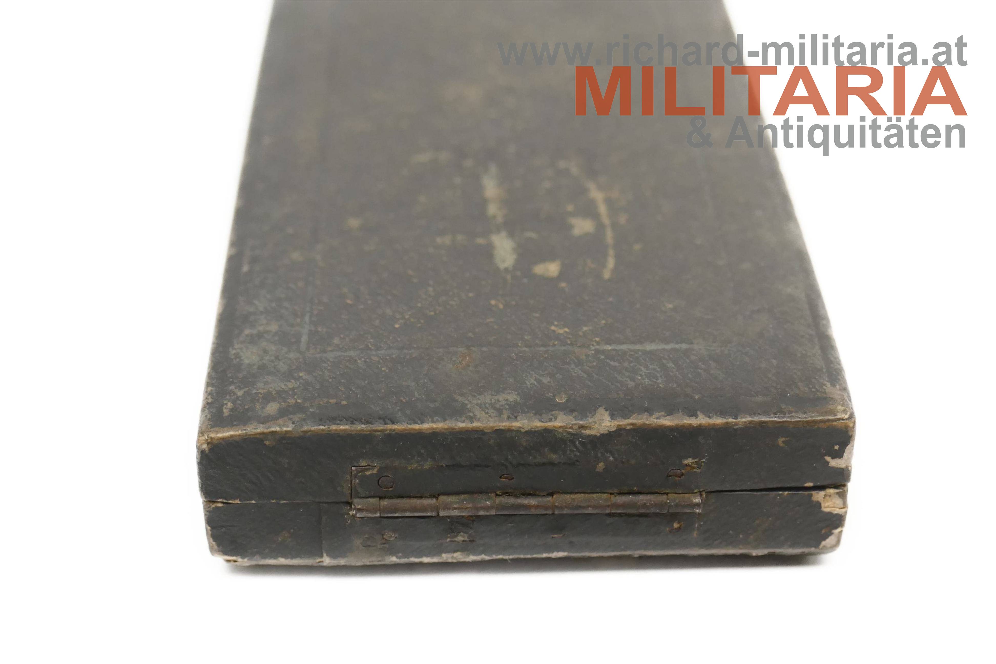 k.u.k. Etui zum Silbernen oder Goldenen Verdienstkreuz mit der Krone; Vergoldung oder Versilberung der Deckelaufschrift komplett vergangen - nur noch der Abdruck zu erkennen; stärkere Alters- und Gebrauchsspuren auf der Außenseite; innen am Deckel sowie auf der Einlage beschriftet; kein Stempel auf der Rückseite erkennbar;