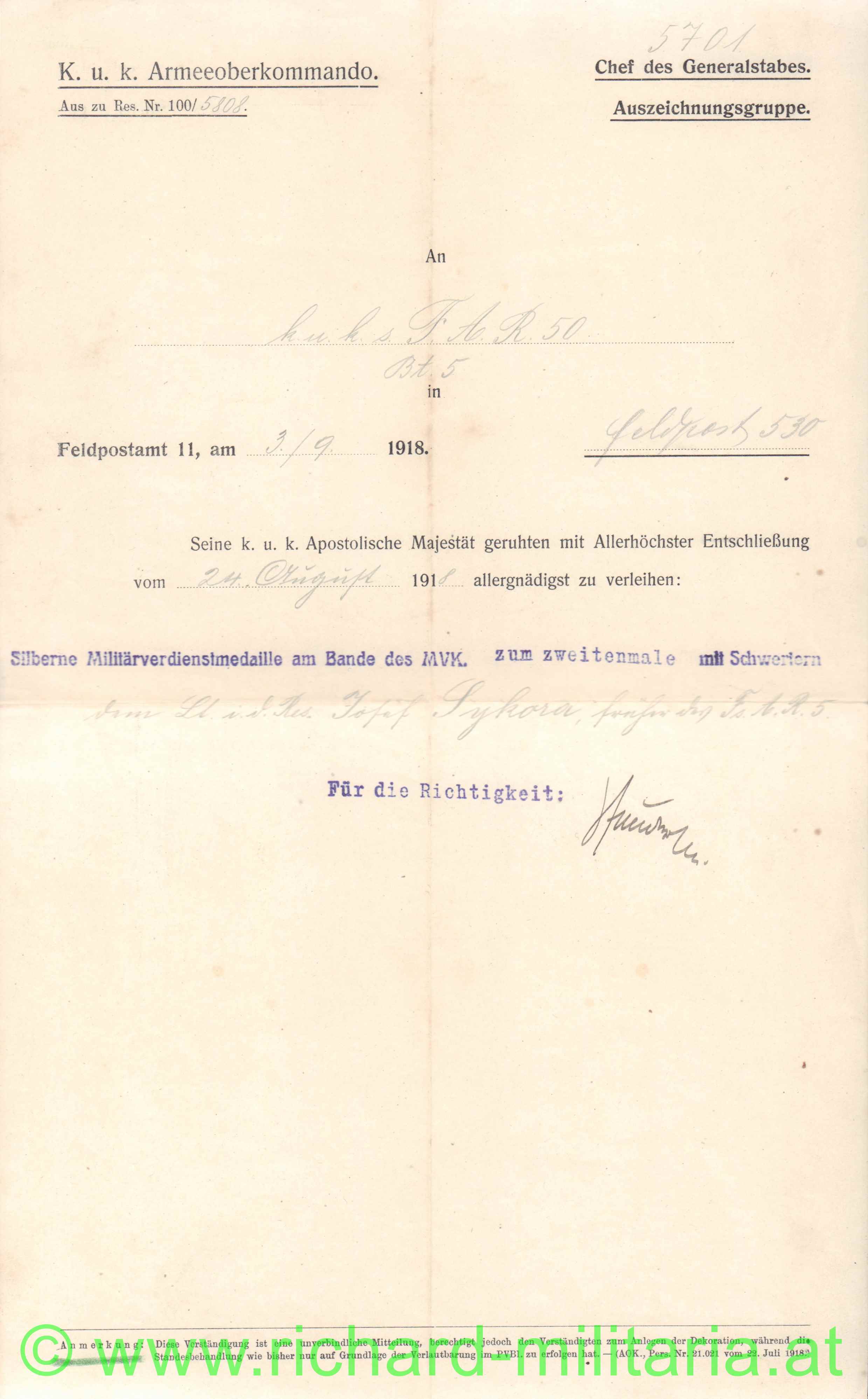 Mitteilung des k.u.k. Armeeoberkommandos / Chef des Generalstabes - Auszeichnungsgruppe an das k.u.k. F.A.R. 50 zur Verleihung der Silbernen Militärverdienstmedaille am Bande des MVK zum zweitenmale mit Schwertern an den Lt. Josef Sykora; 24.8.1918; zweimal gefaltet, 34,5 x 21,5 cm Format; sehr guter Zustand
