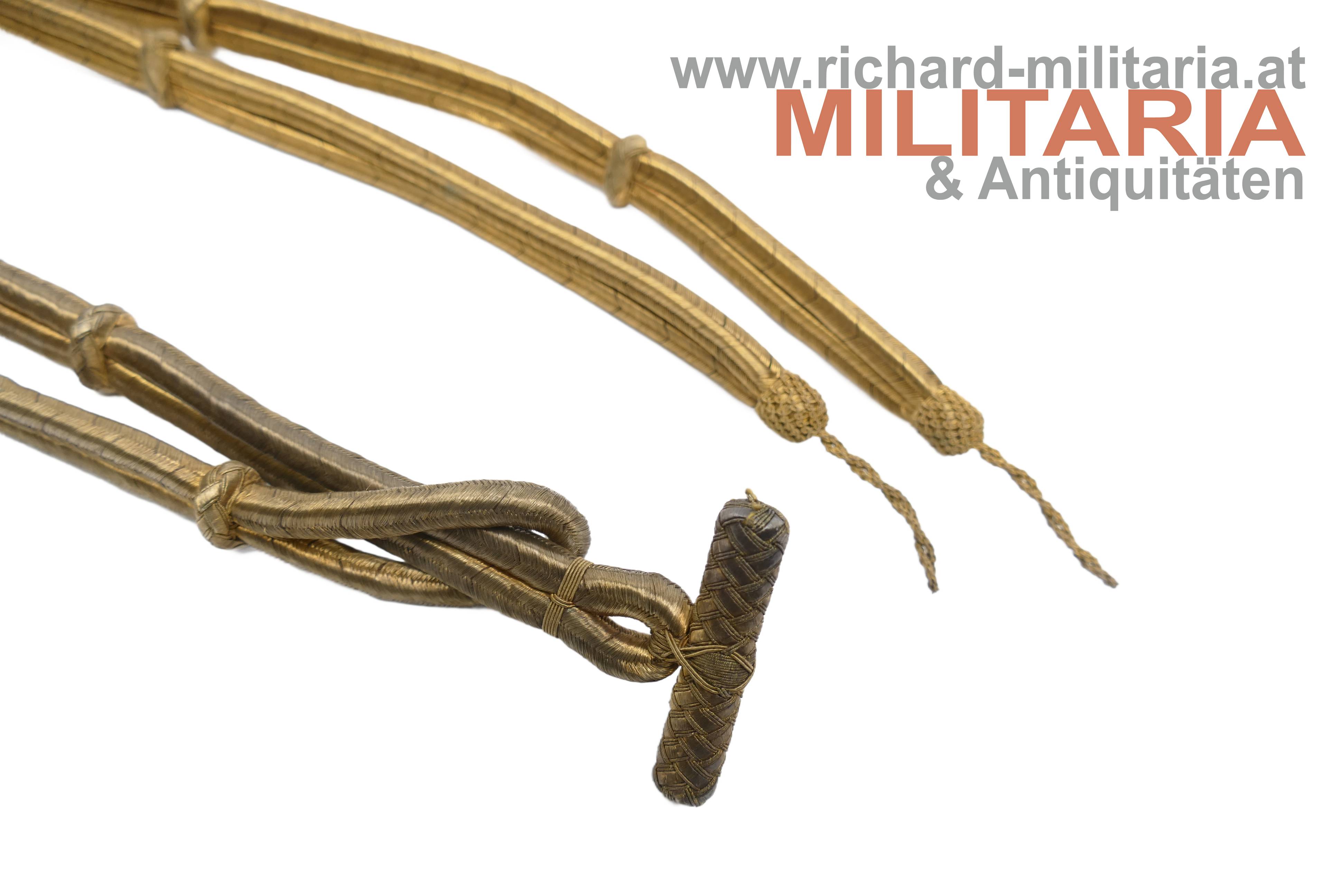 k.u.k. Fangschnur zum Pelzatilla/-ulanka für Offiziere; schwere schwarz geritzte Goldschnurr mit Schubern; im unteren Bereich beide Teile gleichartig gedunkelt; augenscheinlich von getragener Unifrom abgetrennt;