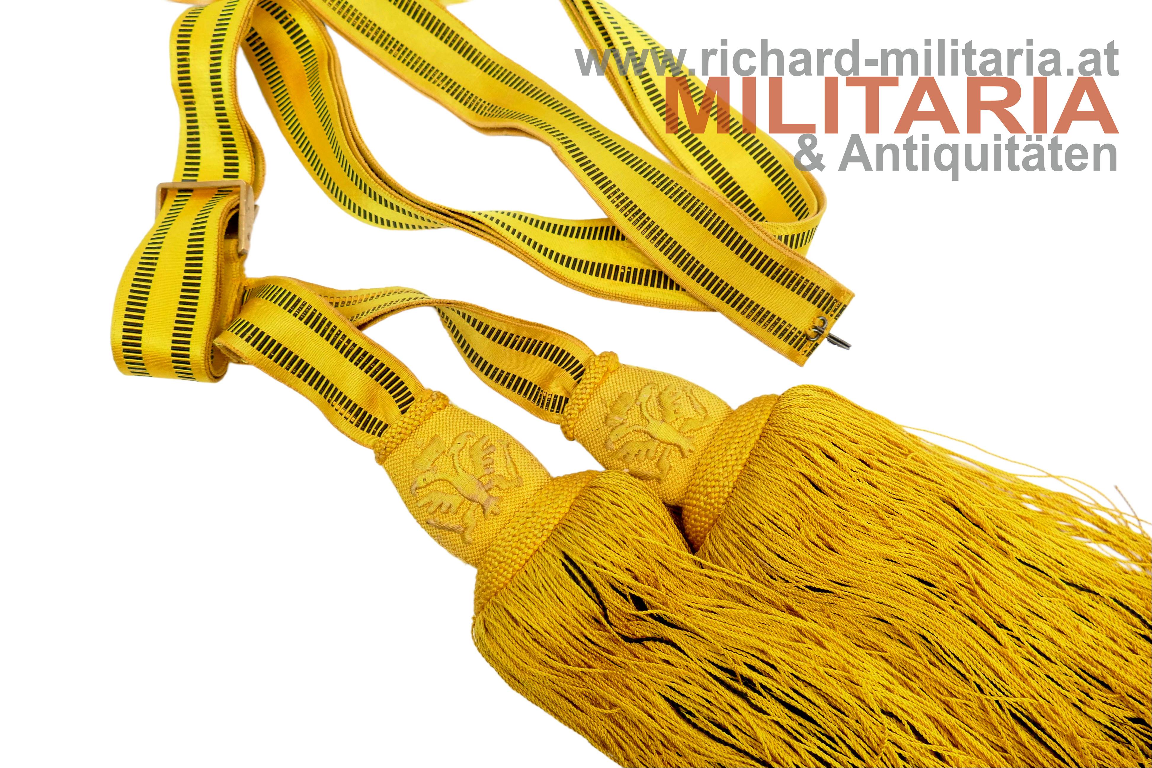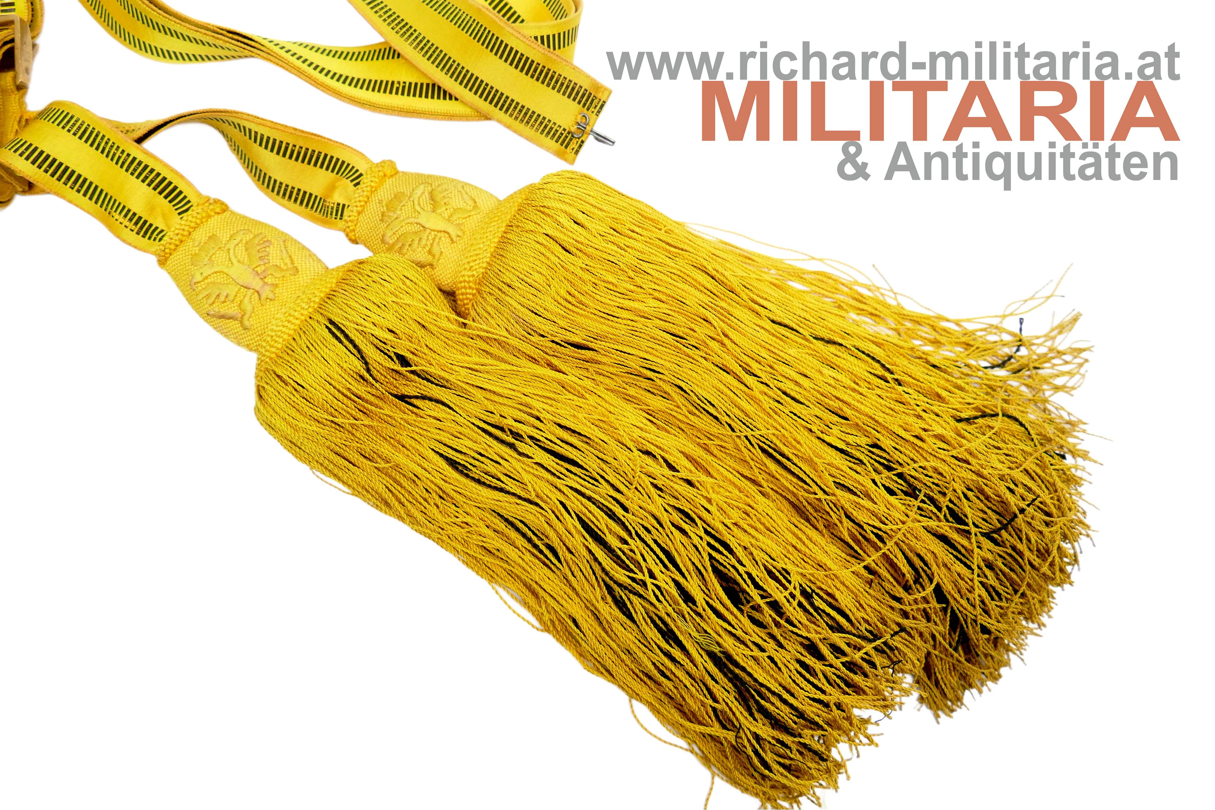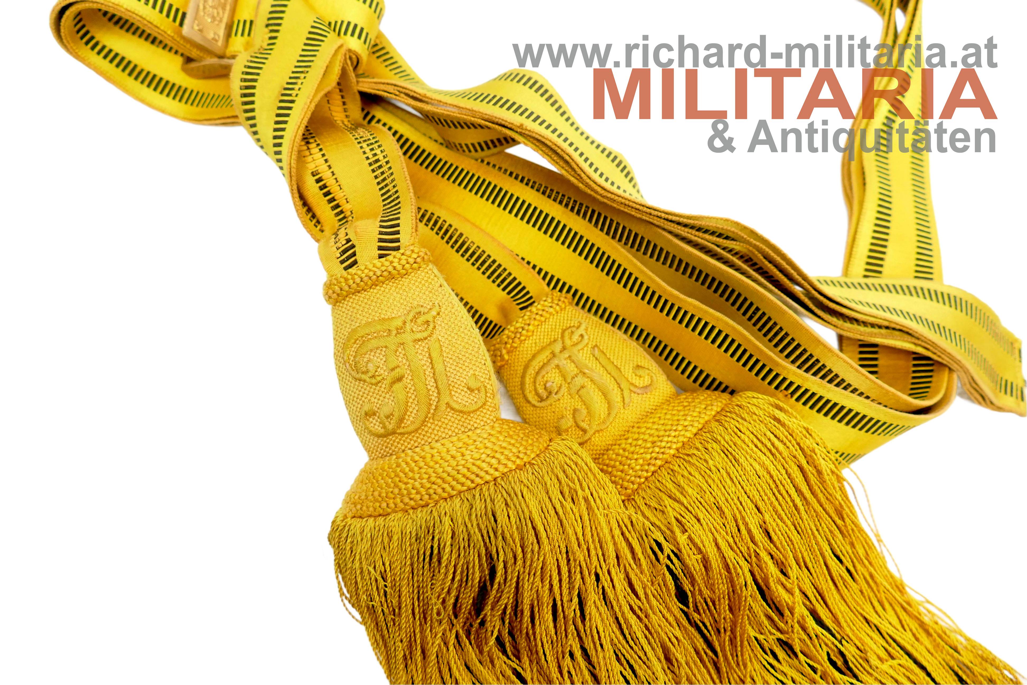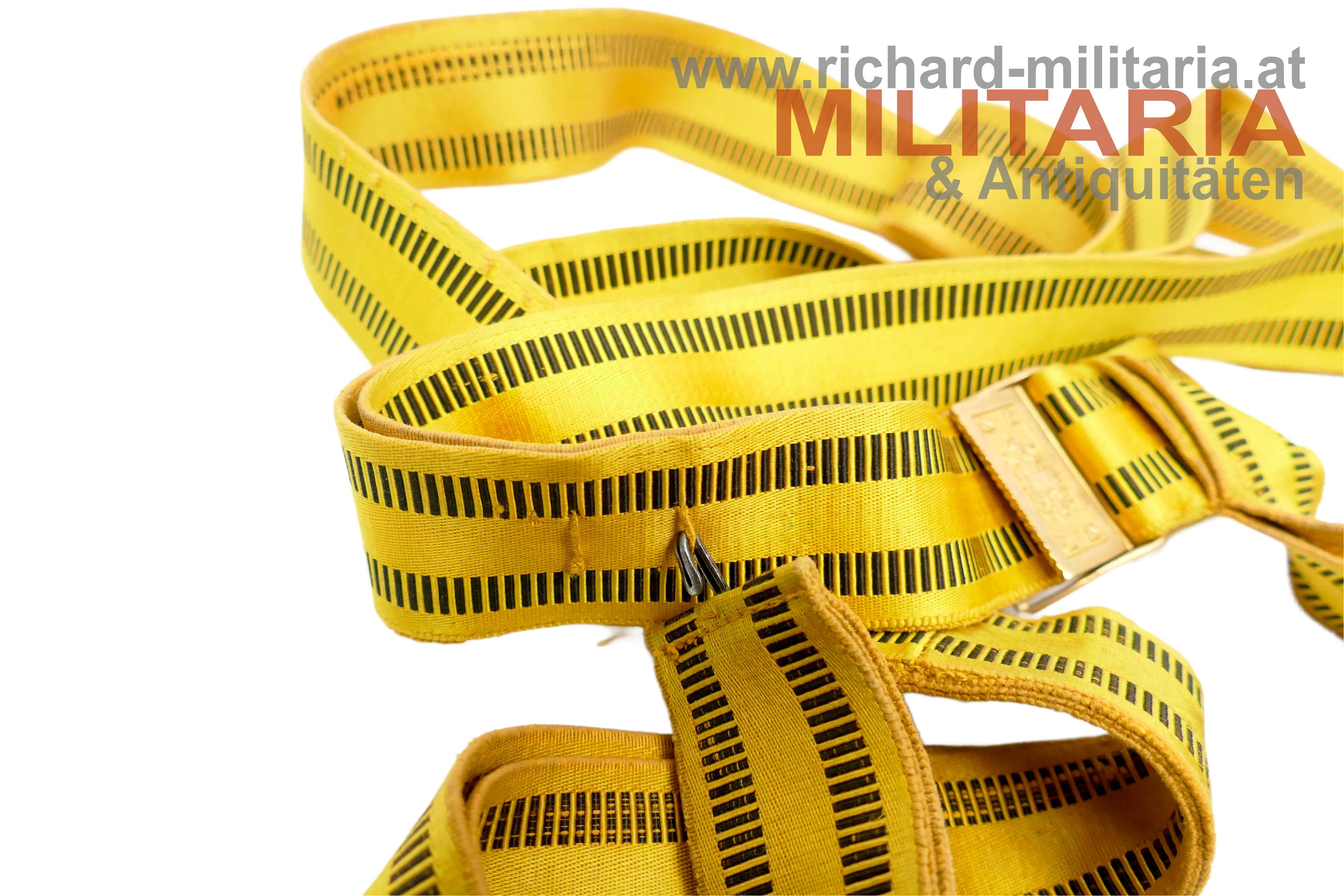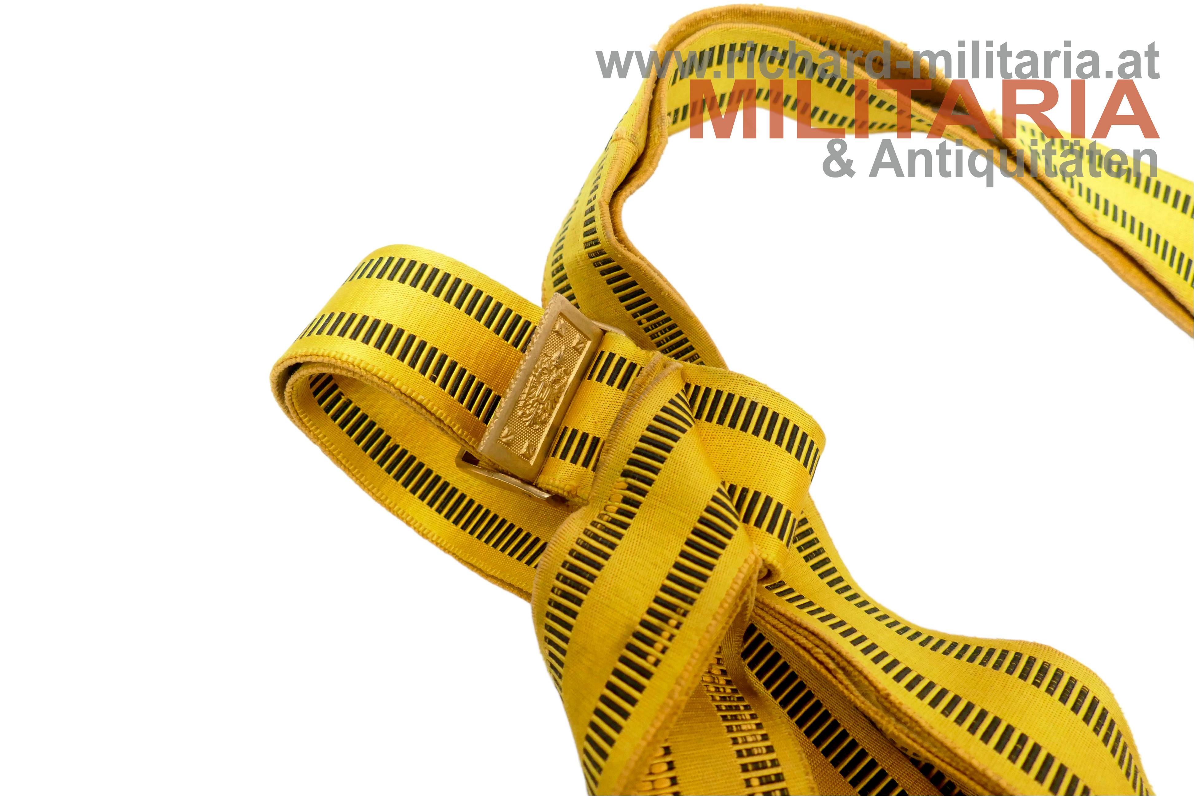 k.u.k. Feldbinde für Offiziere - Kaiser Franz Josef; Band aus kaisergelber Wolle mit 2 schwarzen Mittelstreifen; vergoldete Messingschliesse mit Doppeladler; leichtere Abnutzungs- und Gebrauchsspuren; originaler EInhängehaken und aufgenähte Stoffschlaufe am Band vorhanden;