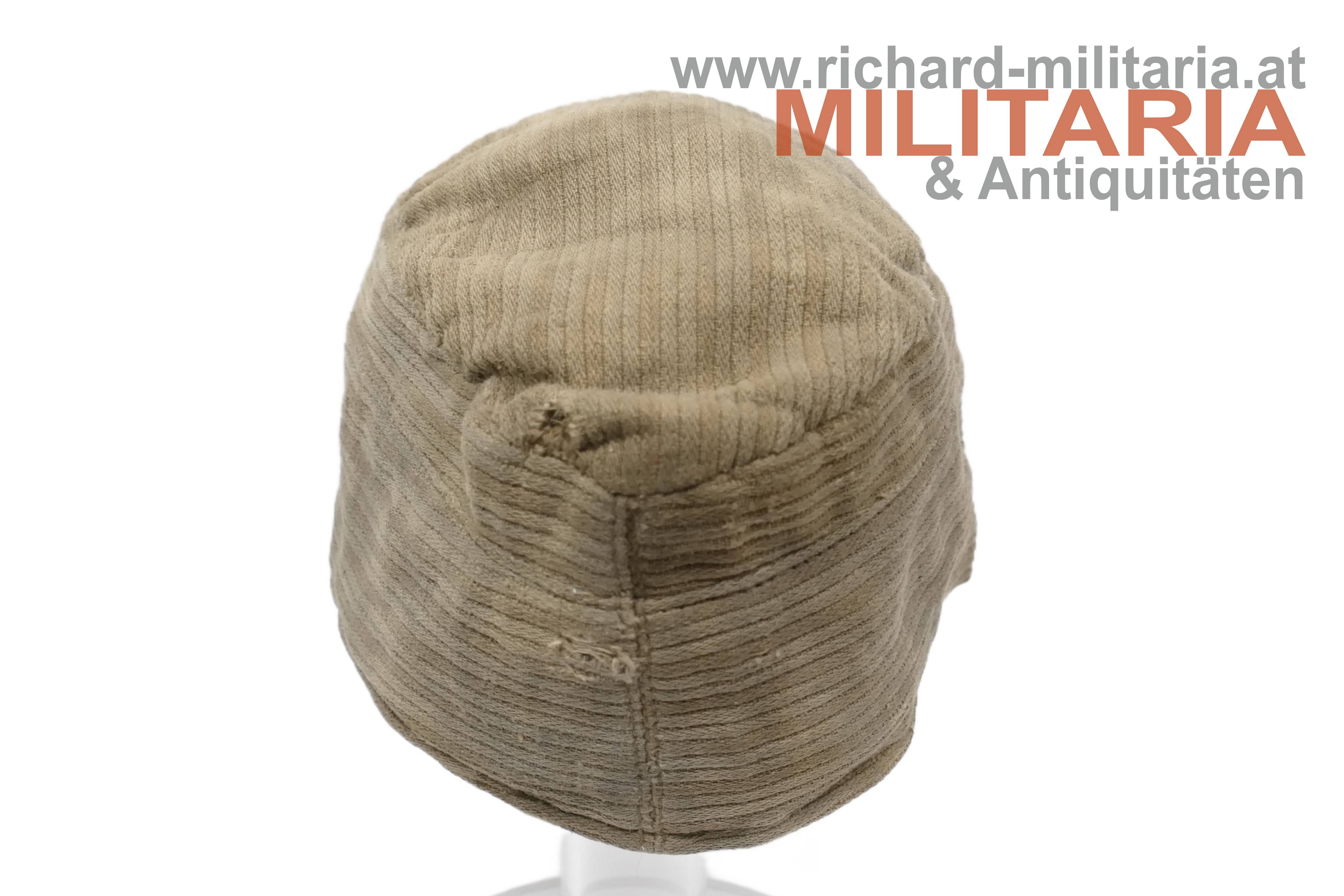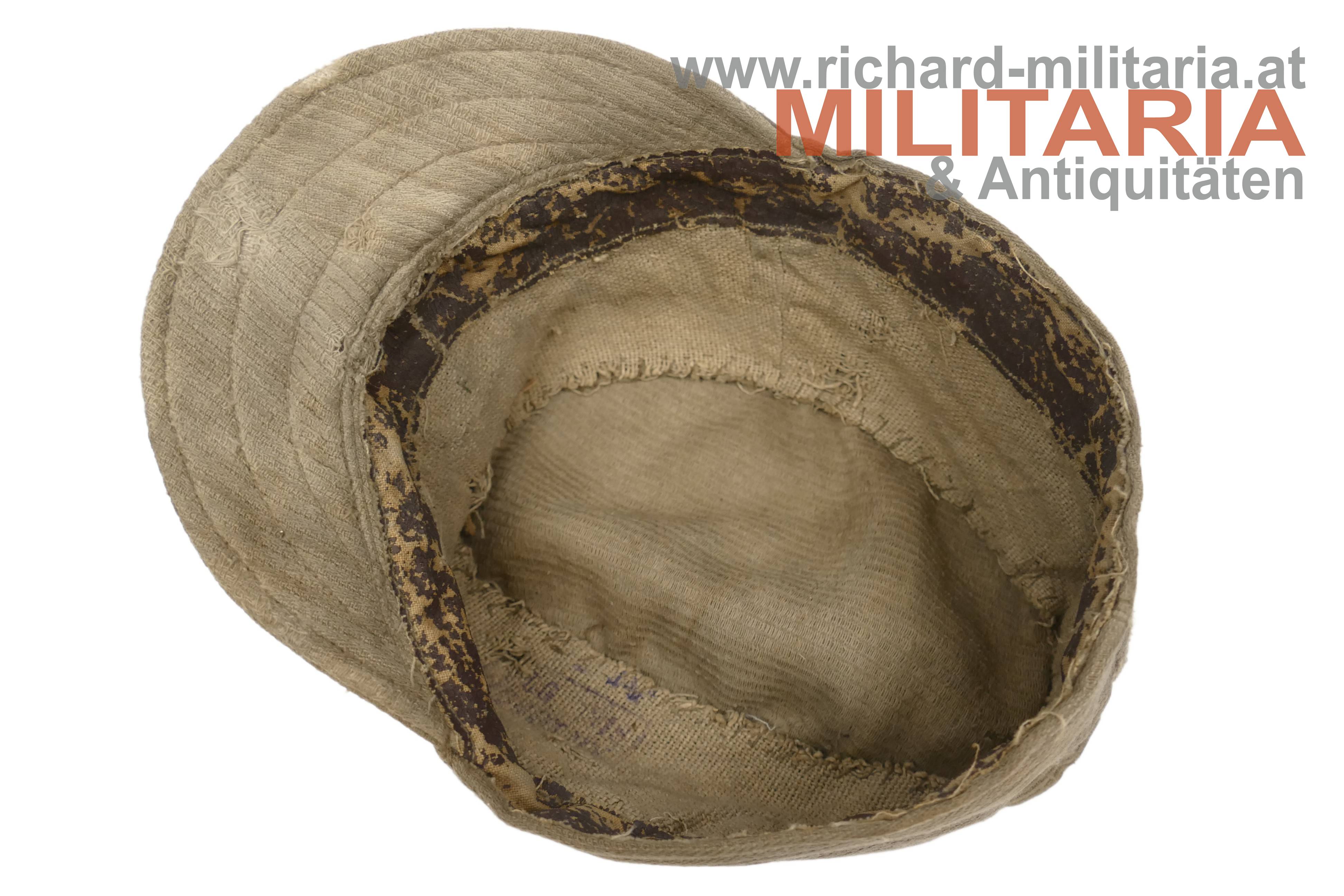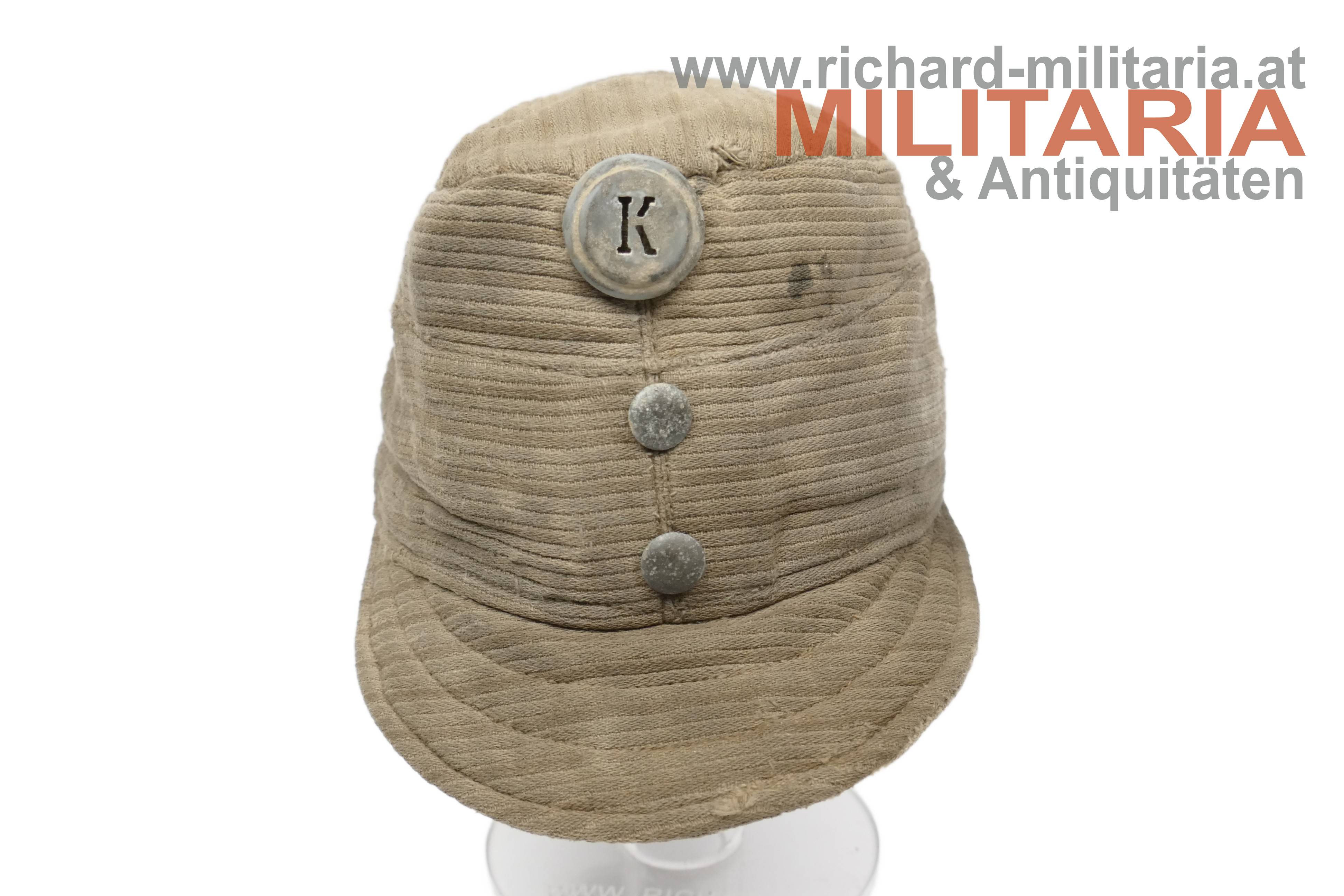 k.u.k. feldgraue Kappe für Mannschaften M1916 - sehr späte Kriegsfertigung; grober feldgrauer Kordstoff; graue Eisenknöpfe und darüber eine Mannschaftskappenkokarde bereits in der Ausführung für Kaiser Karl; die Kokarde ebenfalls aus Eisen; der Nackenschutz der Kappe wird nur noch über den Verlauf der Naht angedeutet; der Kappenschirm besteht aus dem gleichen groben Kordstoff; dünnes braunes Stirnleder teilweise abgeblättert; innen seitlich mit beigem groben Stoff verstärkt; darauf ein undeutlicher Stempel (vermutlich mit der Jahreszahl 1918); leichtere Aufrauungen, zeitgenössisch ausgebesserte Stellen und etwas angeschmutzt, jedoch ohne Mottenschäden; deutliche Tragespuren!