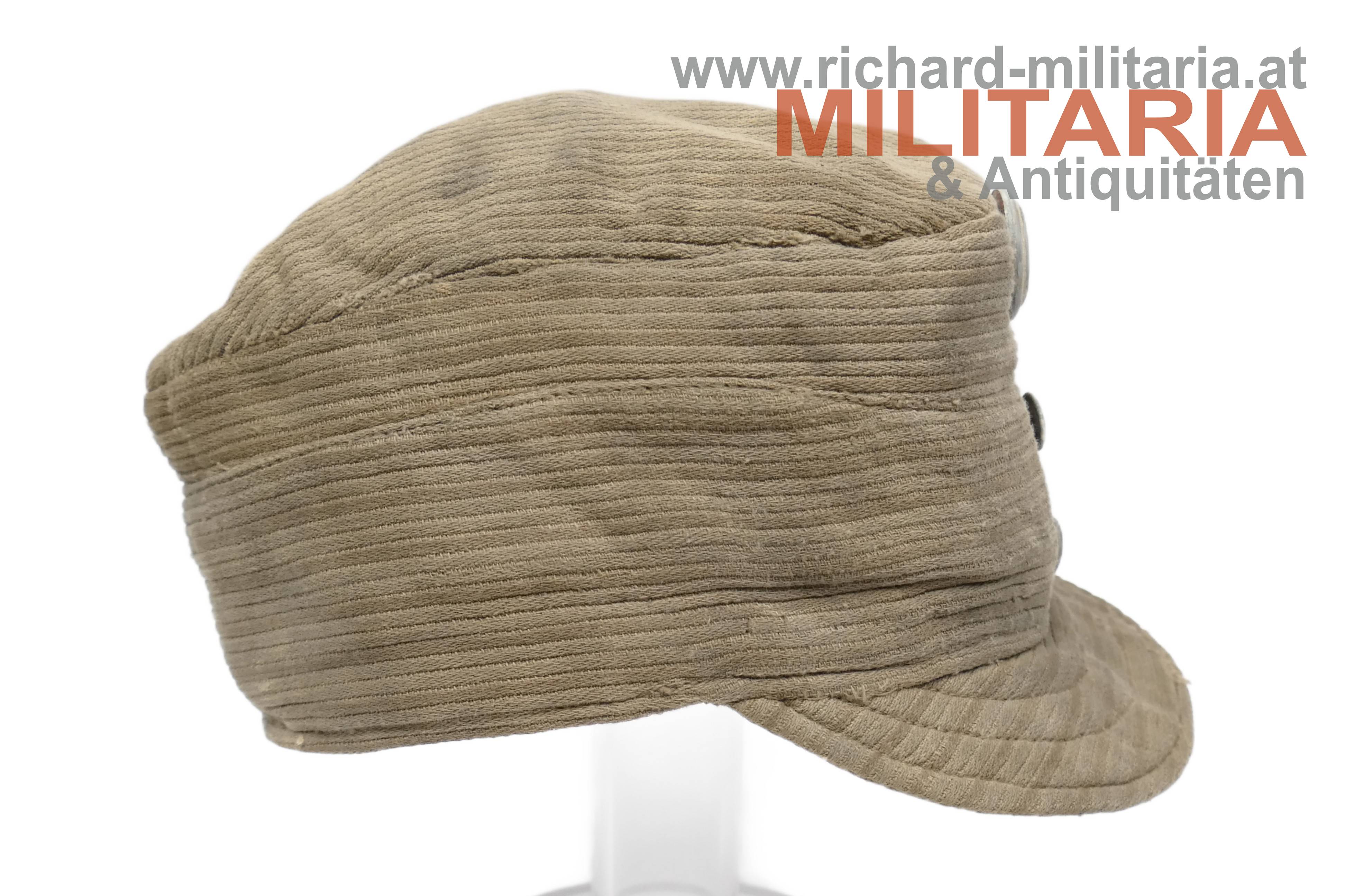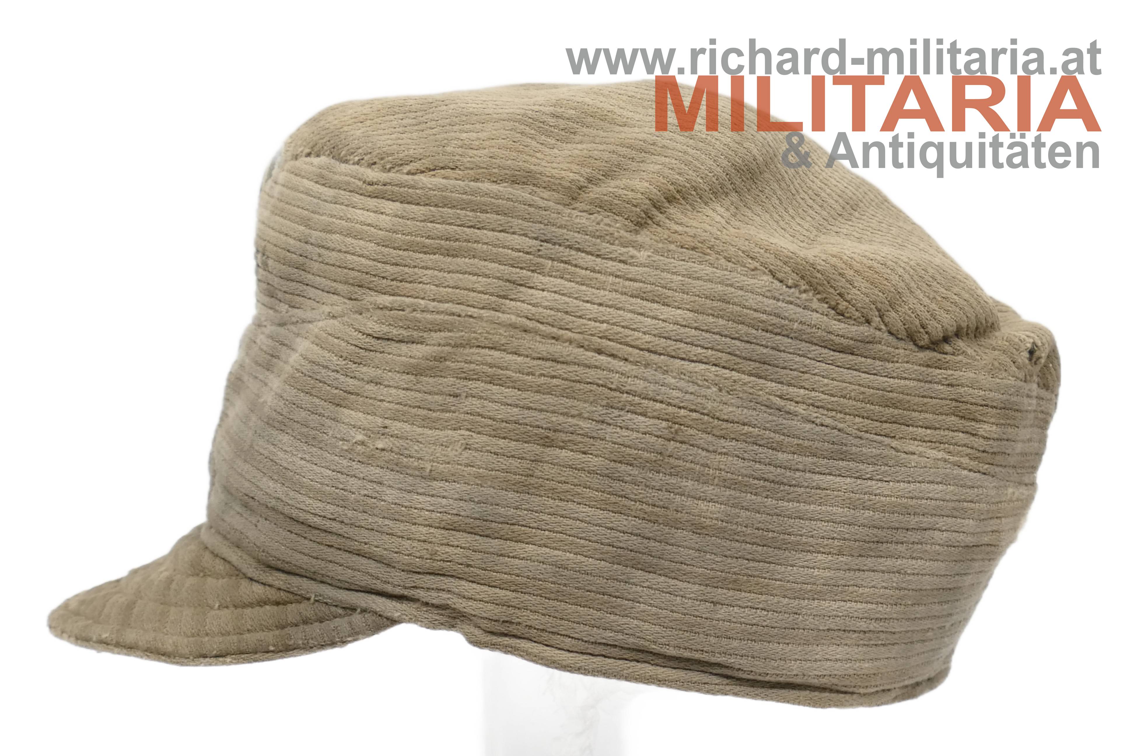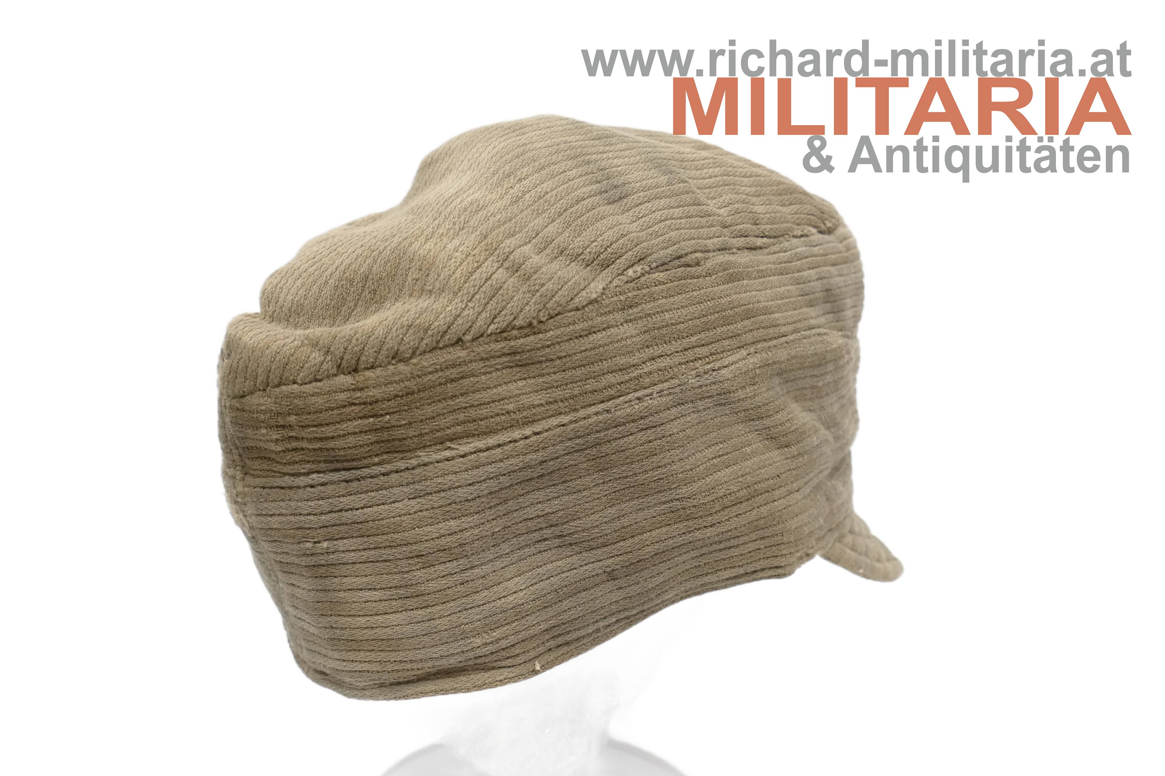 k.u.k. feldgraue Kappe für Mannschaften M1916 - sehr späte Kriegsfertigung; grober feldgrauer Kordstoff; graue Eisenknöpfe und darüber eine Mannschaftskappenkokarde bereits in der Ausführung für Kaiser Karl; die Kokarde ebenfalls aus Eisen; der Nackenschutz der Kappe wird nur noch über den Verlauf der Naht angedeutet; der Kappenschirm besteht aus dem gleichen groben Kordstoff; dünnes braunes Stirnleder teilweise abgeblättert; innen seitlich mit beigem groben Stoff verstärkt; darauf ein undeutlicher Stempel (vermutlich mit der Jahreszahl 1918); leichtere Aufrauungen, zeitgenössisch ausgebesserte Stellen und etwas angeschmutzt, jedoch ohne Mottenschäden; deutliche Tragespuren!
