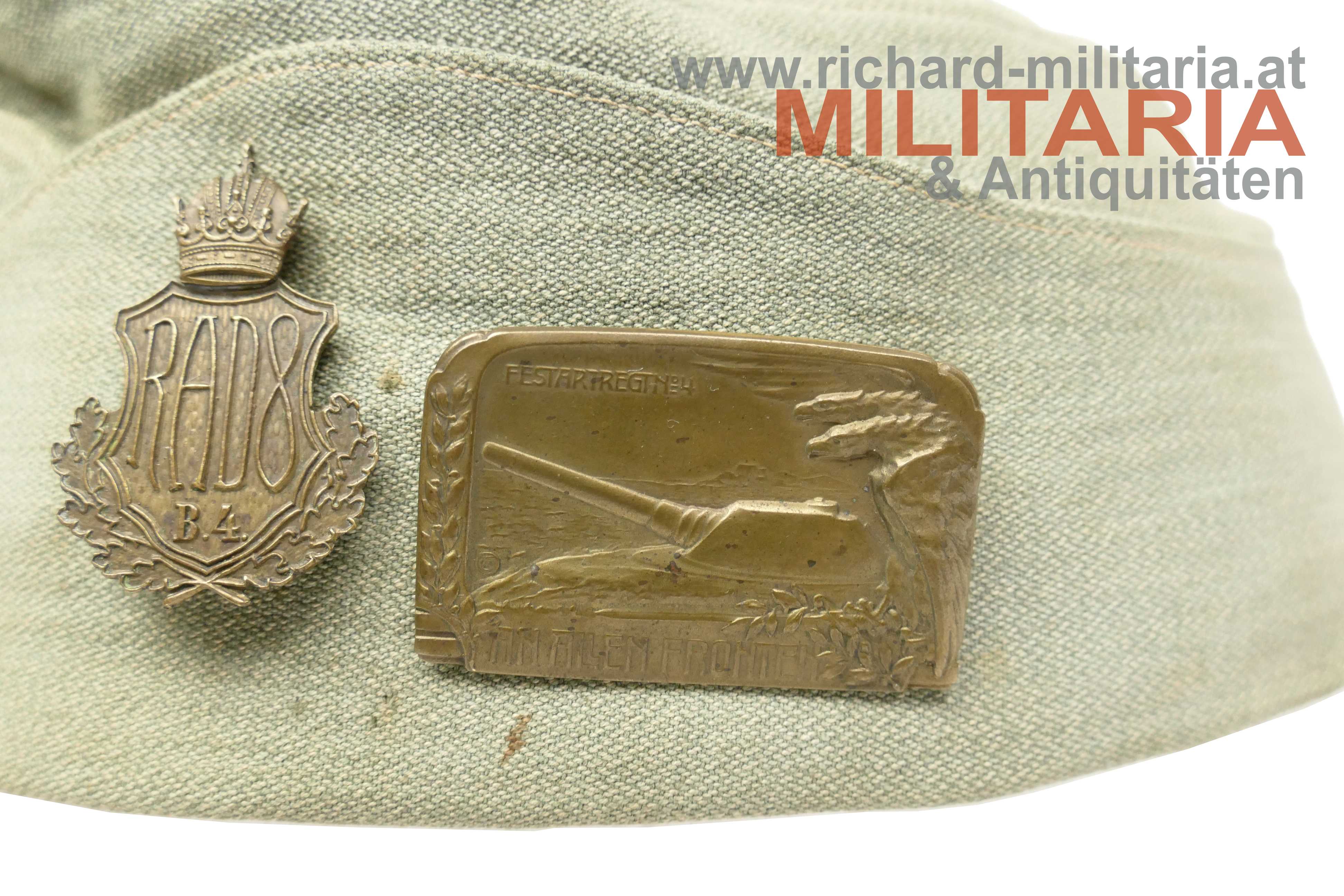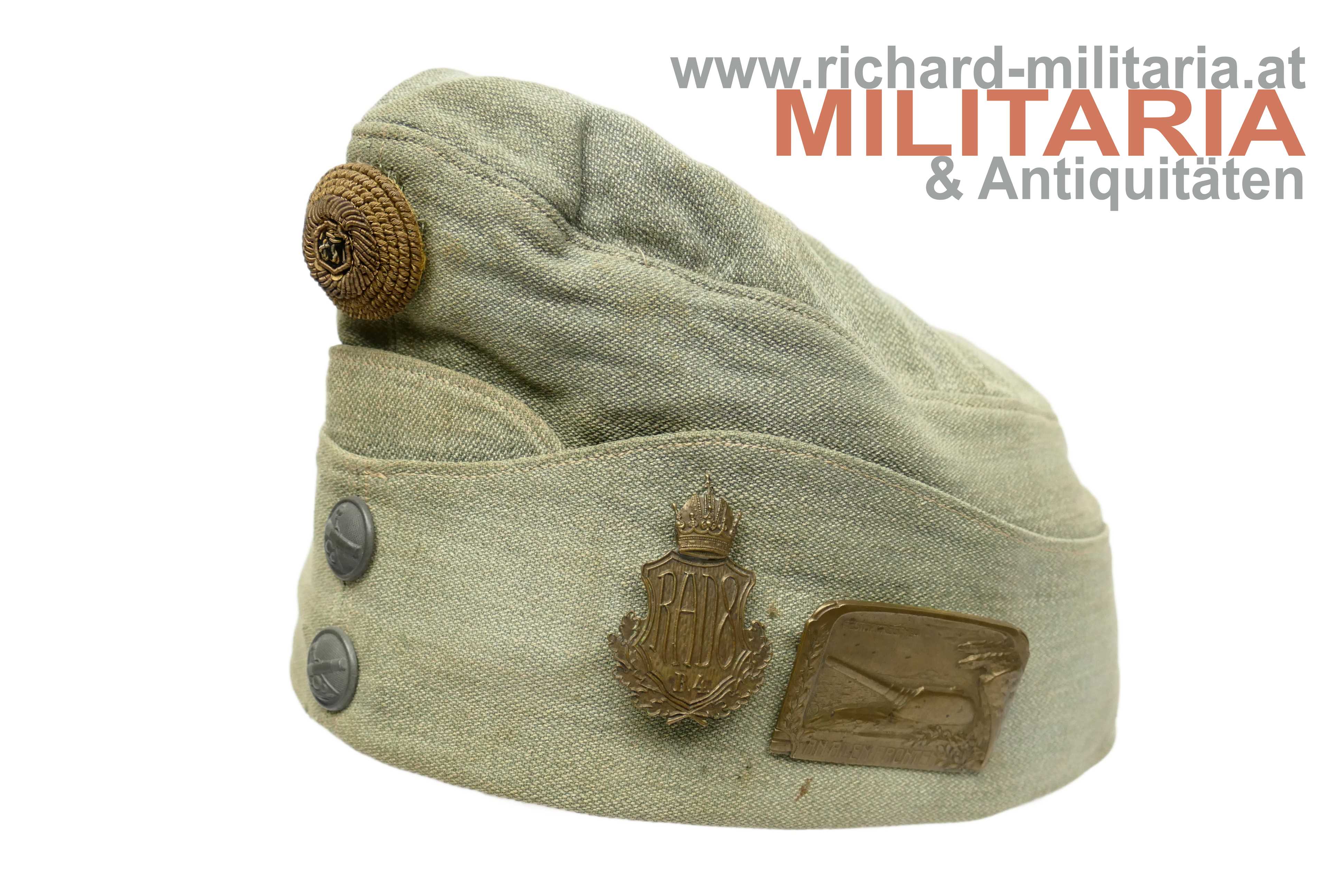 k.u.k. feldgraue schirmlose Kappe für einen Artillerie-Offizier; grüner feiner Baumwollstoff; vorne mittig zwei Artillerie-Knöpfe aus Zink; darüber eine Offiziers-Kokarde noch in der Ausführung für Kaiser Franz Josef; auf der linken Seite zwei aufgesteckte Kappenabzeichen (4. Batterie der Reitenden Artilleriedivision Nr. 8 & Festungsartillerieregiment Nr. 4 "An Allen Fronten"); beide Kappenabzeichen aus Tombak mit originalem Nadelsystem; Kappe ohne Stirnleder; innen mit feinem beigen Leinenstoff ausgelegt; stark verblasst kann man eine händische Beschriftung erkennen;