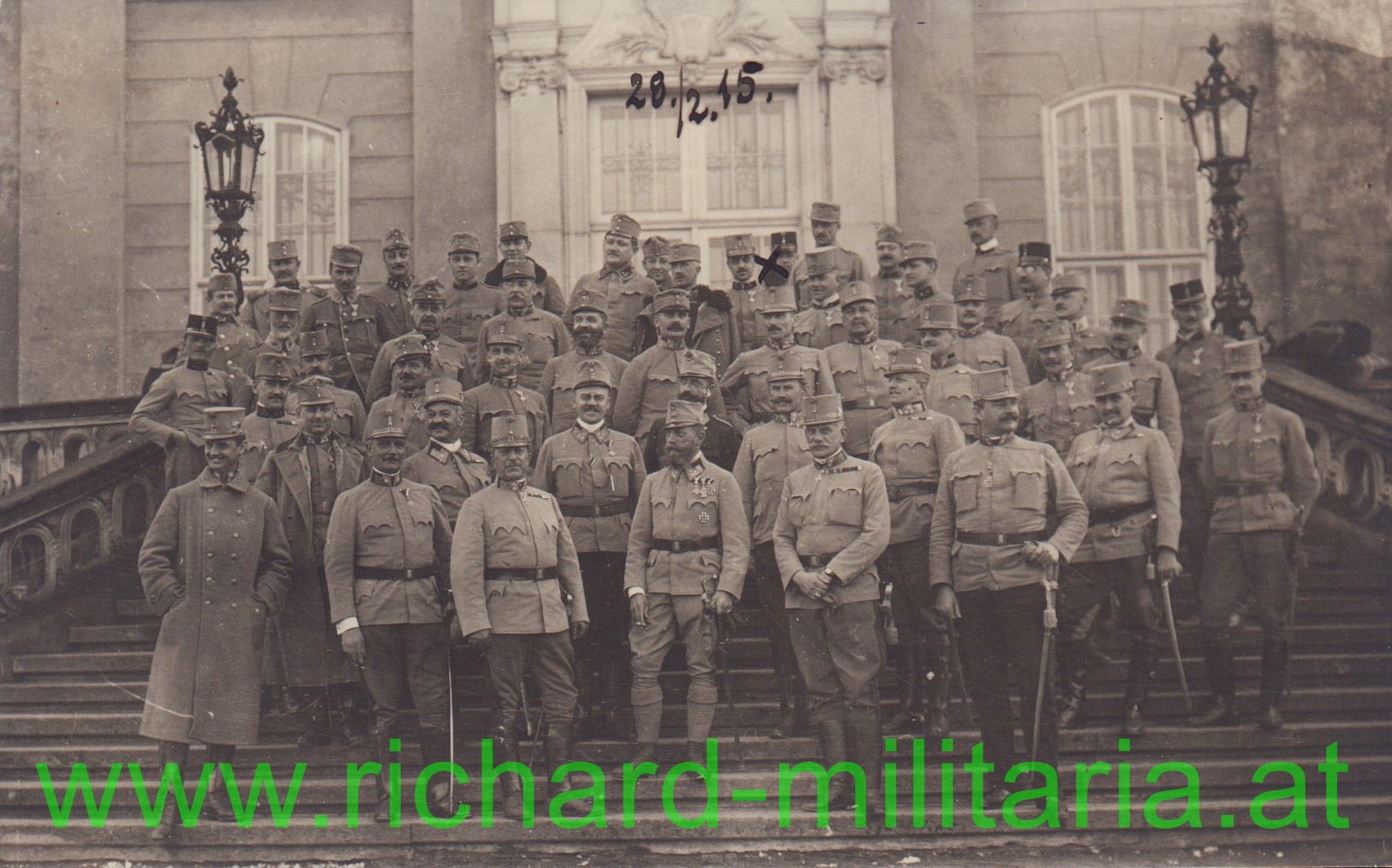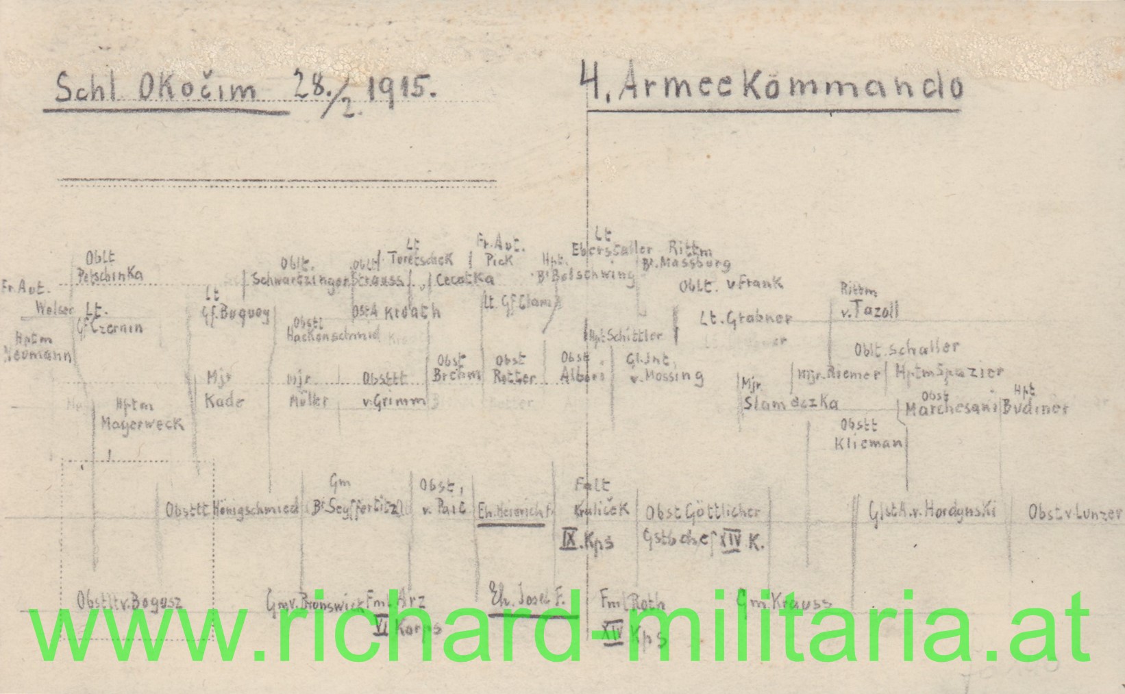Generäle und Offiziere des 4. Armeekommandos vor Schloss Okocim, 28.2.1915; auf der Rückseite sind alle Soldatennamen aufgeführt!