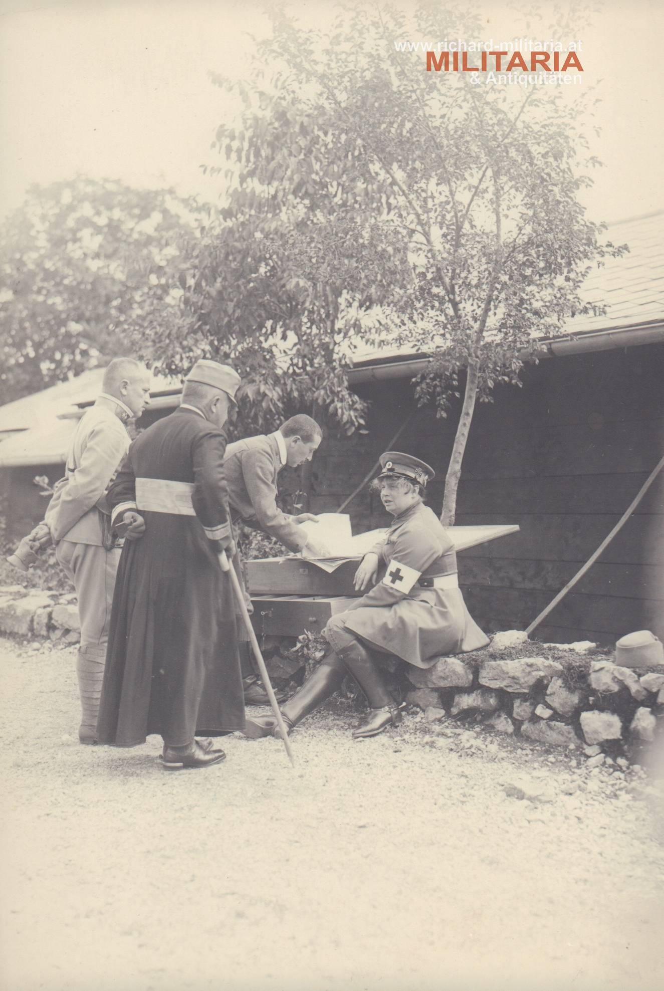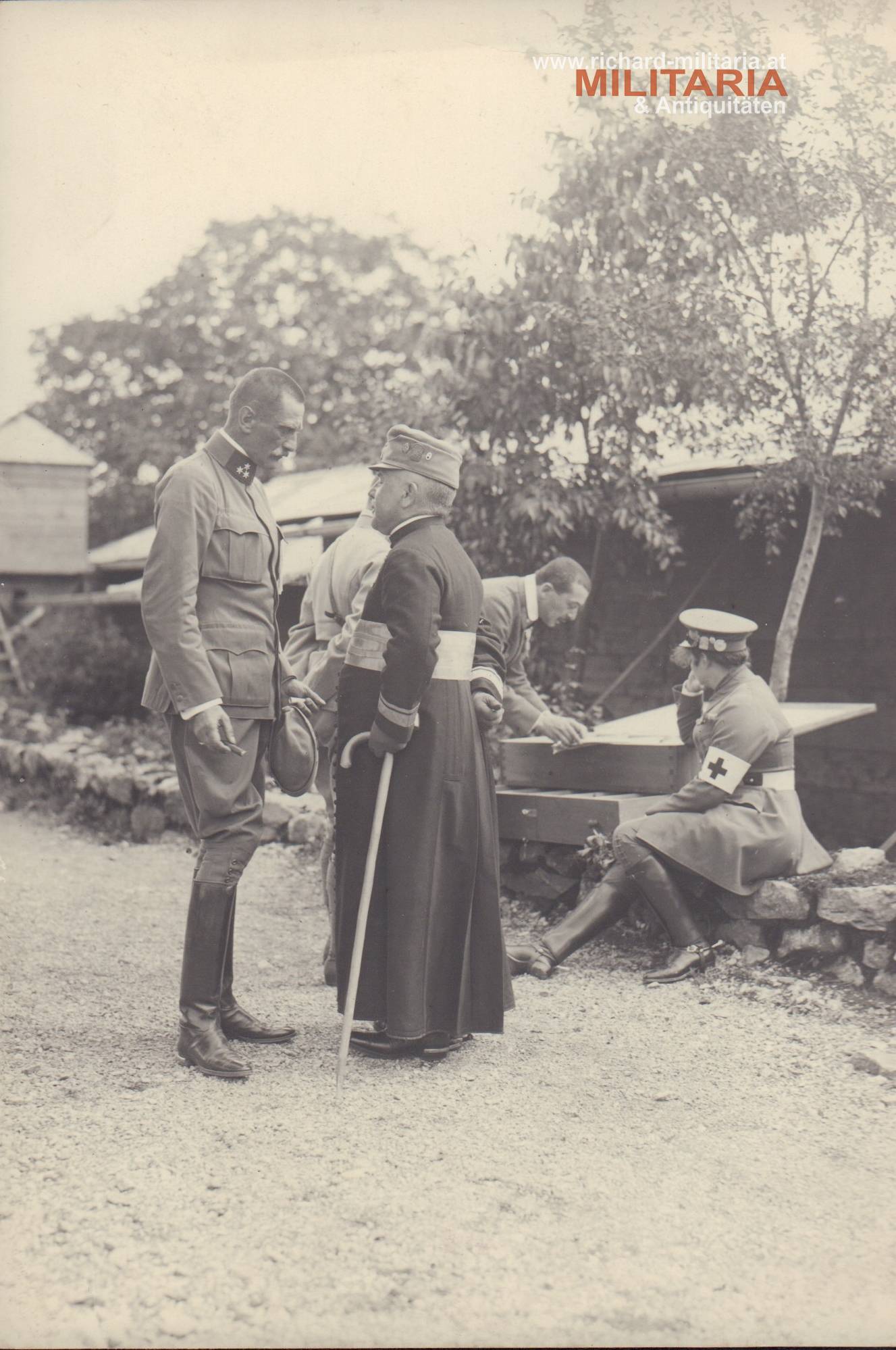 k.u.k. Foto eines Feldkuraten mit einem Hauptmann und einer Frau vom Rot-Kreuz Hilfsdienst; Feldkurat mit 3 Kappenabzeichen (Isonzo Armee 1915, ein Rot Kreuz Abzeichen und das dritte nicht definierbar); die Frau mit der Feldkappe des Roten Kreuzes - ebenfalls das Kappenabzeichen Isonzo Armee 1915 und das patriotische Abzeichen "Den Kriegern Steiermarks" (!); im Hintergrund ein Fähnrich;