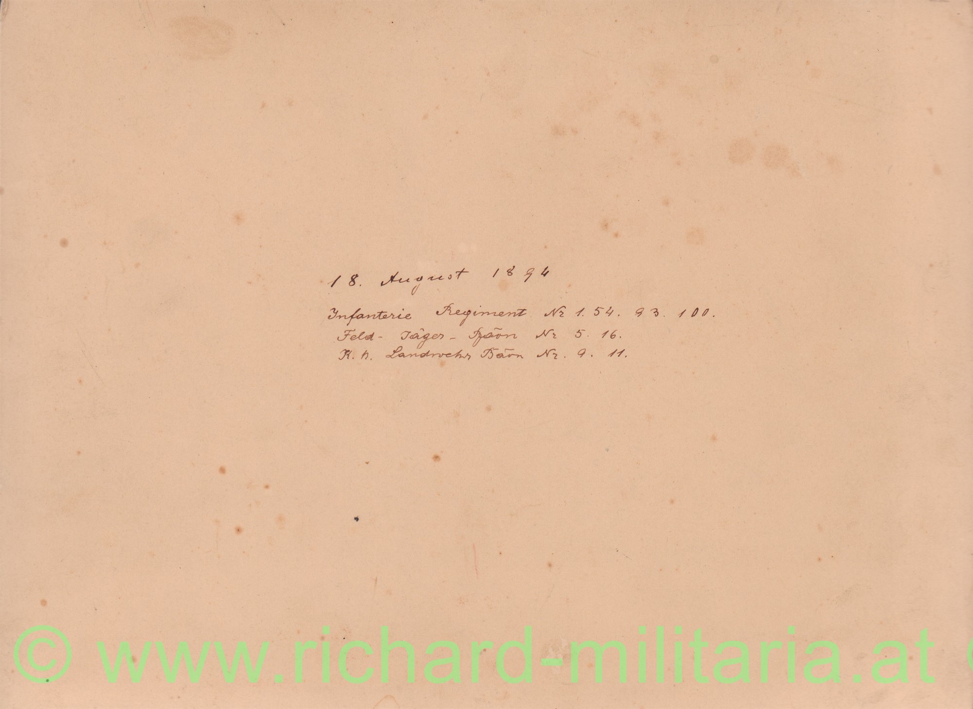 Großformatiges Kartonfoto - Golddruck, rückseitig händisch beschrieben: 18. August 1894 - Infanterie Regiment Nr. 1. 54. 93. 100. Feld-Jäger - Baon Nr. 5. 16.; K.k. Landwehr Baon Nr. 9. 11.; Format 28 x 20,9 cm; oben mittig kleine Fadenschlaufe zum Aufhängen