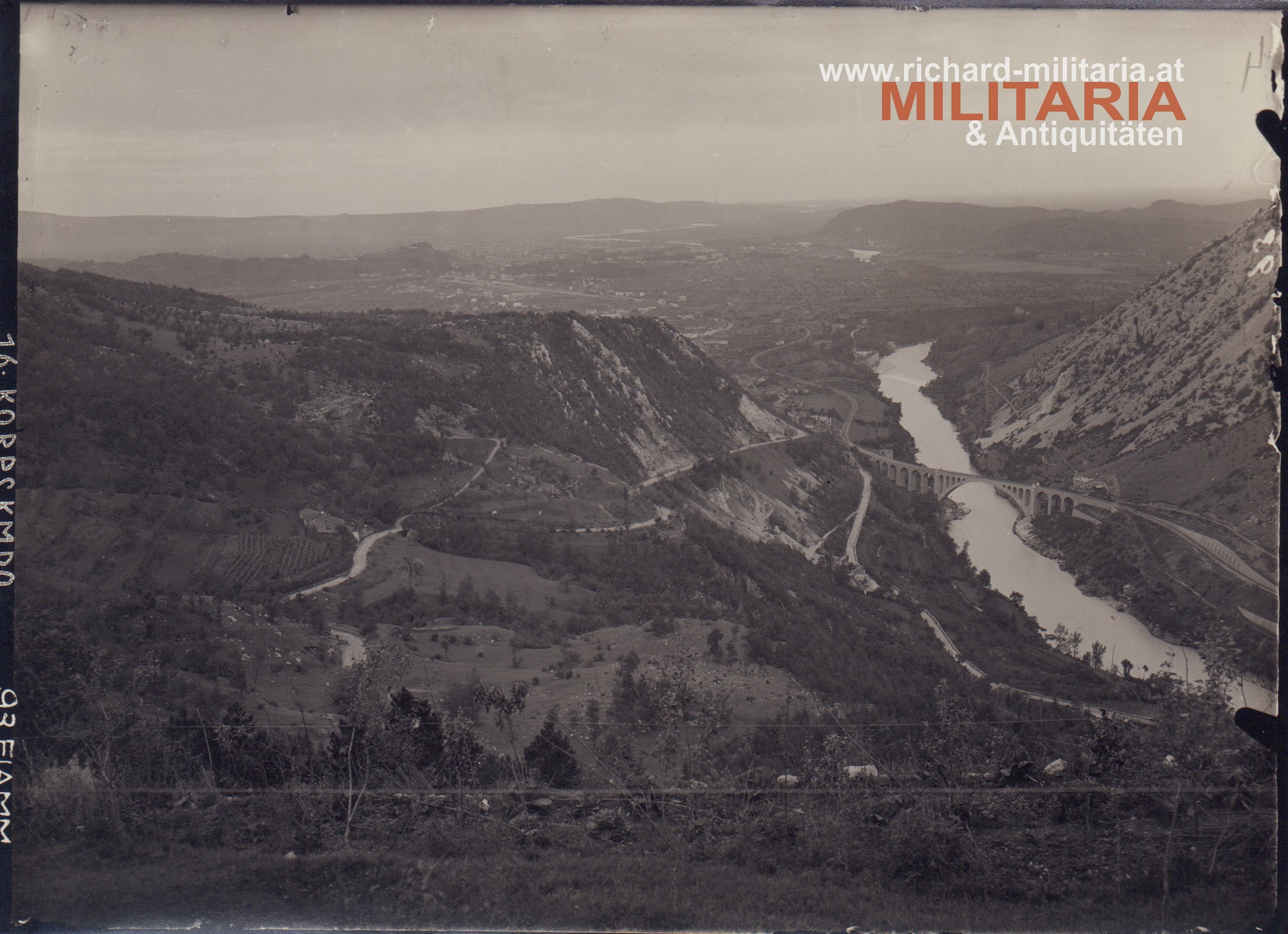 k.u.k. Foto Monte Santo (Sveta Gora) - Isonzo - Solkan-Brücke; im Hintergrund das Doberdo-Plateau. Aufgenommen vom 16. Korps-Kmdo.
