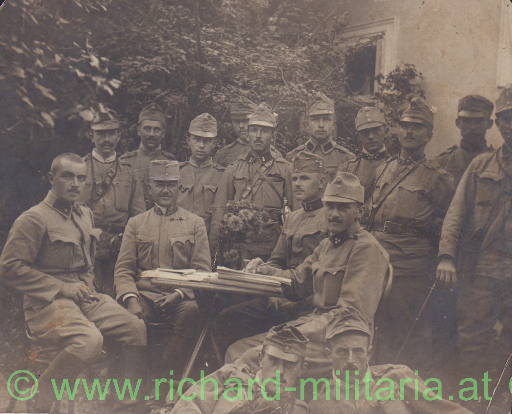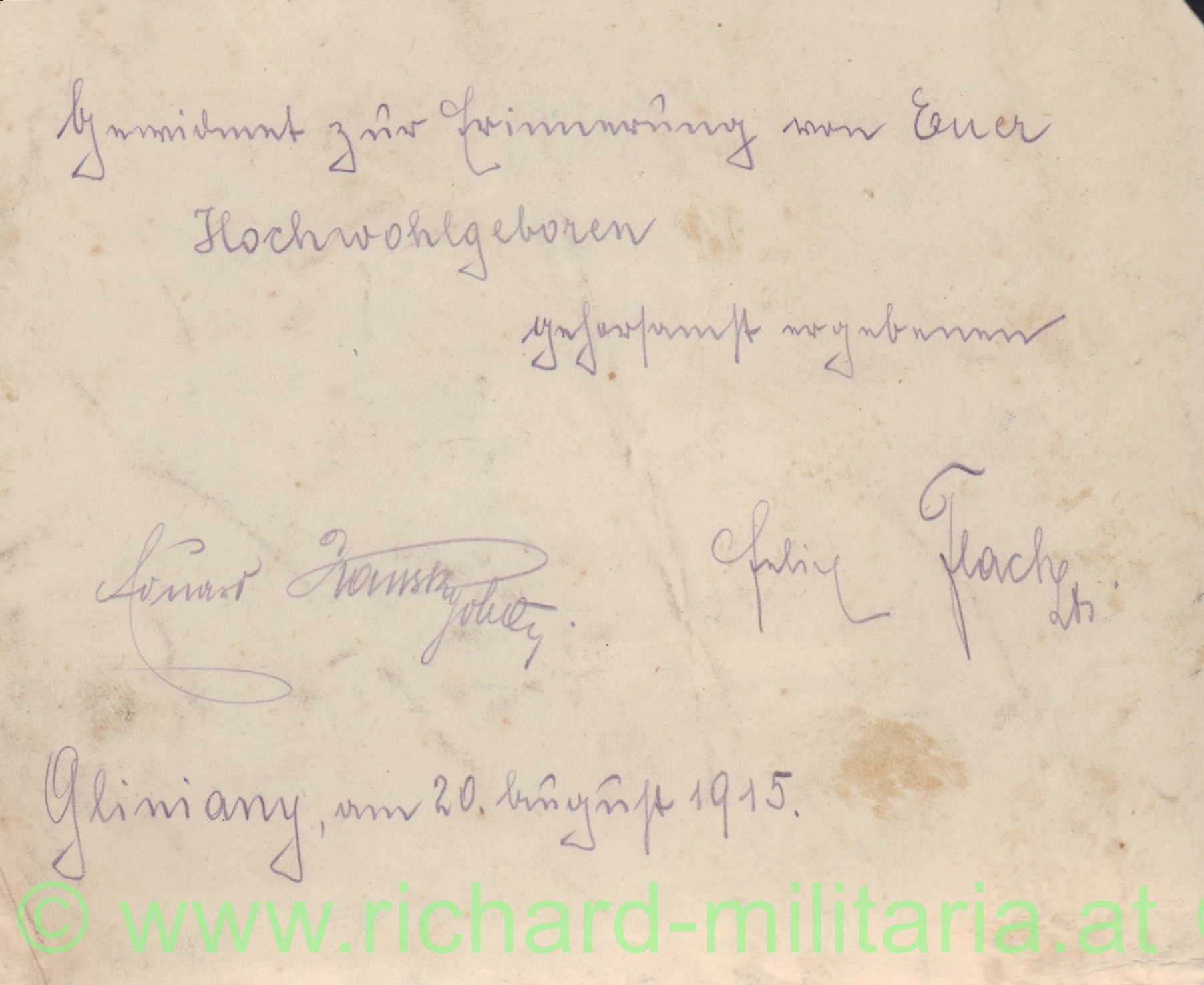 k.u.k. Foto Oberst mit Offizieren und Soldaten - rückseitige Widmung 1915 Gliniany
