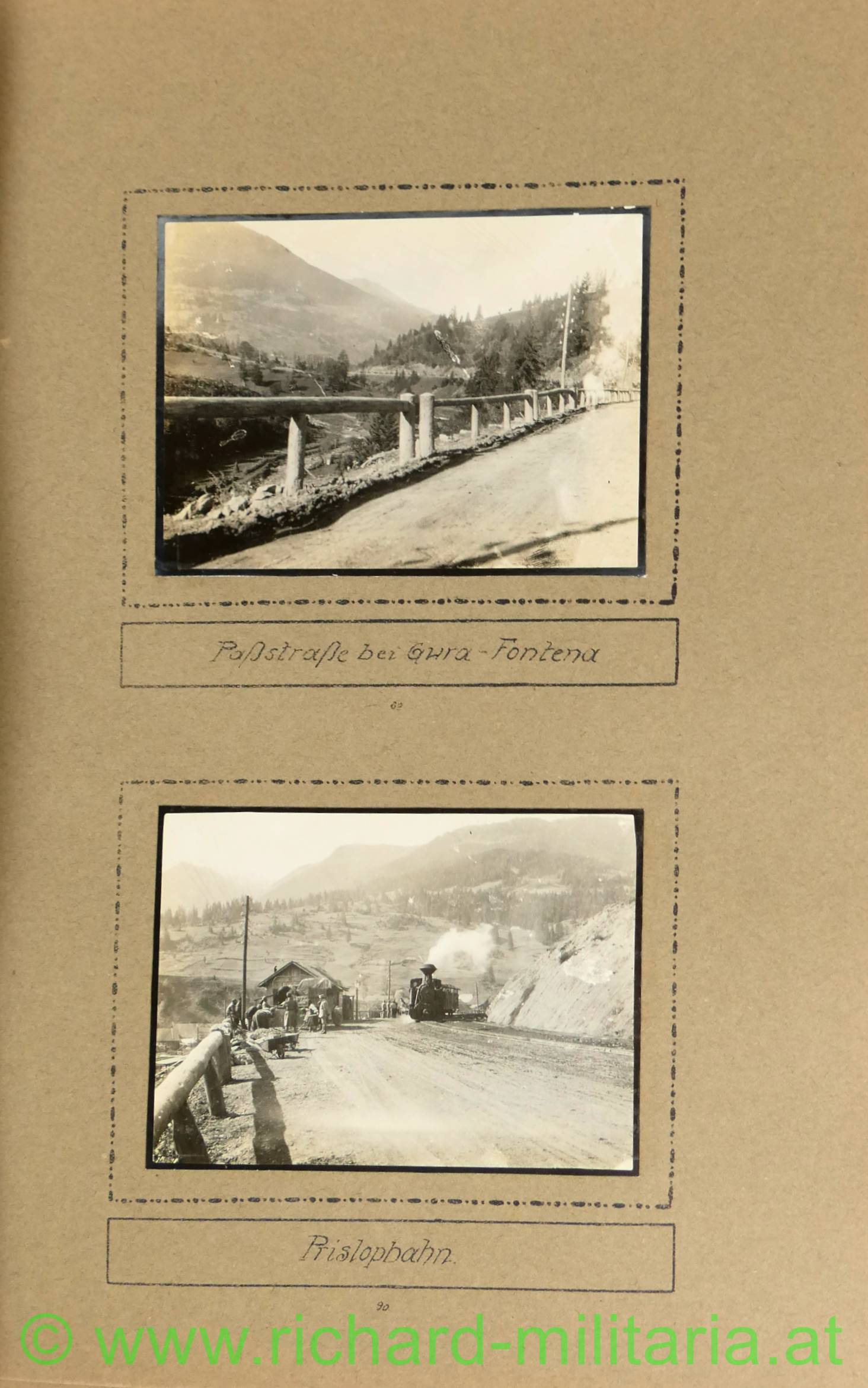 k.u.k. Fotoalbum Nr. II (aus einer Serie) der 1. Infanterie Division in den Wald-Karpathen 1916/17; insgesamt 50 Fotos; alle gut leserlich beschrieben und zusätzlich mit Verzierungen aufgewertet; u.a. Fotos von Erzherzog Karl und Feldmarschall Habermann bei der Verleihung von Auszeichnungen; einige Fotos von Stellungen und dem Alltag des Infanterie Regiments 43 bei Cerbul; Landschaftsfotos sowie Fotos von Einheimischen in Rumänien; zwei Fotos der Feierlichkeiten zum Geburtstag von Kaiser Wilhelm in Borsa 1917;