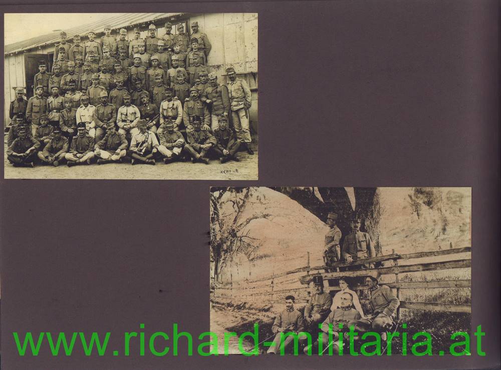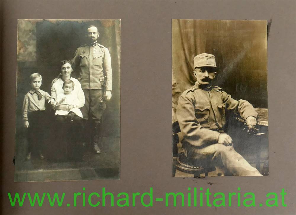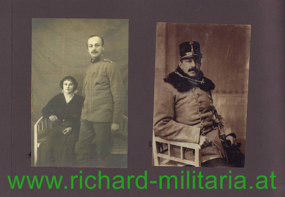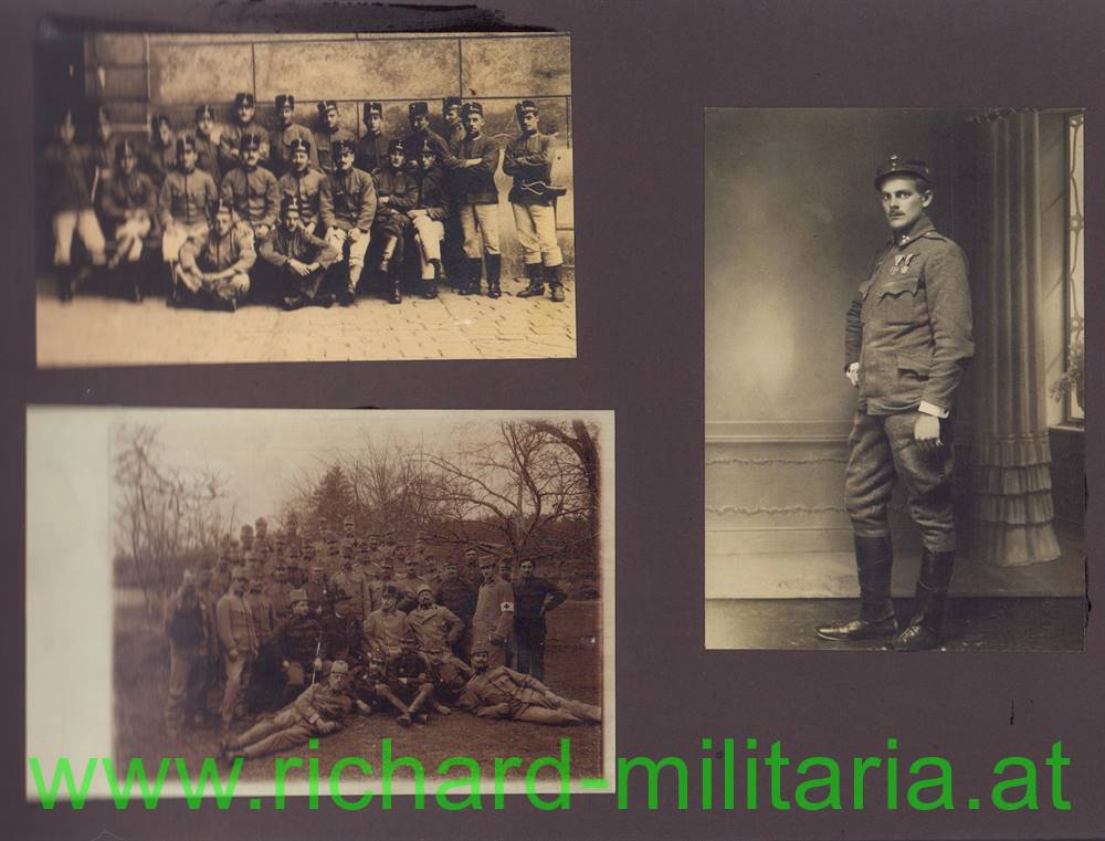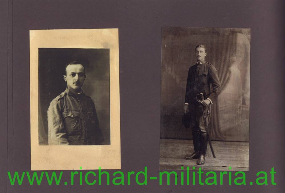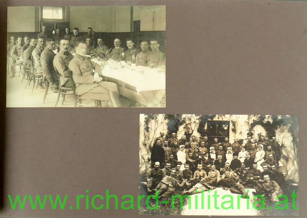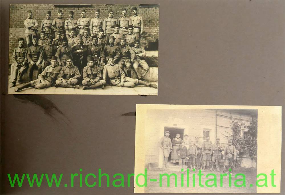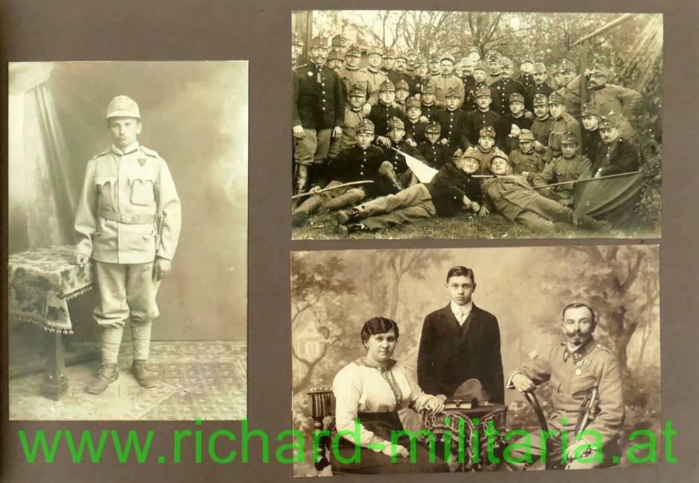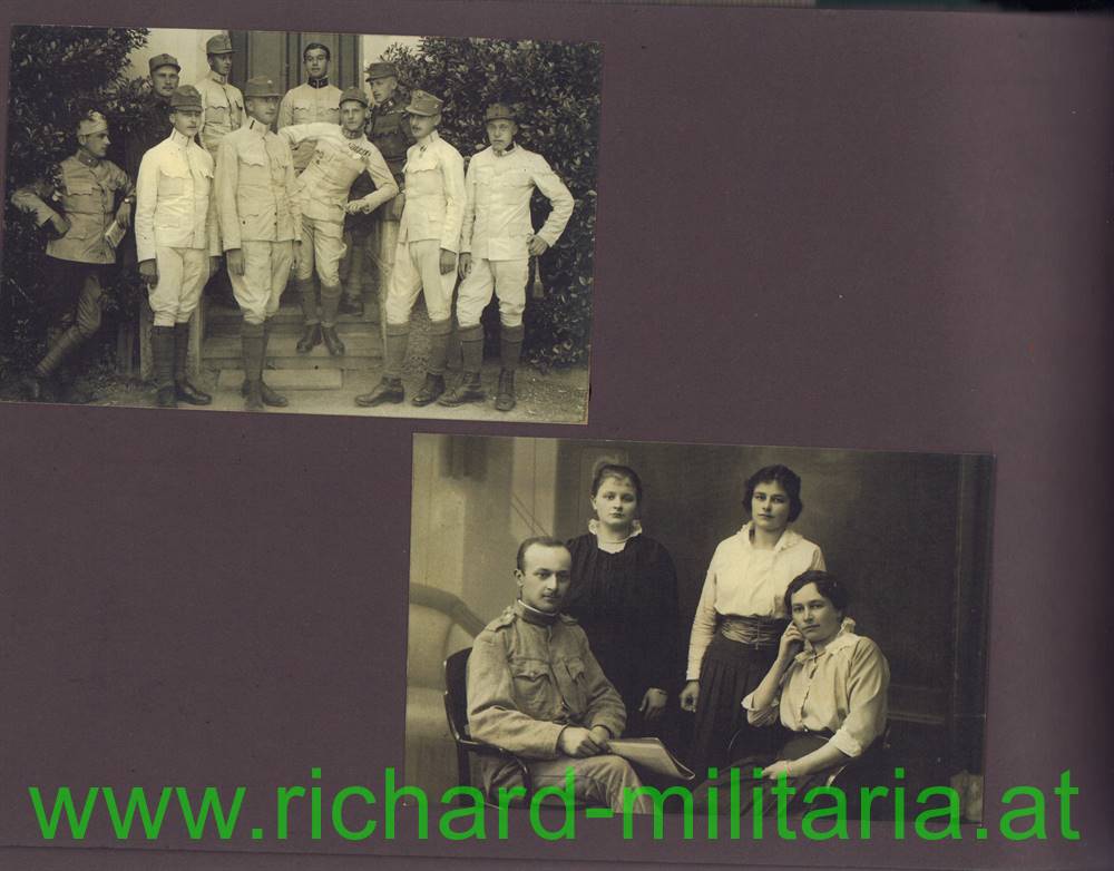k.u.k. Fotoalbum mit Bildern vom niederösterreichischen Infanterie Regiments 4 und Infanterie Regiment 31 sowie viele Gruppenfotos und Portraitfotos von teilweise dekorierten Soldaten, u.a. Bosniaken und Landesschützen; insgesamt 138 Fotos - alle eingeklebt!; meist Postkartenformat; auf der ersten Seite ein Gruppenfoto von Soldaten des niederösterreichischen Infanterie Regiments 4 mit ihrem Hauptmann Wilhelm Punzengruber im Jahr 1910; Wilhelm Punzengruber war laut Schematismus der k.u.k. Armee ab 1913 Major im Infanterie Regiment 14 und später im Infanterie Regiment Nr. 59; einige Fotos von Ärzten und Lazaretten sowie Fotos aus dem Alltag der Soldaten; auf den hinteren Seiten händisch beschriftete Fotos auch von Soldaten der Artillerie sowie Bilder von der Front gegen Russland; einige sehr schöne Portraitfotos z.B. Soldat der Kraftfahrttruppe mit italienischem Terni-Beutebajonett; etc.