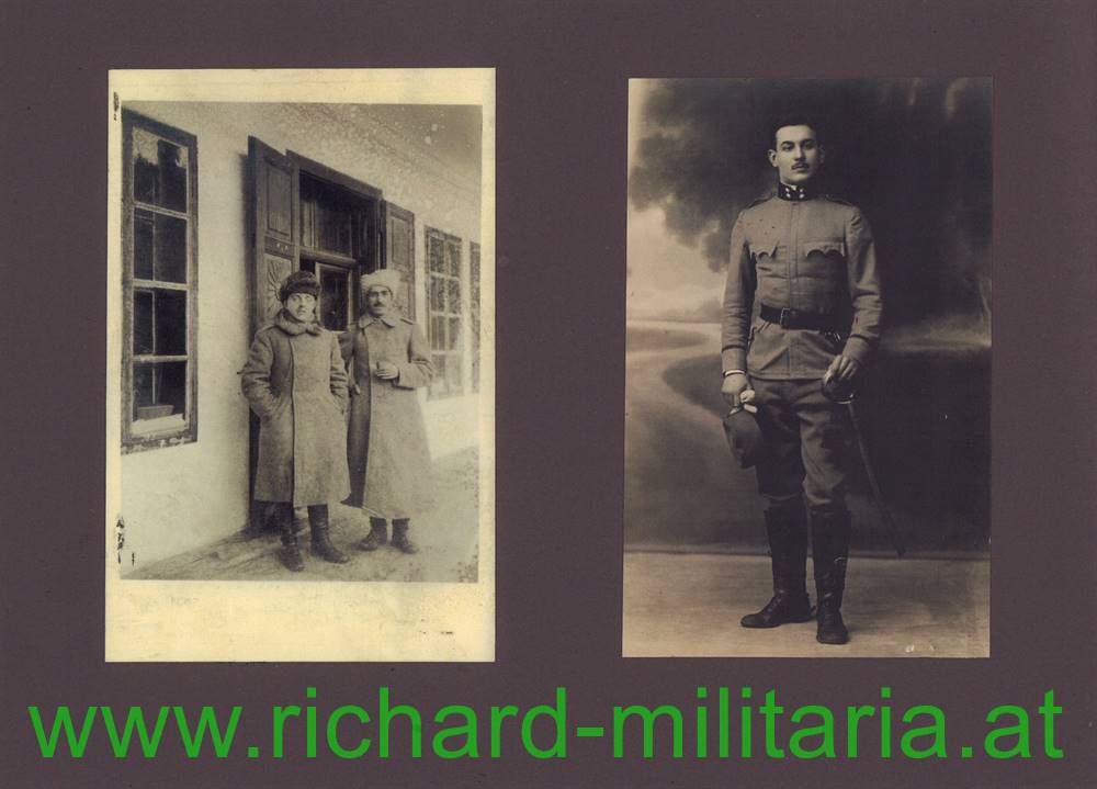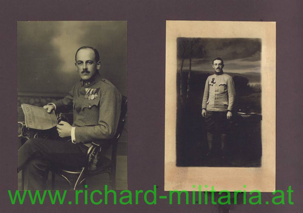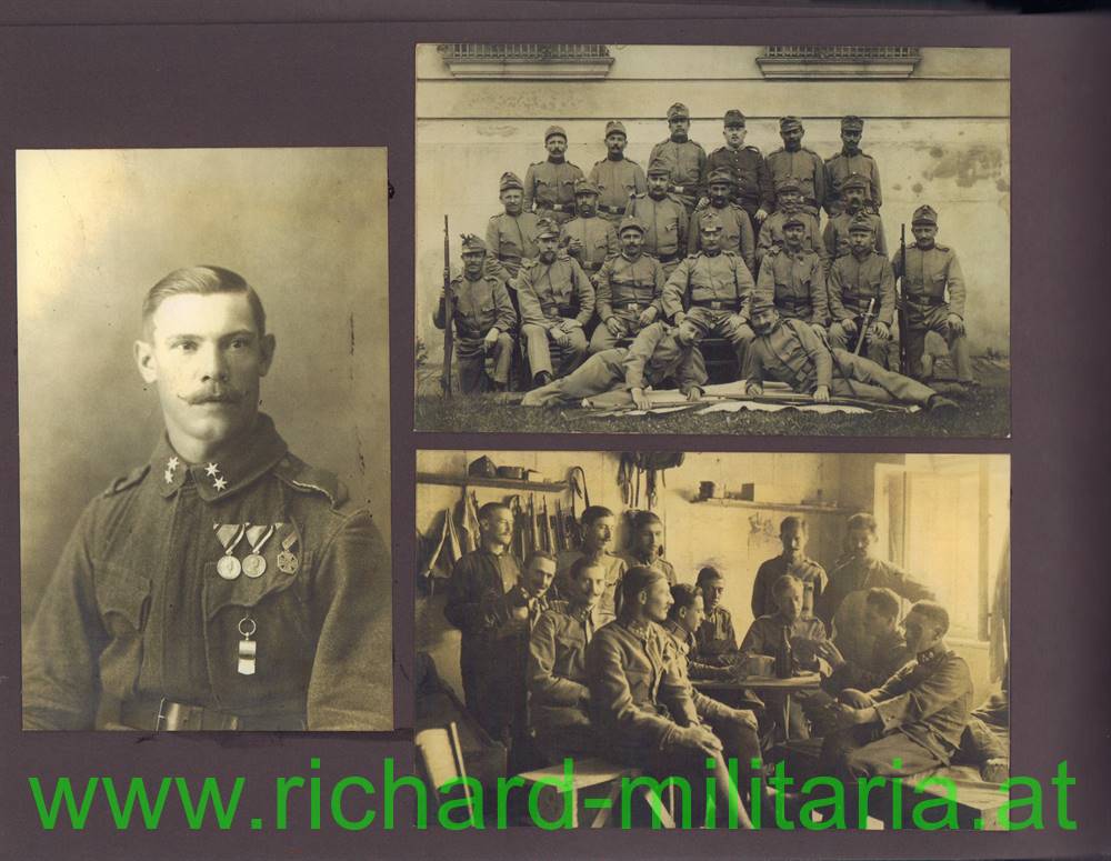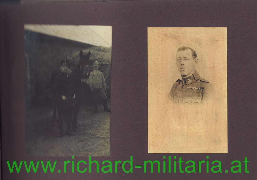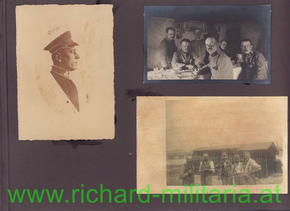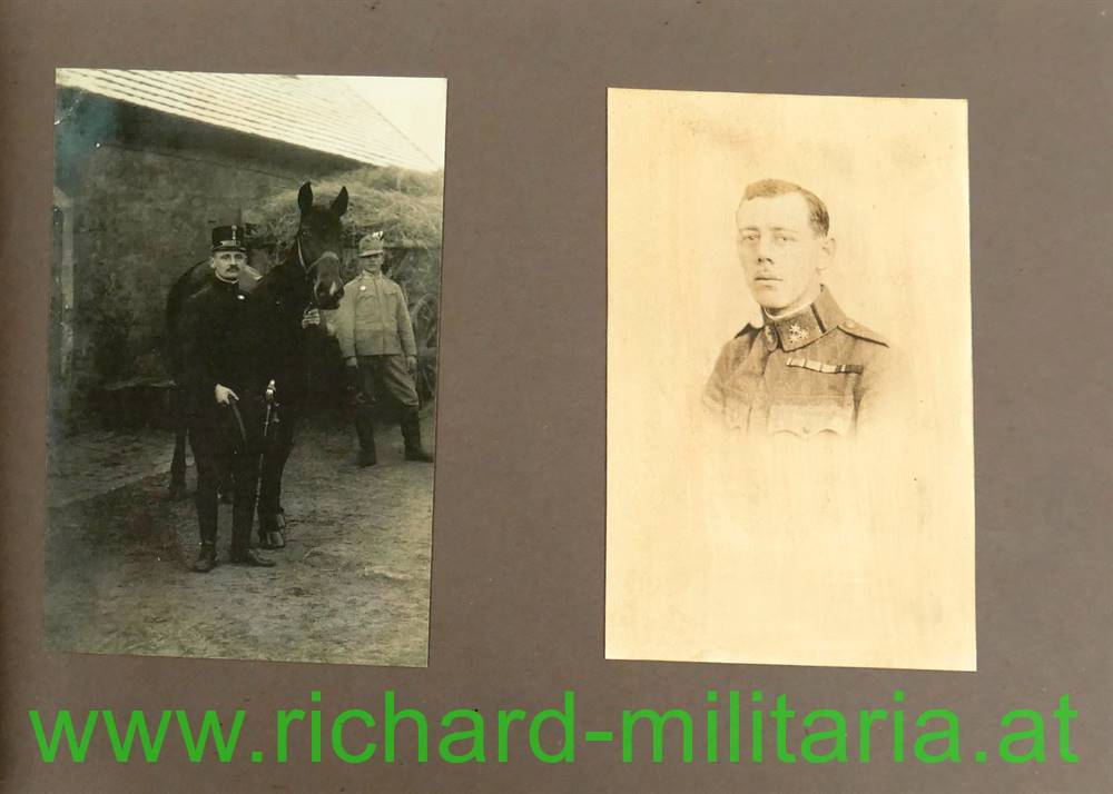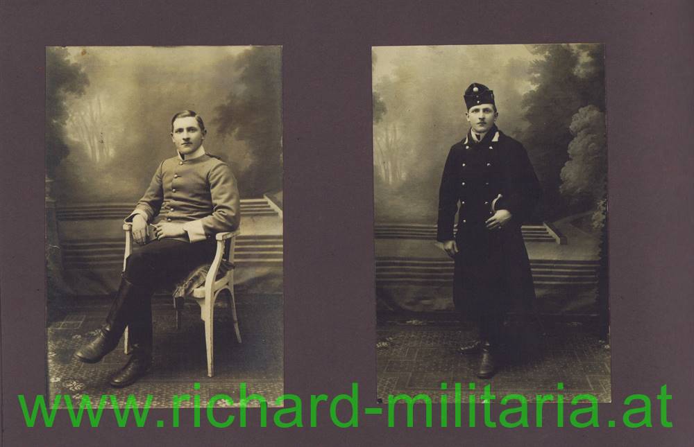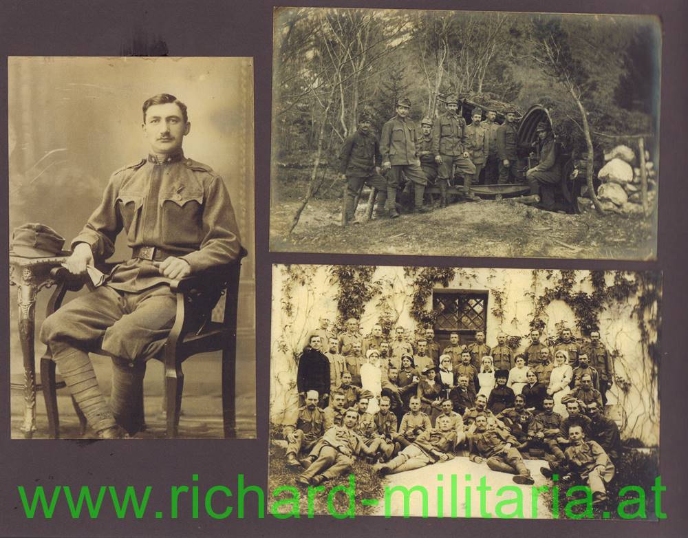 k.u.k. Fotoalbum mit Bildern vom niederösterreichischen Infanterie Regiments 4 und Infanterie Regiment 31 sowie viele Gruppenfotos und Portraitfotos von teilweise dekorierten Soldaten, u.a. Bosniaken und Landesschützen; insgesamt 138 Fotos - alle eingeklebt!; meist Postkartenformat; auf der ersten Seite ein Gruppenfoto von Soldaten des niederösterreichischen Infanterie Regiments 4 mit ihrem Hauptmann Wilhelm Punzengruber im Jahr 1910; Wilhelm Punzengruber war laut Schematismus der k.u.k. Armee ab 1913 Major im Infanterie Regiment 14 und später im Infanterie Regiment Nr. 59; einige Fotos von Ärzten und Lazaretten sowie Fotos aus dem Alltag der Soldaten; auf den hinteren Seiten händisch beschriftete Fotos auch von Soldaten der Artillerie sowie Bilder von der Front gegen Russland; einige sehr schöne Portraitfotos z.B. Soldat der Kraftfahrttruppe mit italienischem Terni-Beutebajonett; etc.
