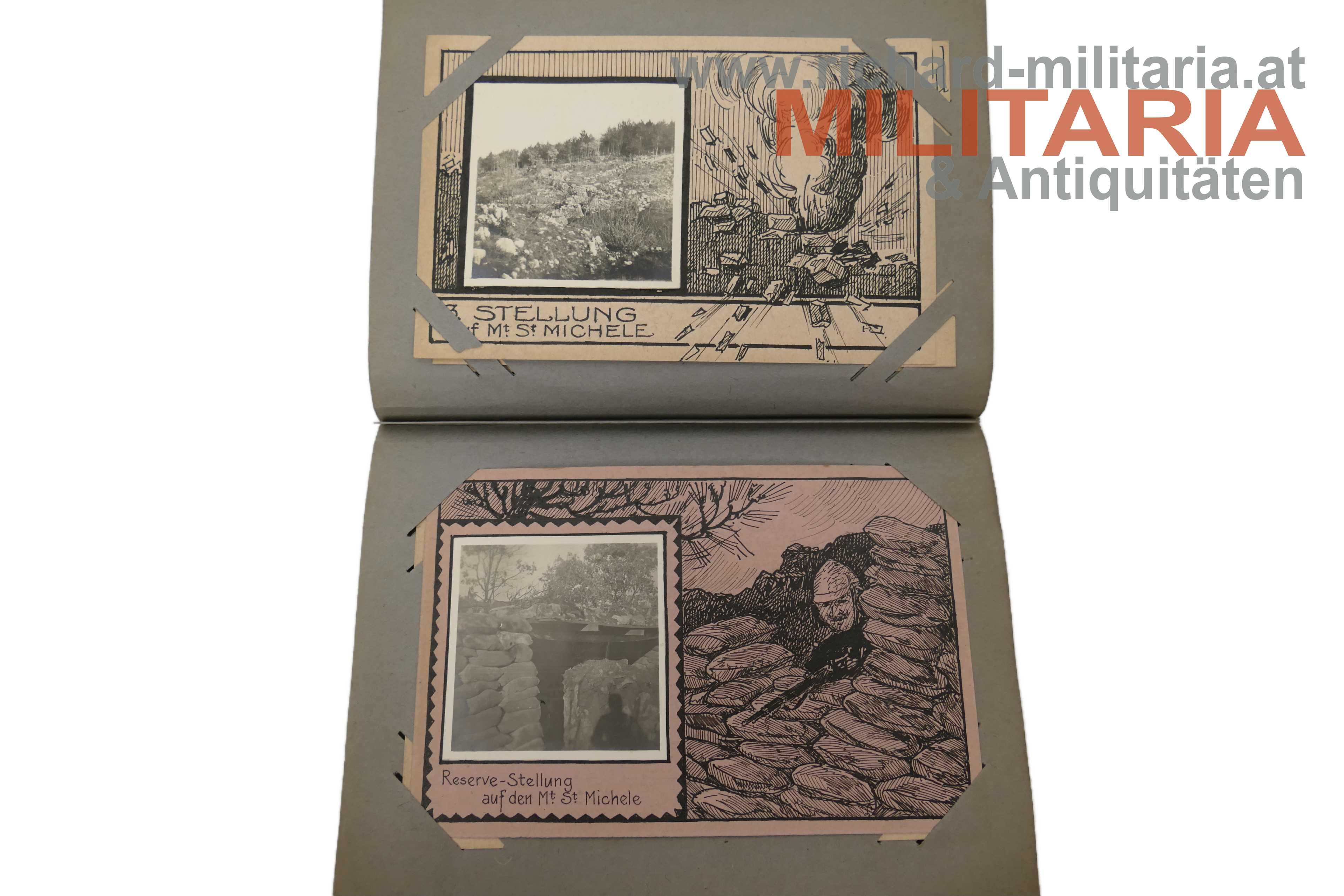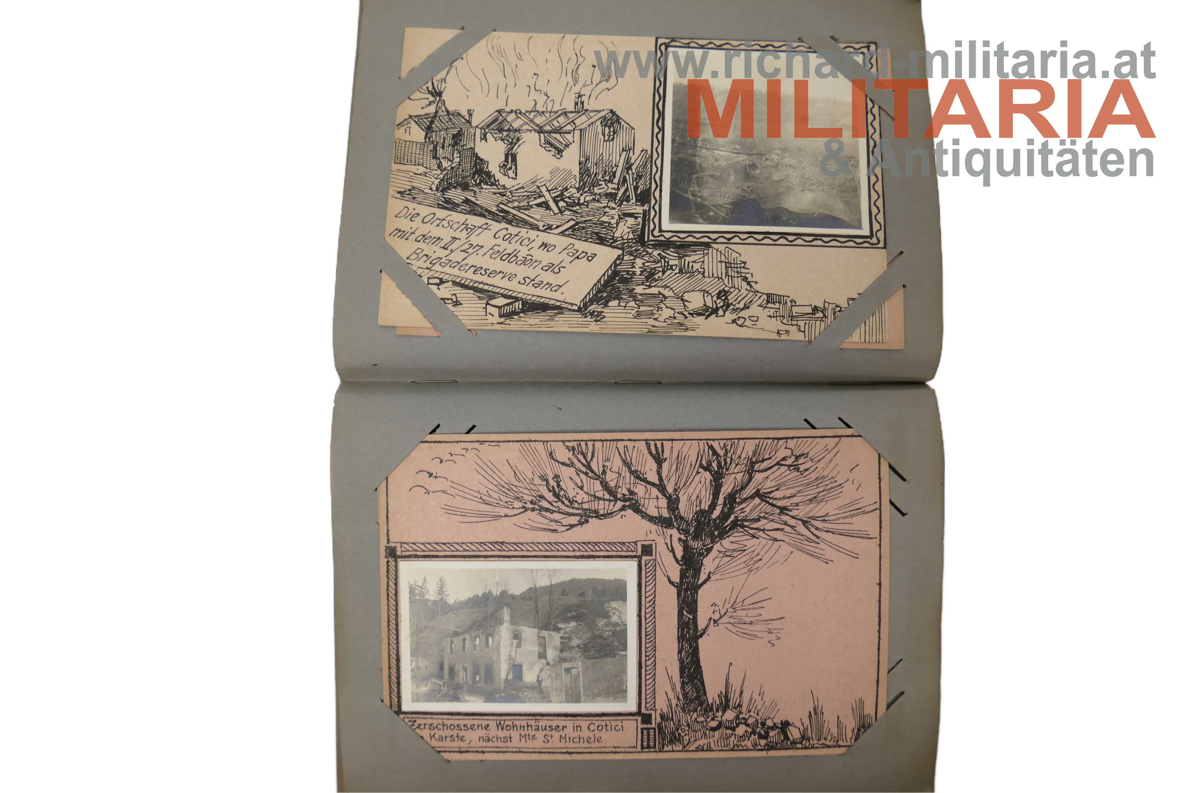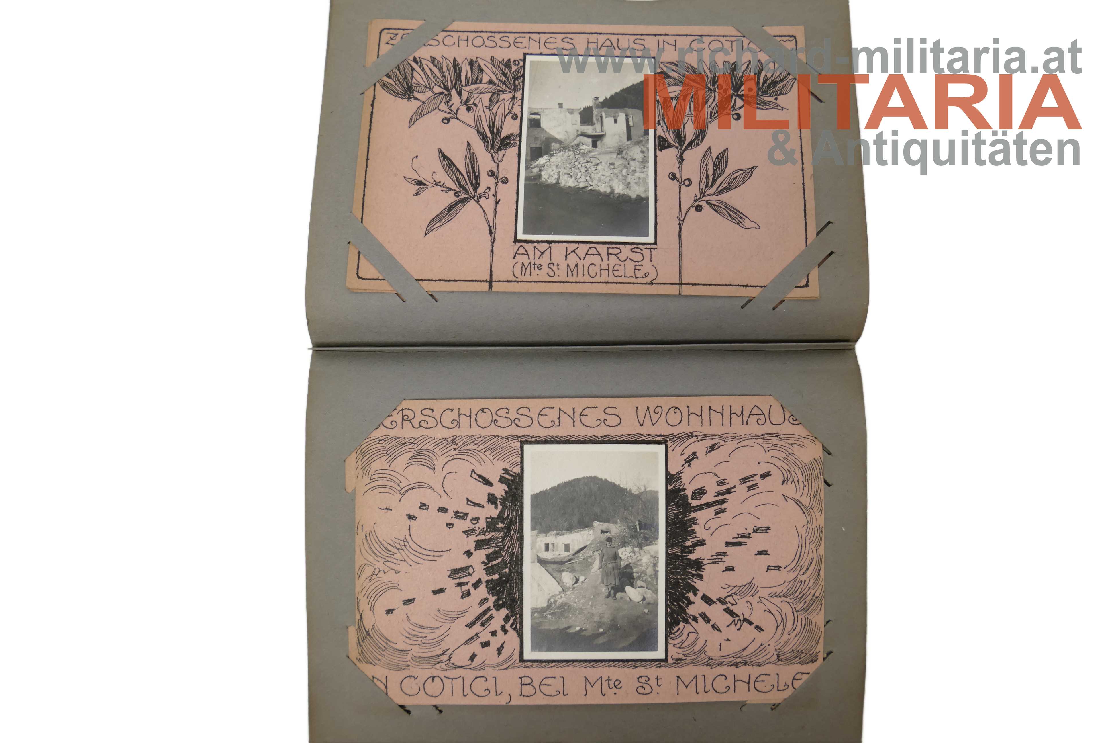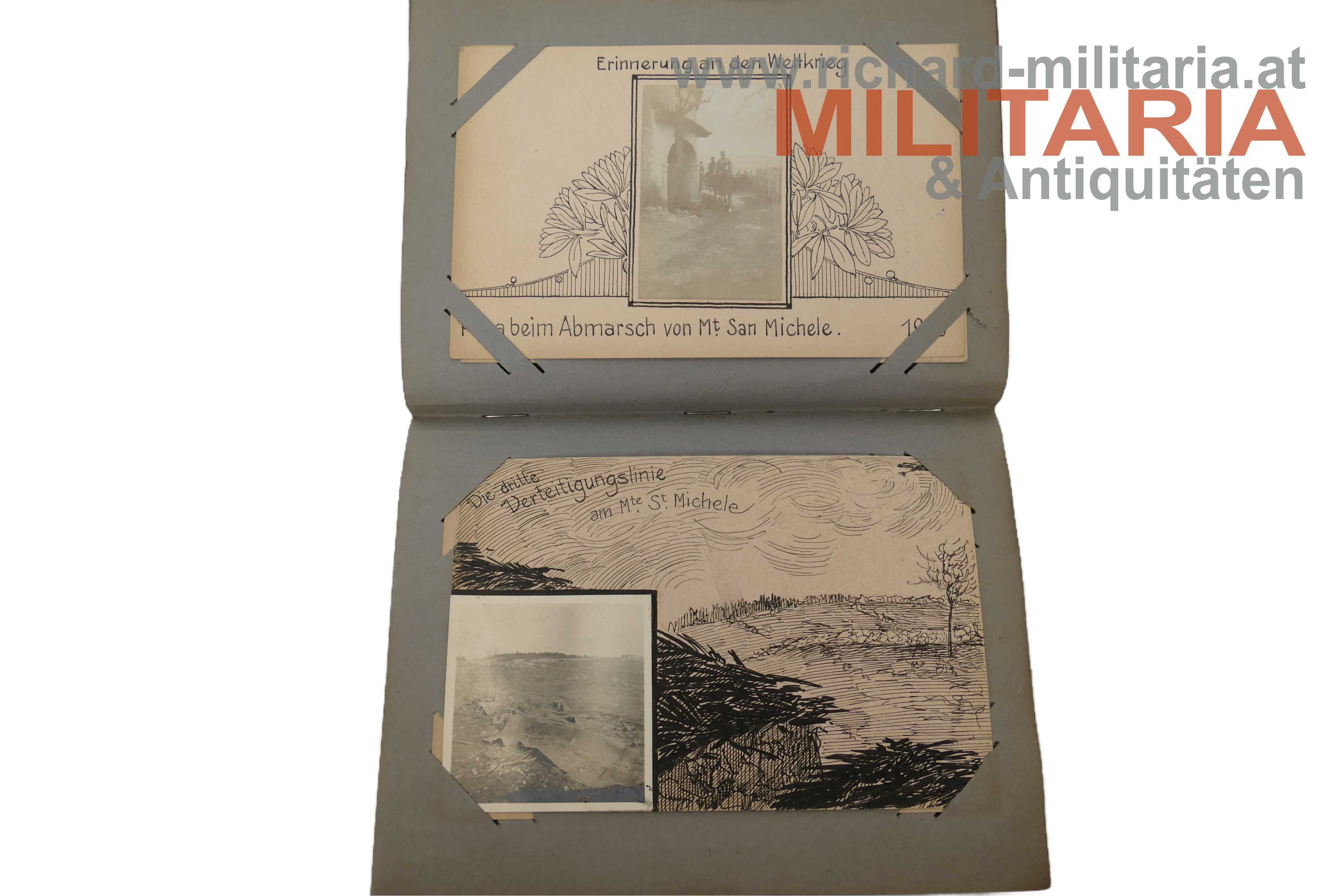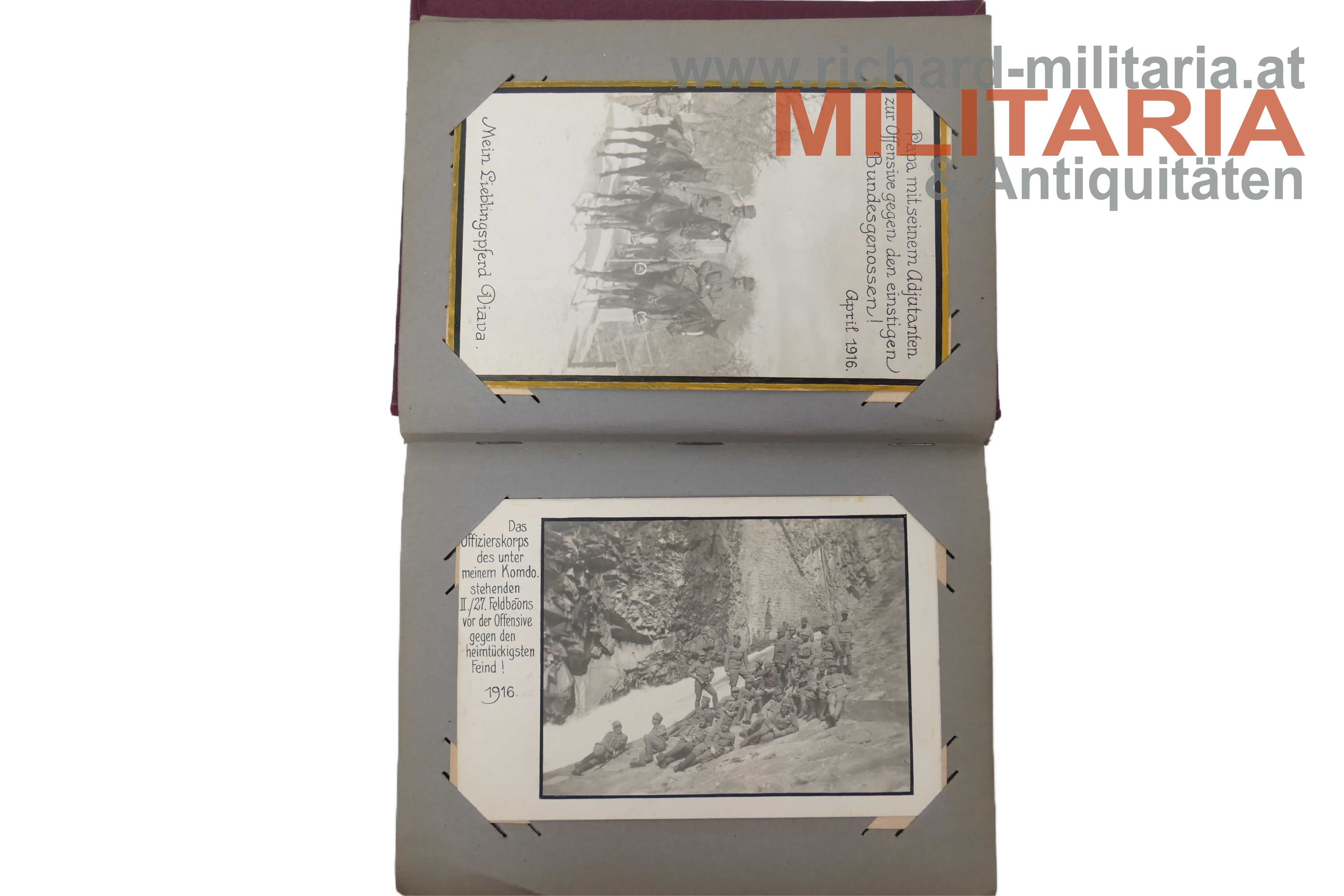 k.u.k. persönliches Fotoalbum des Oberstleutnant Johann Petermann Kommandant des 2. Feldbaons des steirischen Infanterie Regiment Nr. 27 an der Italienfront im Jahre 1916; mit 99 Aufnahmen bzw. handgezeichneten Feldpostkarten mit aufgeklebten Fotos; vollständig und fein säuberlich beschriftet; Postkarten revers an Fräulein Liserl Petermann adressiert und meist mit "Infanterie Regiment 27" gestempelt; viele handbemalte oder handgezeichnete Feldpostkarten mit aufgeklebten Bildern;