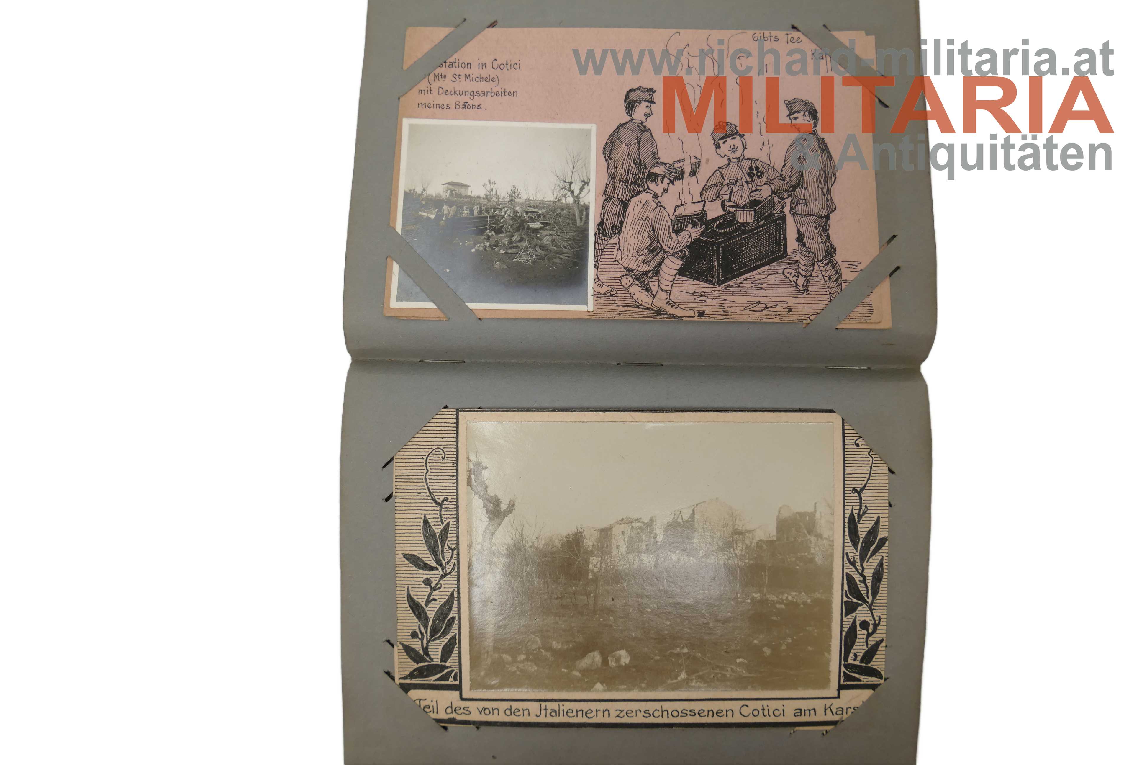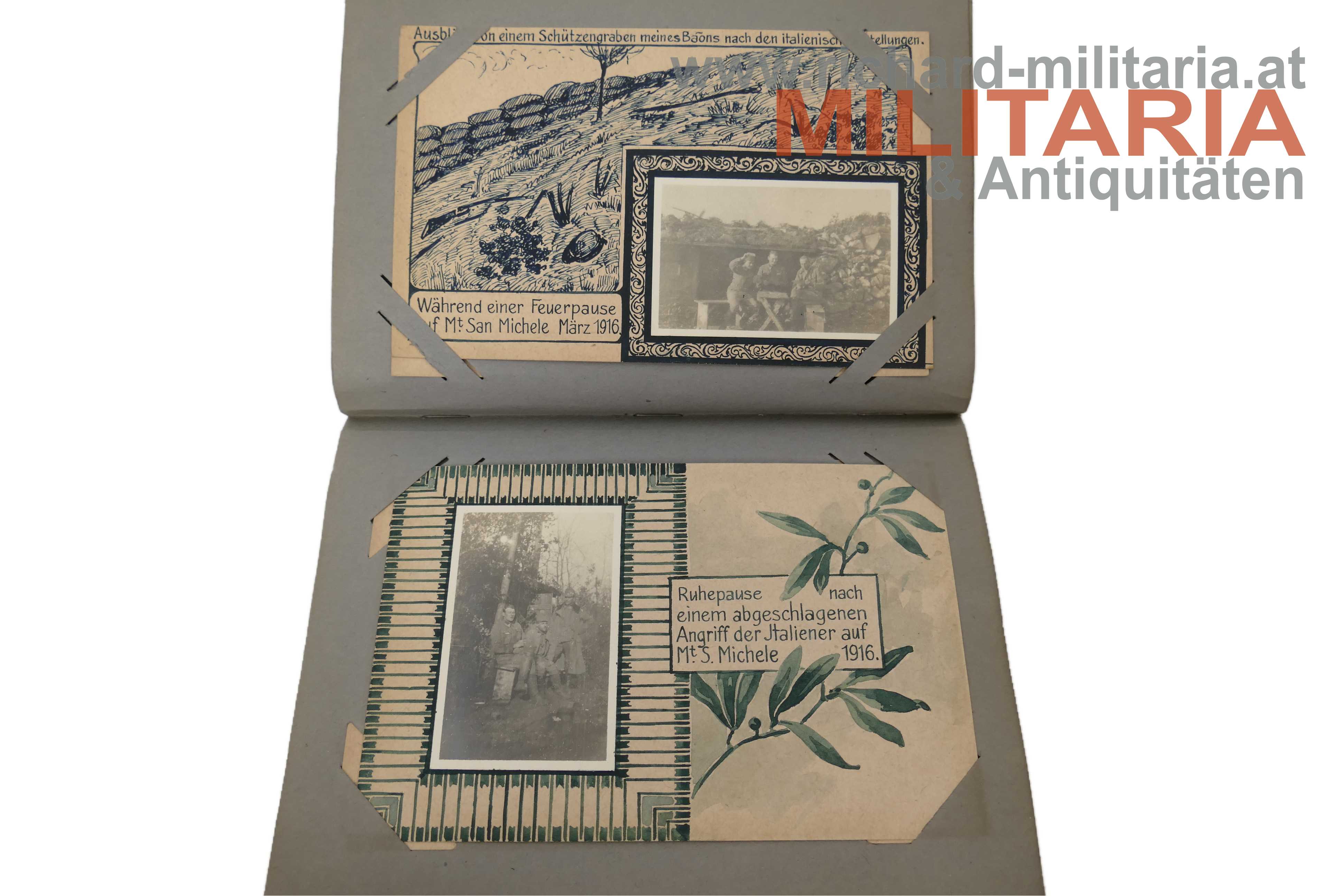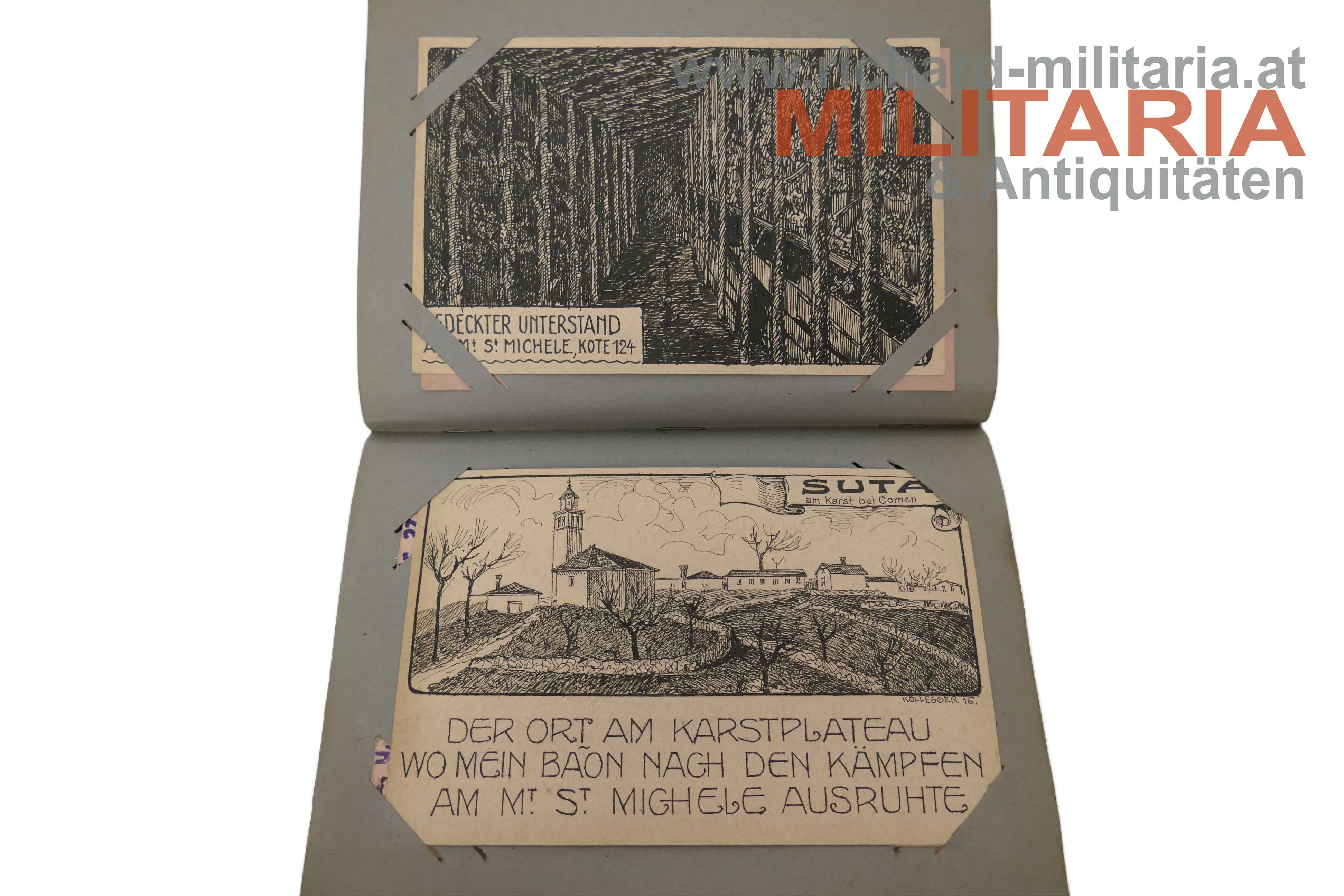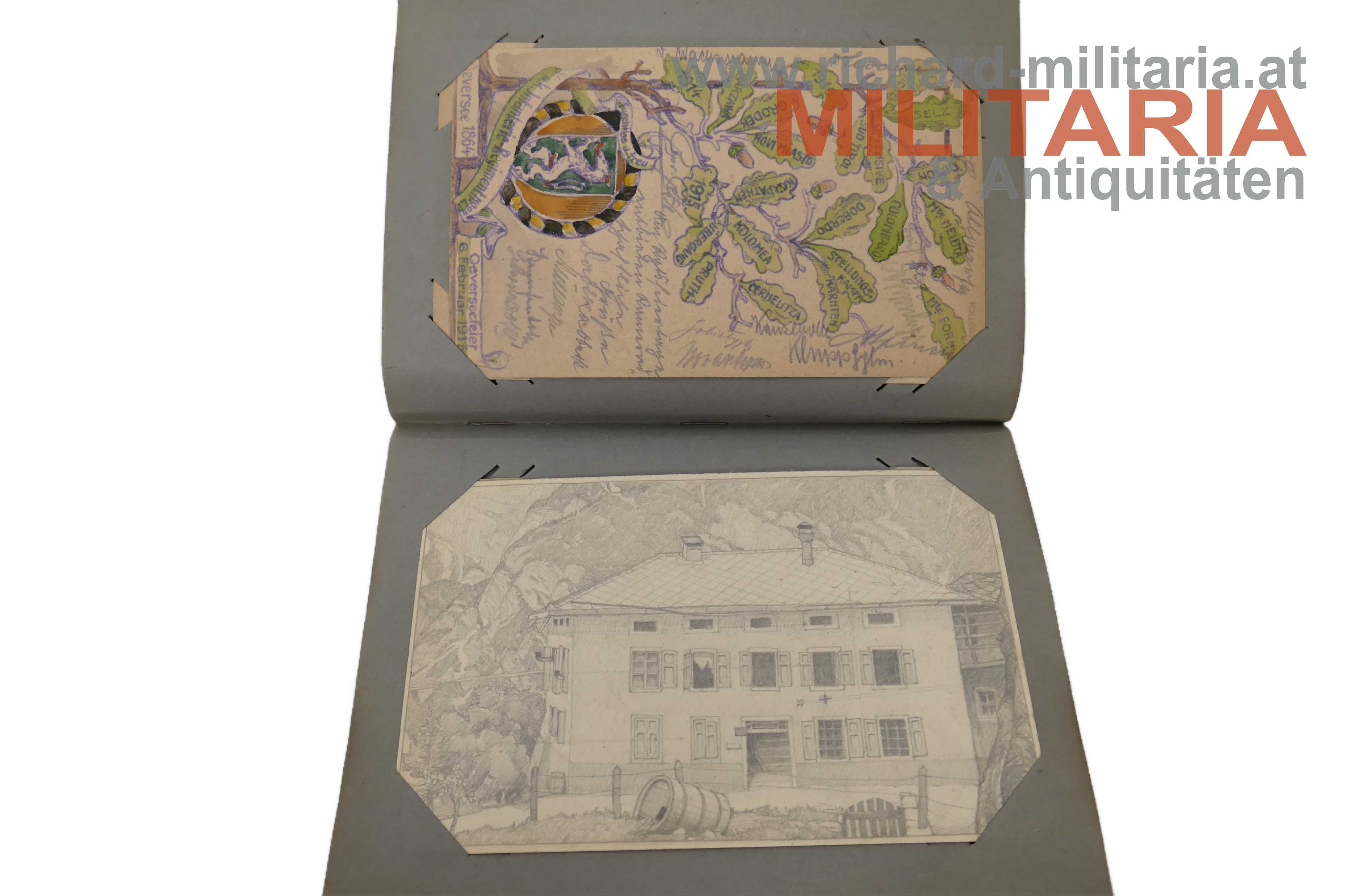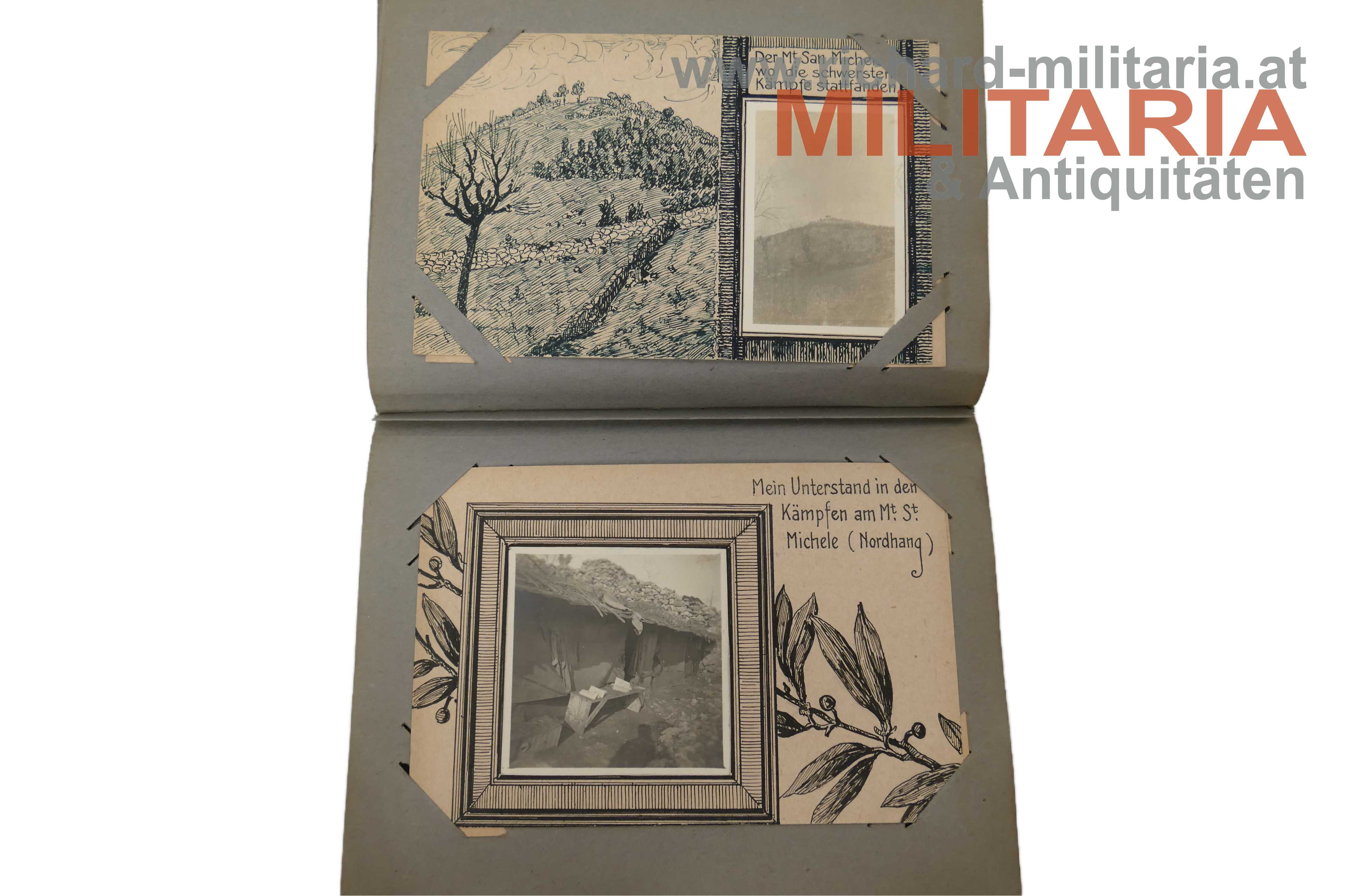 k.u.k. persönliches Fotoalbum des Oberstleutnant Johann Petermann Kommandant des 2. Feldbaons des steirischen Infanterie Regiment Nr. 27 an der Italienfront im Jahre 1916; mit 99 Aufnahmen bzw. handgezeichneten Feldpostkarten mit aufgeklebten Fotos; vollständig und fein säuberlich beschriftet; Postkarten revers an Fräulein Liserl Petermann adressiert und meist mit "Infanterie Regiment 27" gestempelt; viele handbemalte oder handgezeichnete Feldpostkarten mit aufgeklebten Bildern;